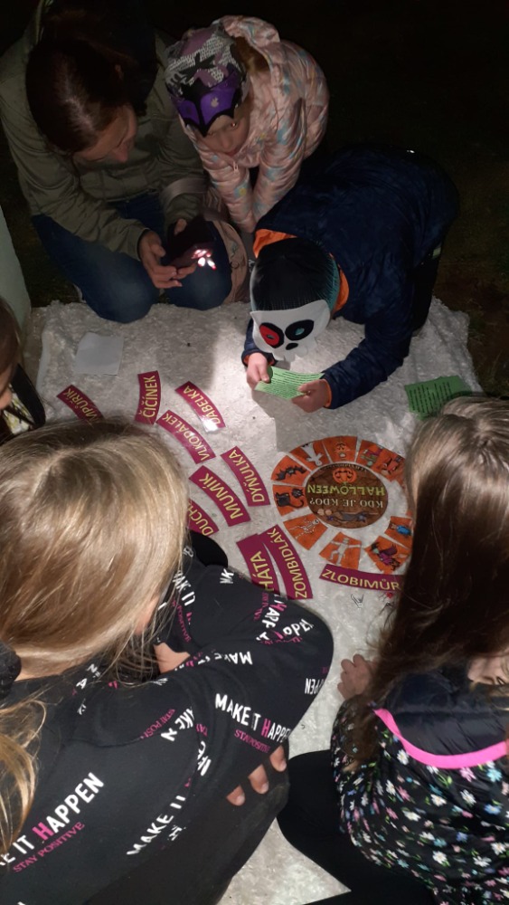 Pro žáky třídy III. A byla přichystána stezka odvahy, kterou si v úterý večer 26. 10. prošli společně s rodiči.  Na strašidelných zastávkách musely děti nejprve splnit školní úkoly. Takže se strašidly hrály matematické domino, přiřazovaly násobilkové pavoučky do pavučiny nebo si musely přečíst popis strašidla a najít jeho obrázek. Ale lákavější pro ně jistě bylo splnění strašidelných úkolů odvahy. A že se v některých případech polekaly i maminky, bylo jistě zábavné pro všechny. Když zrovna luštíte halloweenskou tajenku a vedle vás přistane „kus uříznuté nohy“ :-), není se čemu divit. A nebo míjíte kohosi sedícího na lavičce, který z ničeho nic bafne. Přes pavouky, hřbitůvek až ke kostlivci v rakvi, to už opravdu chce notnou dávku odvahy.