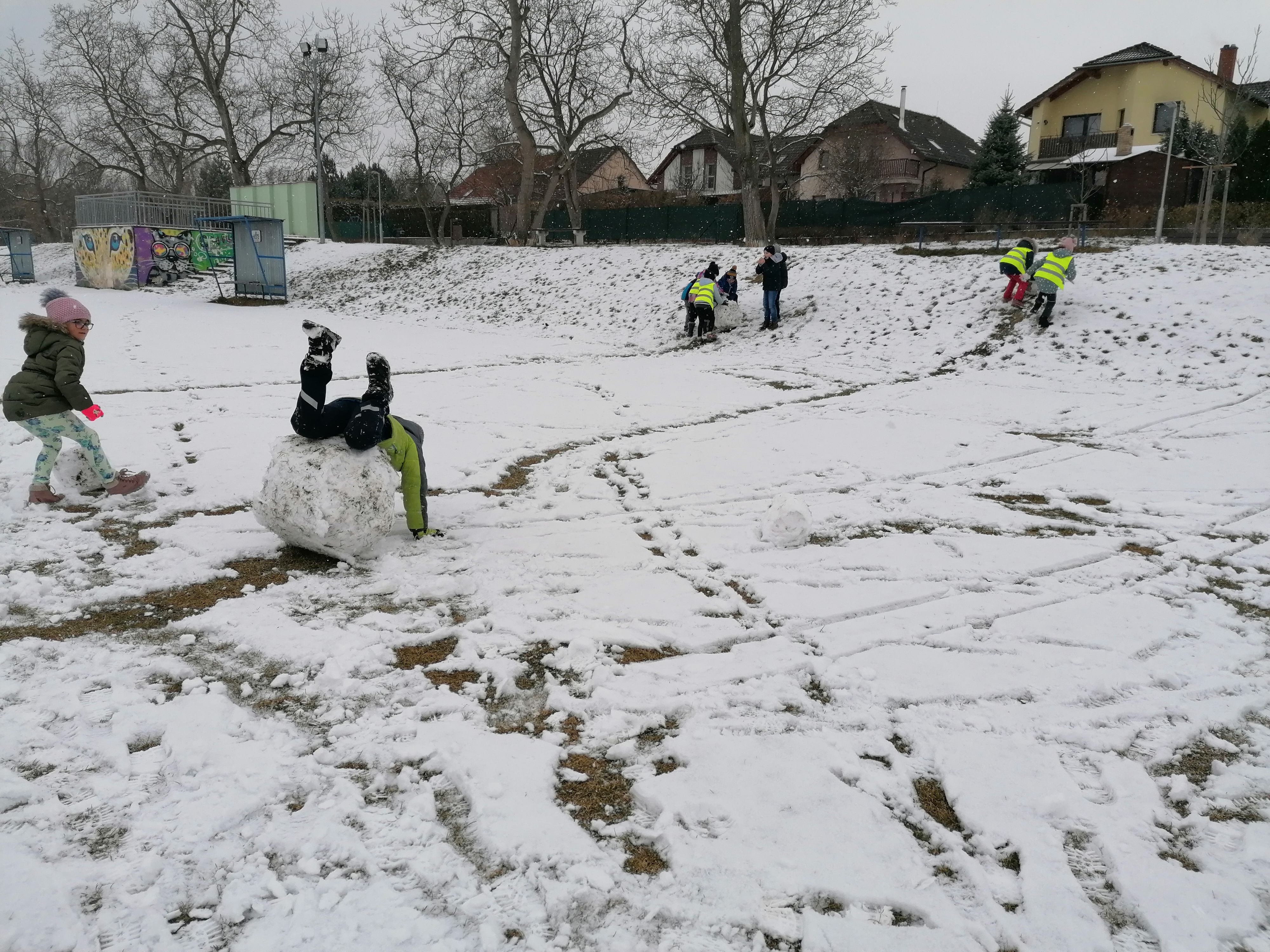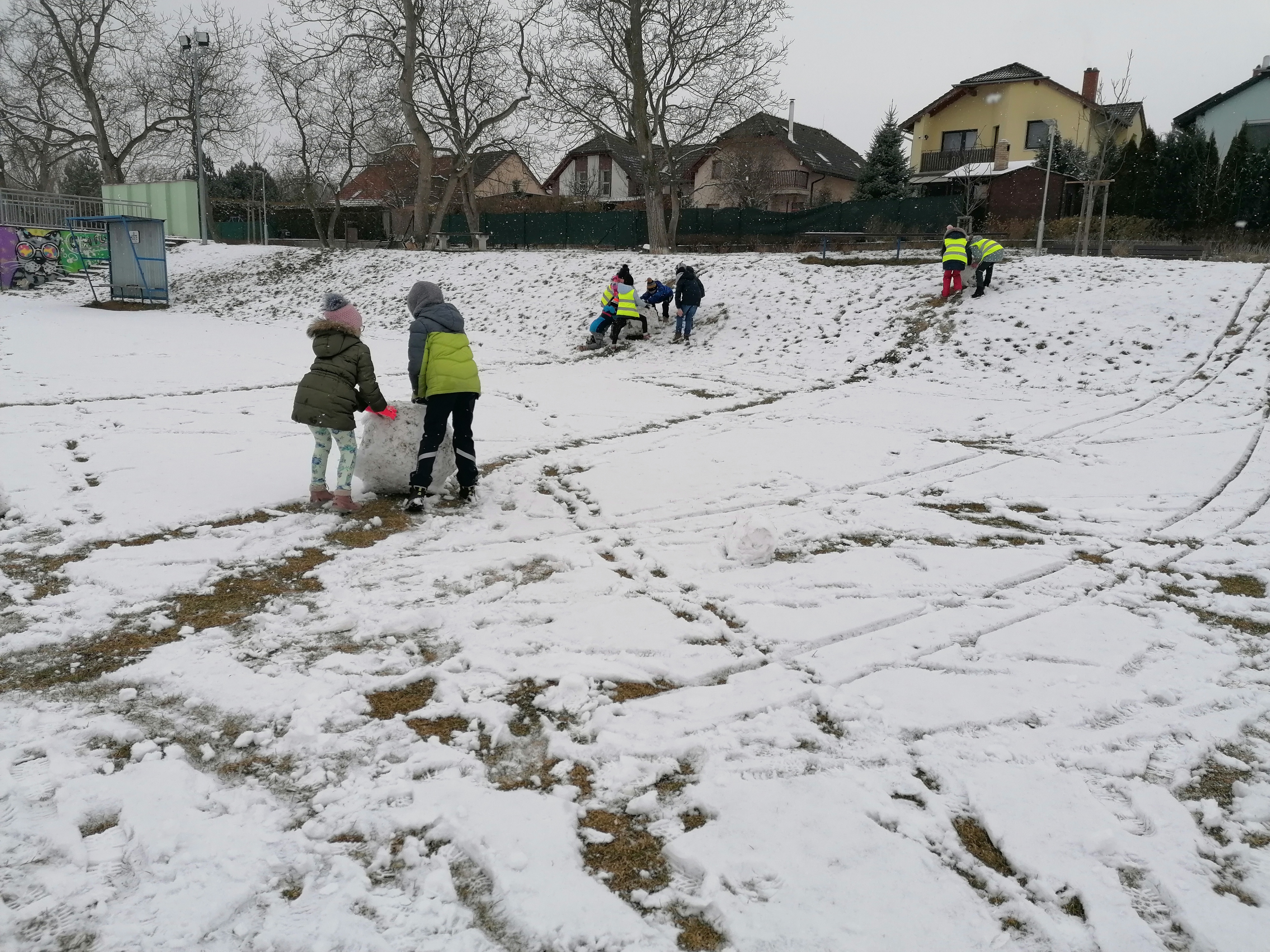 rádi bychom Vám ukázali, jak jsme se radovali ze sněhové nadílky. Děti se náramně bavily a sice jsme všichni byli mokří, ale sníh je sníh! Uspořádali jsme sjezd koulí ze stráně. Někdo raději v lepivém sněhu válel koule obřích rozměrů, jiní zase tvořili uprostřed hřiště krásného sněhuláka.