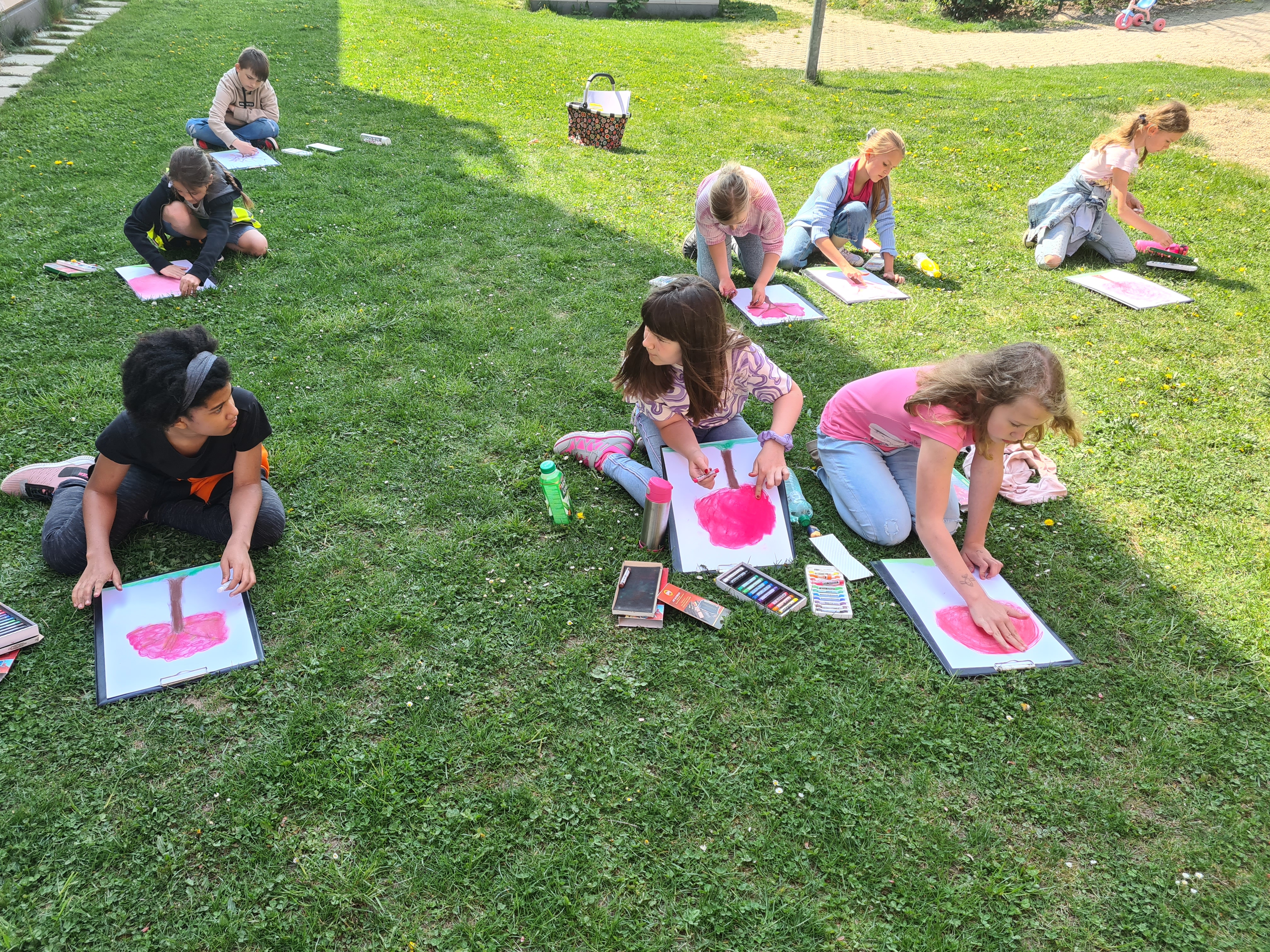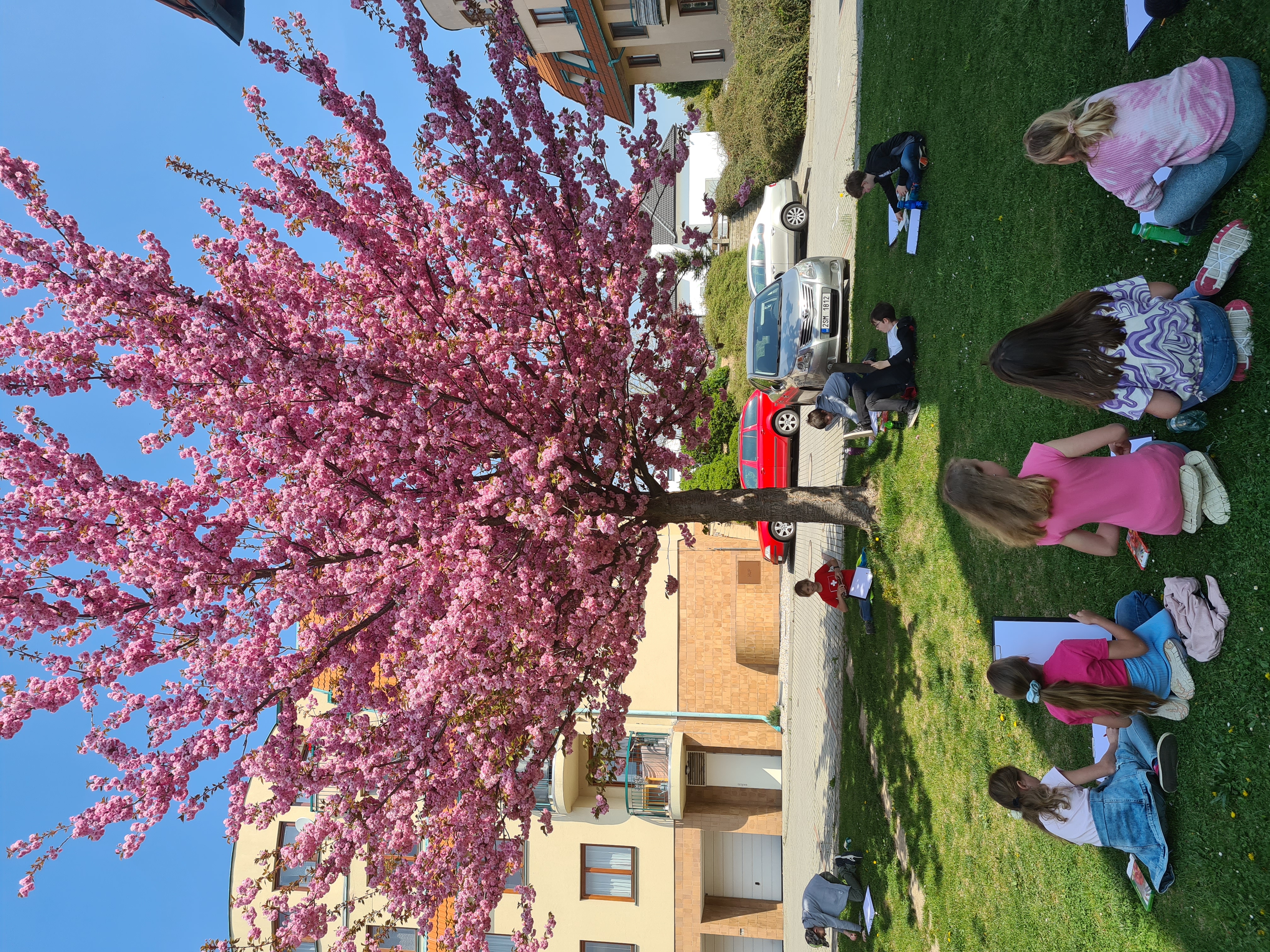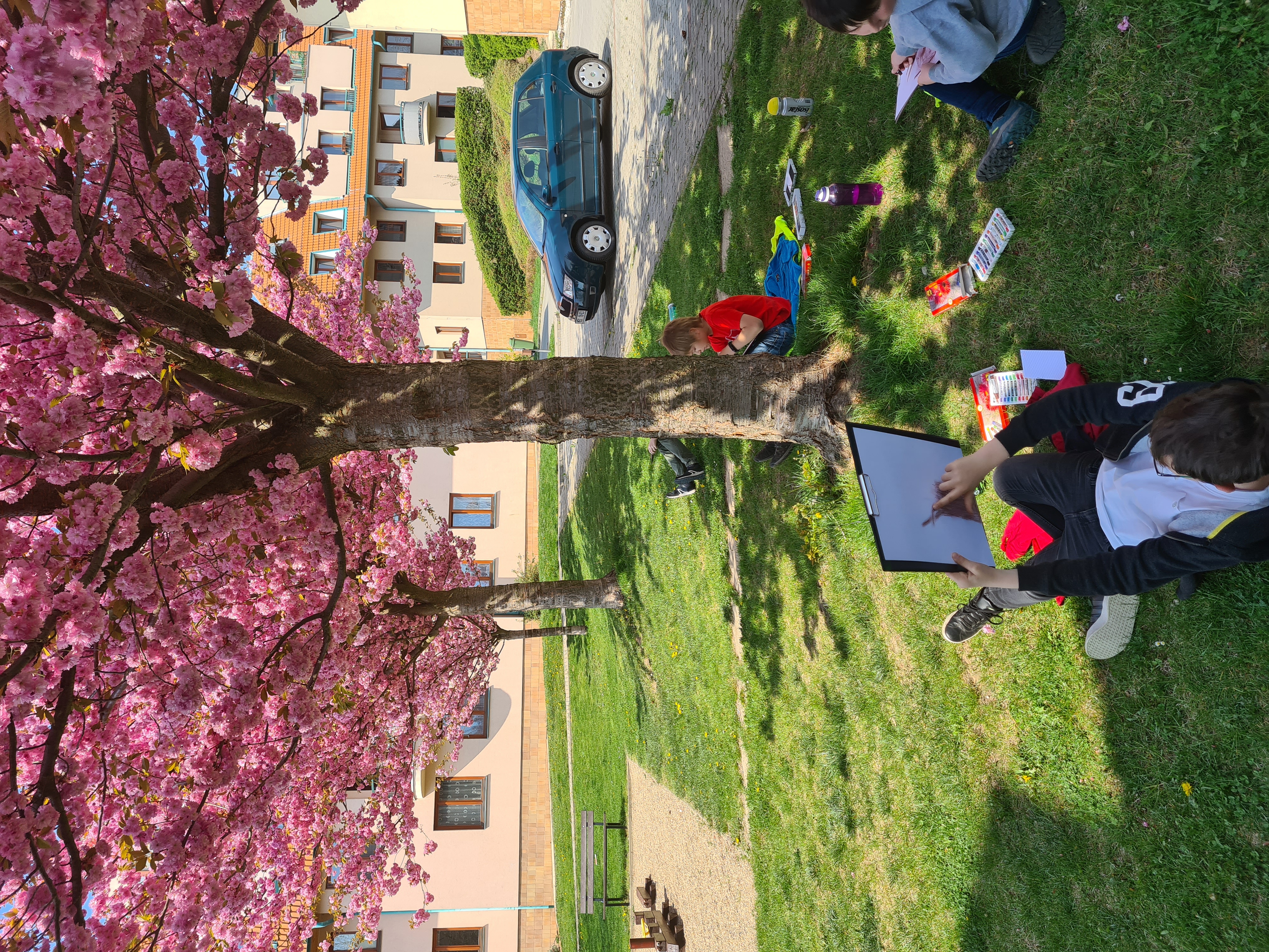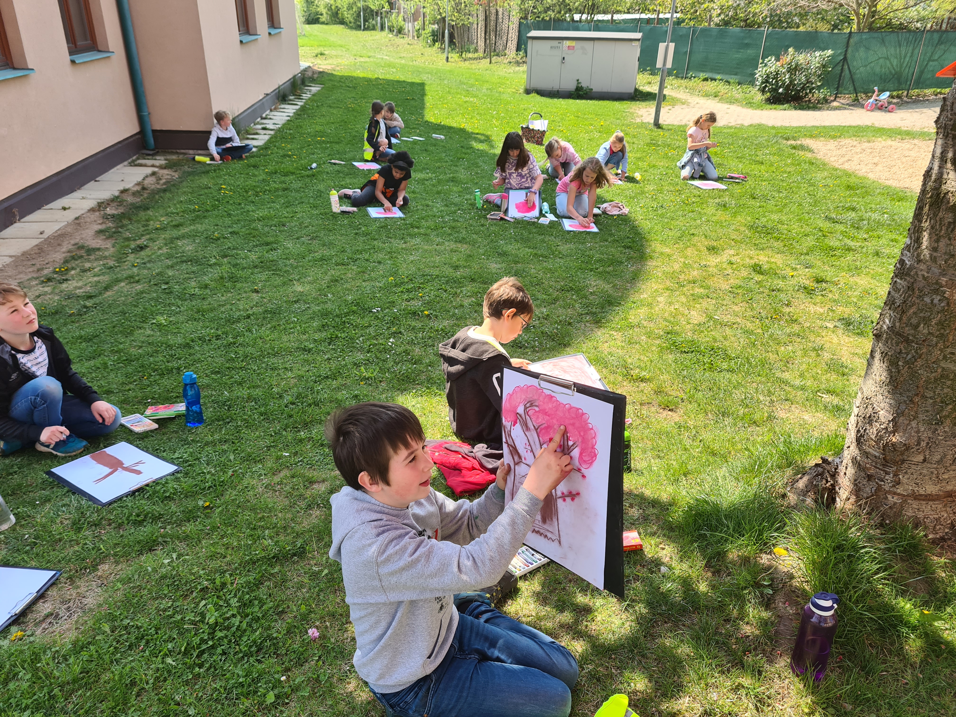Vyzkoušeli jsme si malování v přírodě, na trávě pod modrým nebem a růžovými květy.