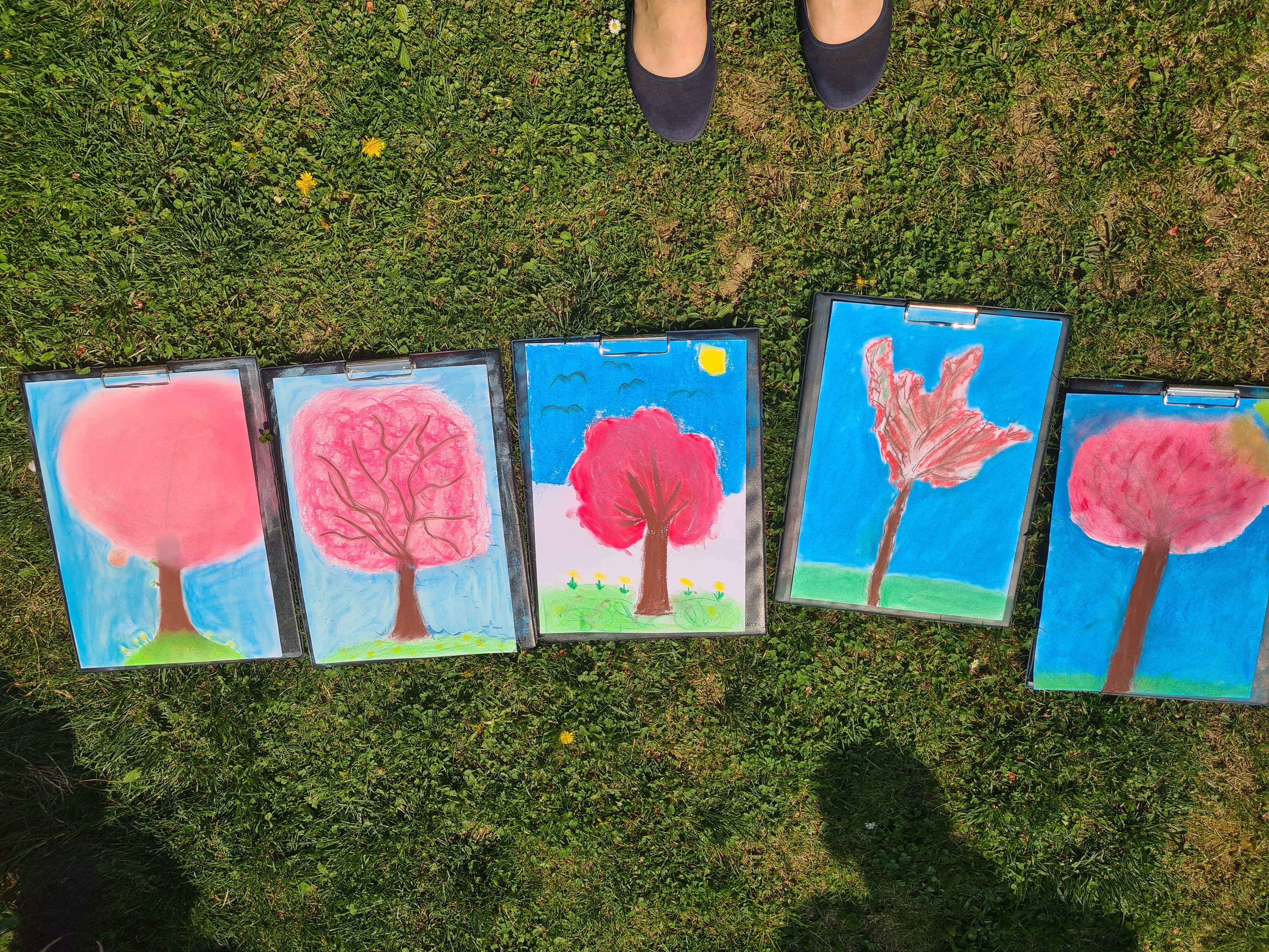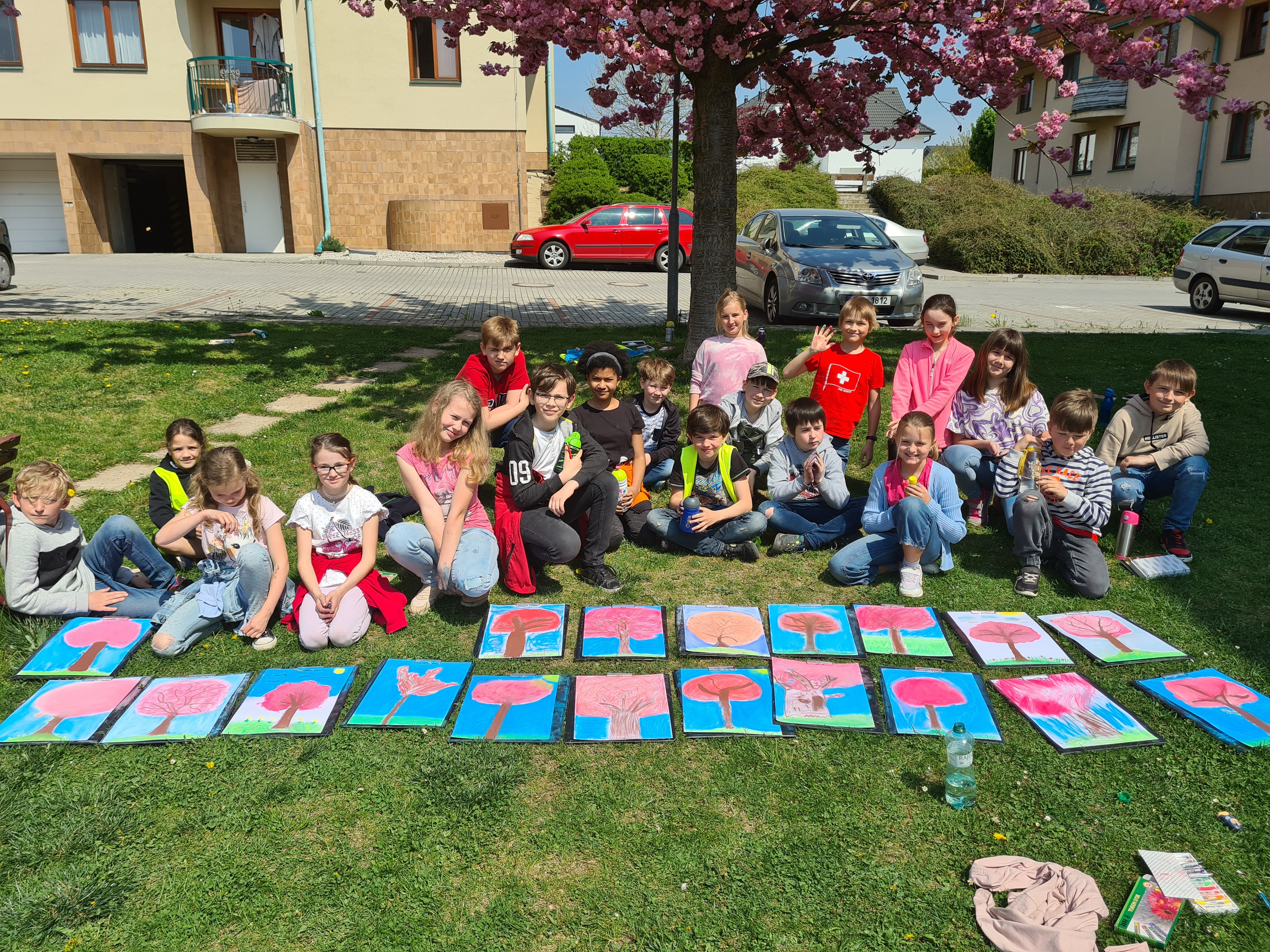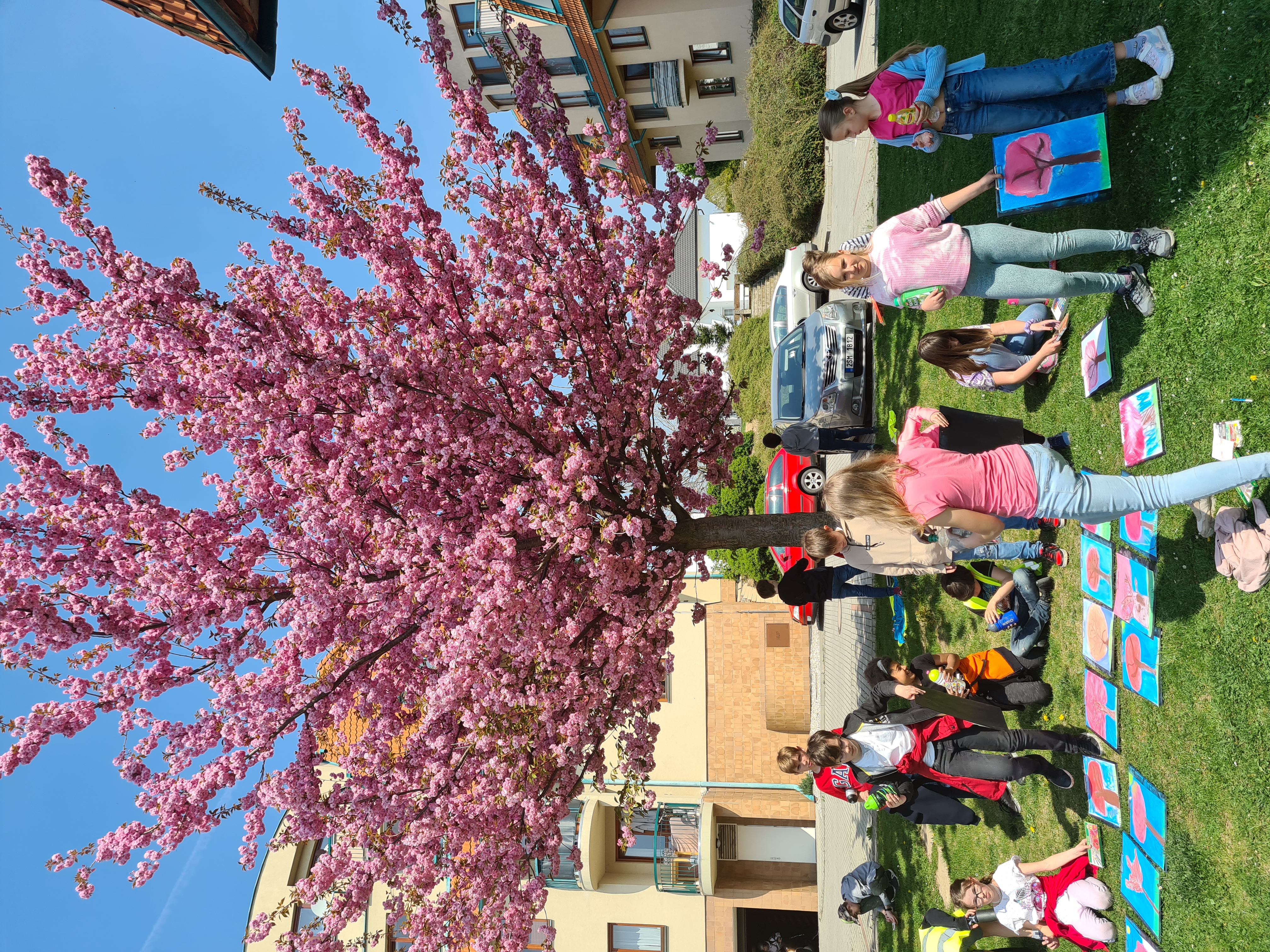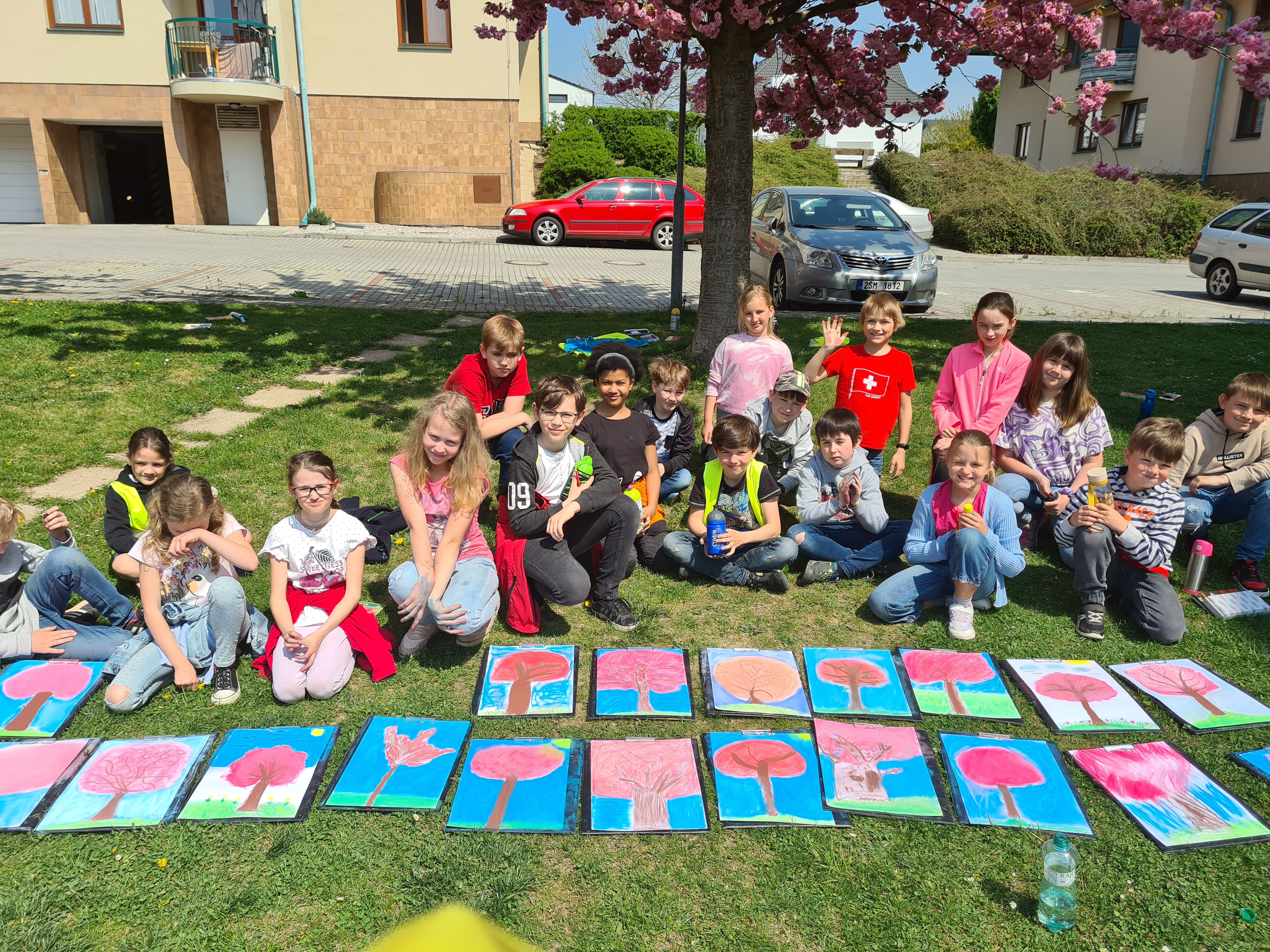 Vyzkoušeli jsme si malování v přírodě, na trávě pod modrým nebem a růžovými květy.