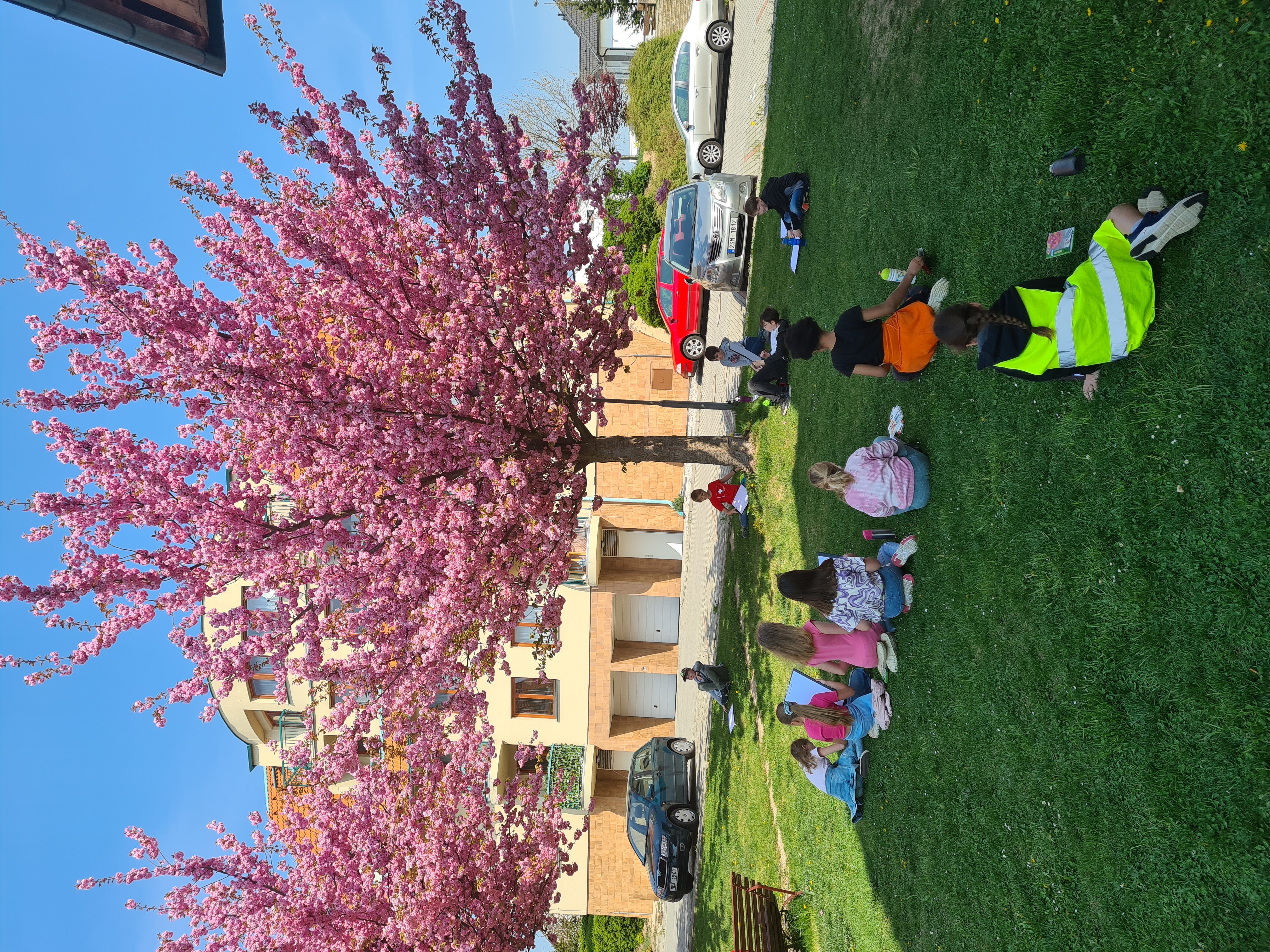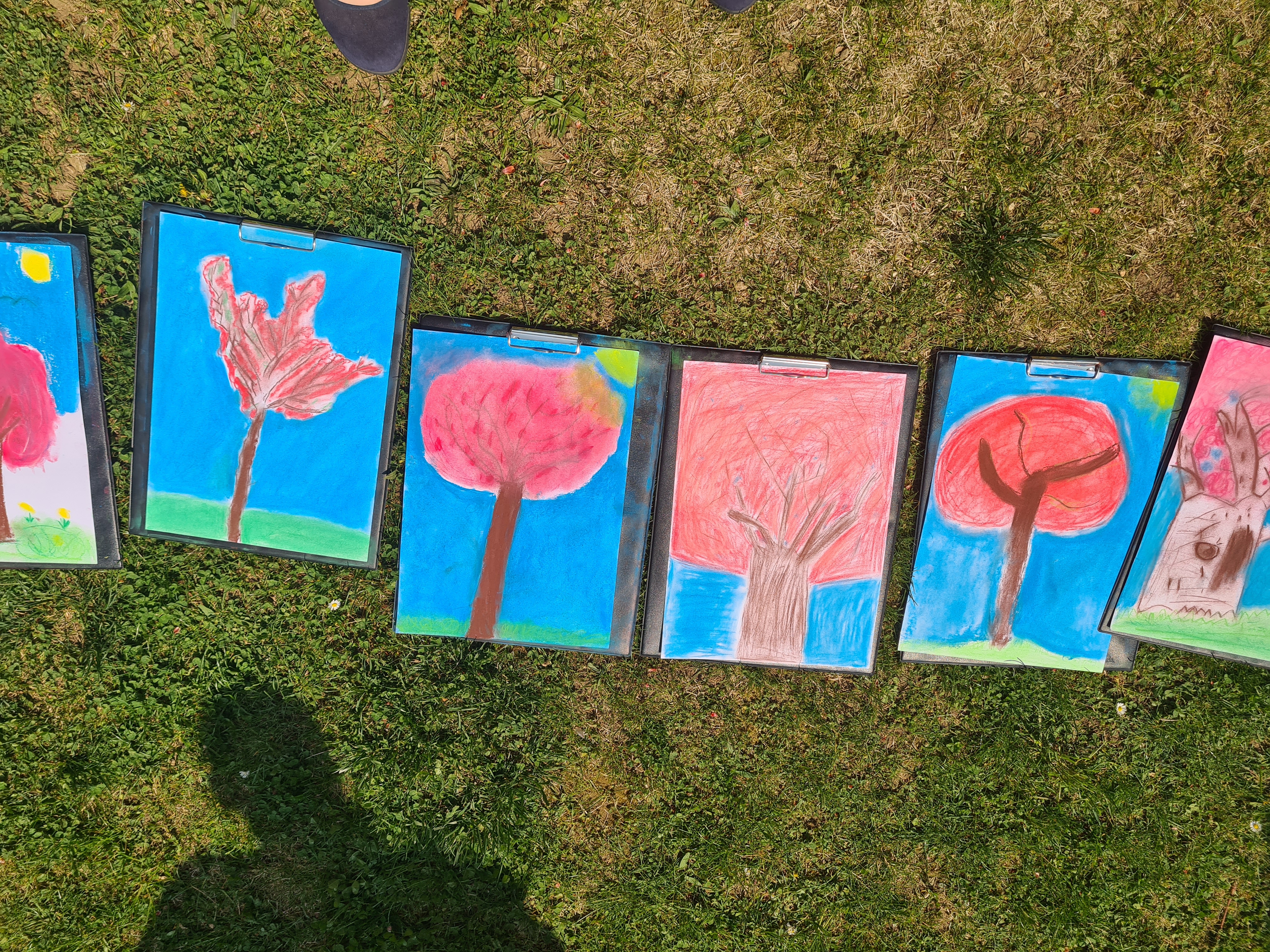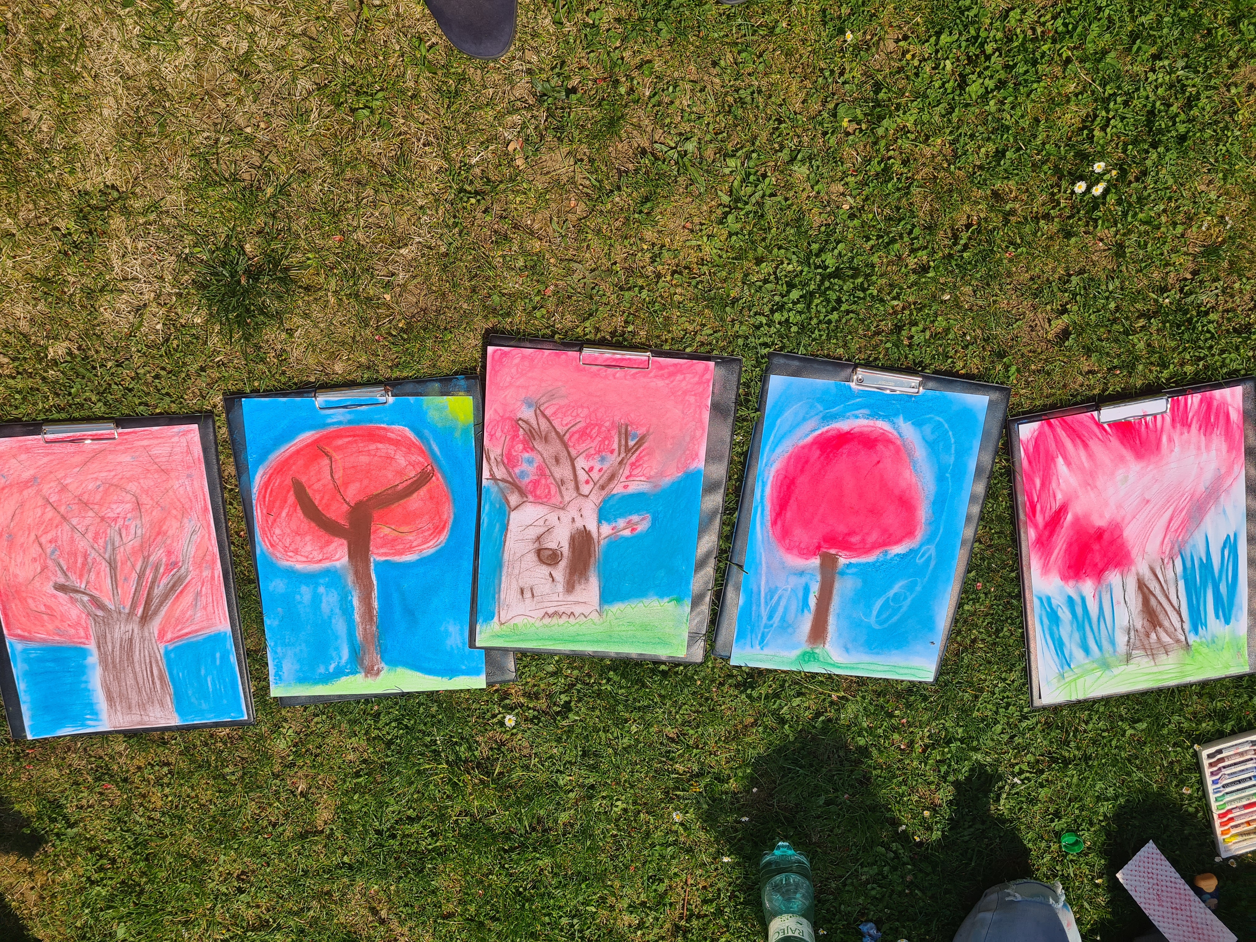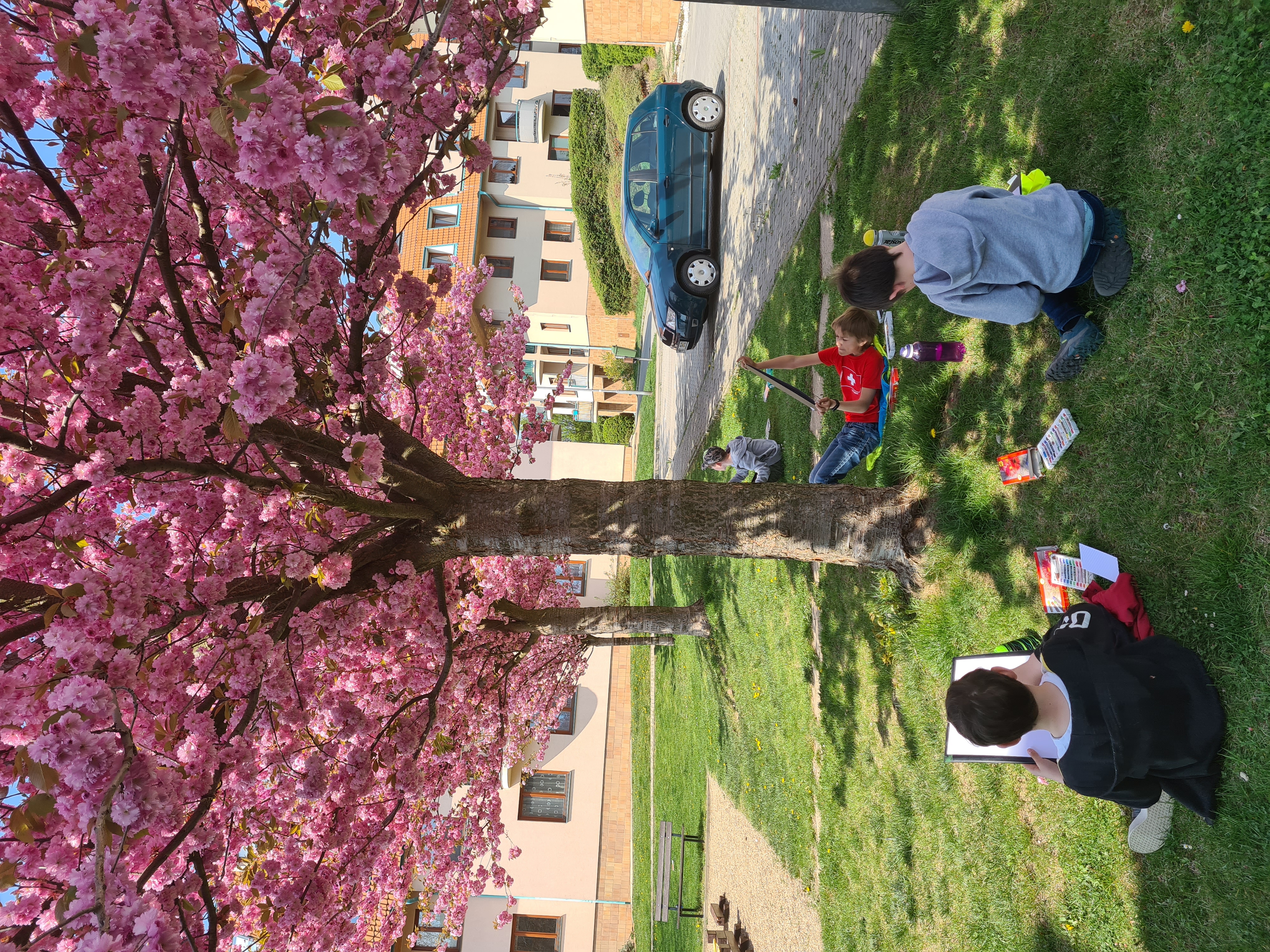 Vyzkoušeli jsme si malování v přírodě, na trávě pod modrým nebem a růžovými květy.