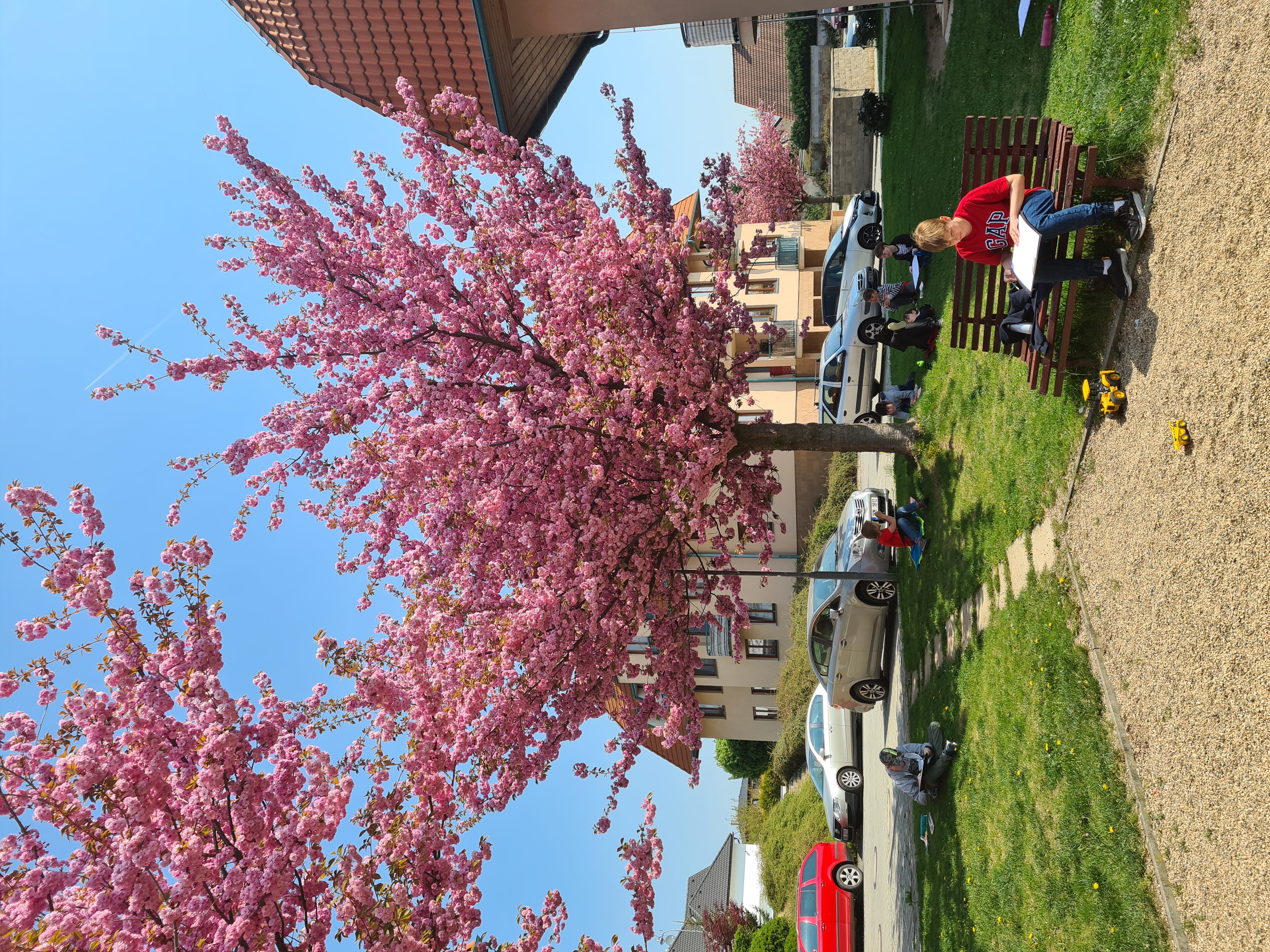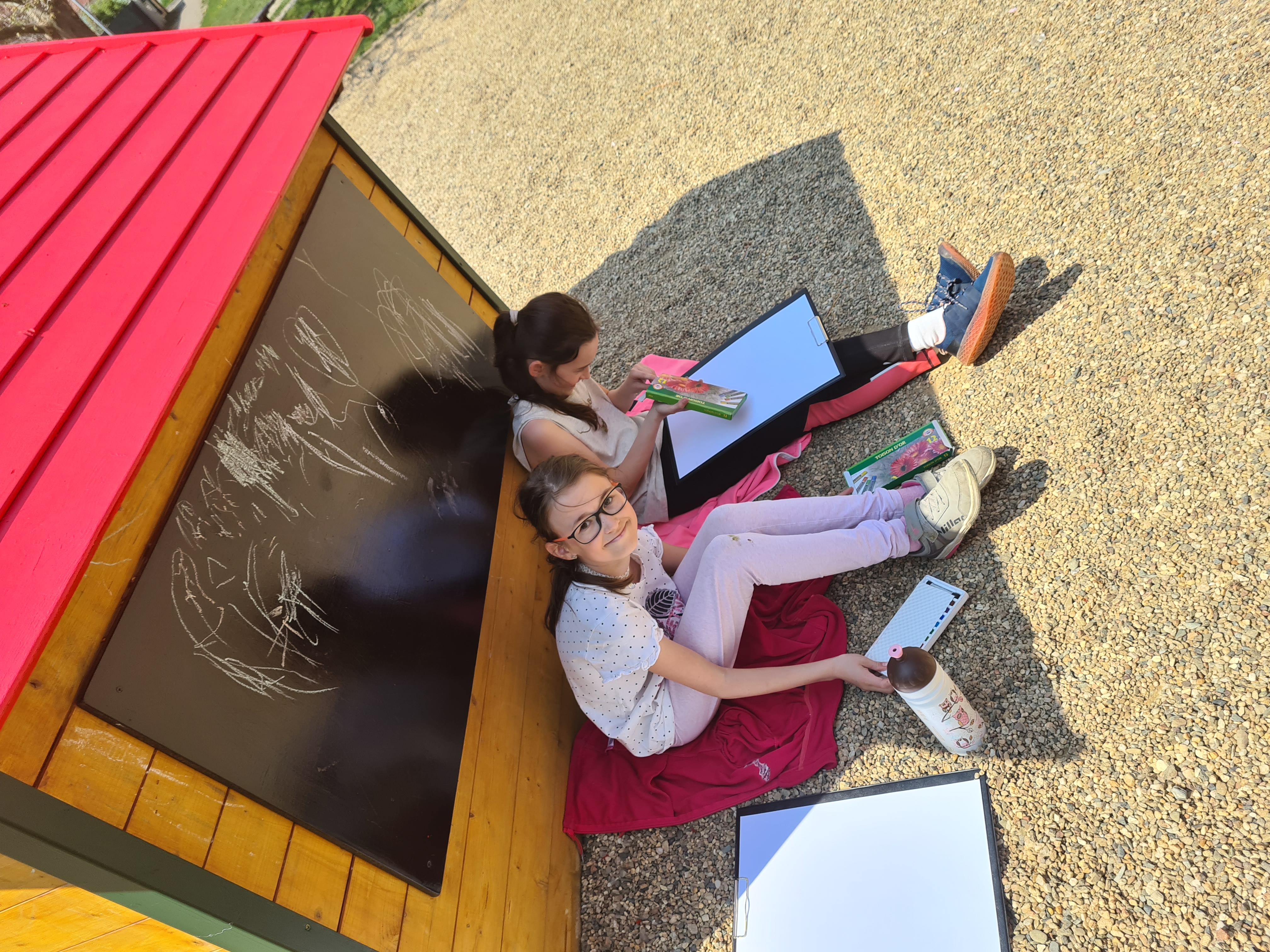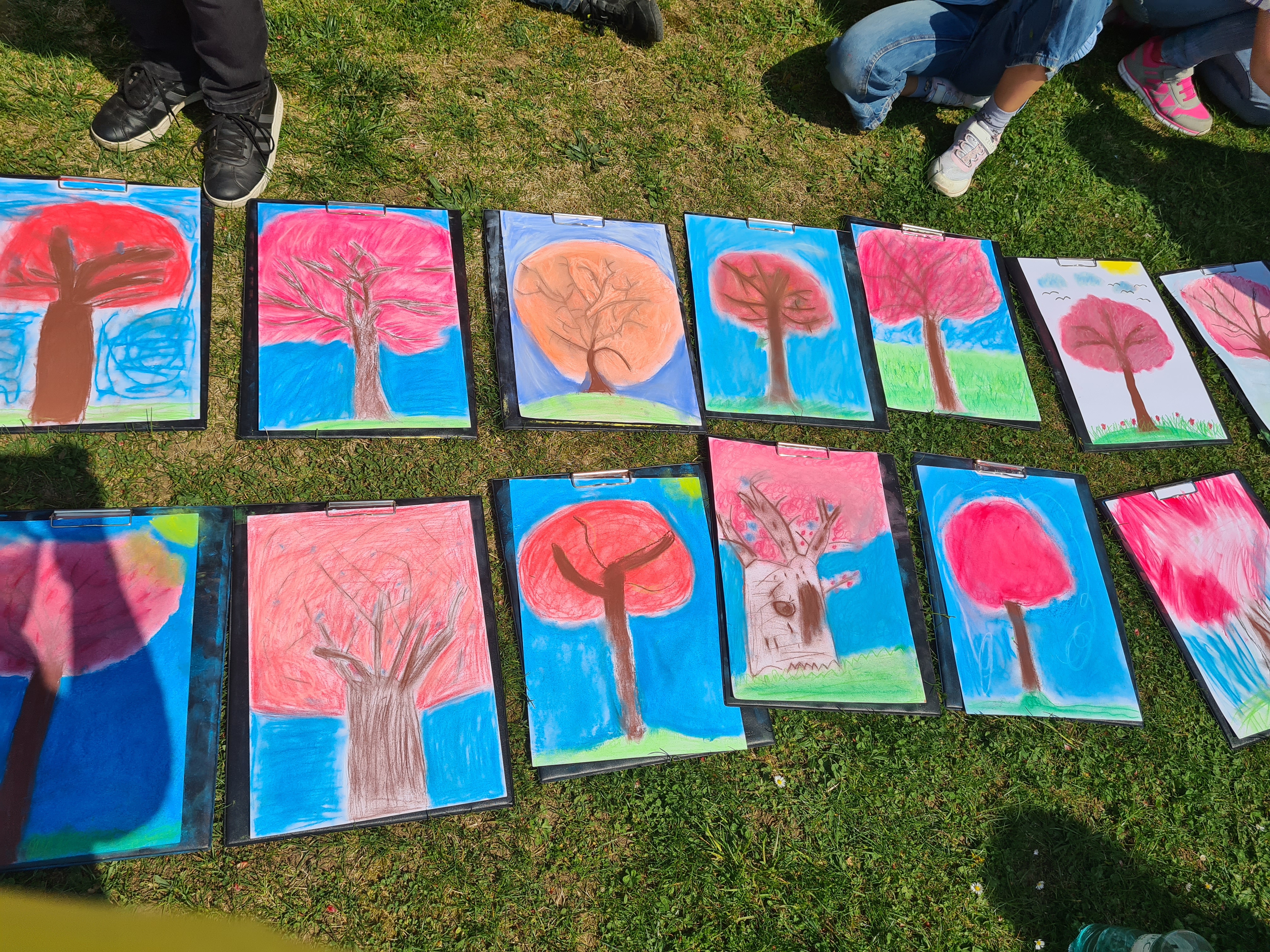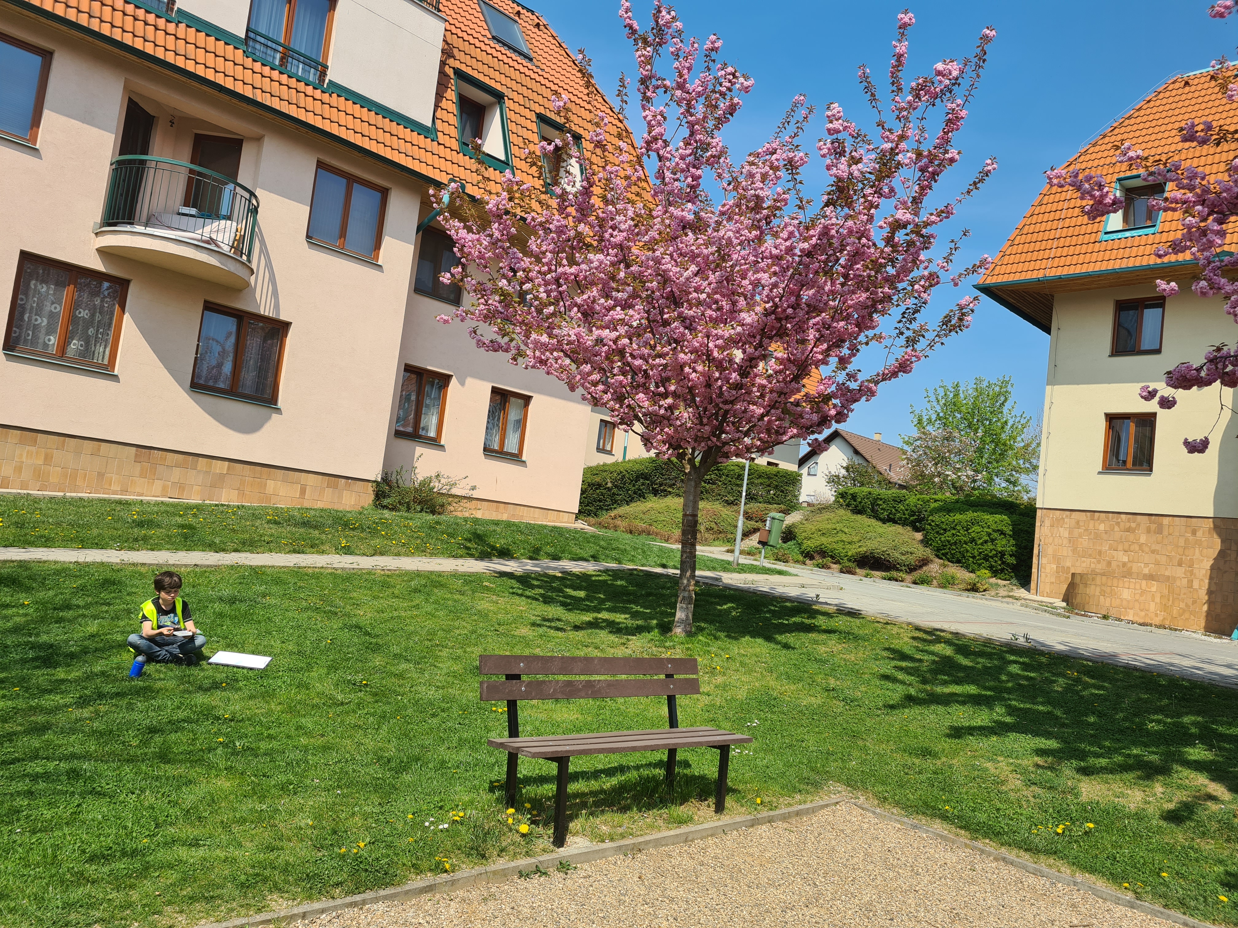 Vyzkoušeli jsme si malování v přírodě, na trávě pod modrým nebem a růžovými květy.
