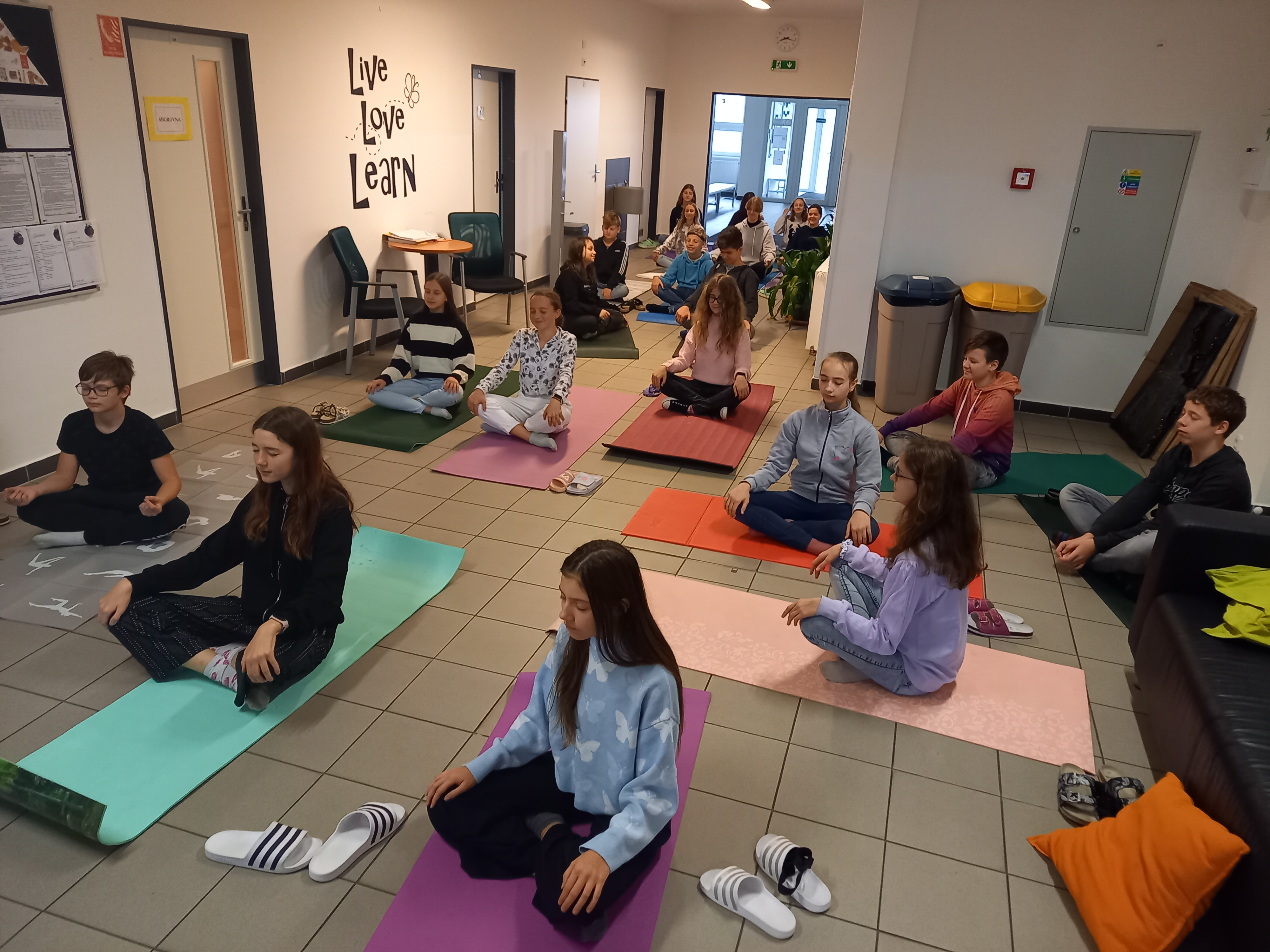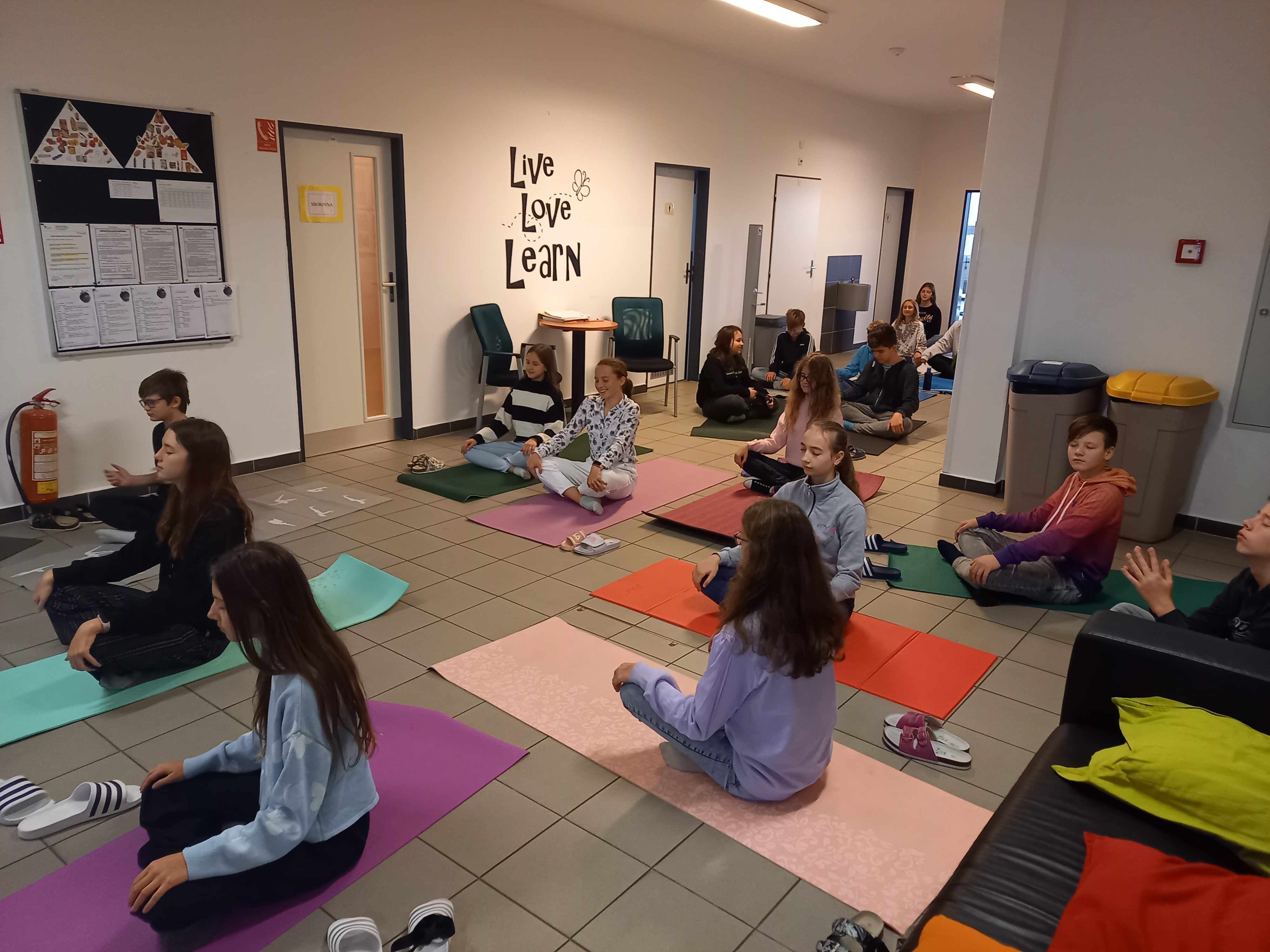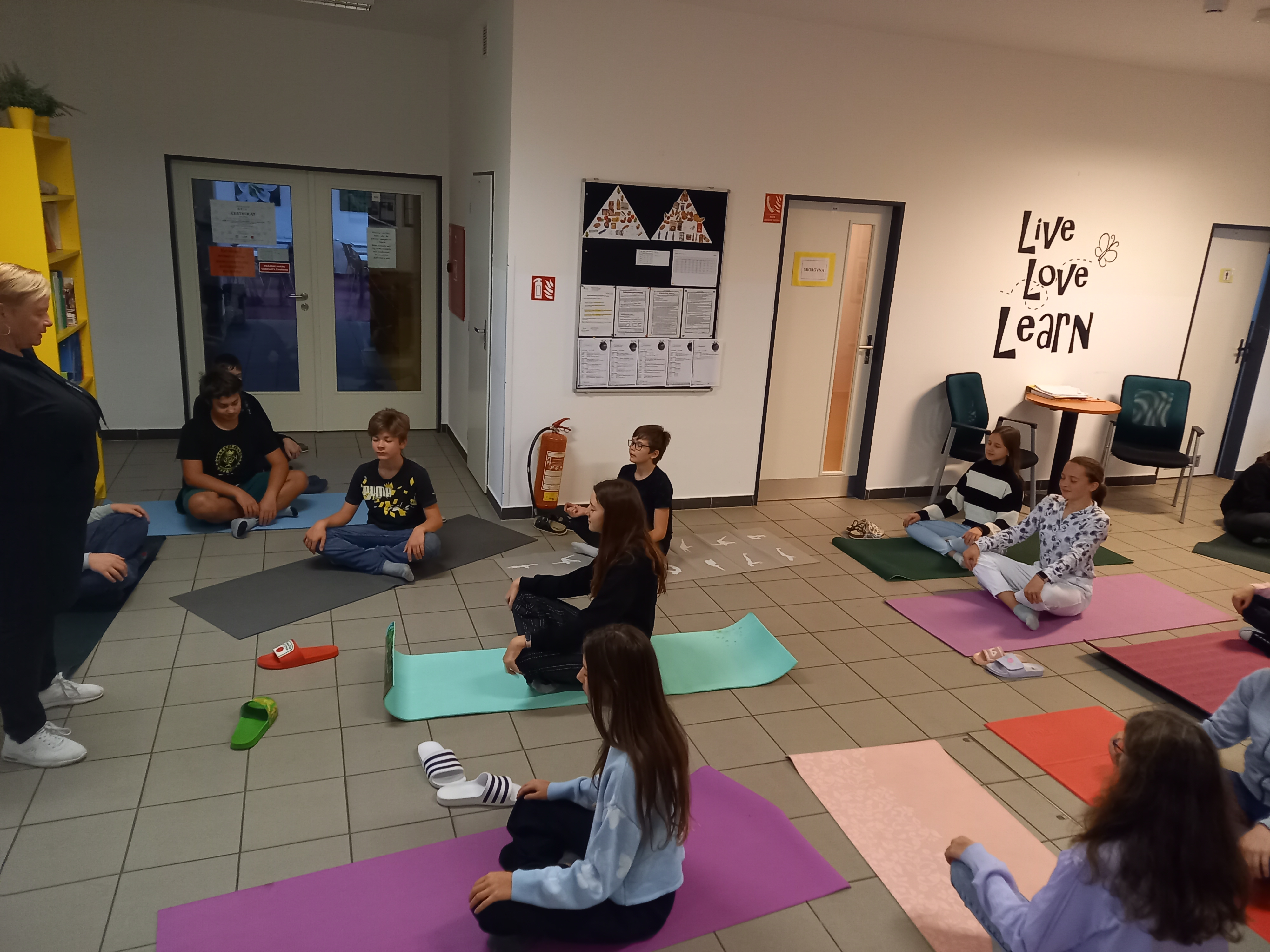Potěšila mě kolegyně Dáša Heráňová a její praktický přístup k hodině předmětu Výchova ke zdraví. 1. vyučovací hodina, po chodbách ticho a všude se učí a dole na chodbě také ticho, ale moje VII. A cvičí! Nejen teorií živ je člověk, hýbej se žáčku a začni krásně den třeba jógou. Zklidnění na podložce, prodýchávání, pozdrav…. děti byly zaujaté, soustředěné.