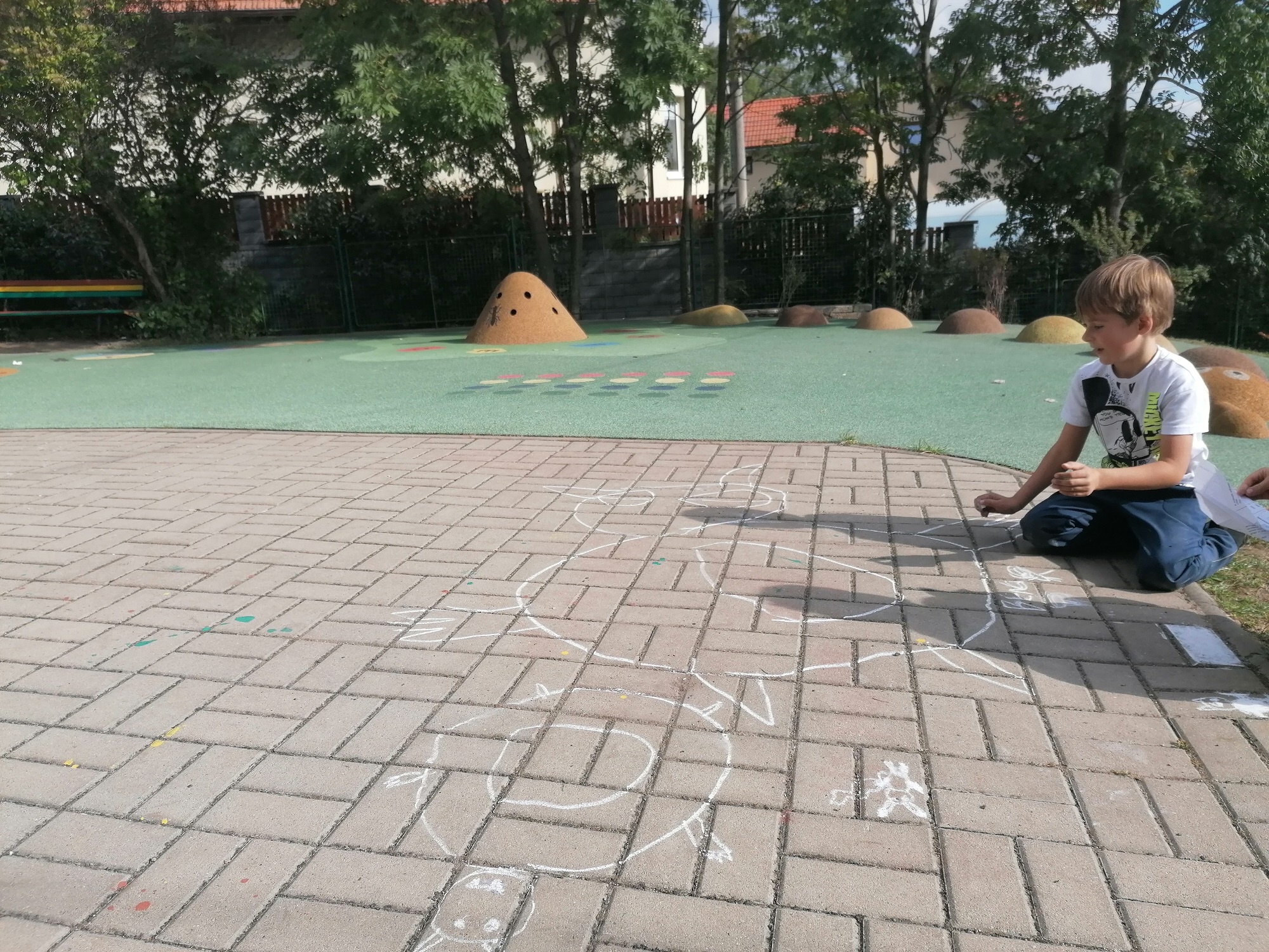 rádi bychom Vám představili, jak to vypadá v našem oddělení družiny. Nejdůležitější bylo se pořádně seznámit a to pomocí různých her s míči. Také jsme vytvářeli obrázky našich zážitků z prázdnin. Procvičovali jsme dopravní značky jejich malováním na silnici křídami a omalovánkami ve třídě. Také jsme si říkali, co auto udělá, když potká danou značku. Byli jsme v lese, kde jsme stavěli domečky pro skřítky a vymýšleli jsme, jaký skřítek v domečku bydlí a jaké vybavení v příbytku najdeme. V lese jsme také na Den úsměvu pracovali s přírodninami a vytvářeli jsme smajlíky. Nejprve jsme je ale natrénovali ve třídě na papír. V družině si také hrajeme s hračkami, které tam máme: holky často modelují a malují, kluci zase staví ze stavebnice nejrůznější stavby a dopravní prostředky. Také procvičujeme učivo a vymalovávali jsme obrázky, které začínají na dané písmeno. Navštěvujeme také zahradu, kde si děti hraji s různým vybavením od míčů, přes křídy na tabule či pálky s malými míčky, ale také zapojují fantazii a přetvoří fotbalové branky v prostorný domeček.
