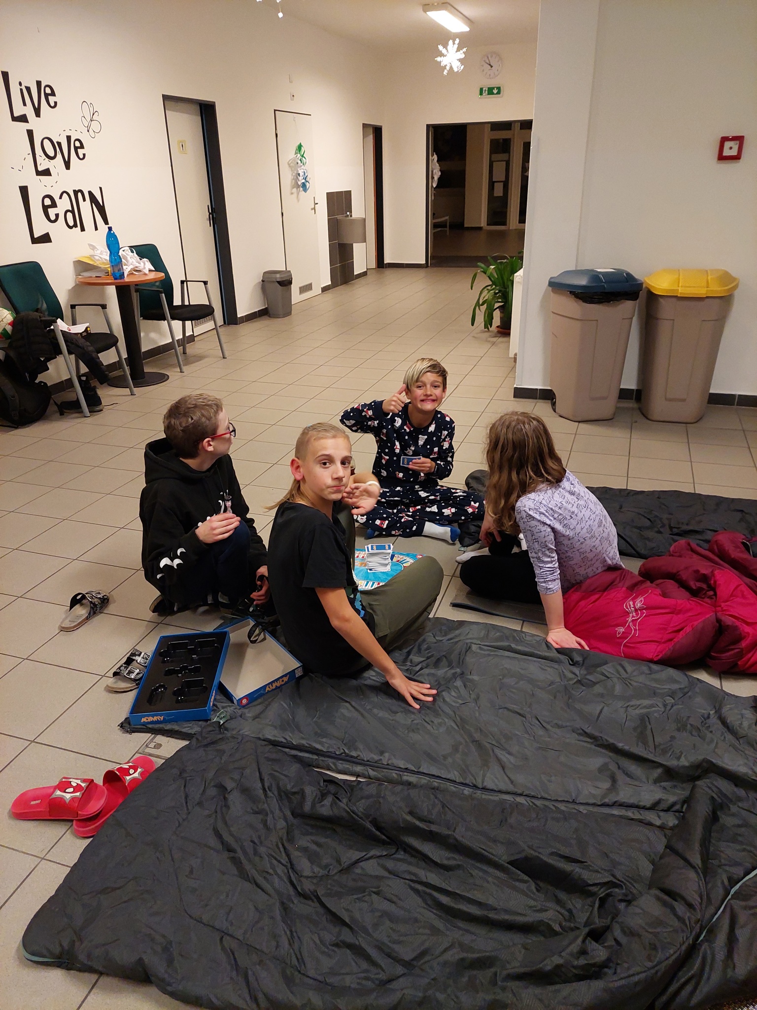 Ve čtvrtek 8. 12. si děti ze VI. A výjimečně nešly do školy „pro vědomosti“ a učit se, ale přišly sem strávit společně večer a noc a pobavit se se svými kamarády. Protože jsou to sportovci tělem i duší, nevadilo jim chladnější prosincové počasí a společně si zahrály vybíjenou na školním hřišti, schovku, později došlo samozřejmě i na nejrůznější taneční kreace 🙂 Před spaním se zklidnily u deskových her a vánočního filmu. Samotné přespání ve spacáku na podlaze bylo pro mnohé vykročením z jejich komfortní zóny, ale ta trocha nepohodlí jistě nikomu neuškodila, ba naopak! Společně jsme to všichni zvládli.