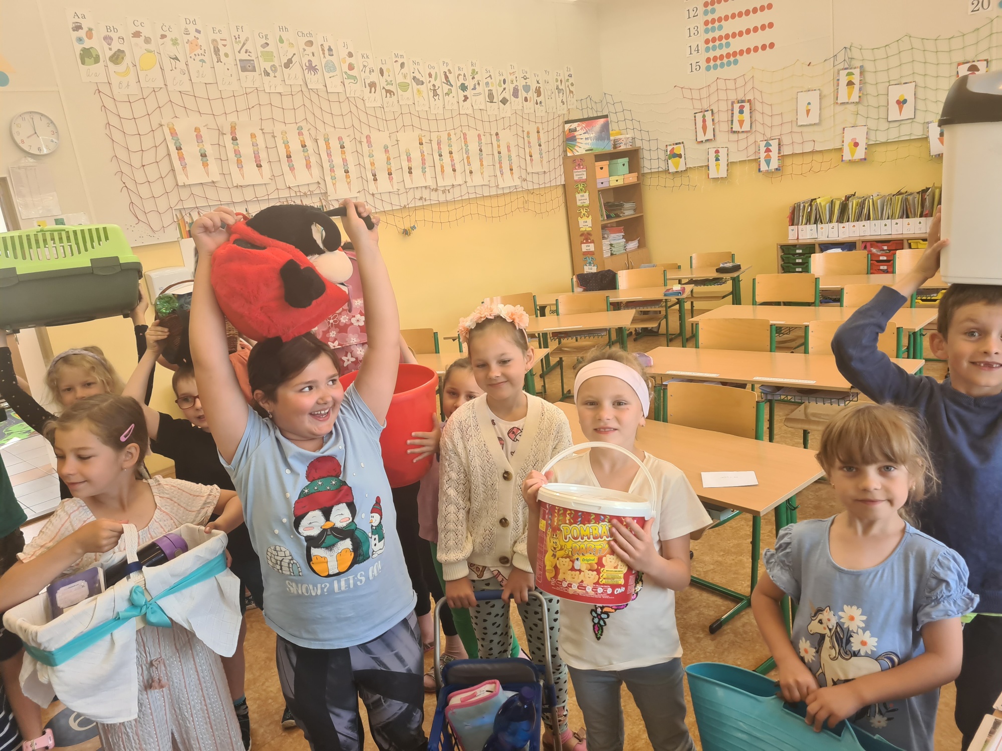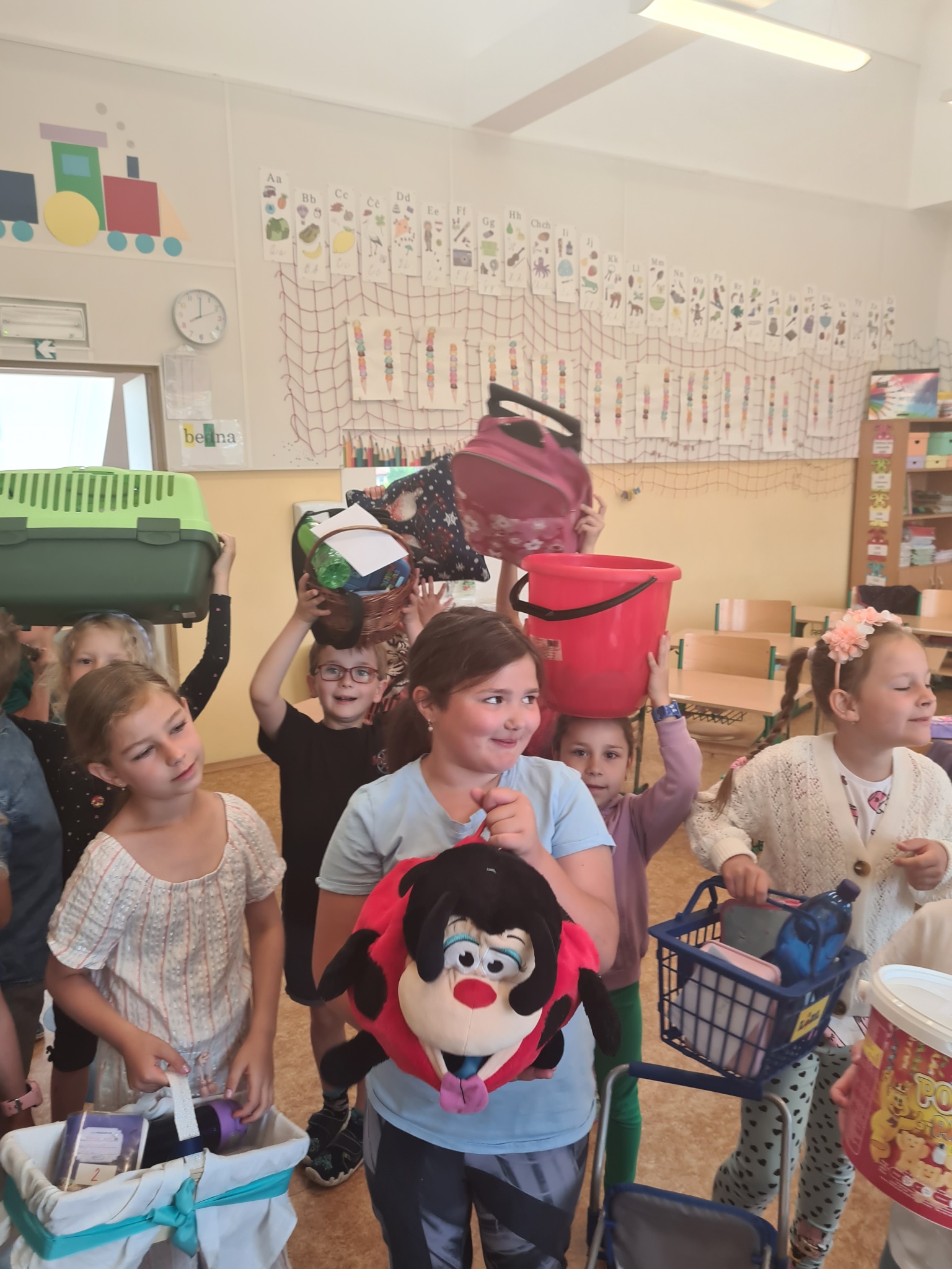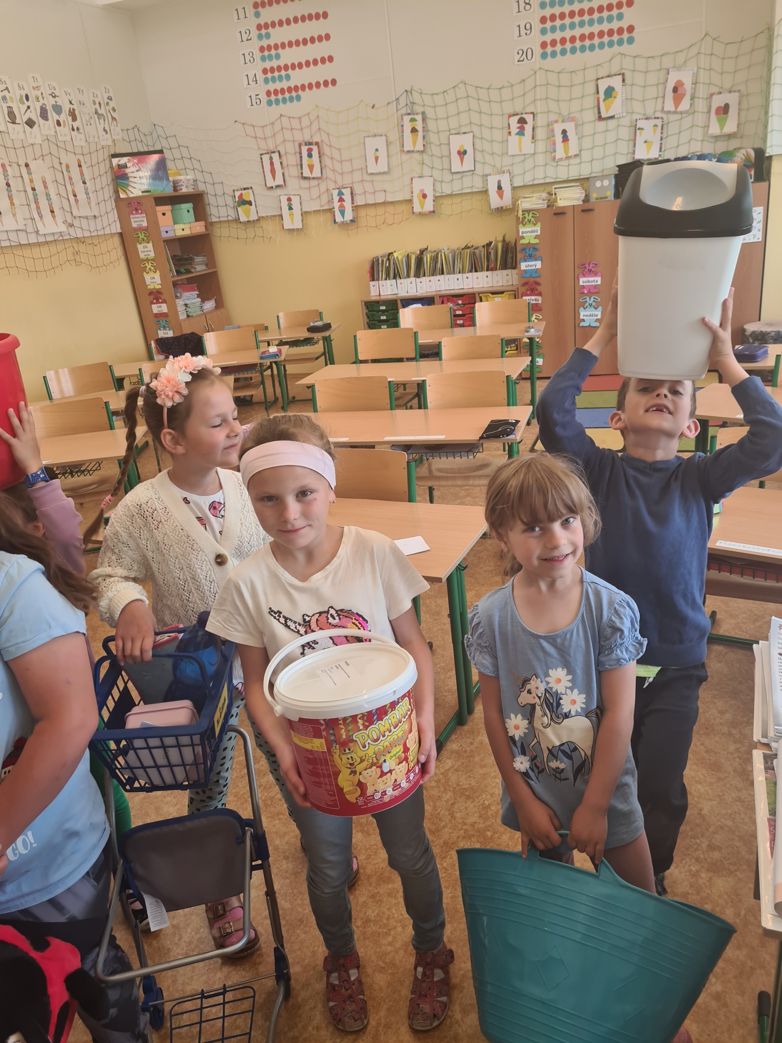 Sešity a učebnice v nádobách rozličných tvarů, barev a velikostí. Představte si, že i rybářská síť či nákupní vozík může do školy. Sice pouze jeden den, ale byla to zábava, na kterou budeme vzpomínat.