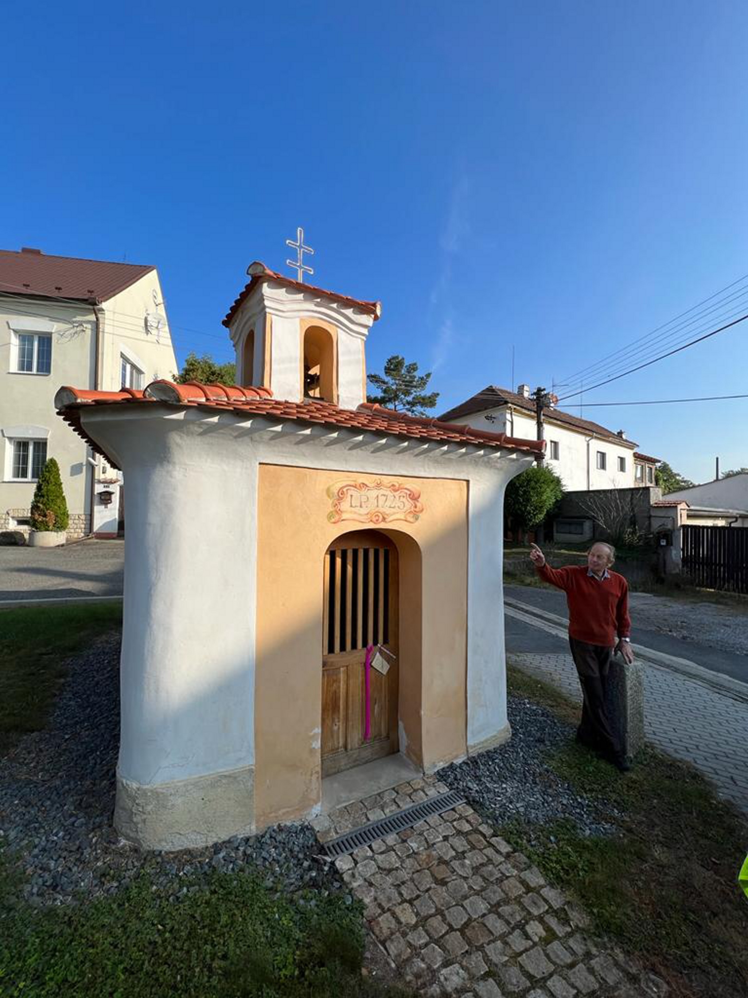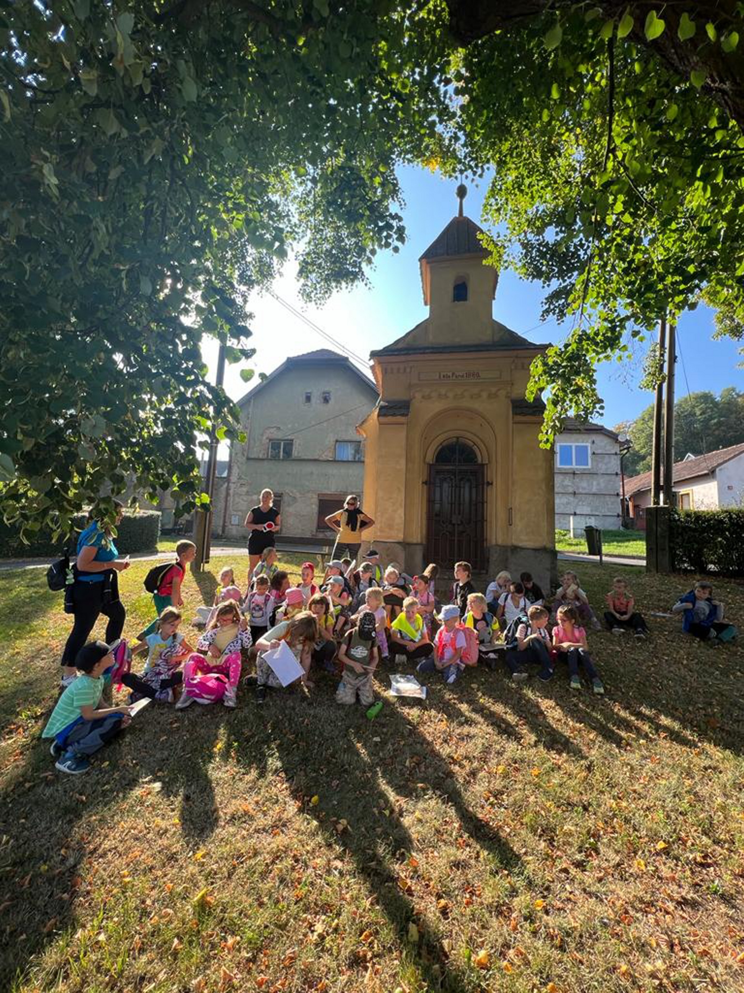 Následovala trasa okolo restaurace u Korycha, zastávky autobusu, budovy školy (2. stupeň), mateřské školky a fotbalového hřiště, Špejcharu a závěrečné zastavení bylo u druhé přílepské kapličky sv. Gotharda. I tam jsme měli štěstí a místní starousedlík nám ji otevřel, děti nahlédly dovnitř a též nám pán zazvonil. Měli jsme tak možnost porovnat hlas obou zvonků.