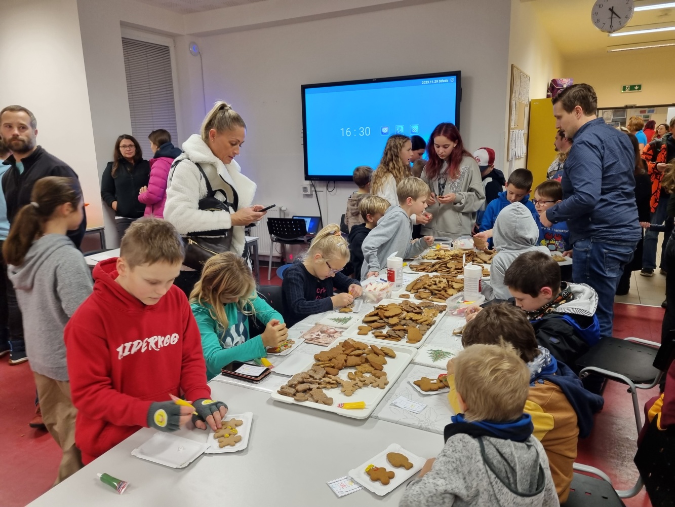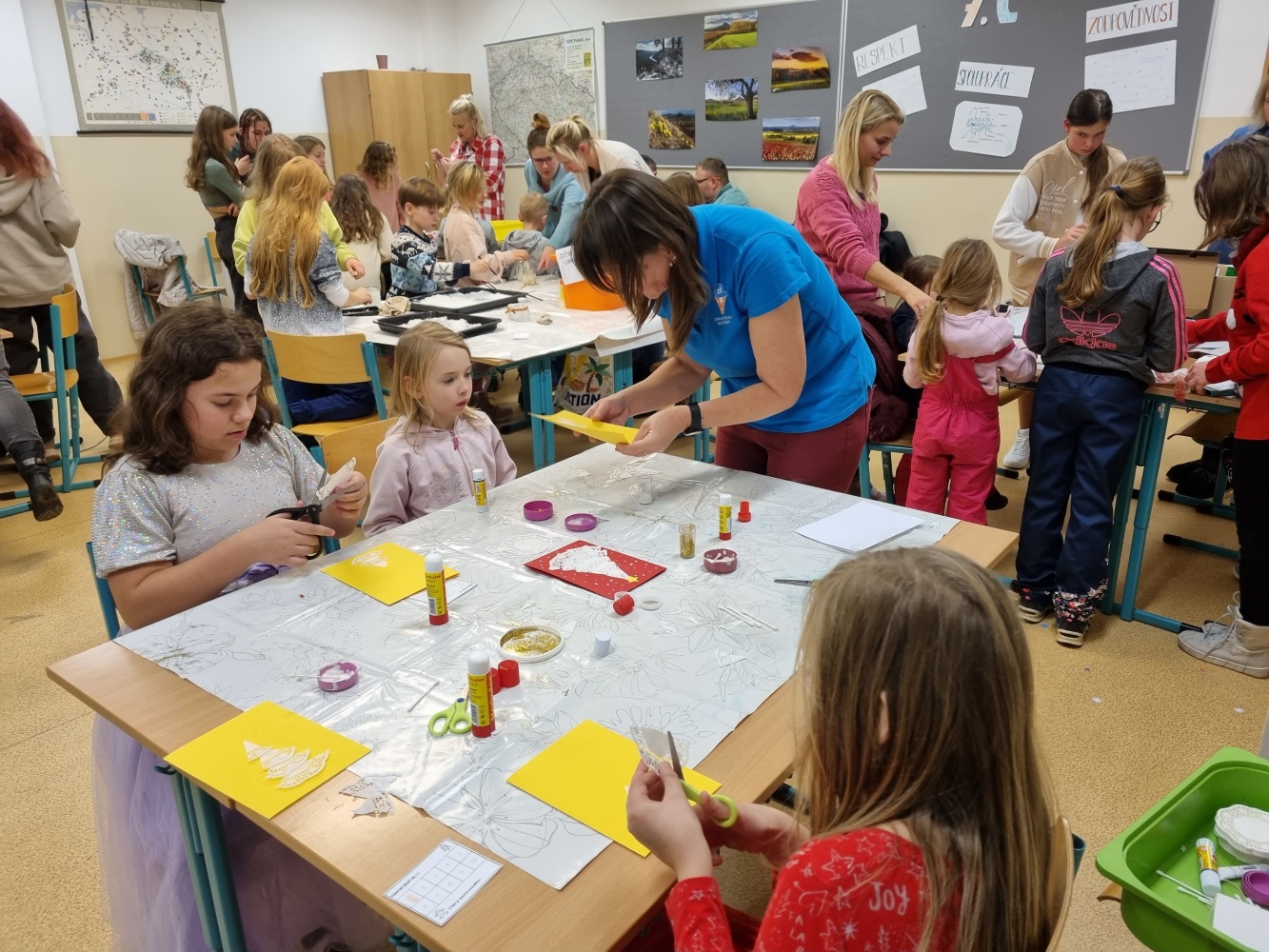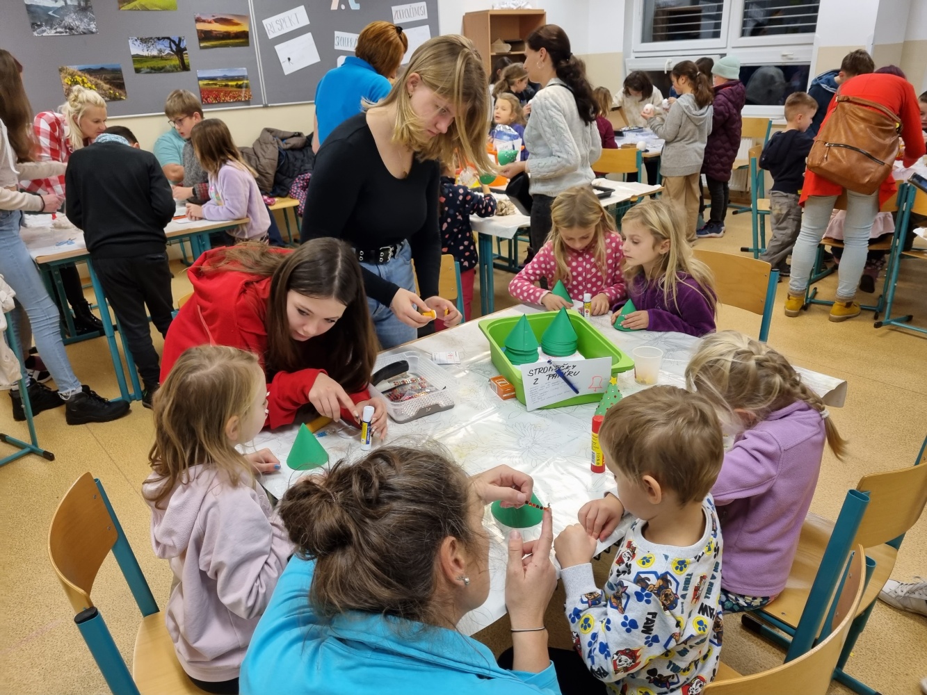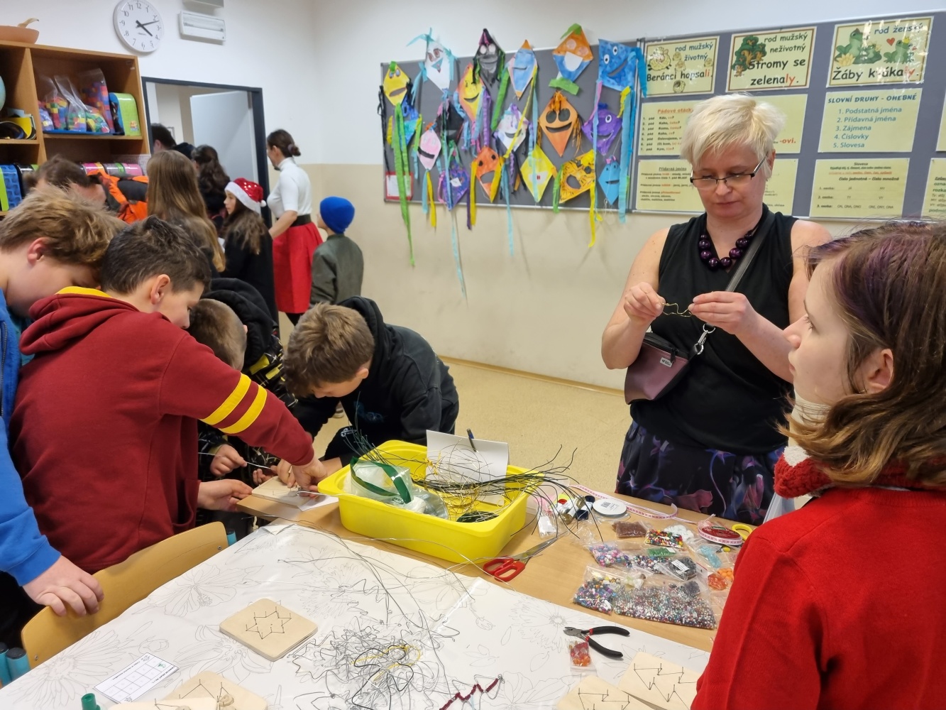 Tento rok bylo připraveno 14 stanovišť, která pod sebou skrývala výrobu krásných vánočních dekorací z různých materiálů, od polystyrenových dekorací přes dřevěné výrobky až po skleněné svícny. Mohli jste ale také navštívit stanoviště se zdobením perníčků, tradiční pečení cukroví, či stejně jako každý rok ochutnat zdravé pomazánky naší paní ředitelky.