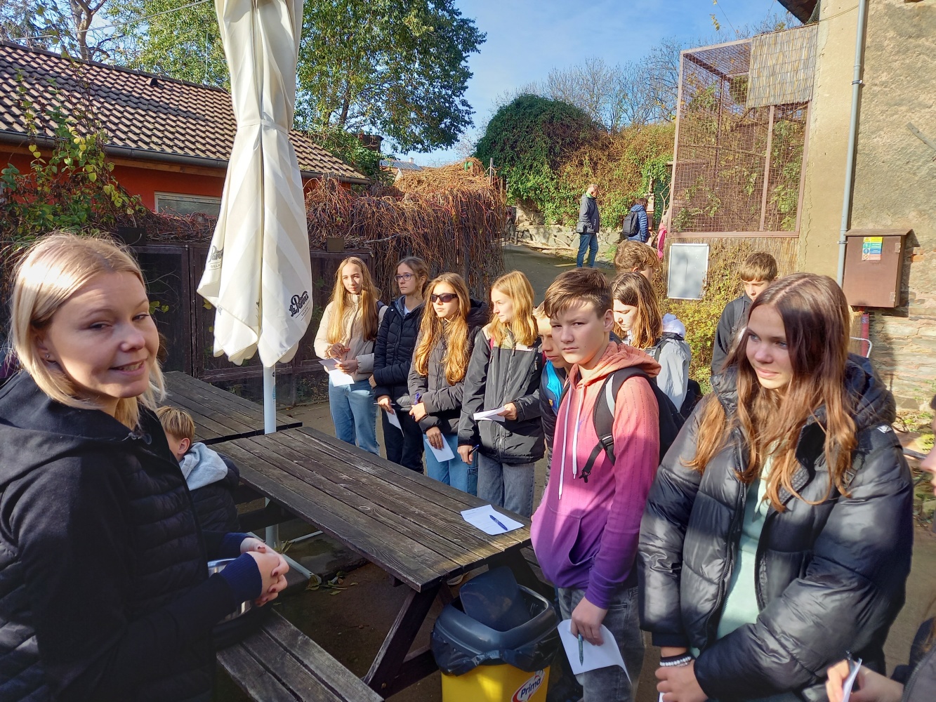 Objednané jsme měli v rámci přírodopisu dva lektorské programy o savcích. První v centrální části u lemurů – poznali jsme 5 zde žijících druhů, viděli kočkodany, drápkaté opičky, surikaty, zvláštní morčata a málo známé mary. O každém druhu jsme se dozvěděli spoustu zajímavostí, jak z divoké přírody, tak z jejich chovu. Lektorka lemury krmila, každý má jméno a očividně jsou na lidský přístup zvyklí. Už je jim chladno, tak s otevřenými náručemi nasávali poslední sluneční paprsky.