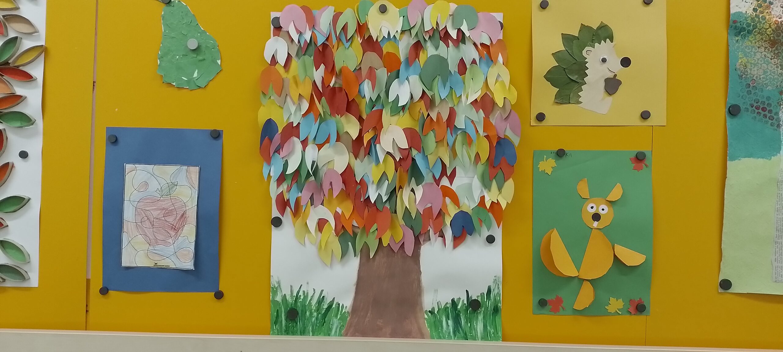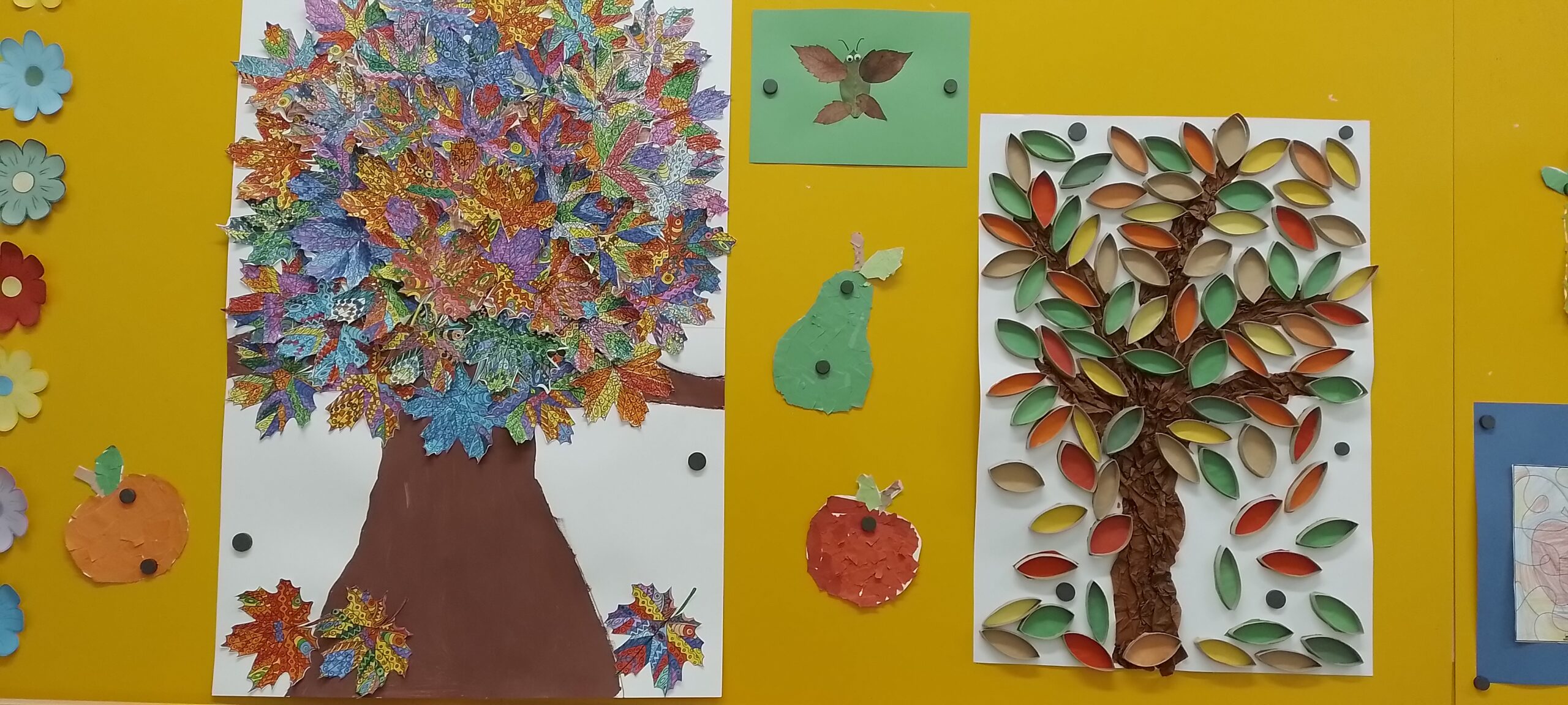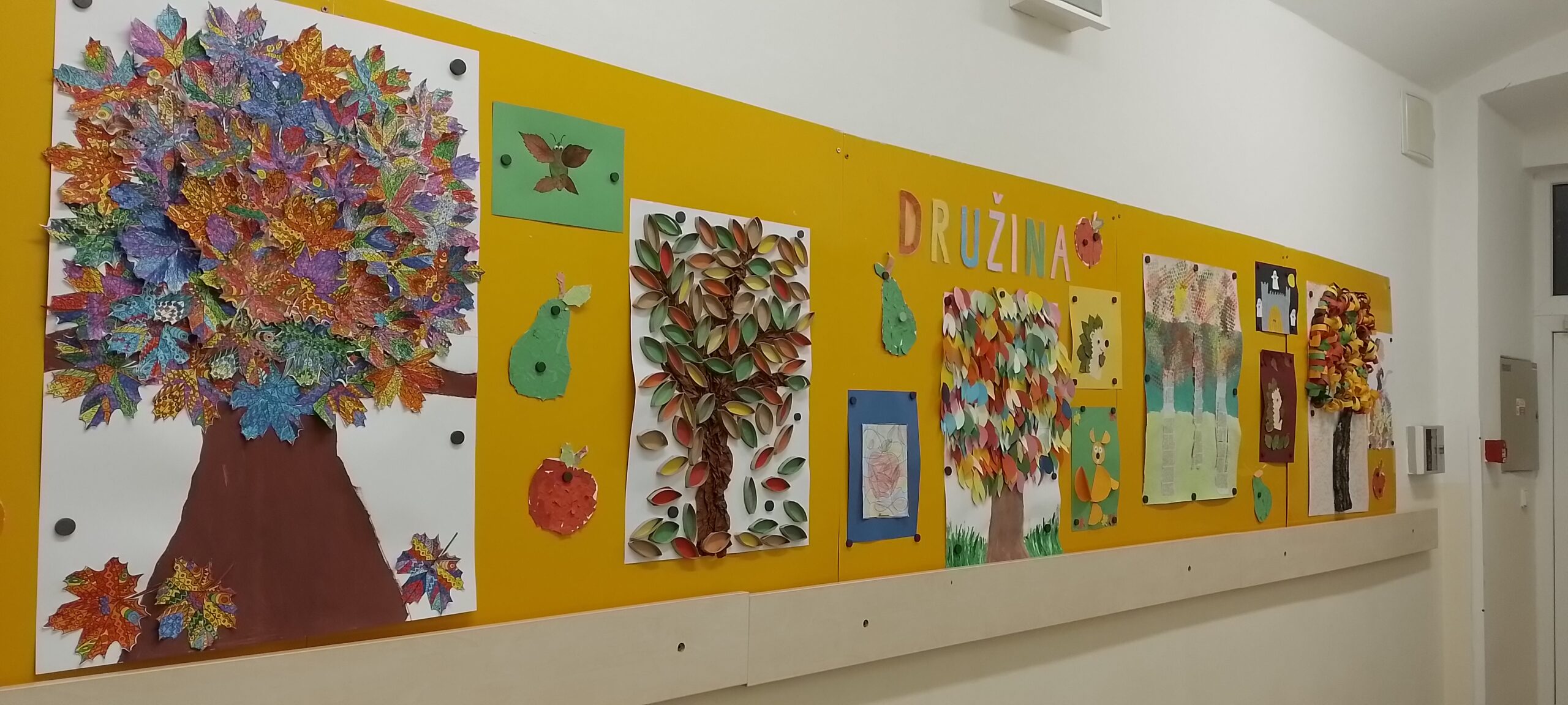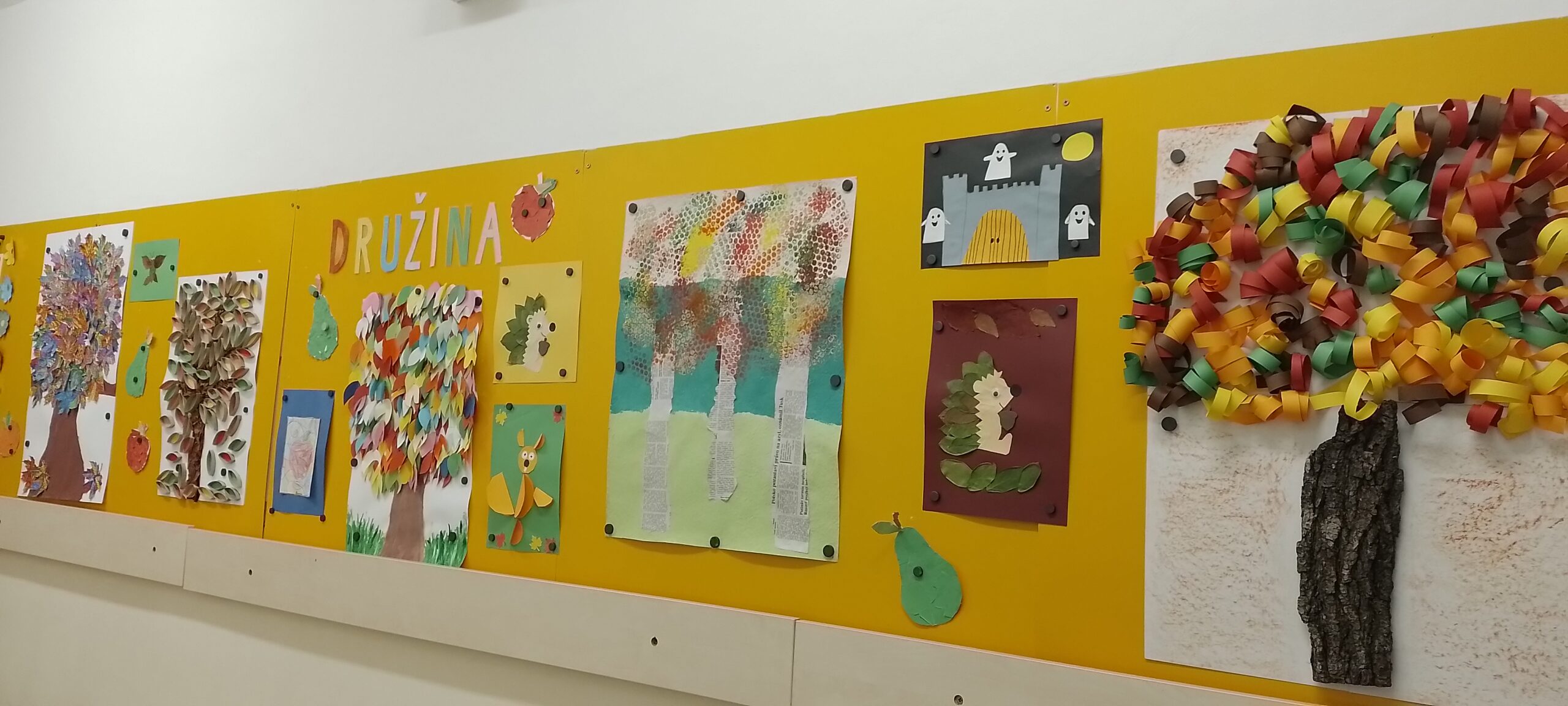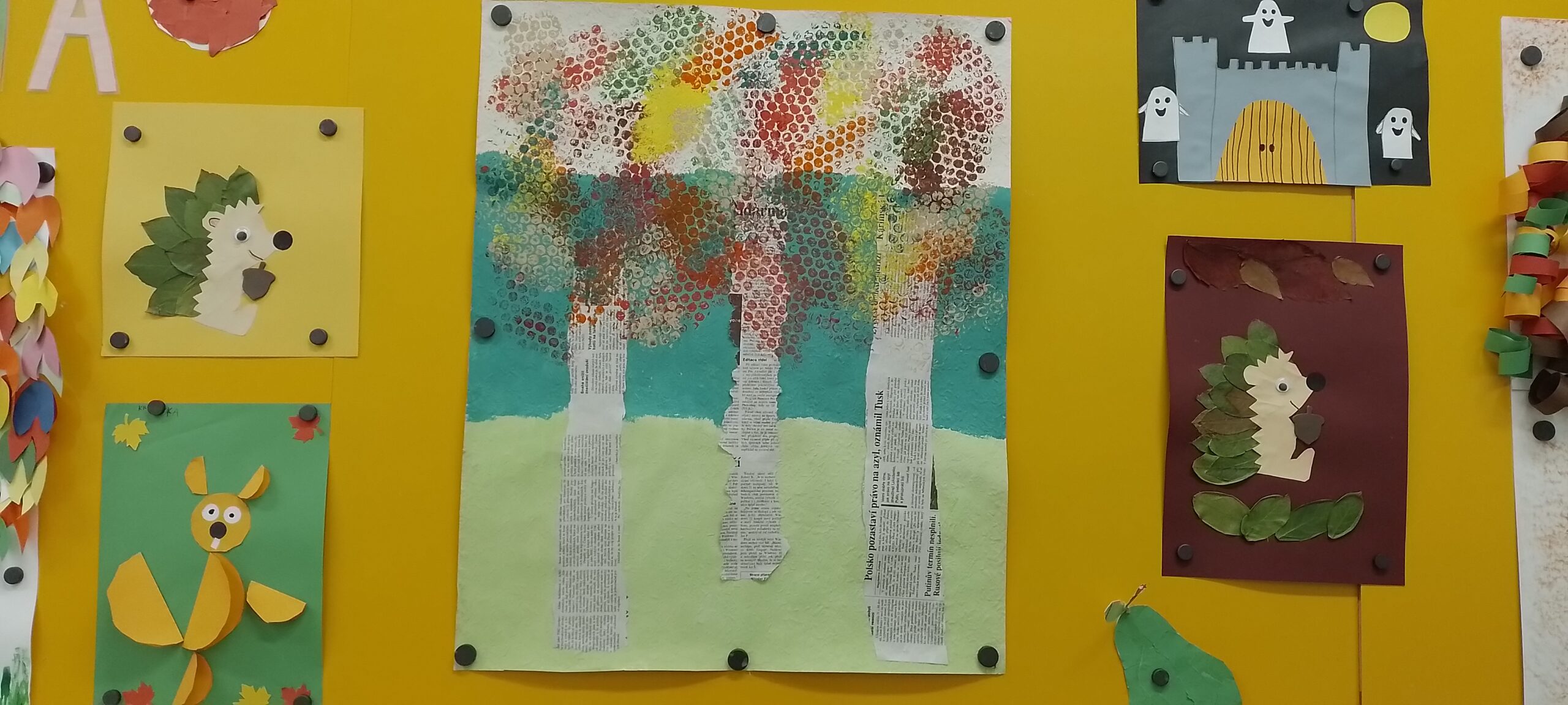 Na závěr pak vznikají v každém oddělení společná výtvarná ztvárnění stromů, která jsou vystavena na nástěnce před jídelnou prvního stupně.