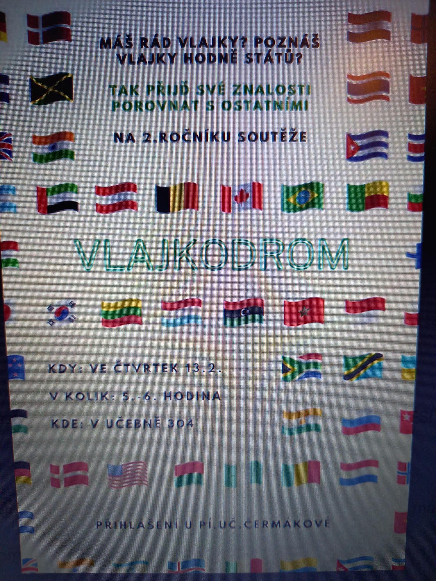 Druhý ročník soutěže pro žáky 2. stupně, kteří se zajímají o vlajky. Ve čtvrtek 13. 2. se 27 zájemců utkalo o první dvě místa, která postupují do dalšího kola již na úrovni okresu.