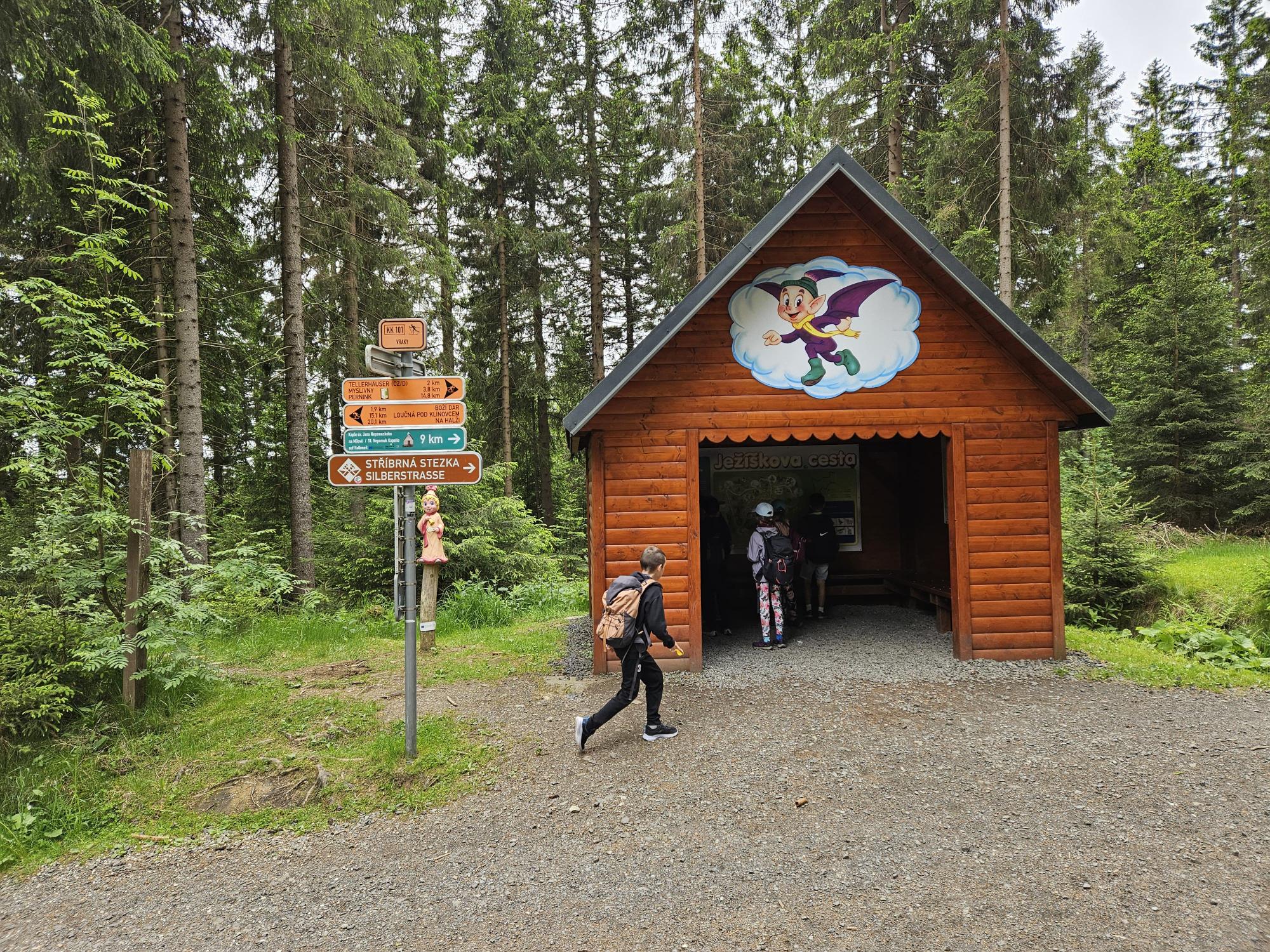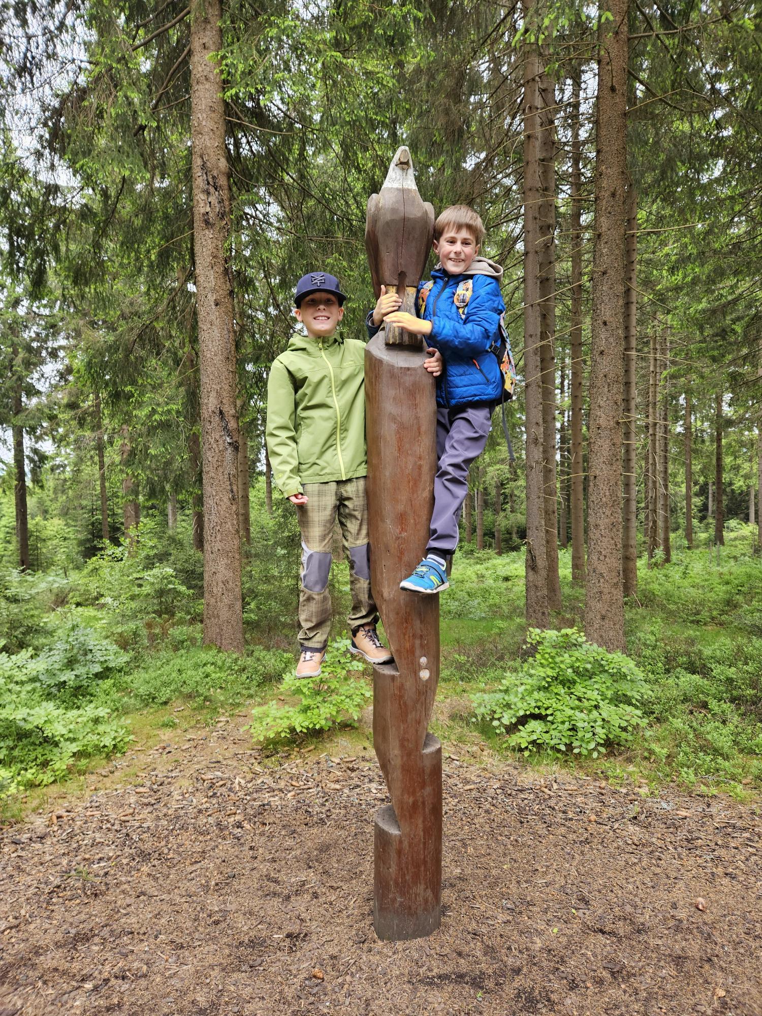 Dnes jsme se vydali autobusem na Boží Dar. Nejprve jsme navštívili Horskou službu, kde nám pán pověděl spoustu zajímavostí a také nám předvedl cvičeného psa Šuplíka. Vyzkoušeli jsme si skútr a čtyřkolku. Potom jsme šli na Ježíškovu cestu. Prošli jsme celý malý okruh a plnili úkoly v domečcích. Cestou jsme chytali broučky, housenky, mnohonožky, žáby a spoustu dalších živočichů. To nás opravdu dost bavilo. Chytili jsme páteříčka, nosatce, kovaříka, lišejníkovce a střevlíka. Celý den jsme běhali po lese a užívali jsme si čerstvého vzduchu. Teď máme červené tváře a chystáme se na večeři.
