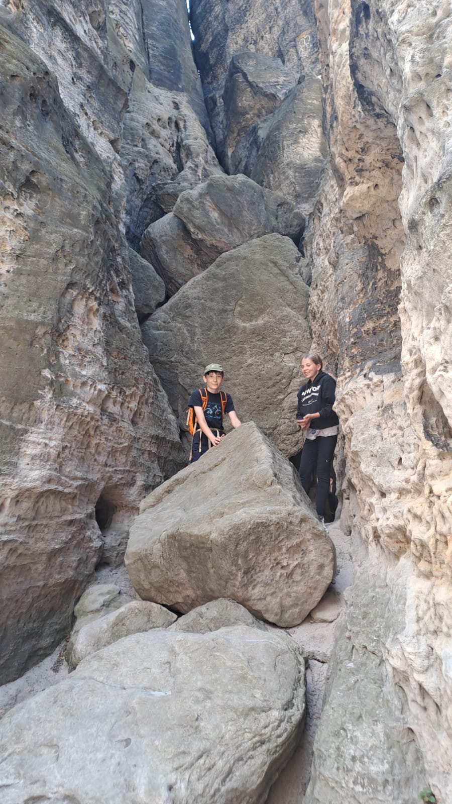V deset hodin jsme vyrazili na celodenní výlet do Tiských stěn. Začátek cesty je krušný, dlouhé nepříjemné stoupání, ale pak už jsme šli lesem po rovince. Když jsme dorazili do Tisé, děti se posilnily a čekalo nás dobrodružství v pískovcových skalách. Všichni jsme si to užili, prolézali jsme otvory ve skalách a poznávali krásu a sílu přírody. K závěru už sil ubývalo a čekala nás ještě cesta domů v délce 6,5 km. Vše jsme zvládli a odměnou nám byla večeře v podobě řízku s bramborovou kaší. Po večeři děti připravily dřevo na oheň, nařezaly buřty, hrály volejbal, fotbal a vybíjenou. Večer jsme poseděli u ohýnku, opékali buřty. Děti šly spát a zítra nás čeká snídaně, úklid, balení a cesta domů. Bylo to fajn a budeme mít na co vzpomínat.