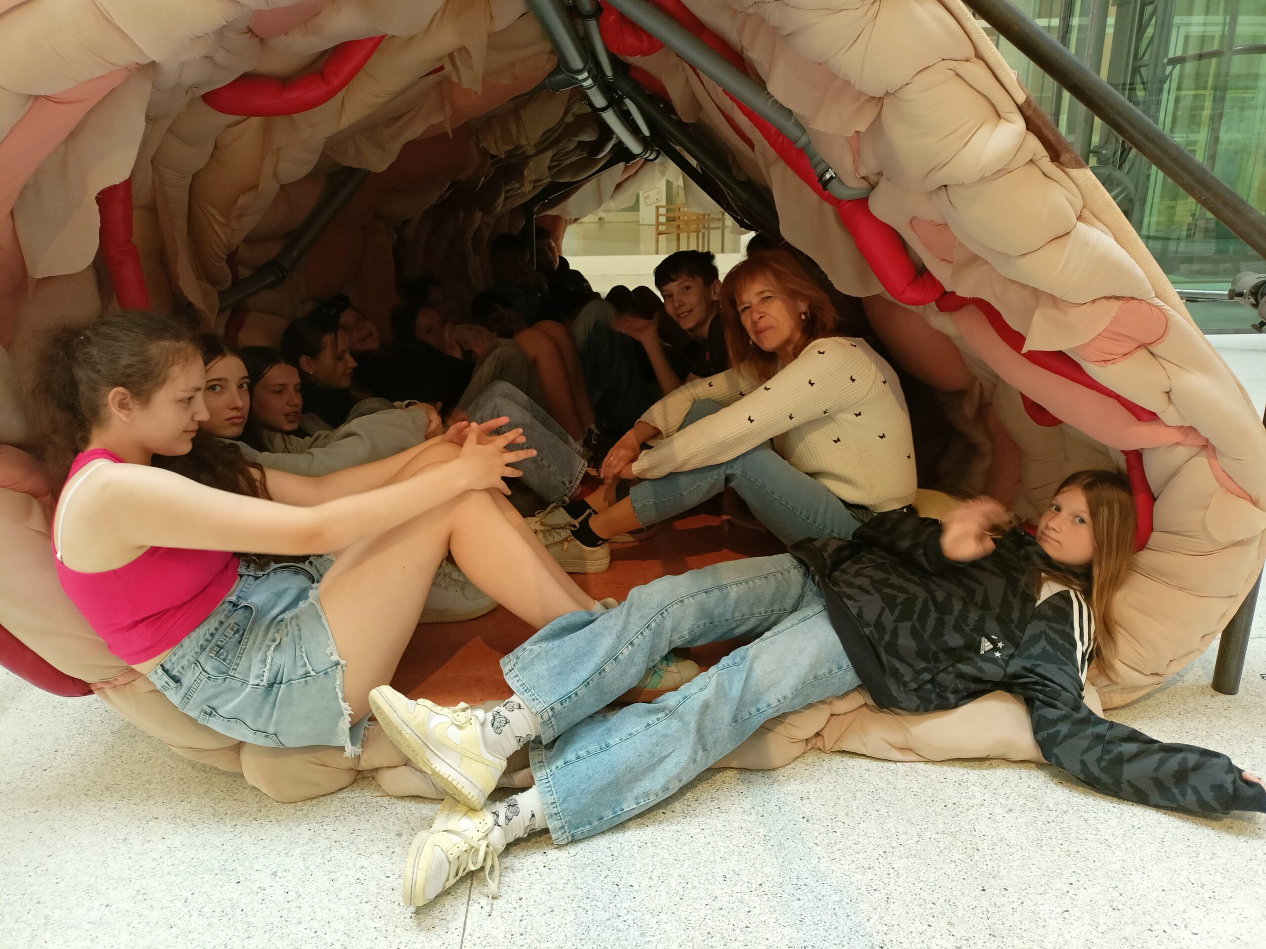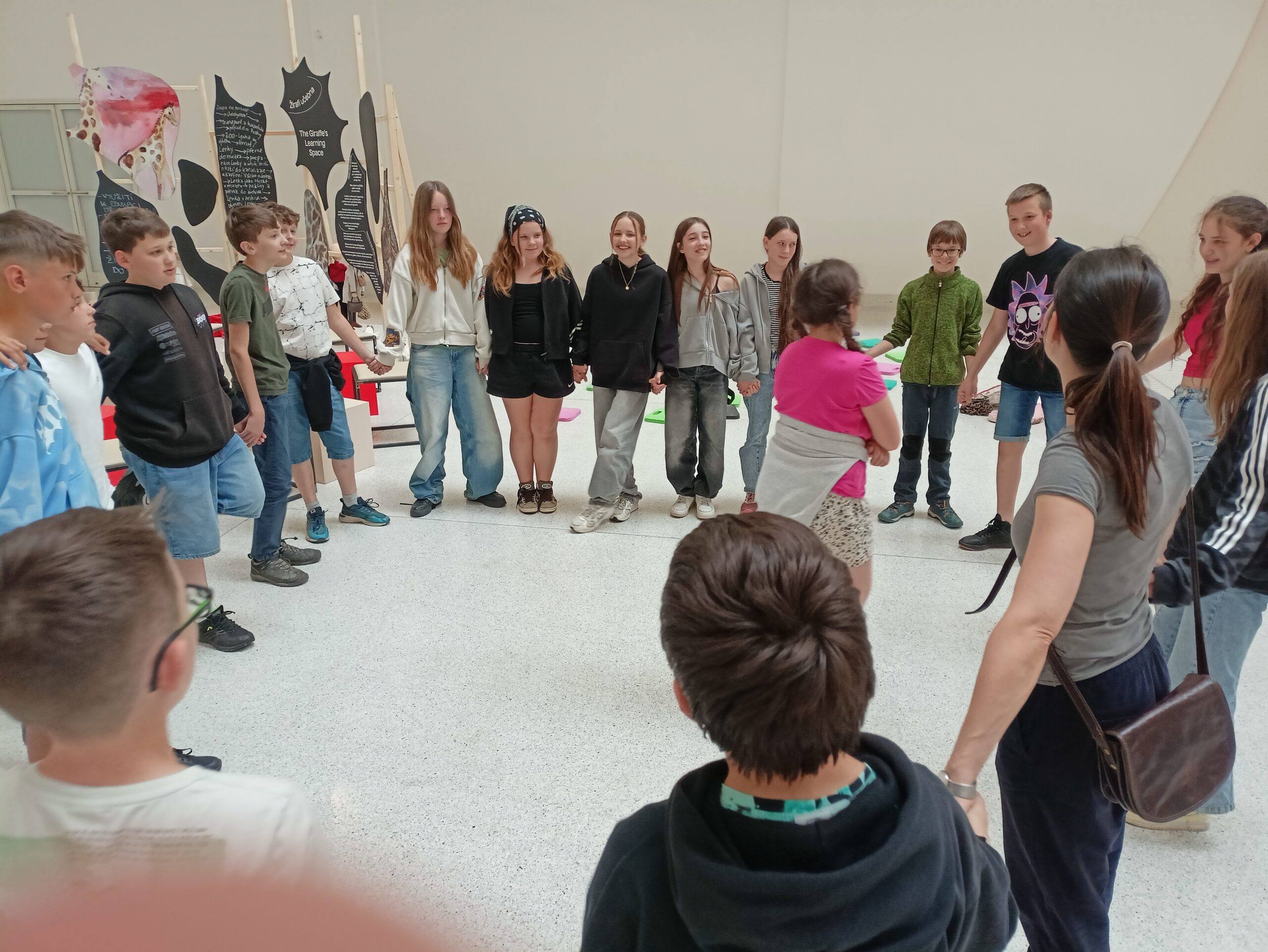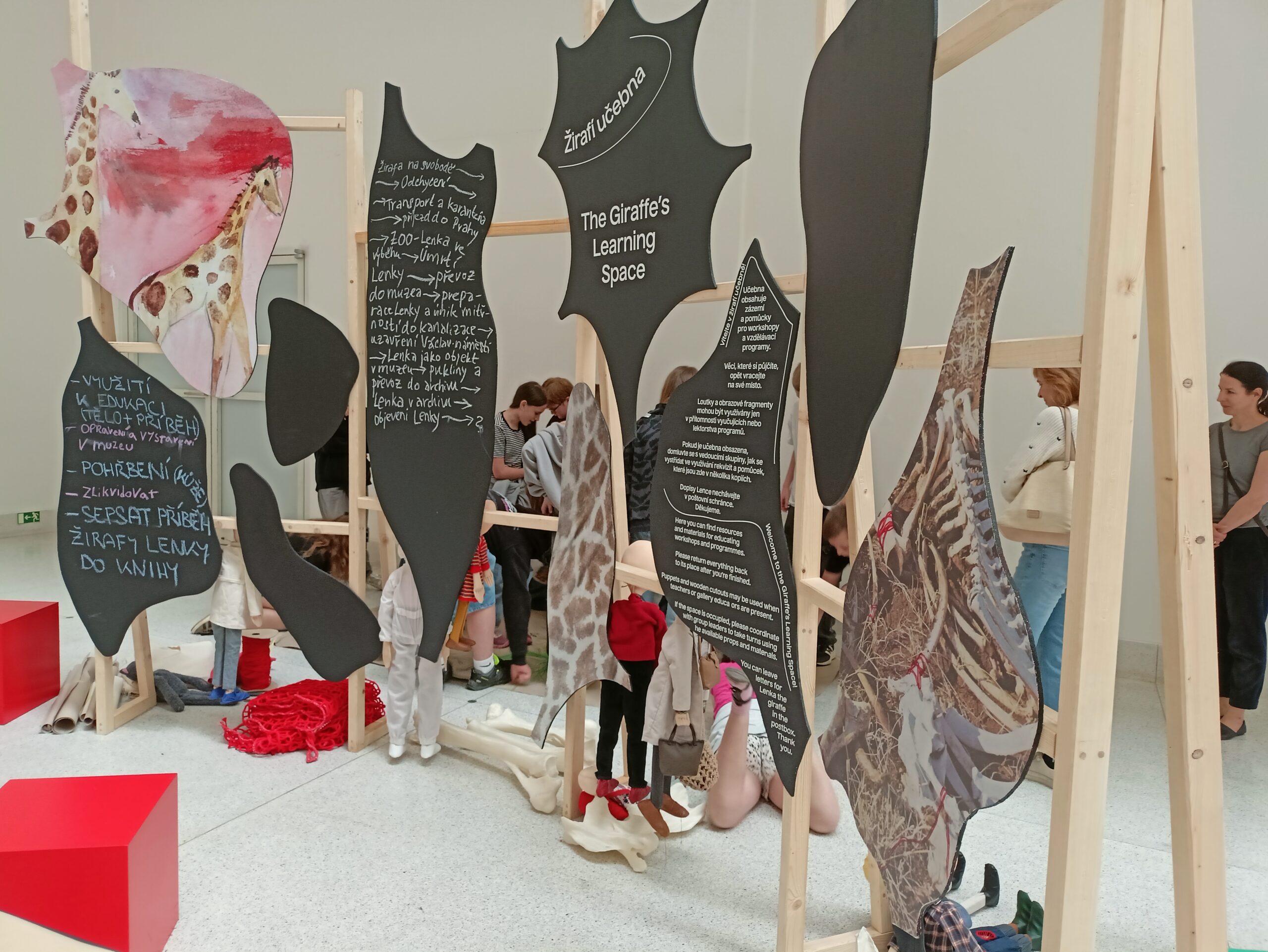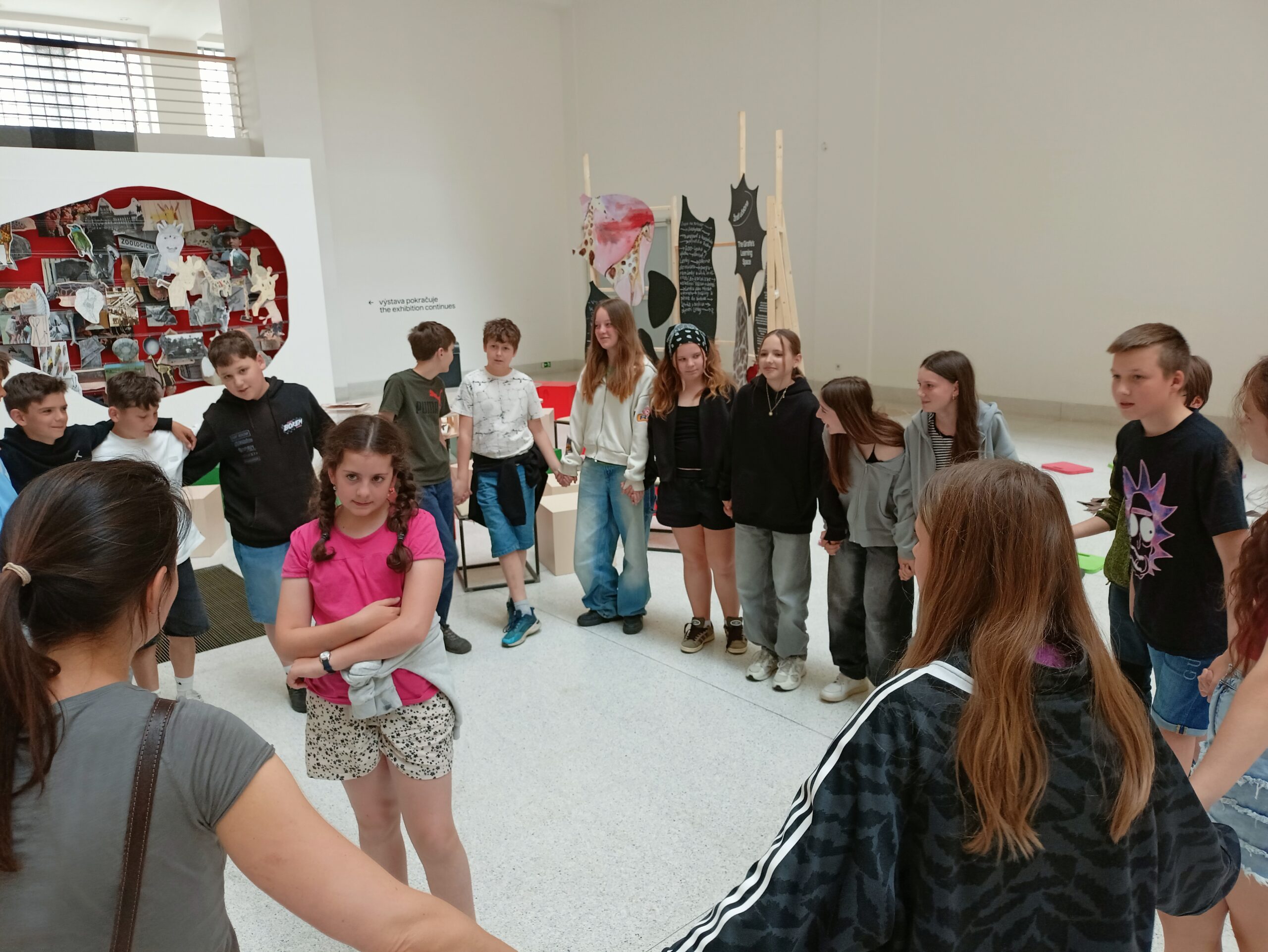 Ve Veletržním paláci (Dvoraně Veletržního paláce), nás čekal prostor s velkou instalací, ve kterém jsme se všichni mohli společně procházet, sami se v něm ukrýt, prozkoumávat ho, naslouchat zvukům uvnitř a vyslechnout krátké audio příběhy. Umělkyně Eva Koťátková připravila netradiční prostor improvizující zvětšený krk Žirafy Lenky, která krátce žila v Pražské ZOO. Její životní osud umělkyni natolik fascinoval, že ji přiměl k tvorbě interaktivního prostoru pro návštěvníky a účastníky workshopů. Součástí tohoto prostoru byla učebna s texty, textilní objekty, odlitky jednotlivých částí těla žirafy, popis jejího osudu. Niternost a fascinace prostorem nás doslova ohromila. Součástí workshopu byli i edukační hry, které byly na téma prostor, izolace a sebevyjádření svého prostoru. Mohli jsme i napsat osobní vzkaz autorce výstavy. Niternost, vjemy a fascinace konceptem a prostorem výstavy v nás vyvolala dojmy rozjímání o přírodě, životě, o konci života, odkazu přírody, vlastním prostoru potažmo o jeho sdílení. Výstavu vřele doporučujeme všem!!! A jedno přání žáků z prožitého workshopu? Mít tak podobný a niterný prostor k rozjímání i ve škole!…