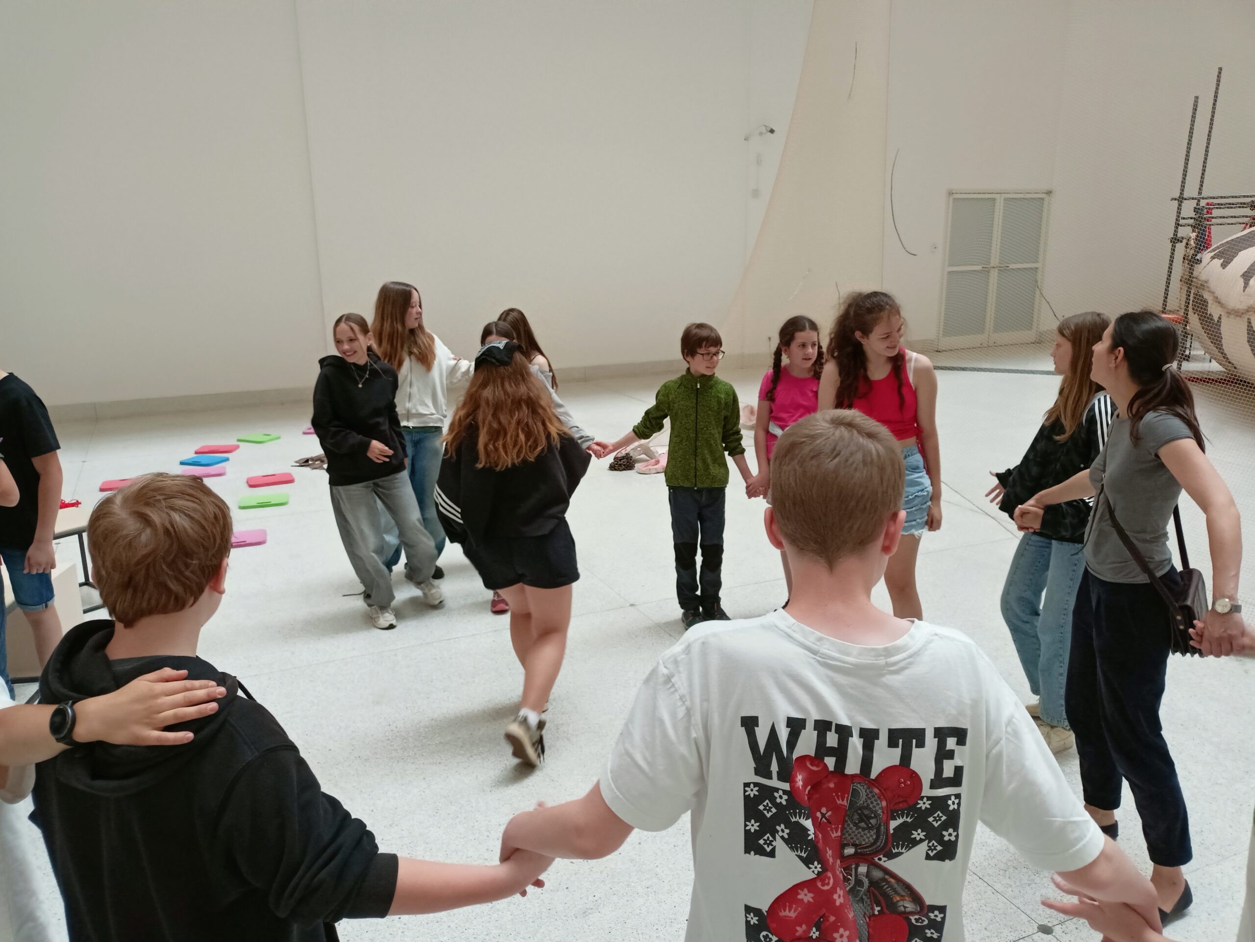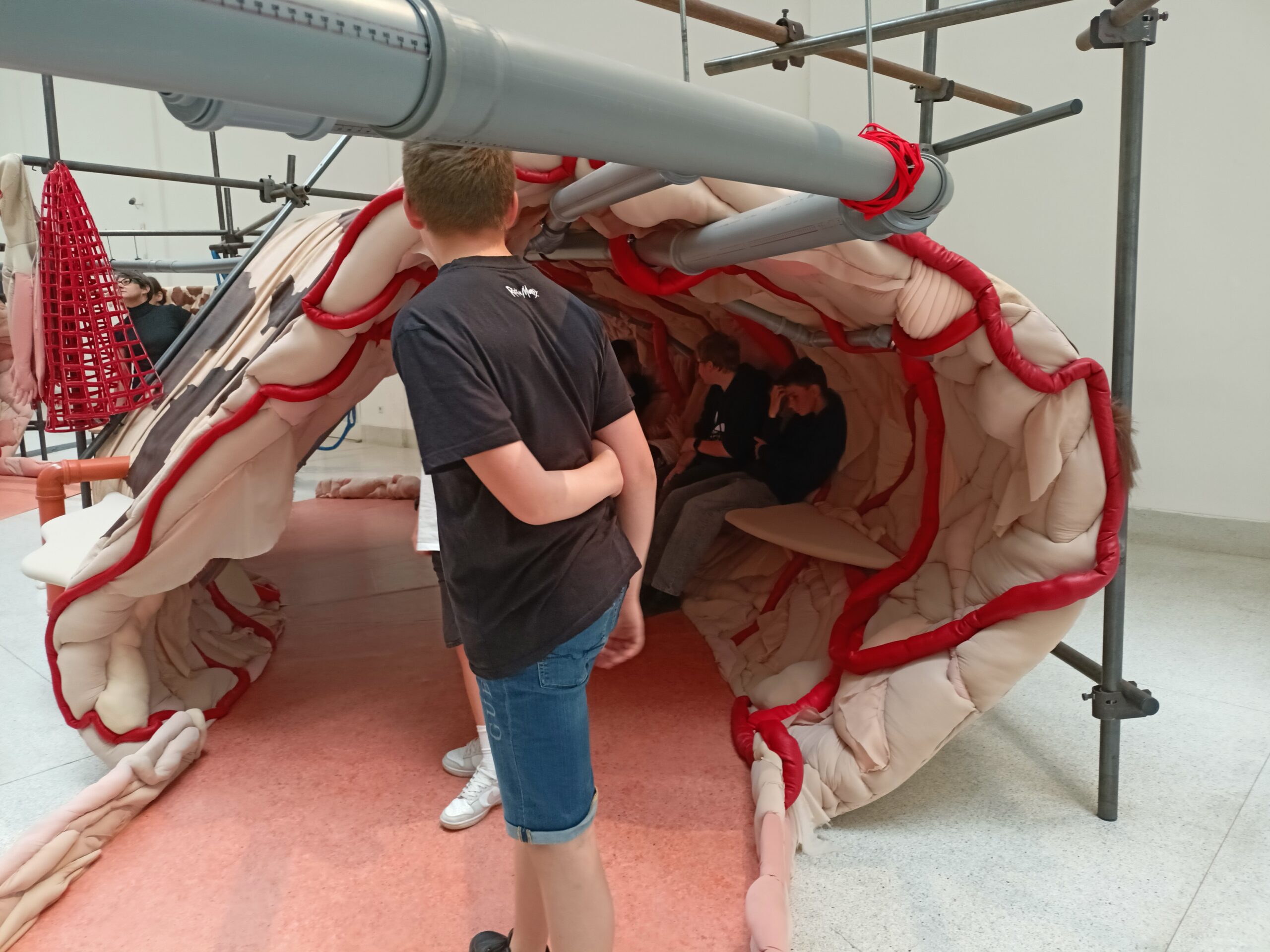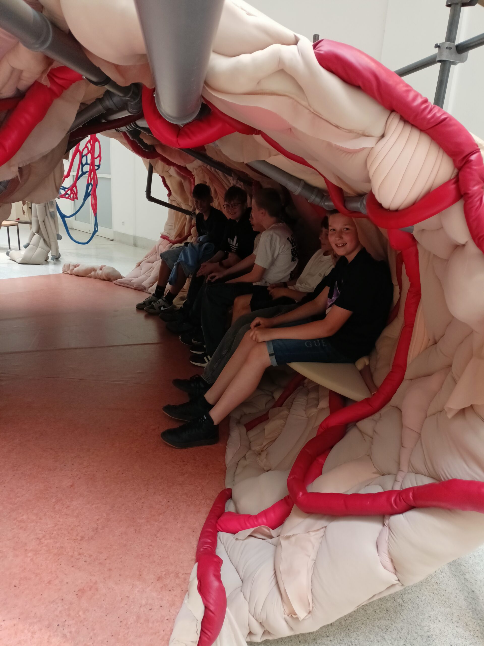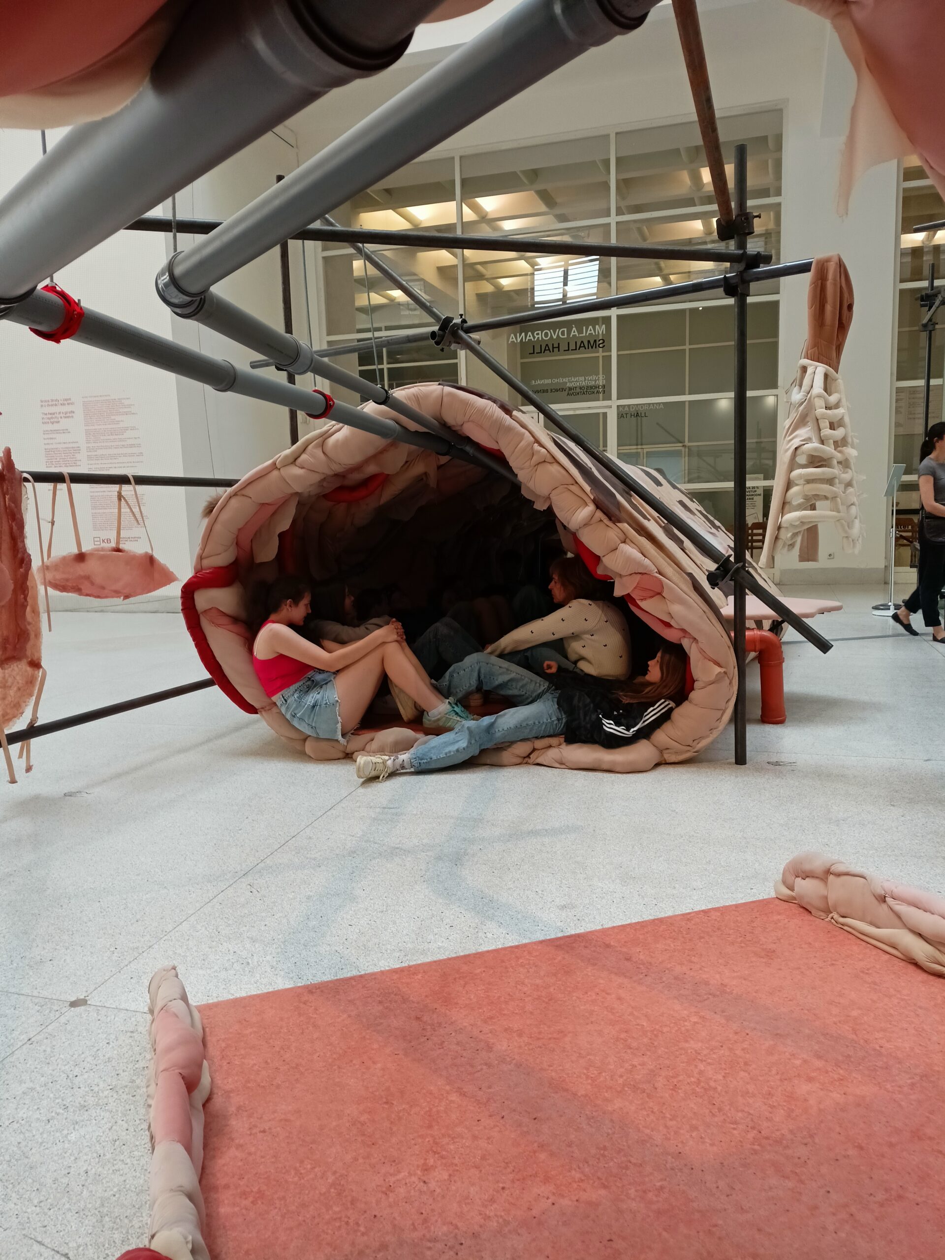 Ve Veletržním paláci (Dvoraně Veletržního paláce), nás čekal prostor s velkou instalací, ve kterém jsme se všichni mohli společně procházet, sami se v něm ukrýt, prozkoumávat ho, naslouchat zvukům uvnitř a vyslechnout krátké audio příběhy. Umělkyně Eva Koťátková připravila netradiční prostor improvizující zvětšený krk Žirafy Lenky, která krátce žila v Pražské ZOO. Její životní osud umělkyni natolik fascinoval, že ji přiměl k tvorbě interaktivního prostoru pro návštěvníky a účastníky workshopů. Součástí tohoto prostoru byla učebna s texty, textilní objekty, odlitky jednotlivých částí těla žirafy, popis jejího osudu. Niternost a fascinace prostorem nás doslova ohromila. Součástí workshopu byli i edukační hry, které byly na téma prostor, izolace a sebevyjádření svého prostoru. Mohli jsme i napsat osobní vzkaz autorce výstavy. Niternost, vjemy a fascinace konceptem a prostorem výstavy v nás vyvolala dojmy rozjímání o přírodě, životě, o konci života, odkazu přírody, vlastním prostoru potažmo o jeho sdílení. Výstavu vřele doporučujeme všem!!! A jedno přání žáků z prožitého workshopu? Mít tak podobný a niterný prostor k rozjímání i ve škole!…