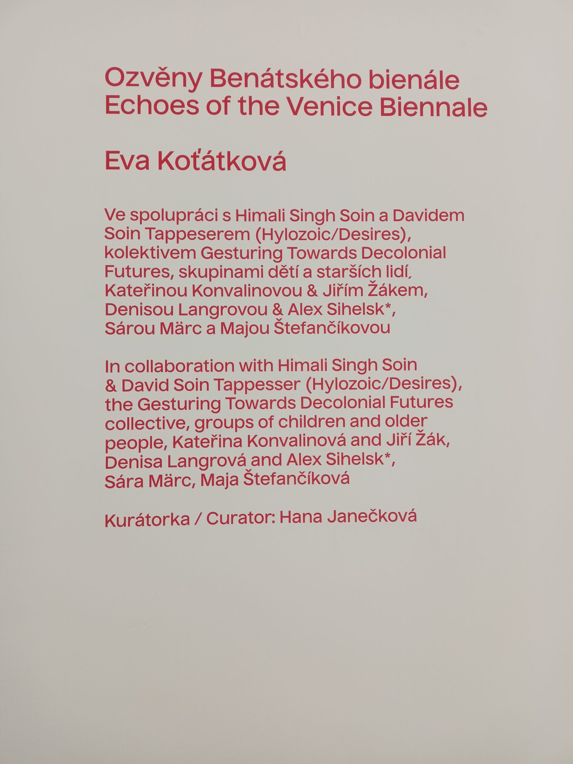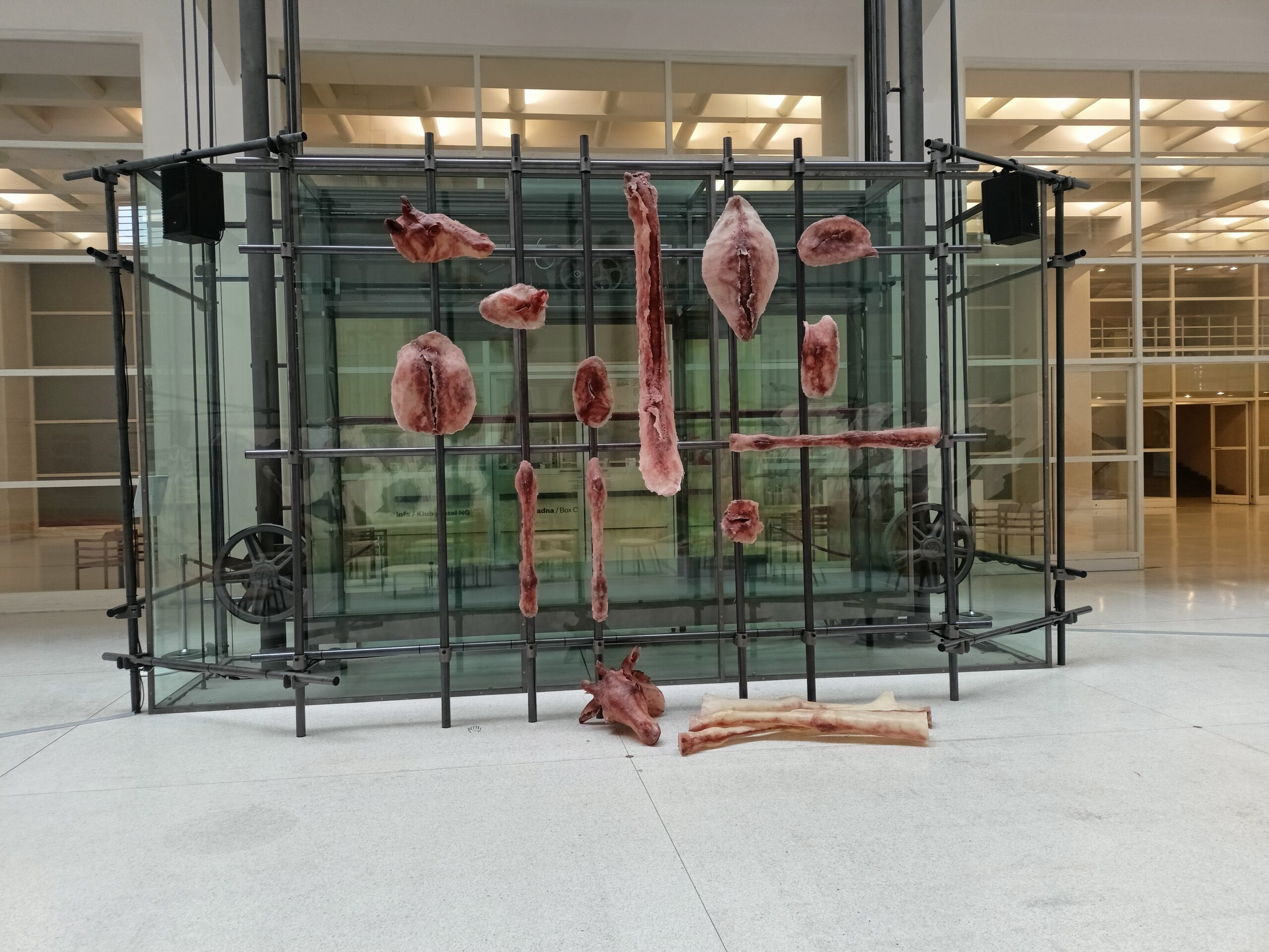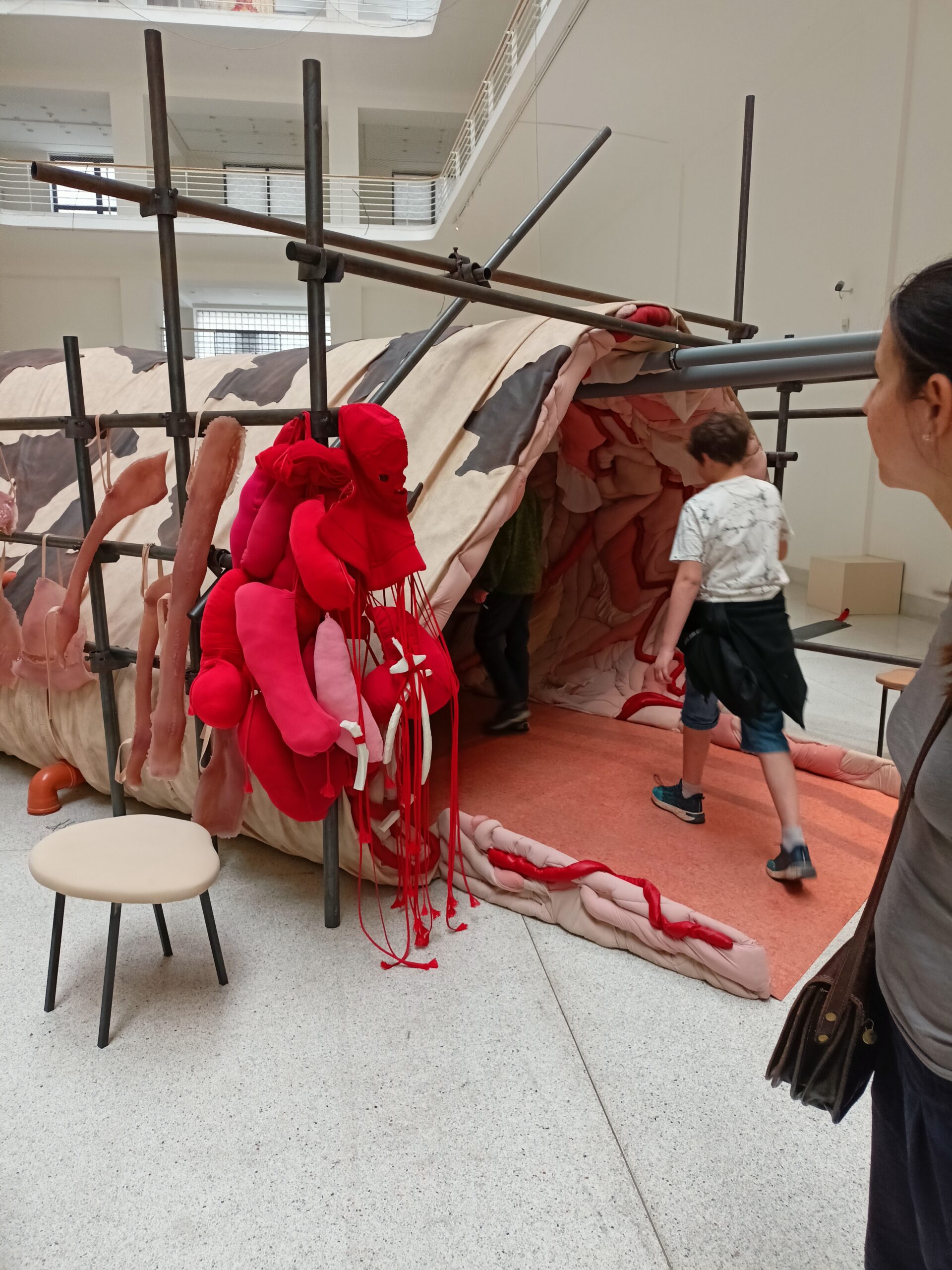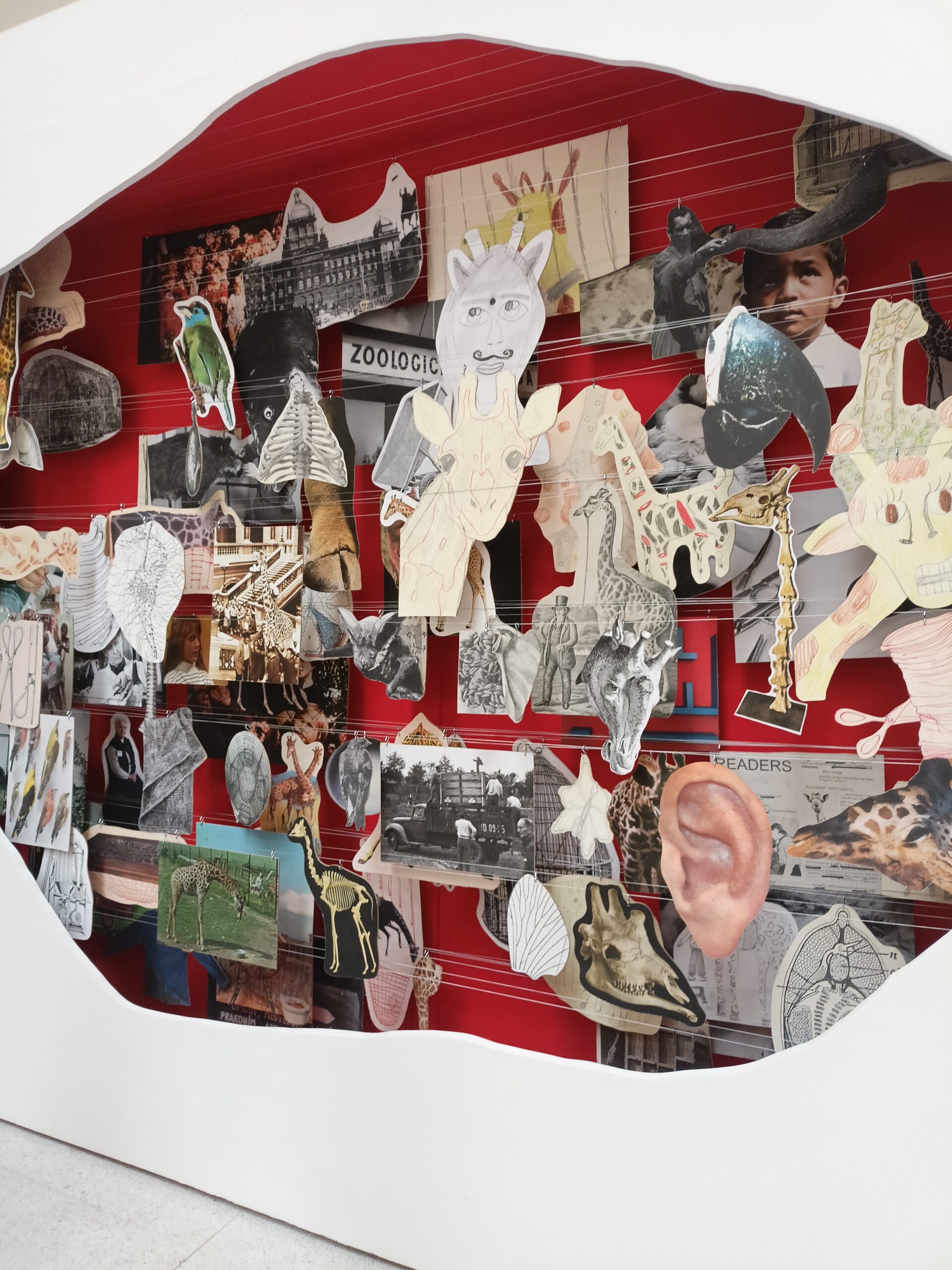 Ve Veletržním paláci (Dvoraně Veletržního paláce), nás čekal prostor s velkou instalací, ve kterém jsme se všichni mohli společně procházet, sami se v něm ukrýt, prozkoumávat ho, naslouchat zvukům uvnitř a vyslechnout krátké audio příběhy. Umělkyně Eva Koťátková připravila netradiční prostor improvizující zvětšený krk Žirafy Lenky, která krátce žila v Pražské ZOO. Její životní osud umělkyni natolik fascinoval, že ji přiměl k tvorbě interaktivního prostoru pro návštěvníky a účastníky workshopů. Součástí tohoto prostoru byla učebna s texty, textilní objekty, odlitky jednotlivých částí těla žirafy, popis jejího osudu. Niternost a fascinace prostorem nás doslova ohromila. Součástí workshopu byli i edukační hry, které byly na téma prostor, izolace a sebevyjádření svého prostoru. Mohli jsme i napsat osobní vzkaz autorce výstavy. Niternost, vjemy a fascinace konceptem a prostorem výstavy v nás vyvolala dojmy rozjímání o přírodě, životě, o konci života, odkazu přírody, vlastním prostoru potažmo o jeho sdílení. Výstavu vřele doporučujeme všem!!! A jedno přání žáků z prožitého workshopu? Mít tak podobný a niterný prostor k rozjímání i ve škole!…