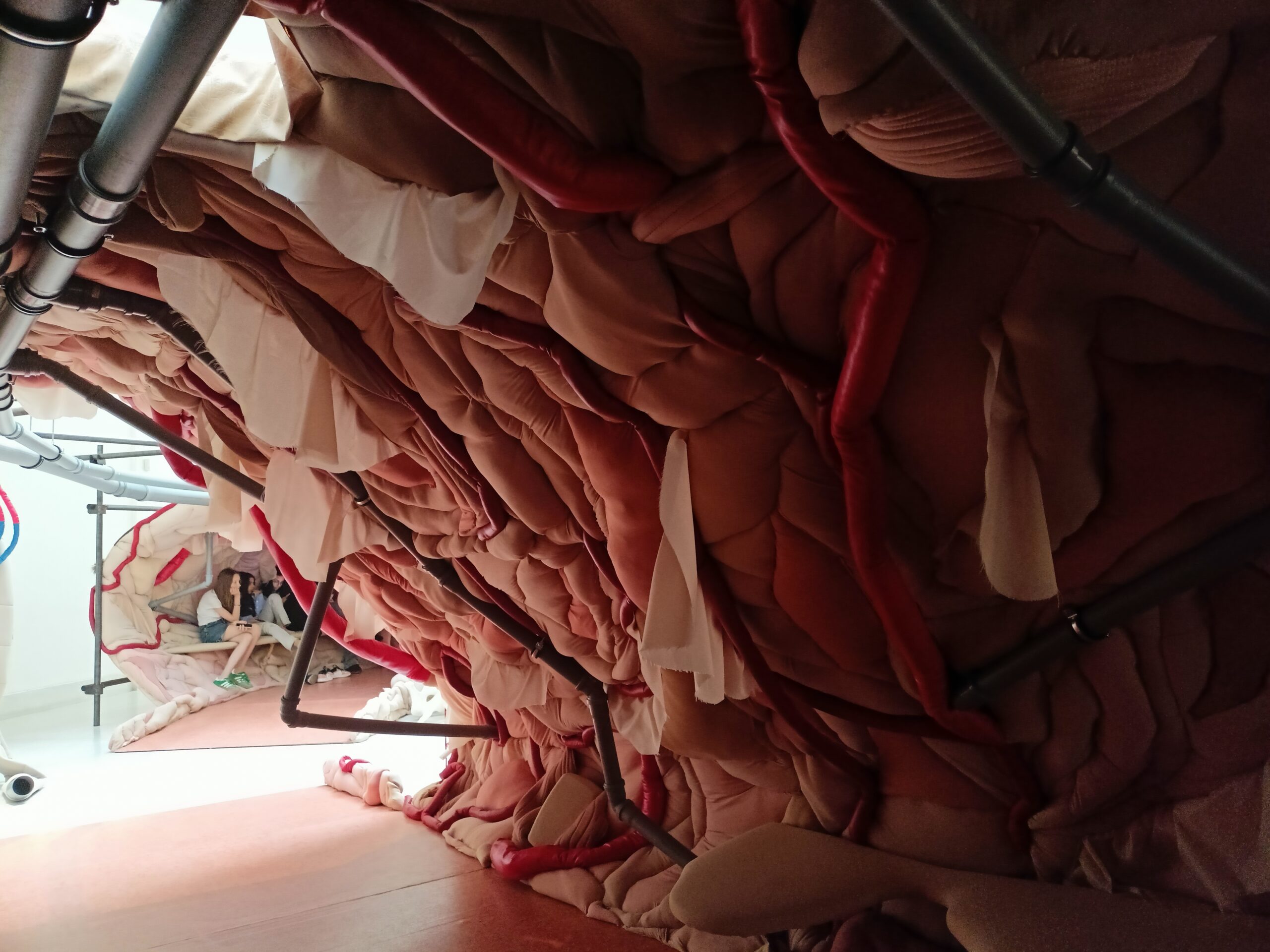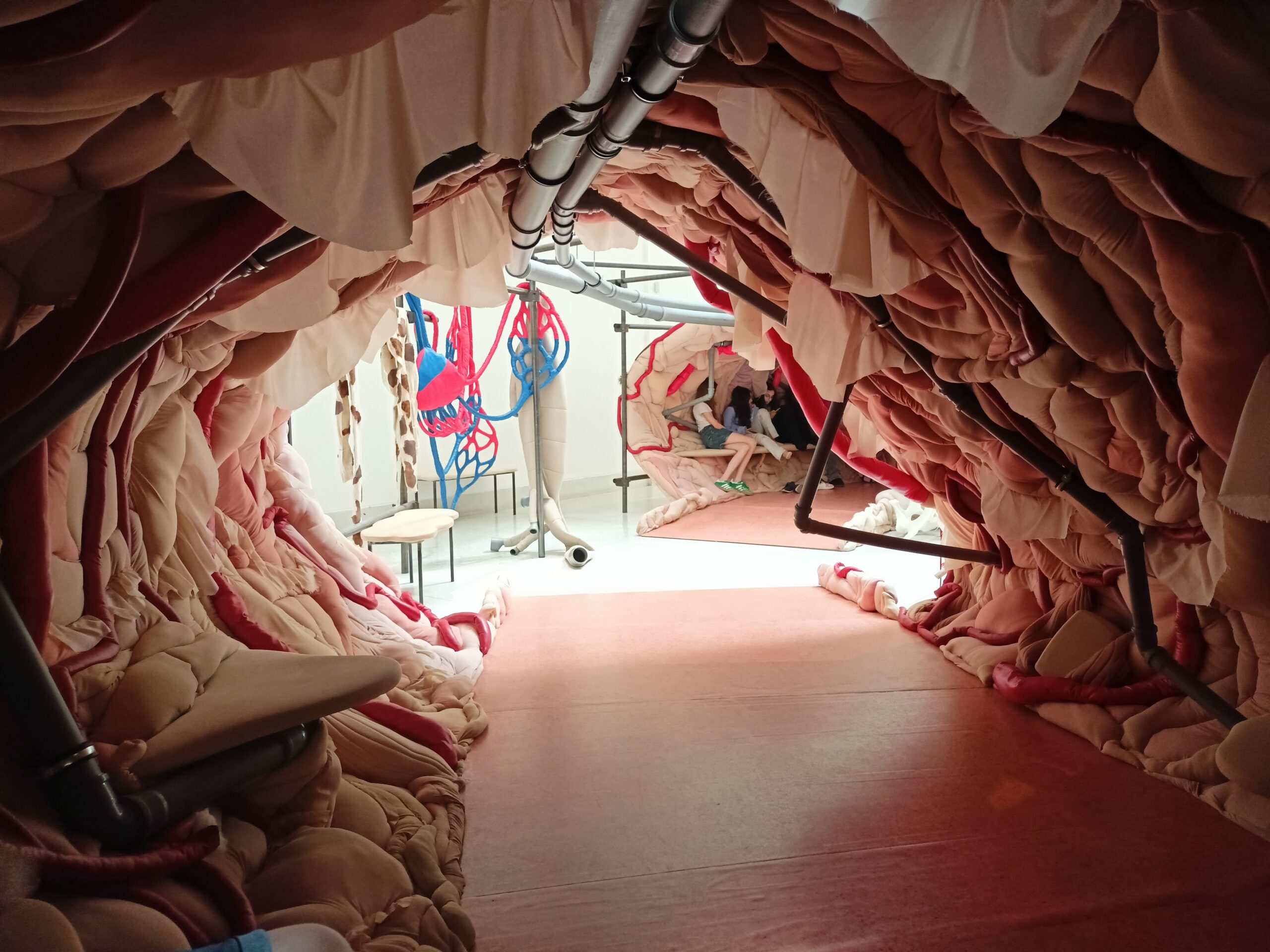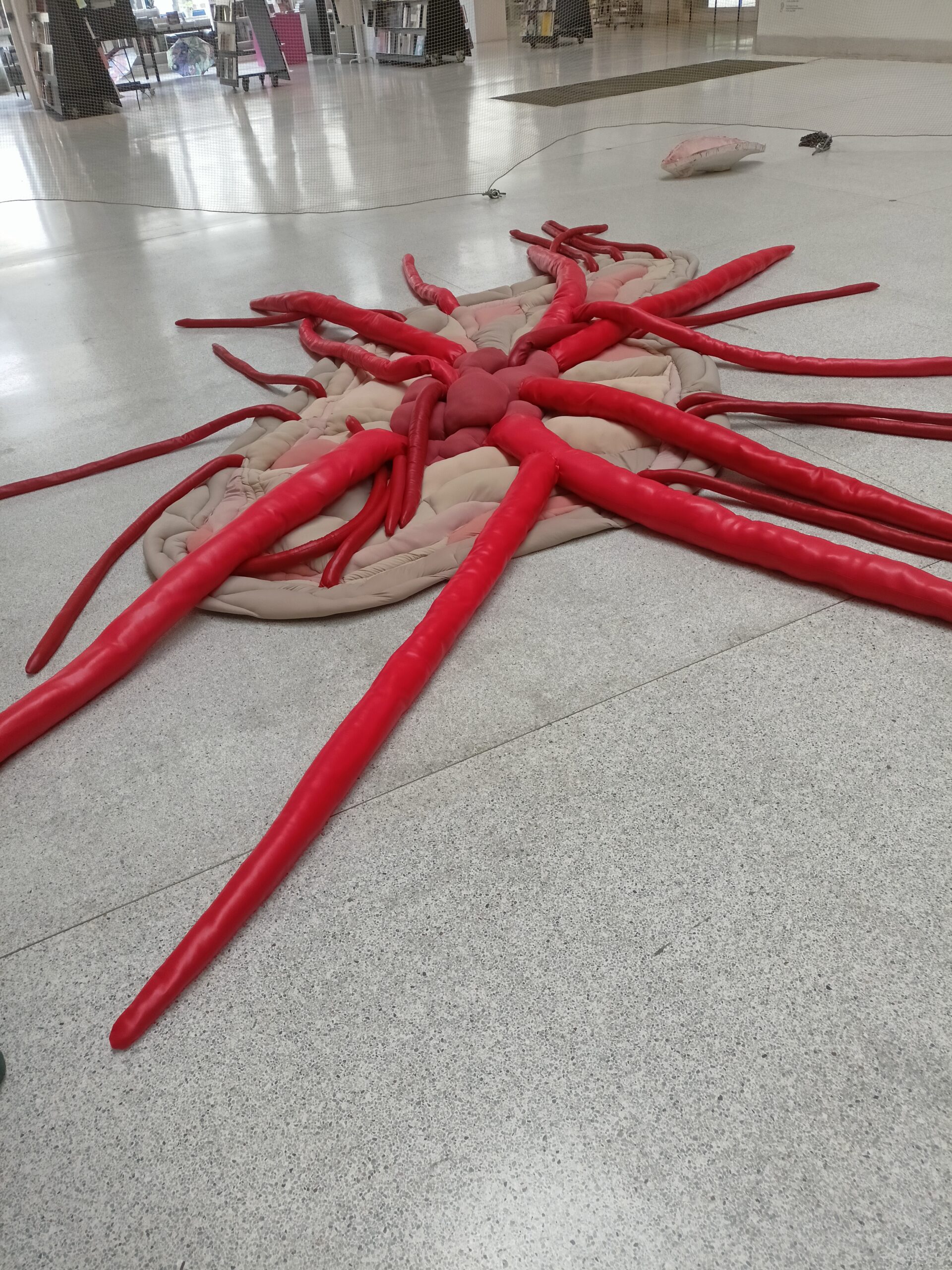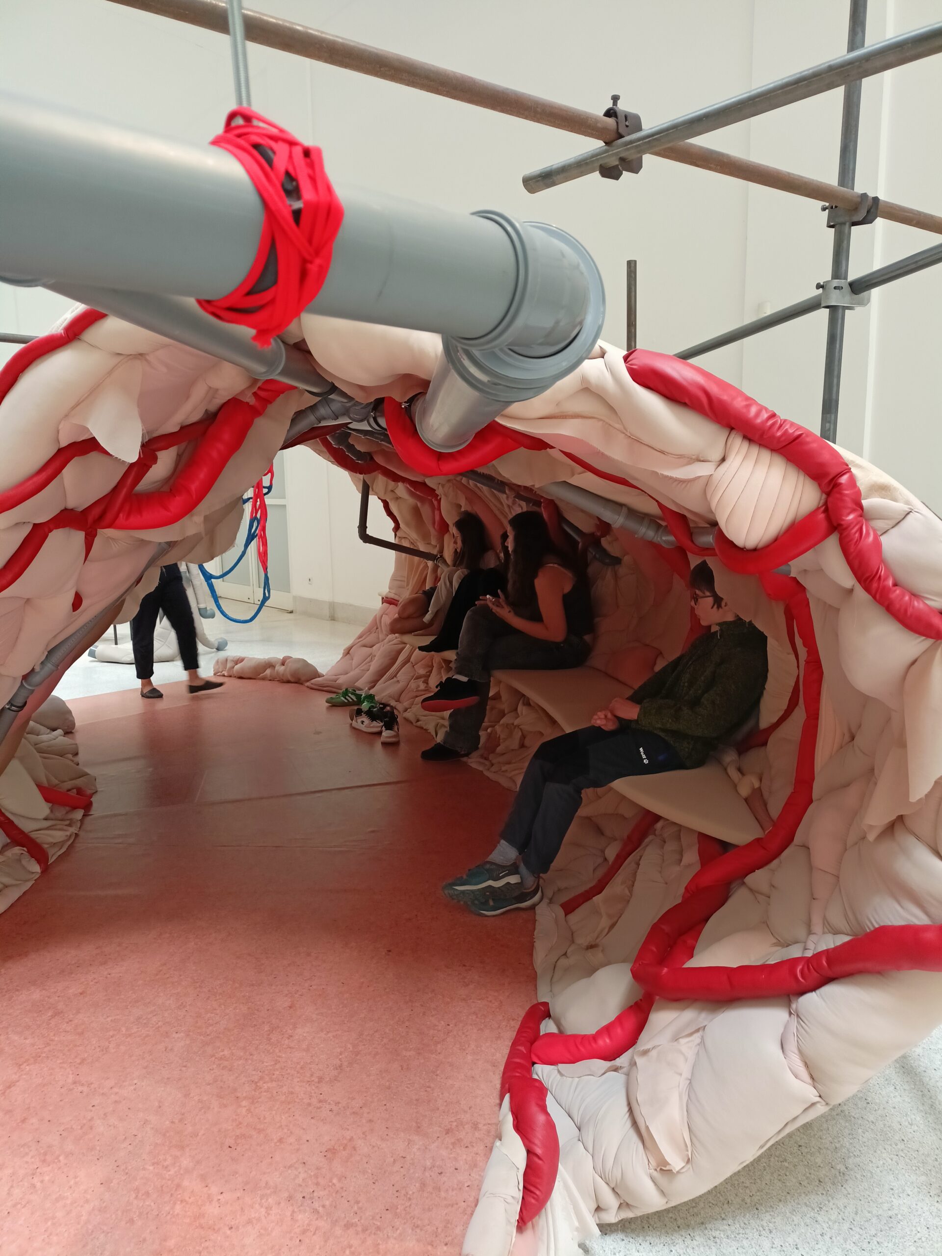 Ve Veletržním paláci (Dvoraně Veletržního paláce), nás čekal prostor s velkou instalací, ve kterém jsme se všichni mohli společně procházet, sami se v něm ukrýt, prozkoumávat ho, naslouchat zvukům uvnitř a vyslechnout krátké audio příběhy. Umělkyně Eva Koťátková připravila netradiční prostor improvizující zvětšený krk Žirafy Lenky, která krátce žila v Pražské ZOO. Její životní osud umělkyni natolik fascinoval, že ji přiměl k tvorbě interaktivního prostoru pro návštěvníky a účastníky workshopů. Součástí tohoto prostoru byla učebna s texty, textilní objekty, odlitky jednotlivých částí těla žirafy, popis jejího osudu. Niternost a fascinace prostorem nás doslova ohromila. Součástí workshopu byli i edukační hry, které byly na téma prostor, izolace a sebevyjádření svého prostoru. Mohli jsme i napsat osobní vzkaz autorce výstavy. Niternost, vjemy a fascinace konceptem a prostorem výstavy v nás vyvolala dojmy rozjímání o přírodě, životě, o konci života, odkazu přírody, vlastním prostoru potažmo o jeho sdílení. Výstavu vřele doporučujeme všem!!! A jedno přání žáků z prožitého workshopu? Mít tak podobný a niterný prostor k rozjímání i ve škole!…