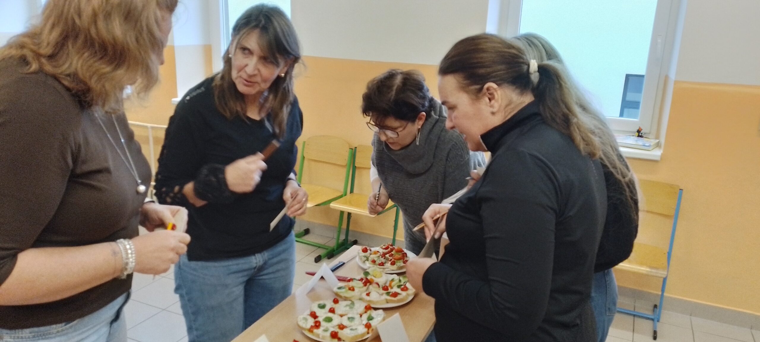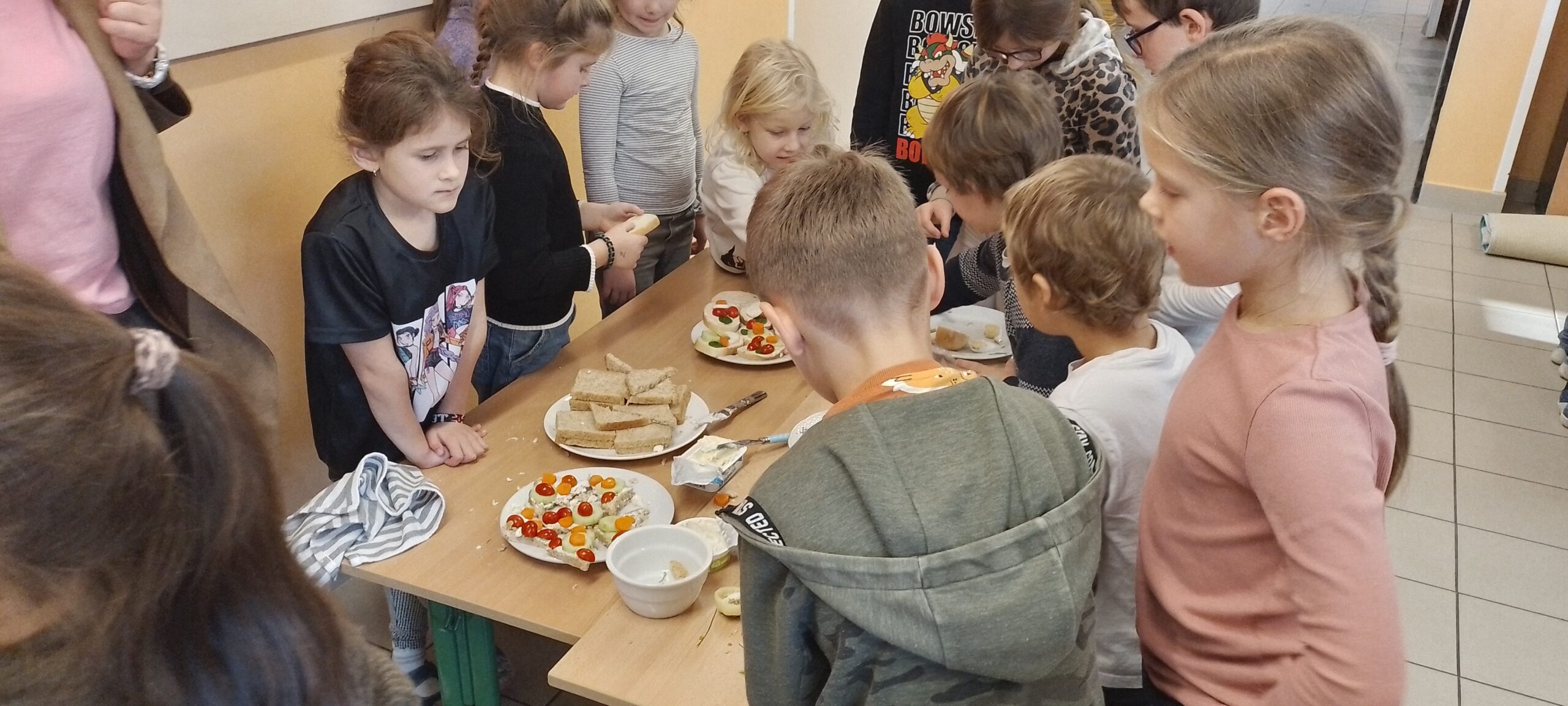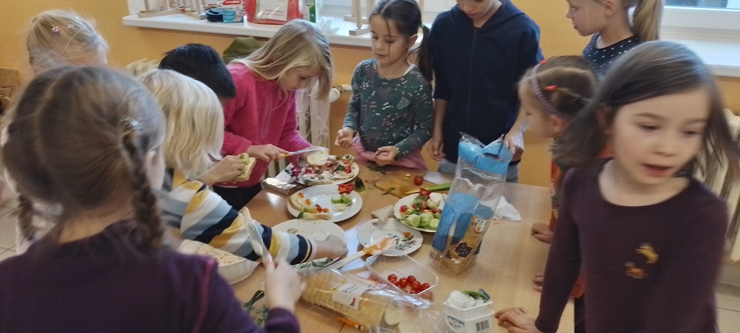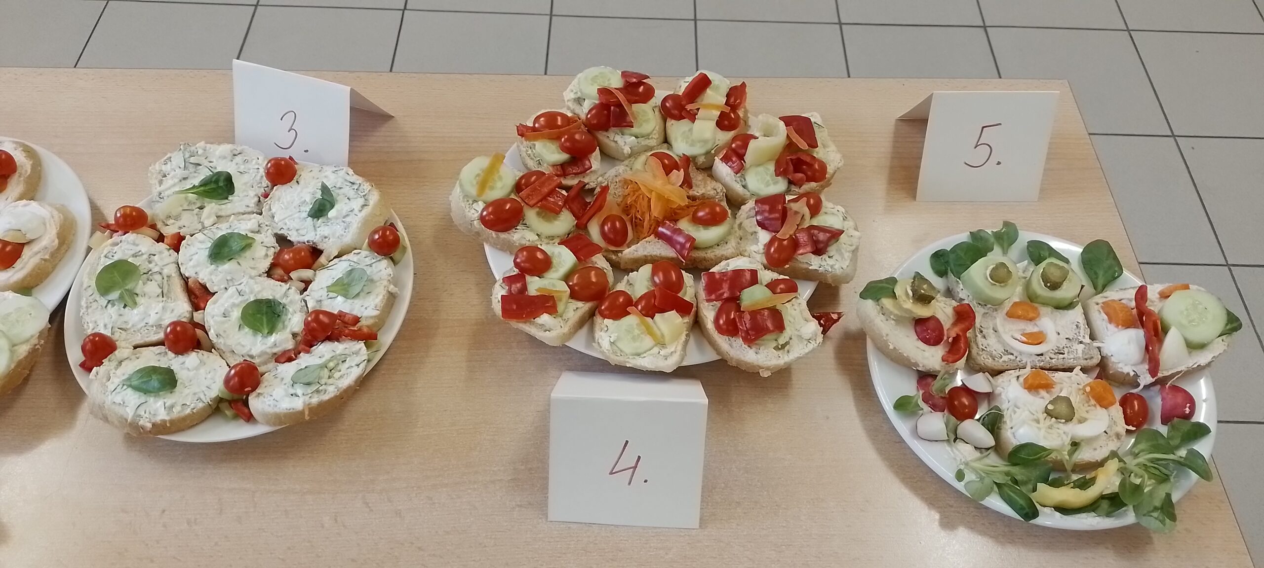 Děti ze všech oddělení byly za pomoci losování rozděleny do skupin. Každá skupina dostala stejné základní suroviny – tvaroh, různé druhy sýrů, vajíčka, přísady na dochucení, čerstvou zeleninu, pečivo. Děti pak měly za úkol vytvořit chutnou pomazánku a připravit pestře nazdobené chlebíčky. Účast byla opravdu obrovská a všichni se do přípravy pustili s velkým nadšením. Z jednoduchých chlebíčků se tak stala malá umělecká díla.