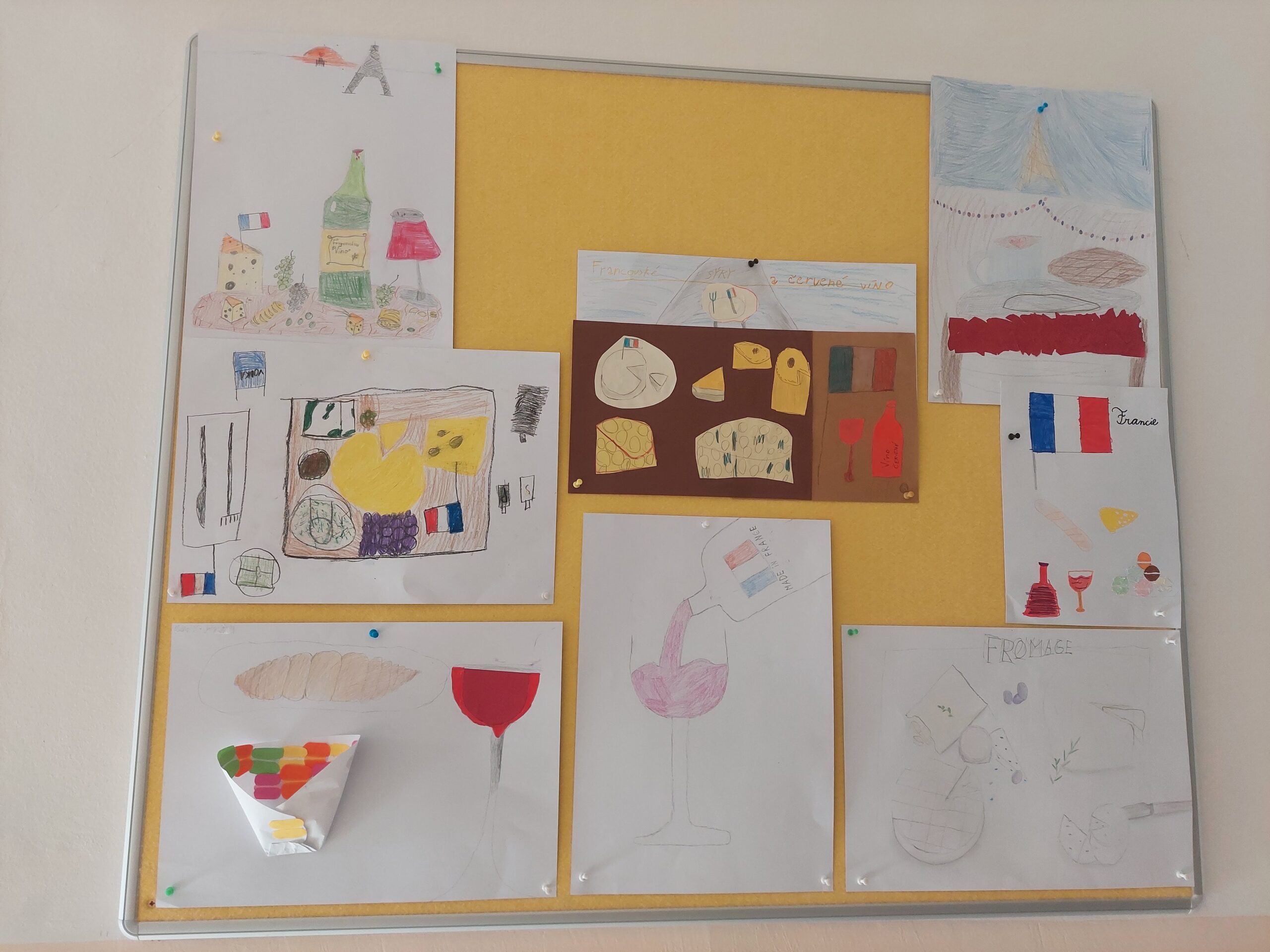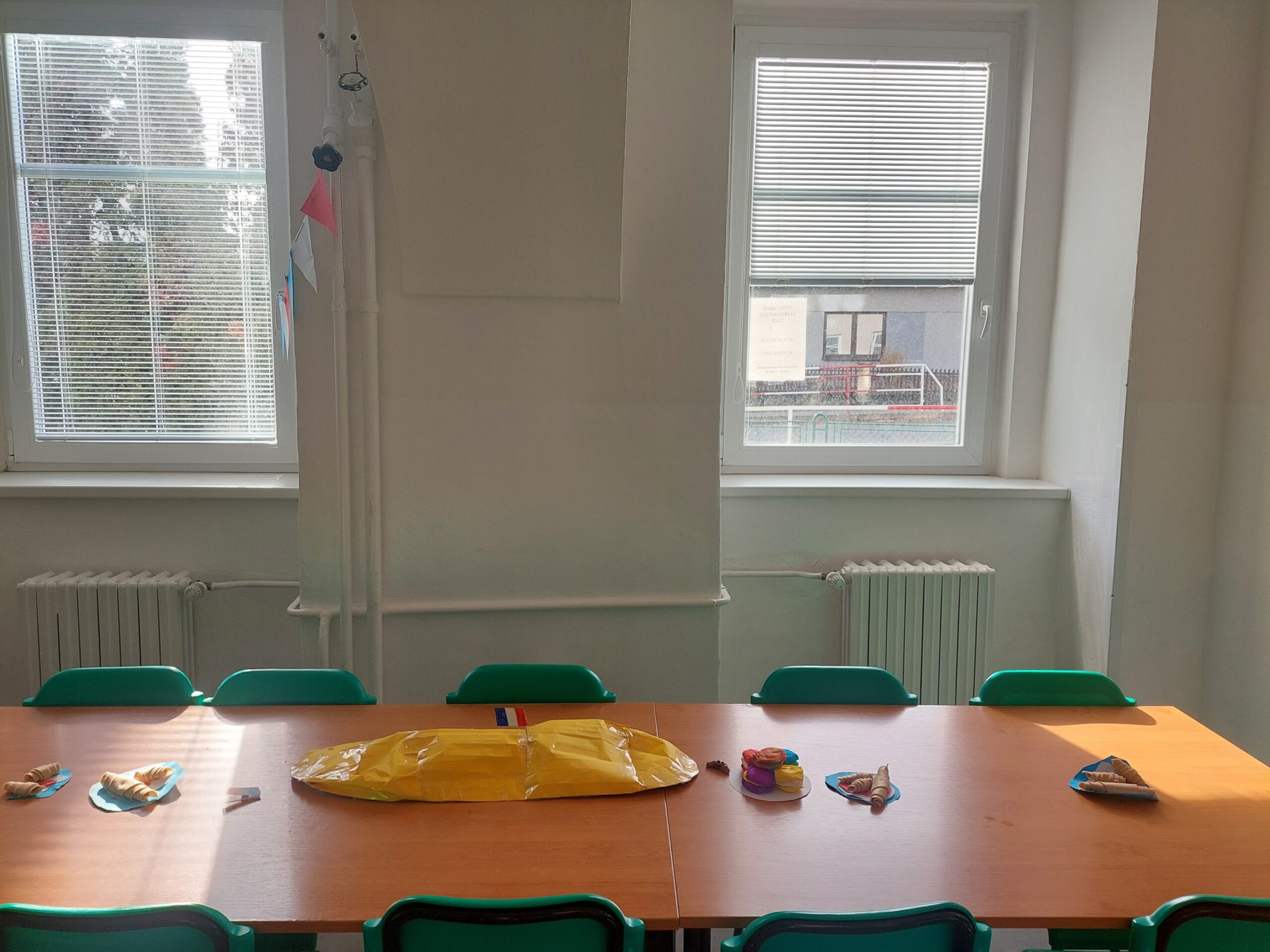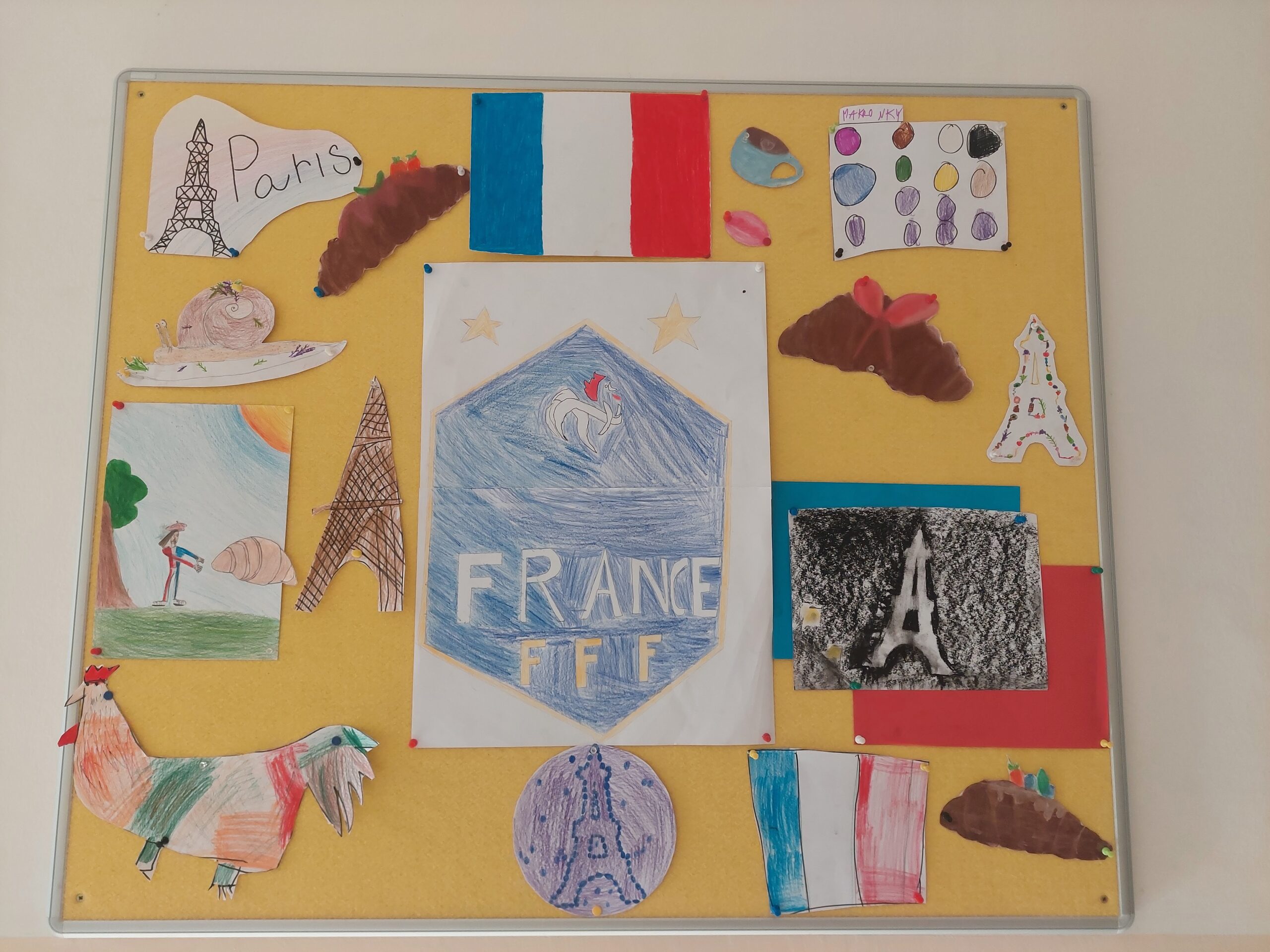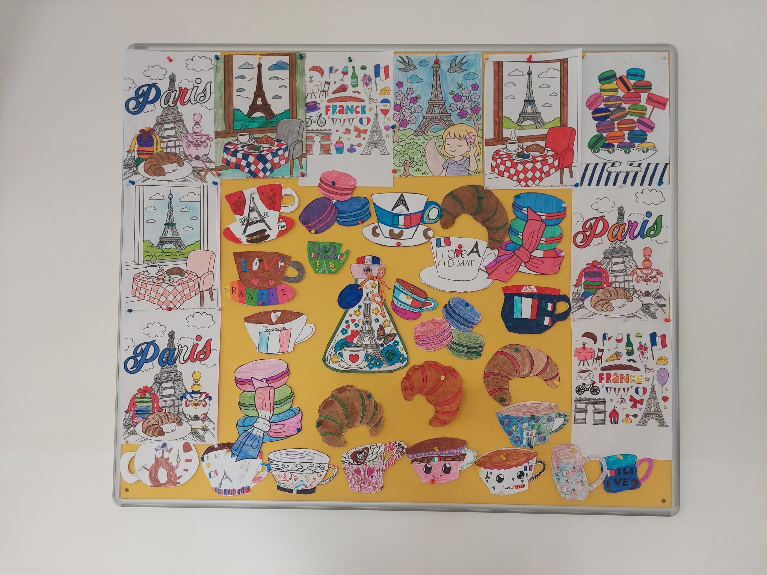 Výzdobu posuďte na fotkách – děti z prvního stupně „vyráběly“ makronky, croisanty a další pochutiny. Na nástěnkách se objevily „Eiffelovky“, kafíčka, kola, muffiny a všudypřítomná červenomodrobílá trikolora.