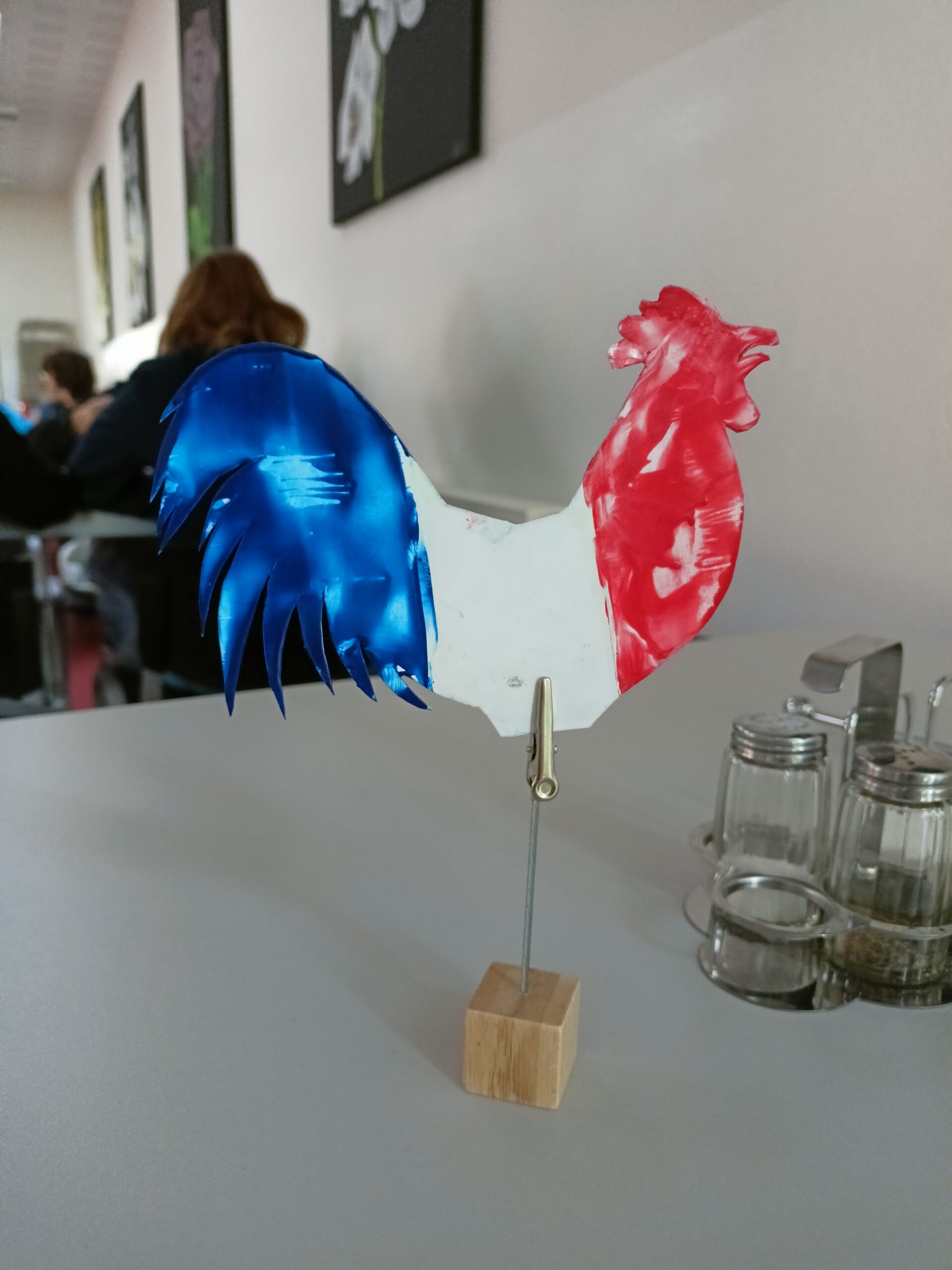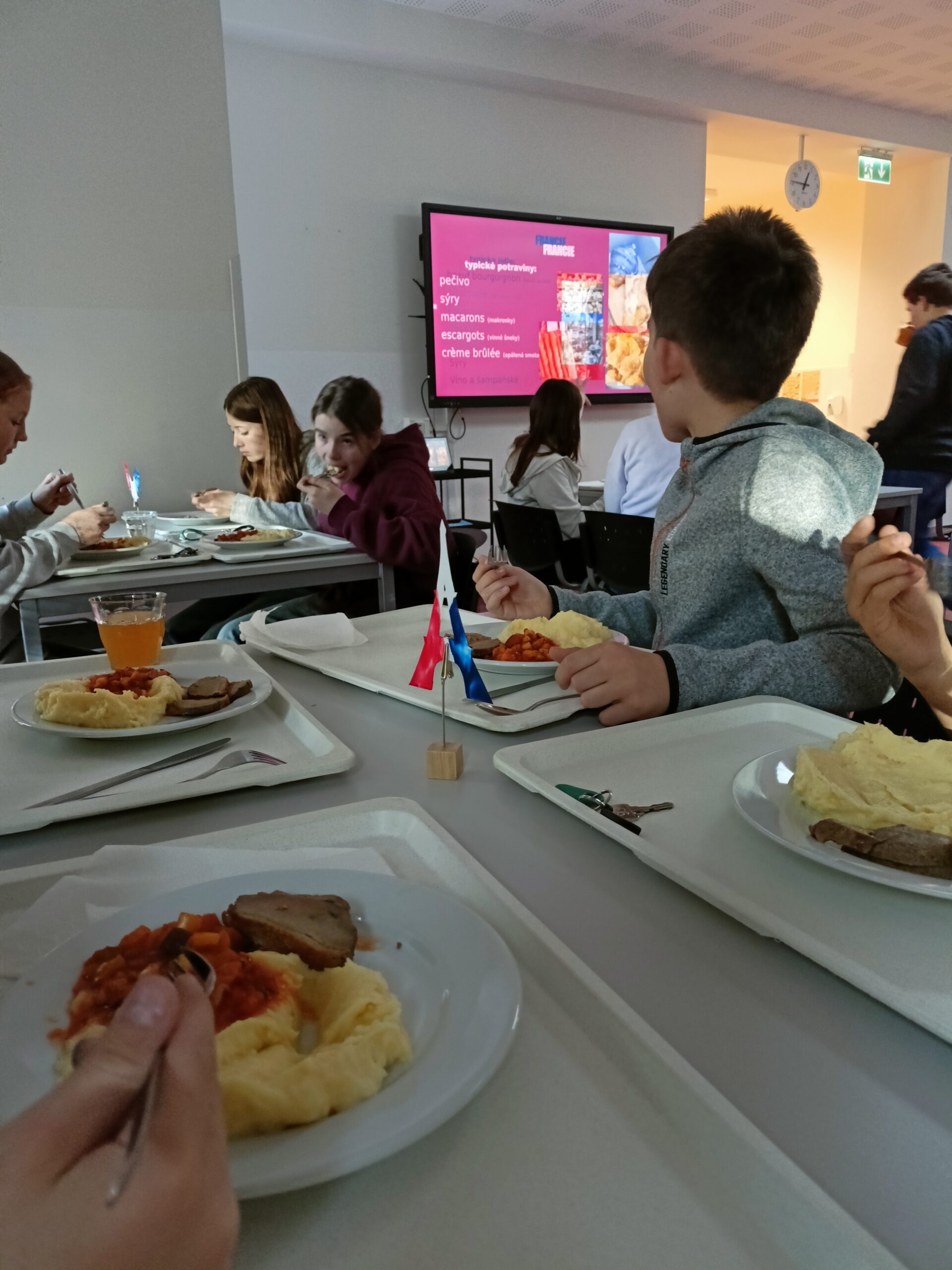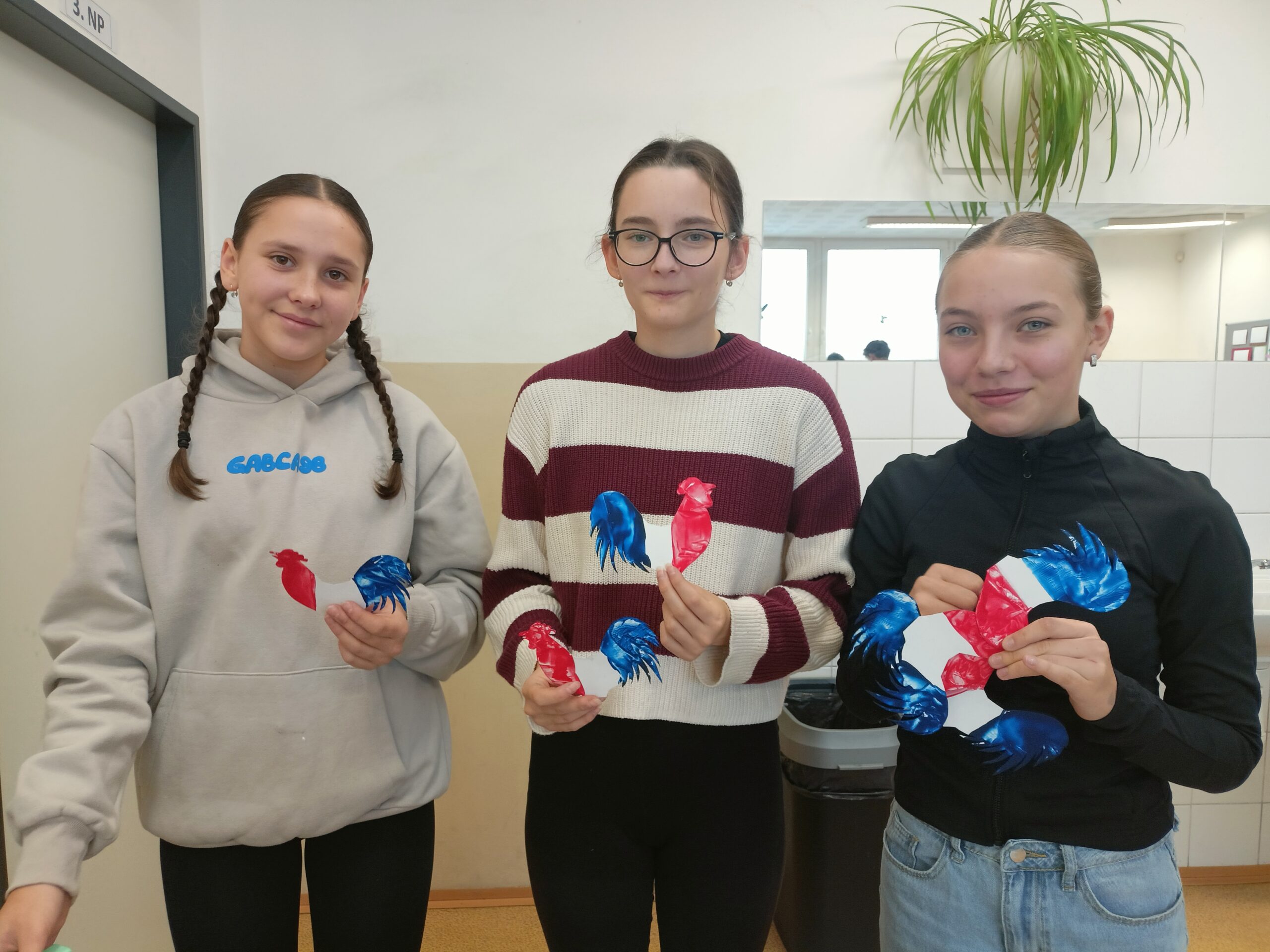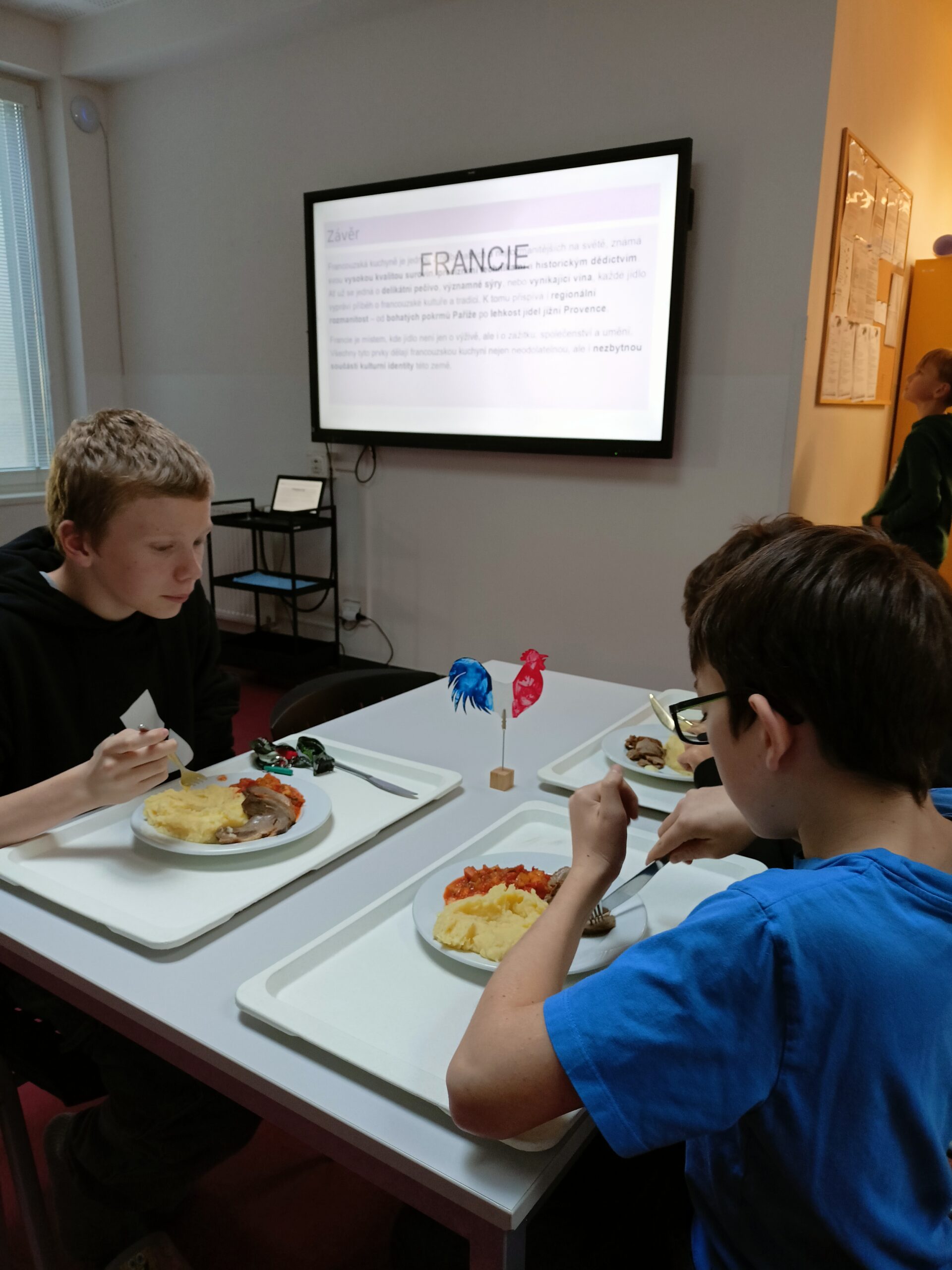Druhostupňovou výdejnu ozdobili galští kohouti vyvedení metodou enkaustiky také v trikoloře. A během oběda běžely prezentace deváťáků o Francii, její kuchyni, zvyklostech a zajímavostech.