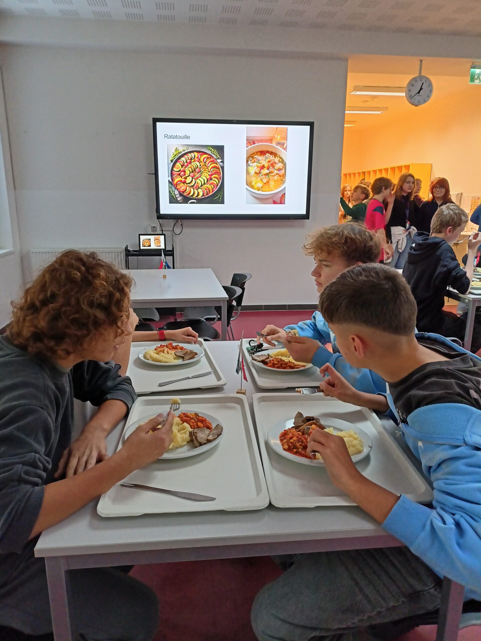 Ve čtvrtek 13. listopadu jsme ochutnali francouzskou kuchyni. Cibulačku – Soupe A l’oignon a jako druhý chod kachní prsa pečená s bylinkami, s ratatouille, doplněné bramborovou kaší s česnekem. Méně obvyklá kombinace, báječná chuť. Kachní vonělo až do chodby.