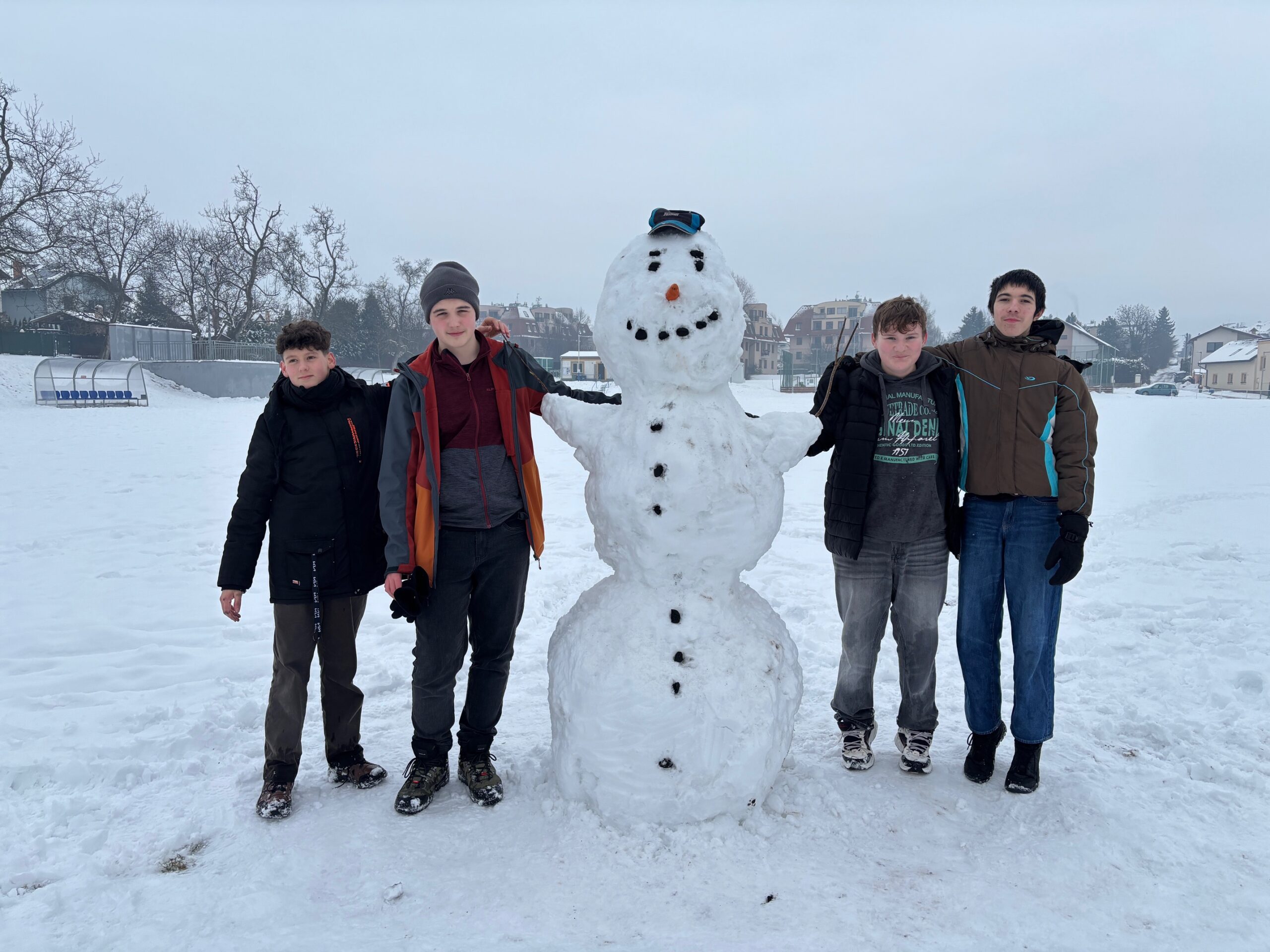IX. B si sníh rozhodně nenechala ujít. Žáci stavěli sněhuláka – mrkev i uhlíky byly, takže výsledkem byl sněhový sympaťák nápadně podobný Olafovi (Náhoda? Nemyslíme si). Pak přišly na řadu boby, ježdění v okolí školy… a občas i čistě „low-tech“ varianta po zadku. Smích, sníh a trocha zimního bláznovství – zkrátka ideální kombinace.