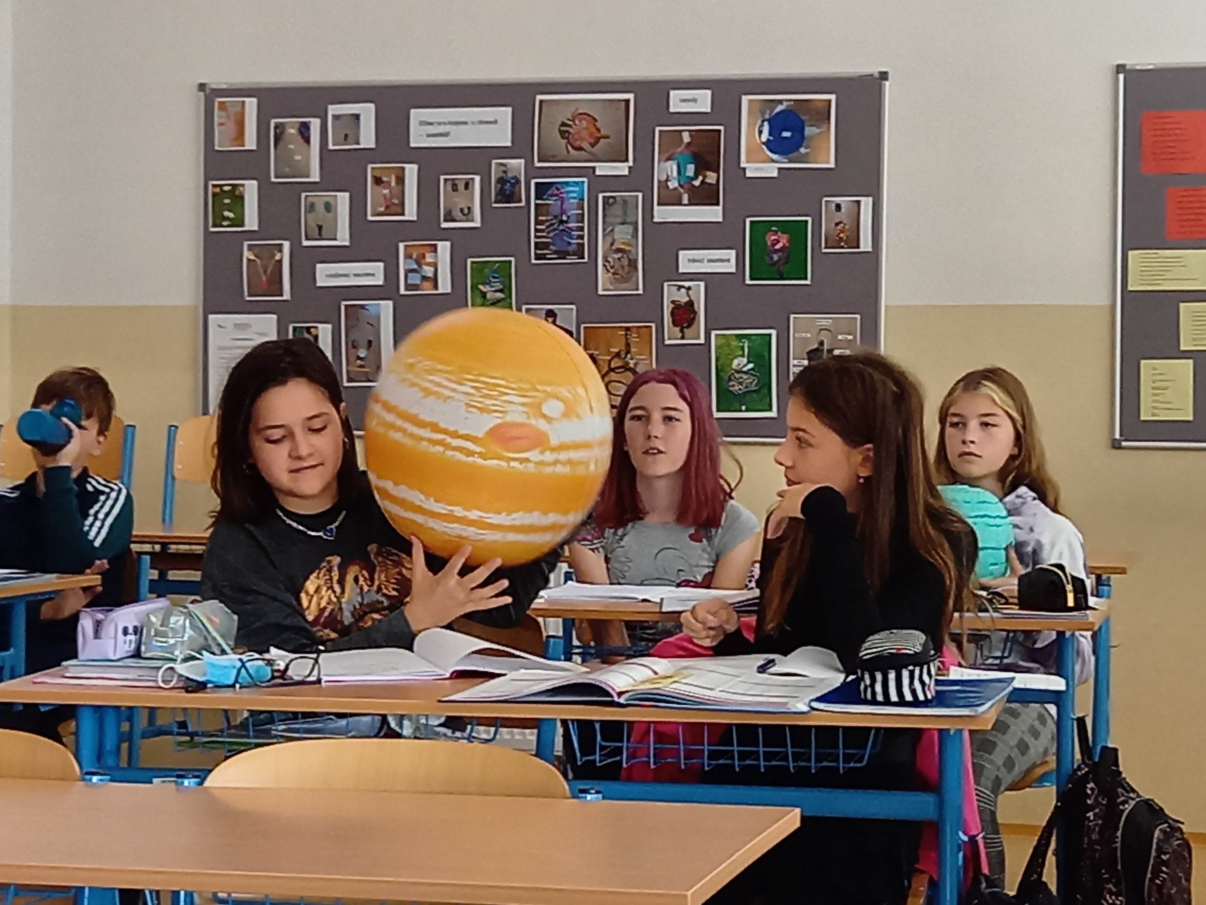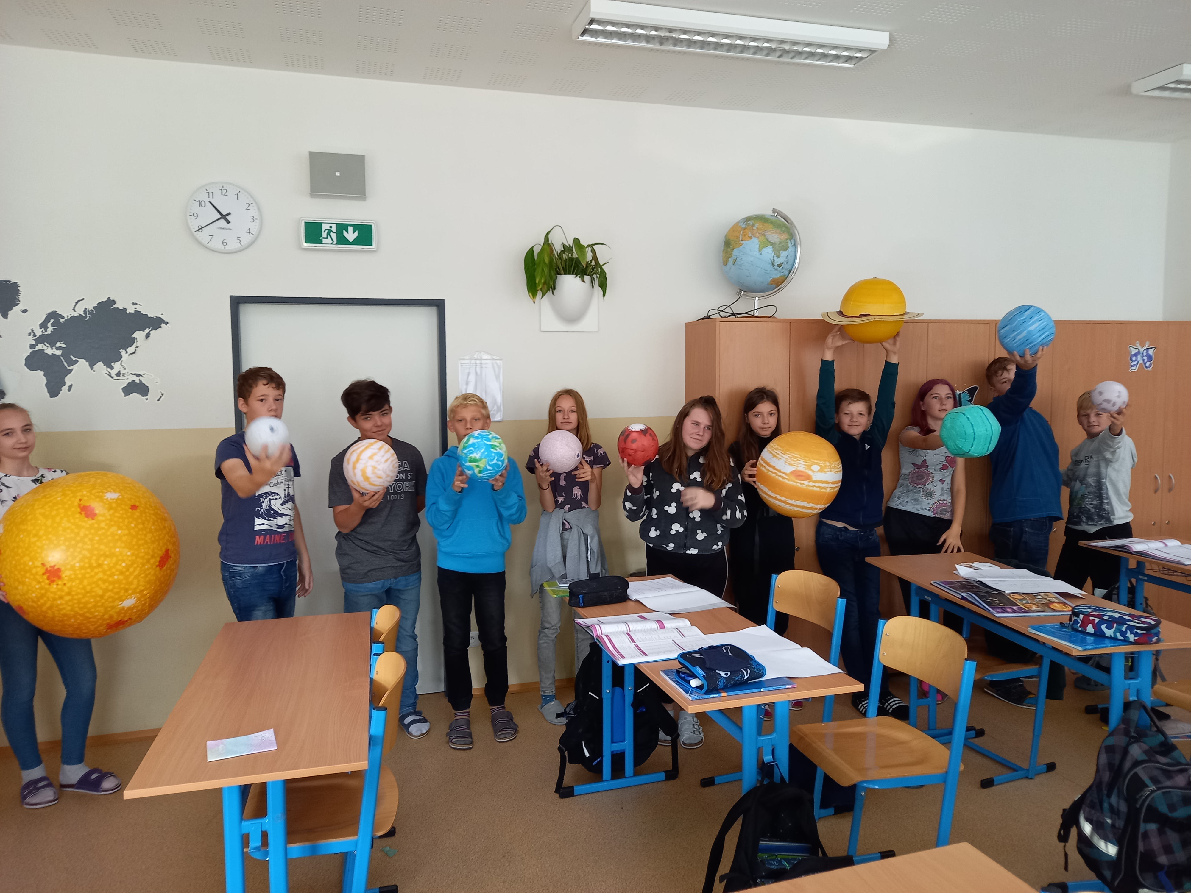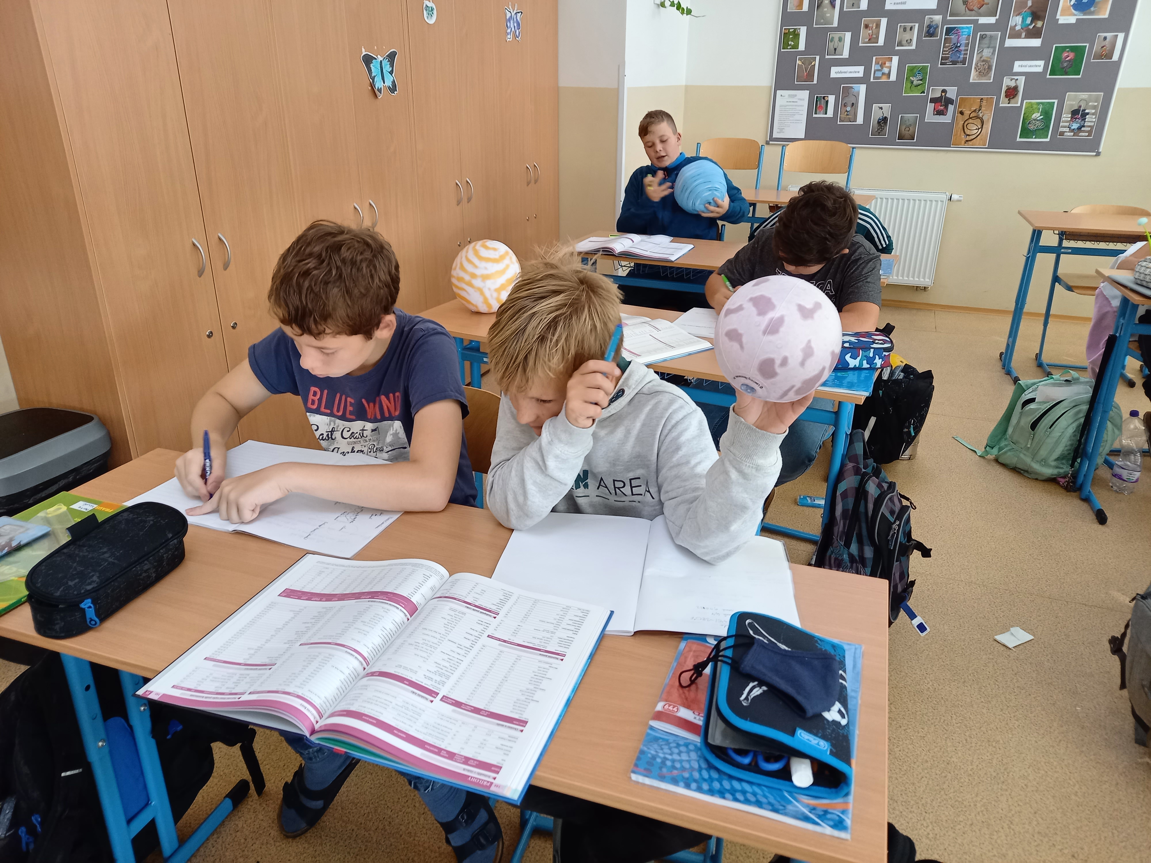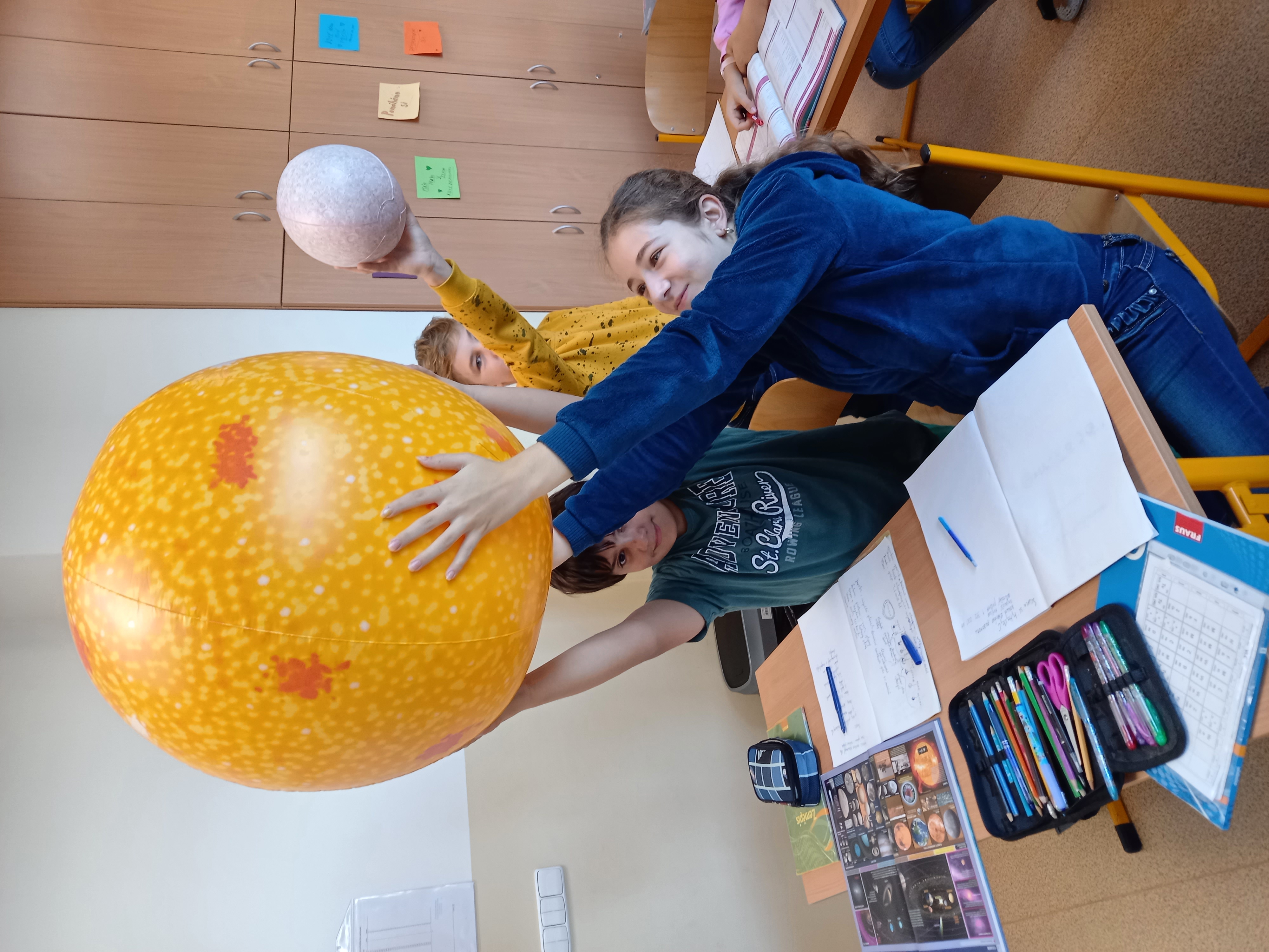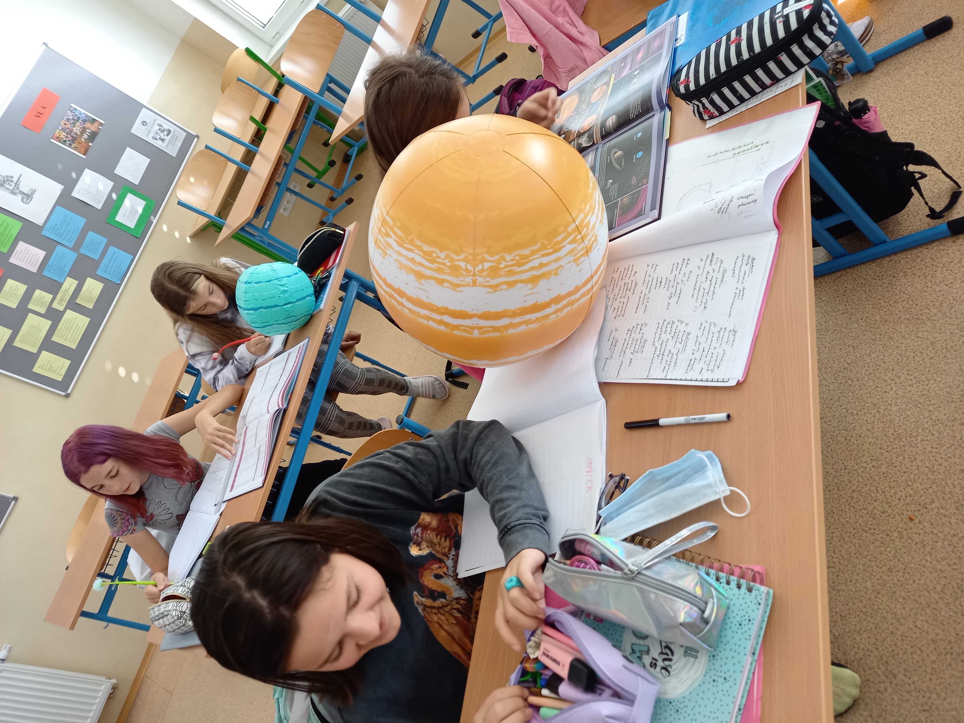 Se všemi šestými třídami jsem se zabořili do tématu vesmíru. Děti tradičně baví to tajemno a „neuchopitelno“. Z 1. stupně mají spoustu znalostí, které opakujeme a prohlubujeme. Modely nafukovacích planet, Slunce a Měsíce nám názorně posloužily pro představu poměru velikostí, žáci usuzovali podle povrchu a velikosti, o jakou planetu se jedná, představili ji ostatním a pak nastalo různé řazení – od největšího objektu, dle pořadí od Slunce, dle složení… Takže jsme si i zaházeli a spojili učení s pohybem.