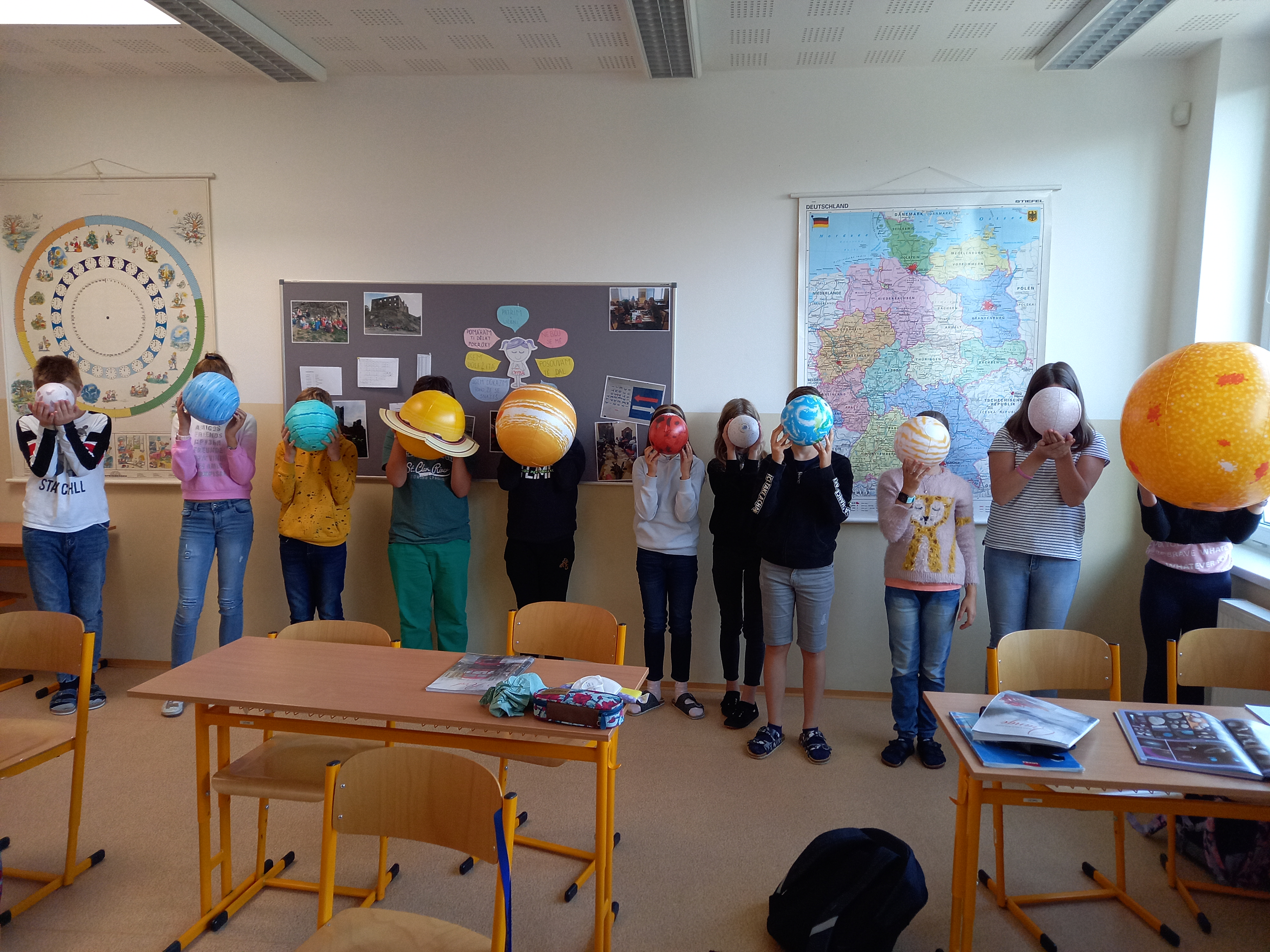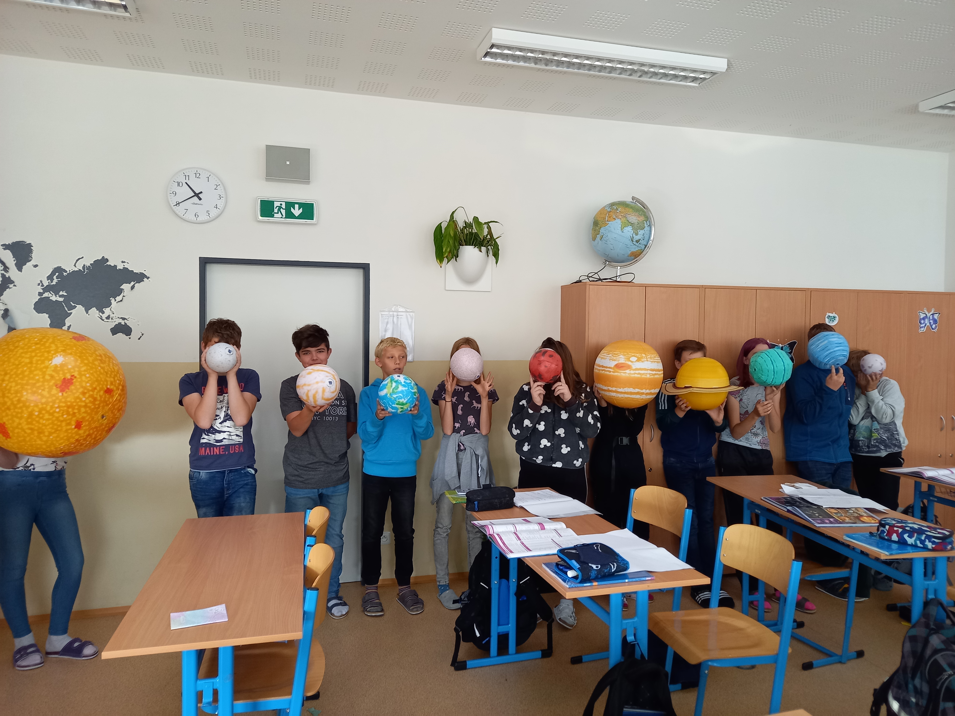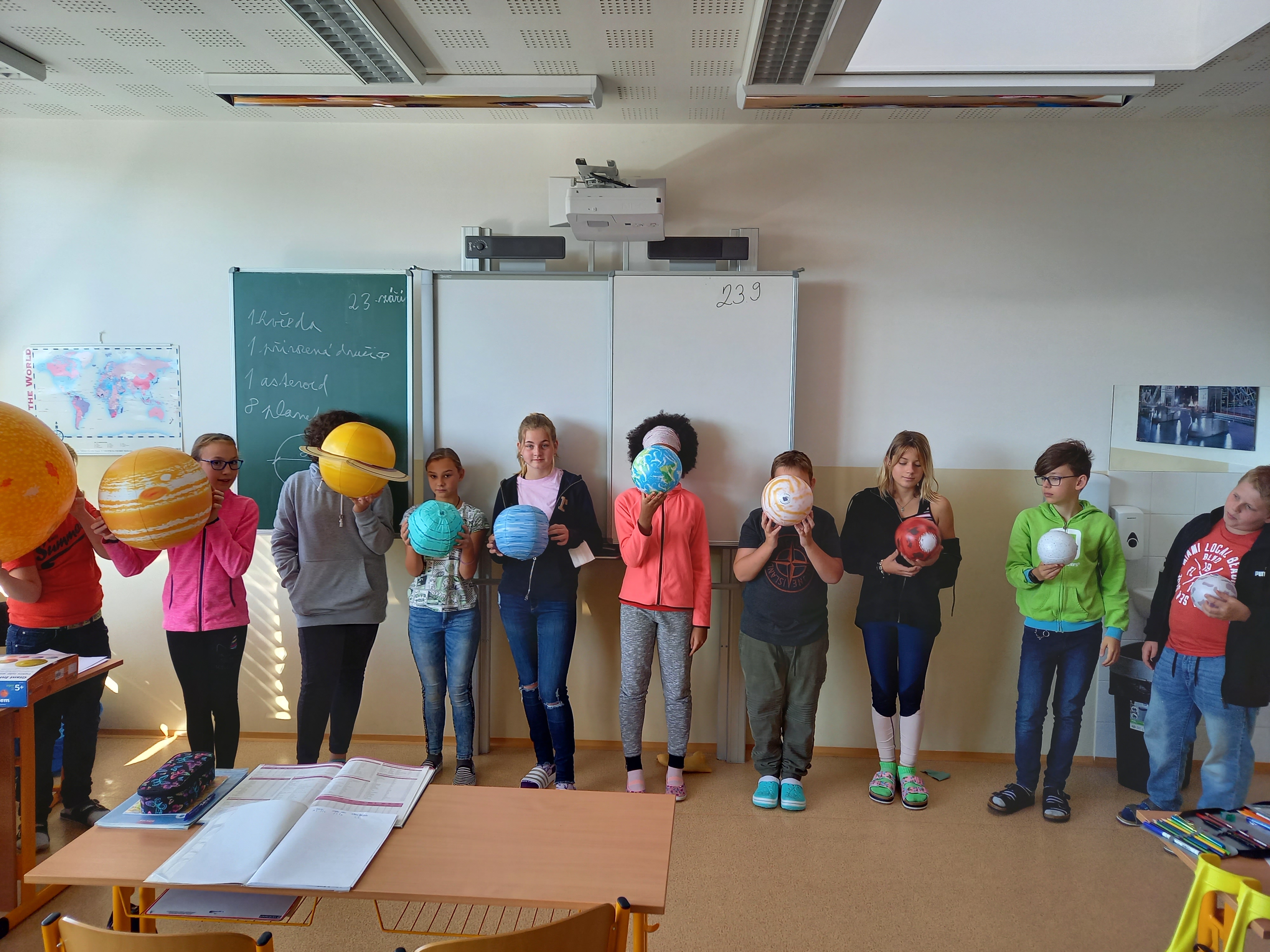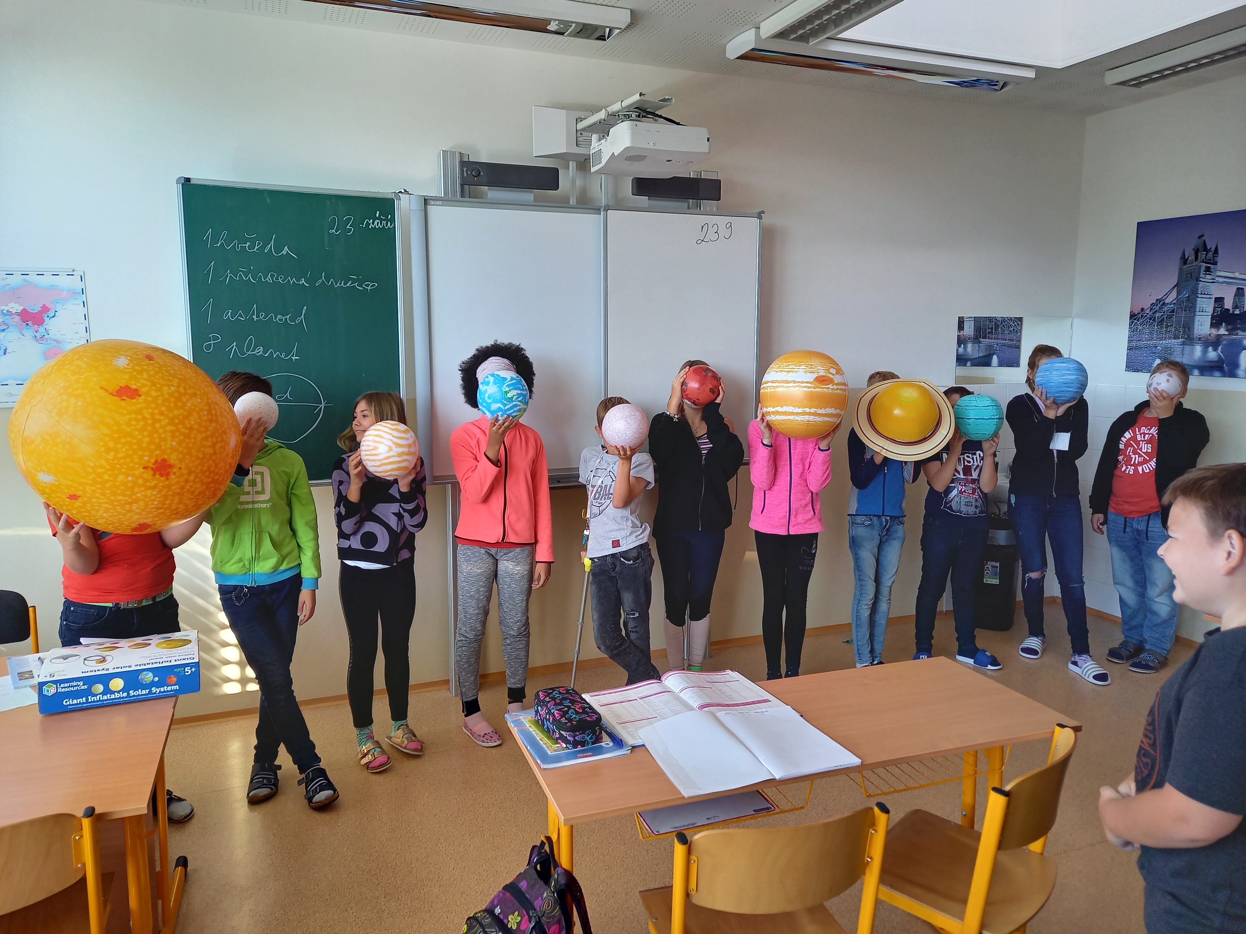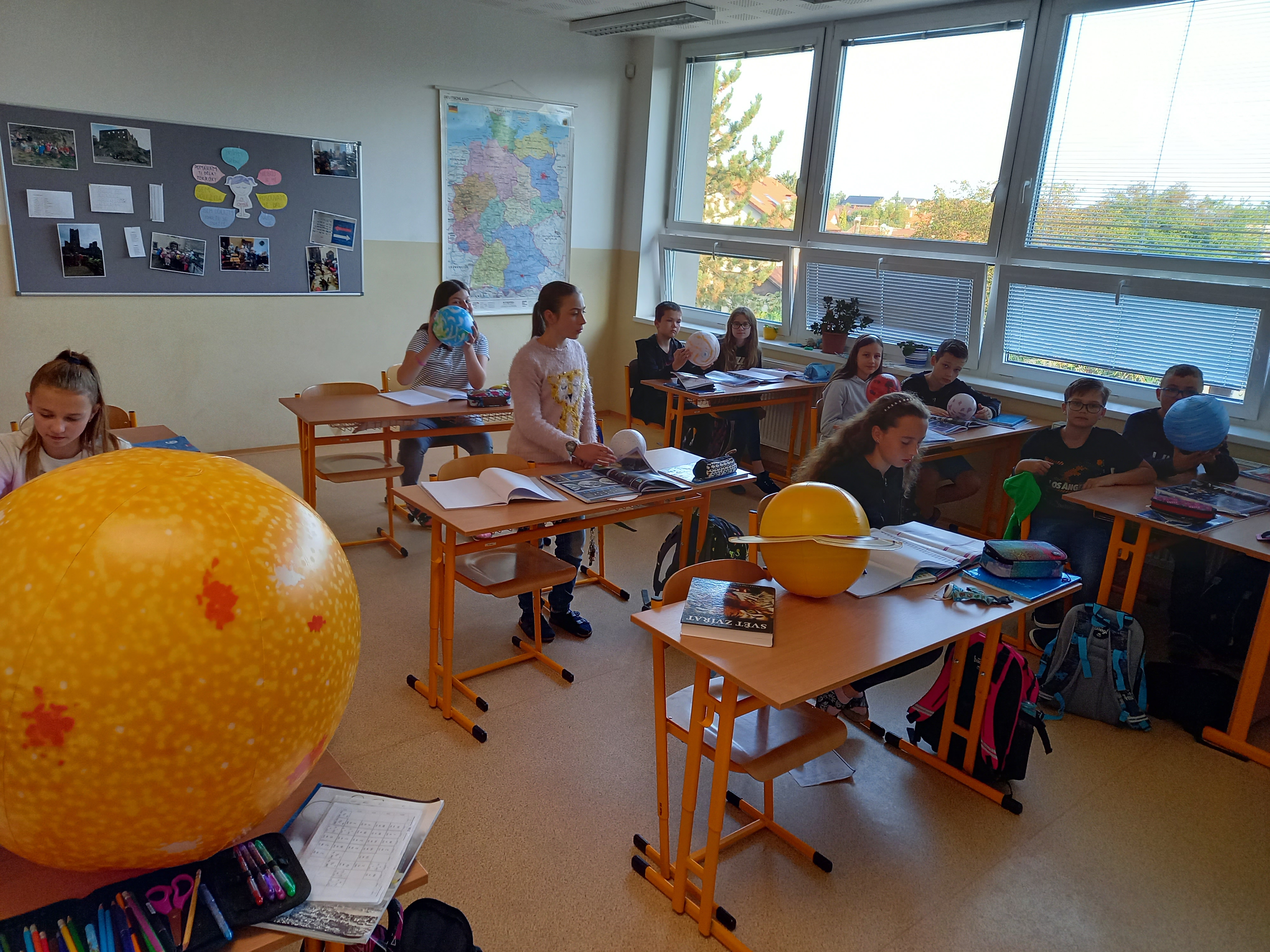 Se všemi šestými třídami jsem se zabořili do tématu vesmíru. Děti tradičně baví to tajemno a „neuchopitelno“. Z 1. stupně mají spoustu znalostí, které opakujeme a prohlubujeme. Modely nafukovacích planet, Slunce a Měsíce nám názorně posloužily pro představu poměru velikostí, žáci usuzovali podle povrchu a velikosti, o jakou planetu se jedná, představili ji ostatním a pak nastalo různé řazení – od největšího objektu, dle pořadí od Slunce, dle složení… Takže jsme si i zaházeli a spojili učení s pohybem.