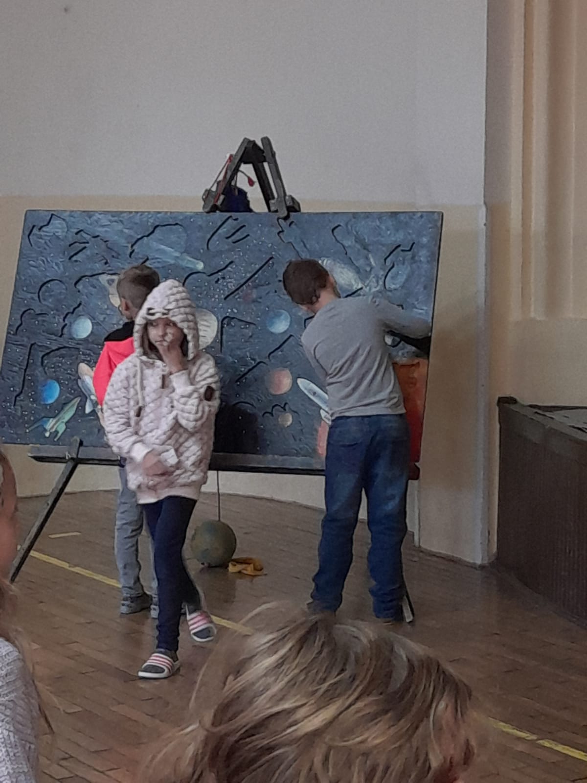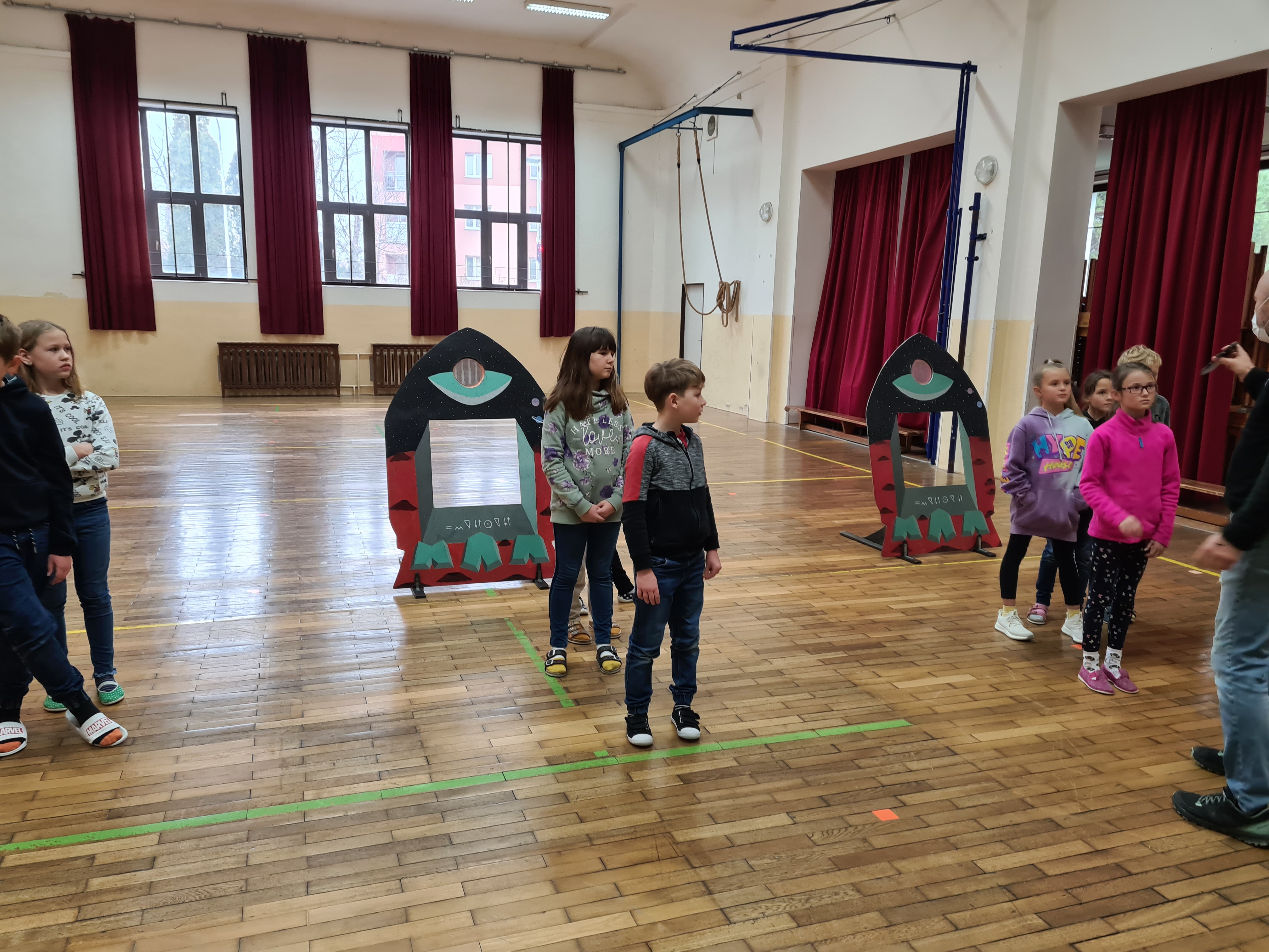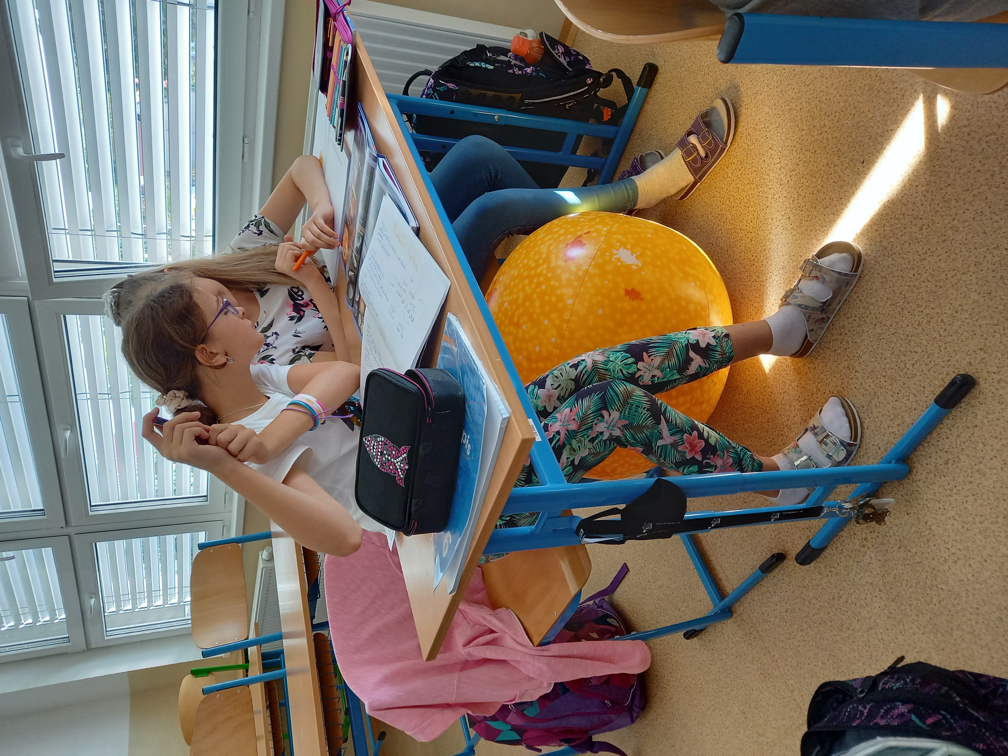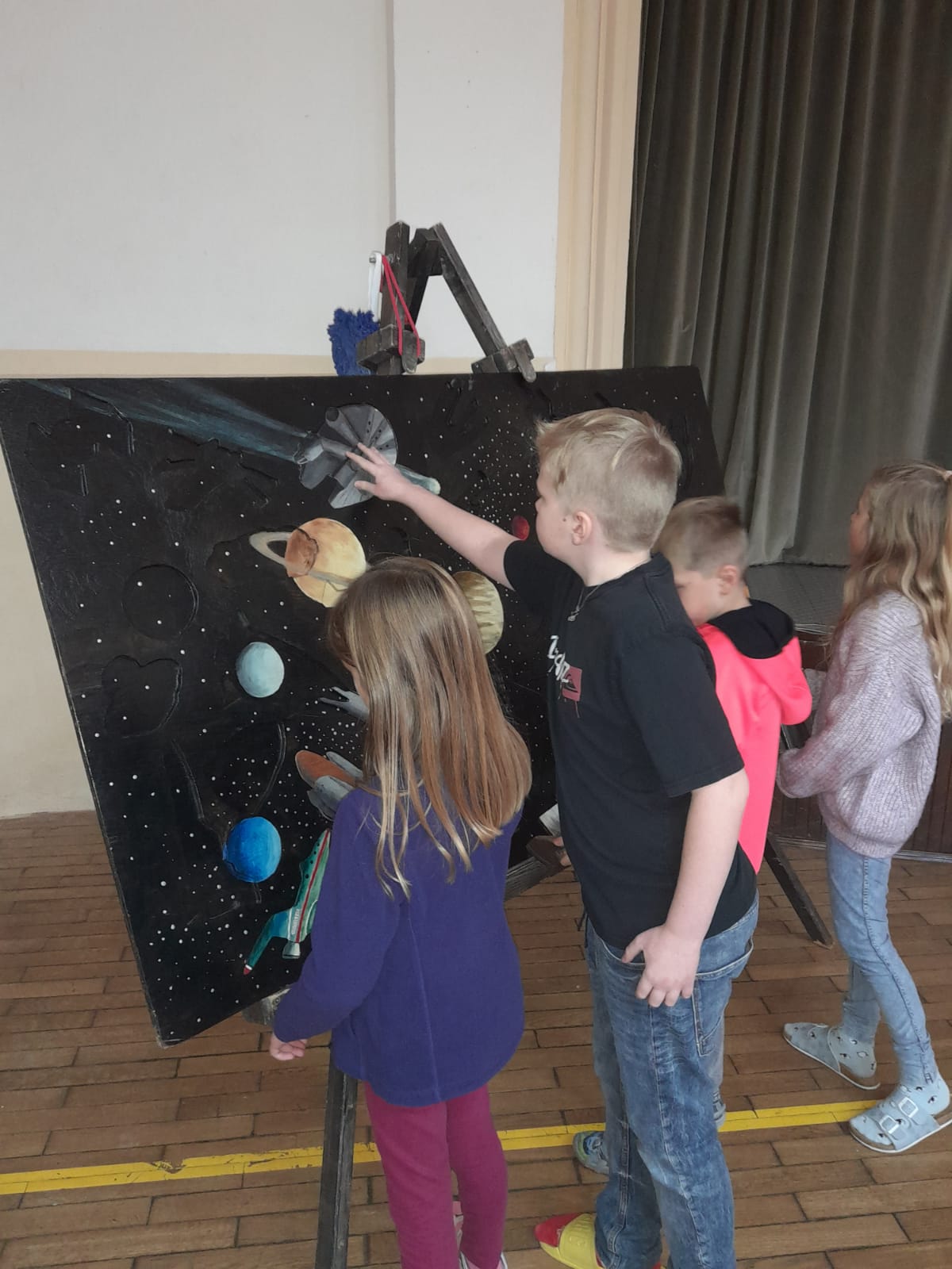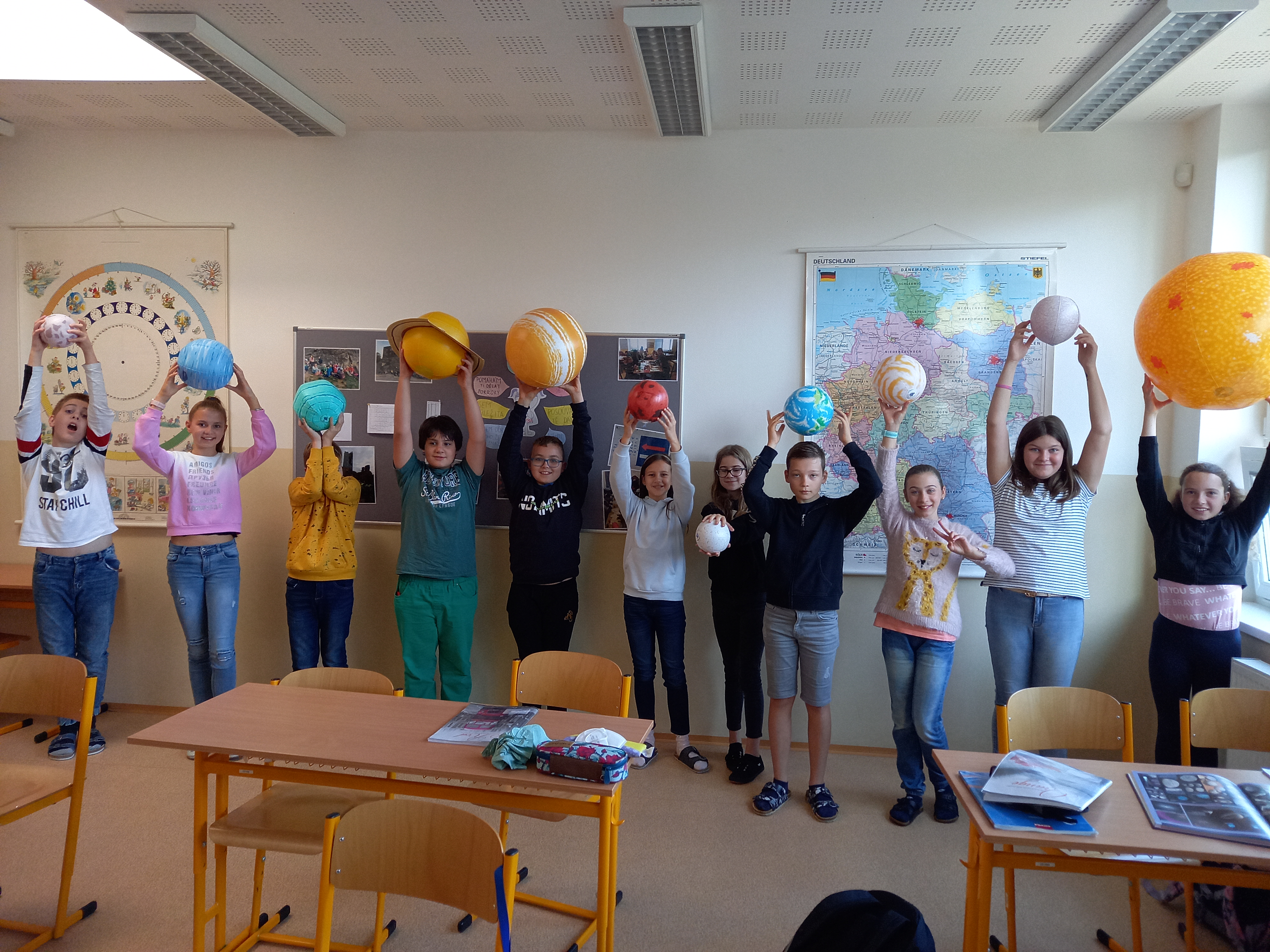 Se všemi šestými třídami jsem se zabořili do tématu vesmíru. Děti tradičně baví to tajemno a „neuchopitelno“. Z 1. stupně mají spoustu znalostí, které opakujeme a prohlubujeme. Modely nafukovacích planet, Slunce a Měsíce nám názorně posloužily pro představu poměru velikostí, žáci usuzovali podle povrchu a velikosti, o jakou planetu se jedná, představili ji ostatním a pak nastalo různé řazení – od největšího objektu, dle pořadí od Slunce, dle složení… Takže jsme si i zaházeli a spojili učení s pohybem.