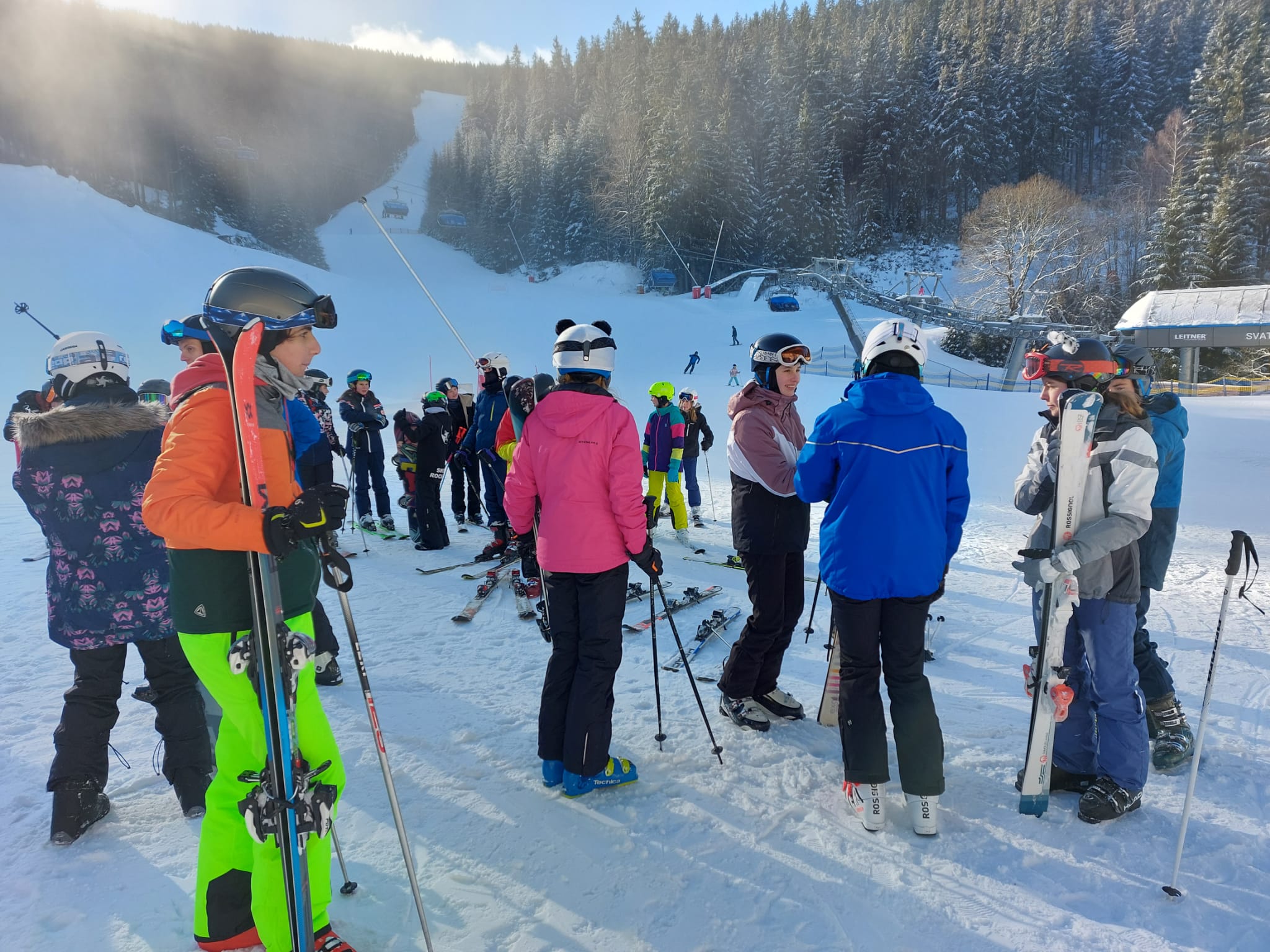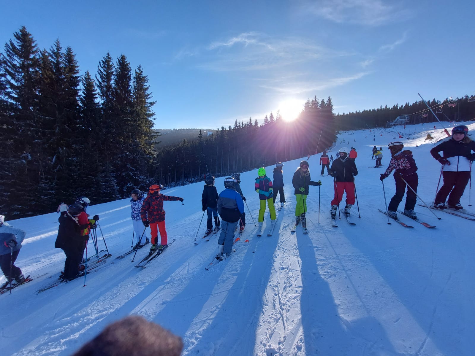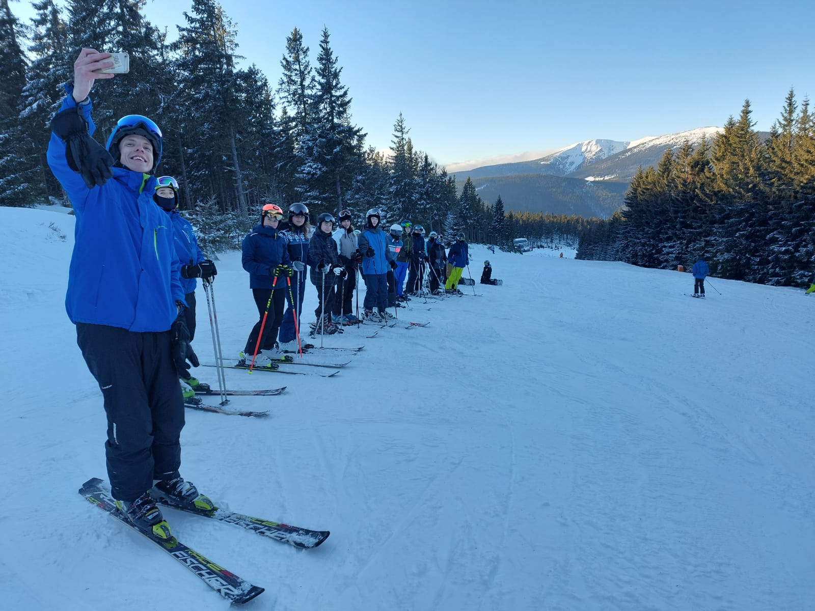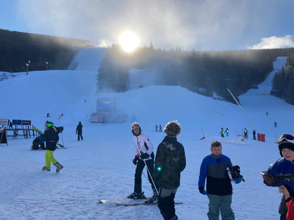 Vzkaz od pedagogů: Lyžovali jsme ve Svatém Petru, bylo krásně sluníčko, výhled na vrcholky hor a čerstvý prašan. Nikomu se nic nestalo 🙂