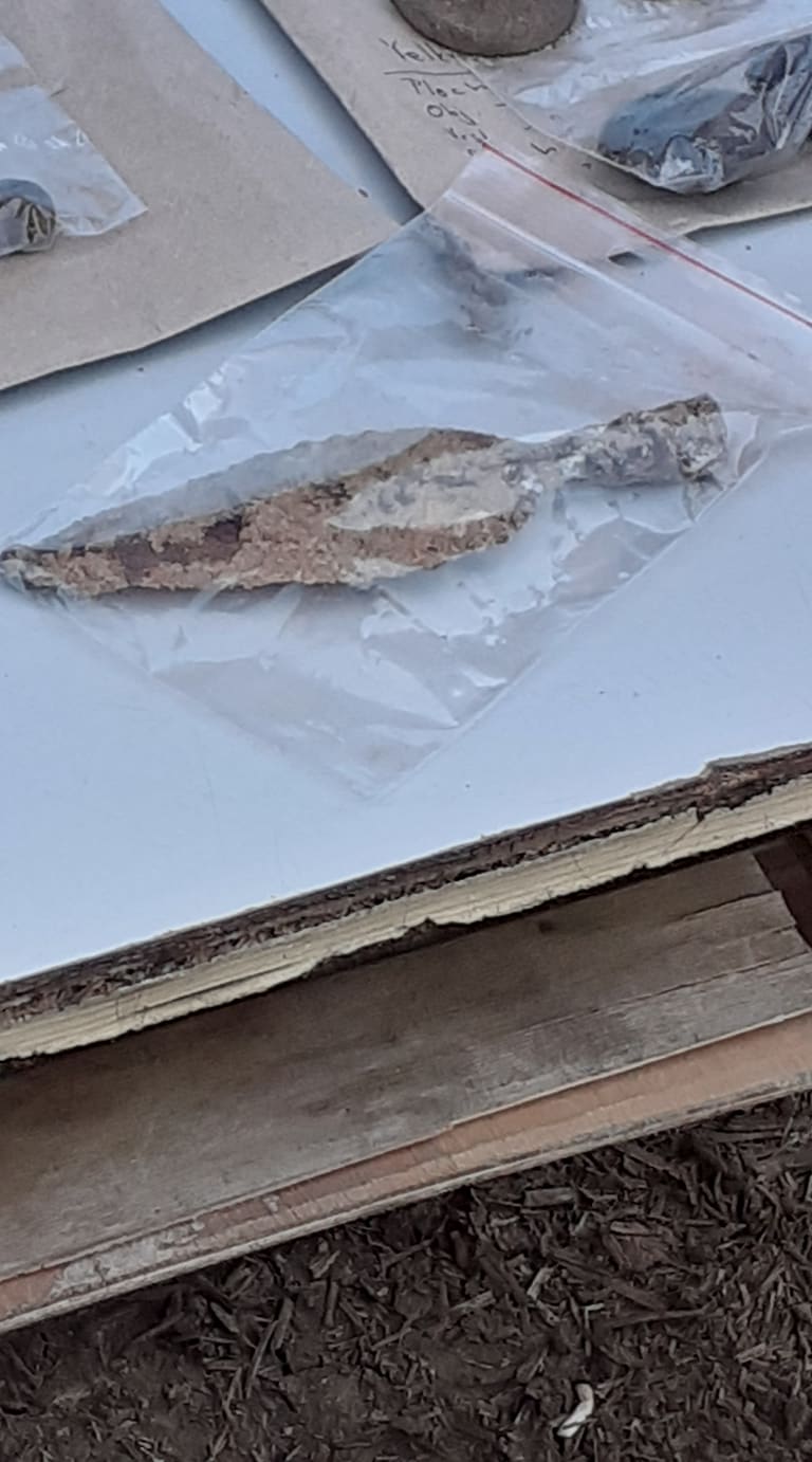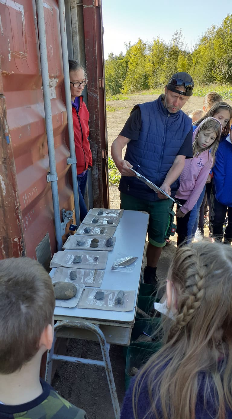Potom si žáci prohlédli malou výstavku ukázek nálezů z tohoto místa. Zbytky keramiky, úlomky pravěkých nástrojů, závaží z tkalcovského stavu, kousek pazourku a kostěnou jehlu. A pochopitelně úlomky kostí, i těch ze zmiňovaného bojovníka. Největší pozornost vyvolal zachovalý hrot kopí.