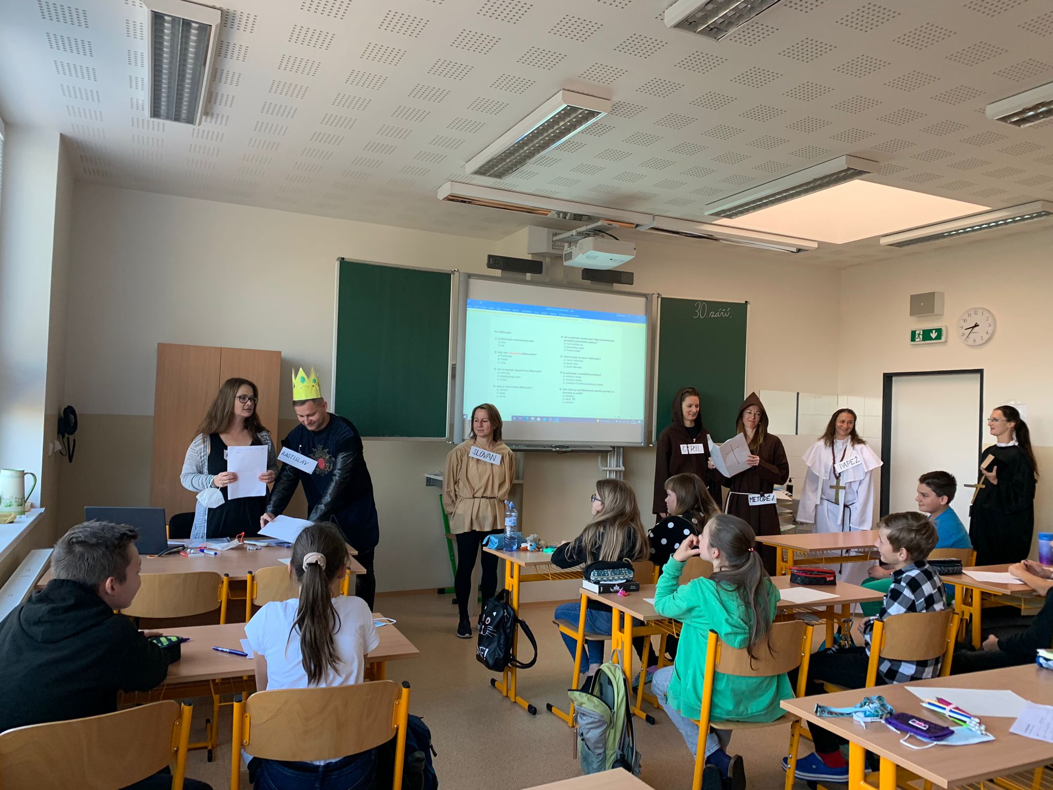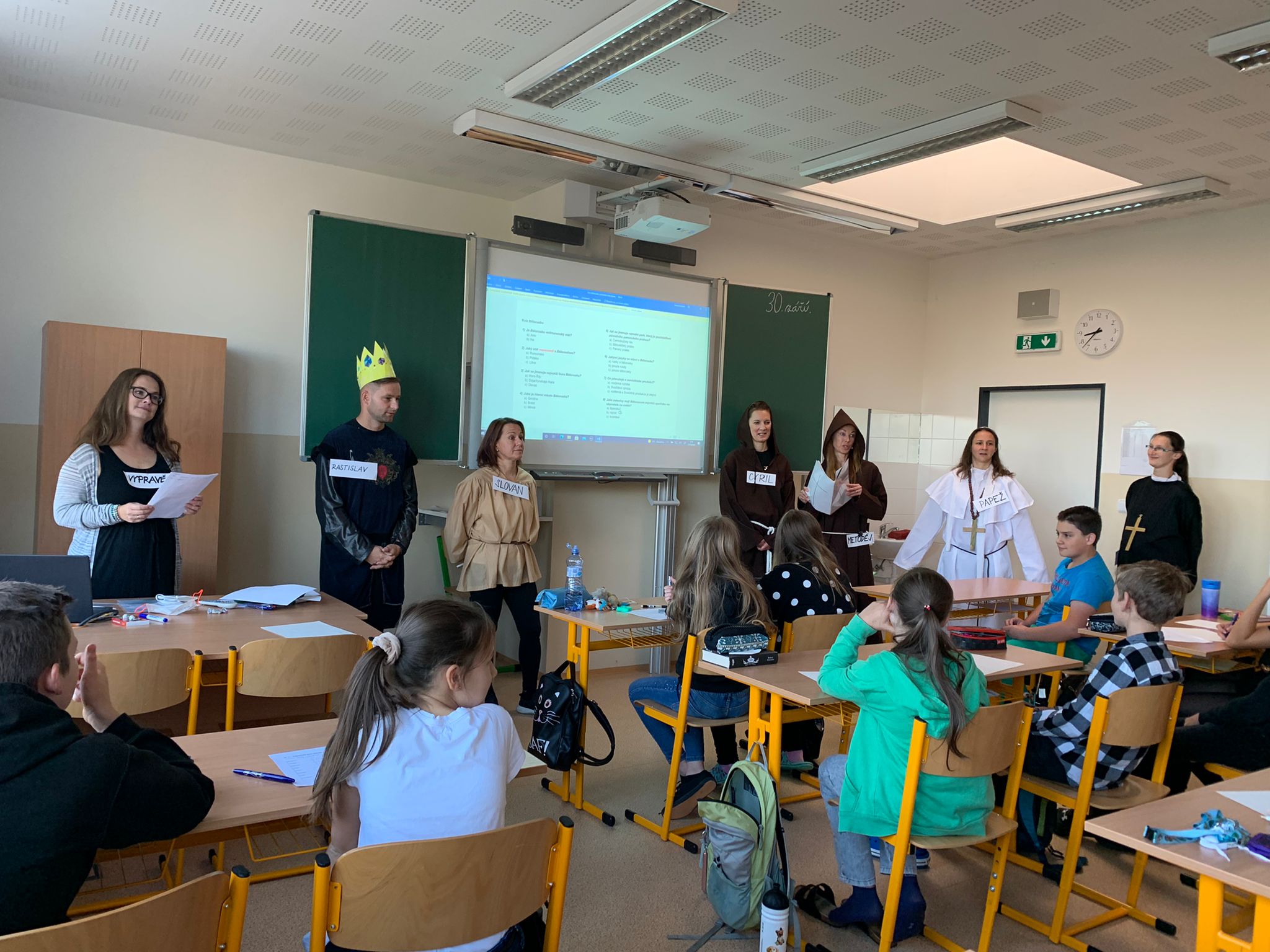 Evropský den jazyků se každoročně slaví od roku 2001 dne 26. září. Letos jsme ho věnovali slovanským jazykům. Učitelé pobavili žáky krátkou divadelní hrou o příchodu Cyrila a Metoděje, kteří začali v roce 863 šířit na Velké Moravě staroslověnštinu, základ moderních slovanských jazyků. Poté se chopili iniciativy sami žáci, kteří natočili o jednotlivých zemích a jejich úřední řeči krátká zábavná, ale hlavně poučná videa. A jak jste na tom vy? Rozpoznáte slovanské jazyky? My už ano 🙂 Tak příští rok zase Do widzenia! Do viđenja! Dovidjenja! Да пабачэньня! Довиждане! До свидания! До побачення! u dalšího zajímavého projektu.