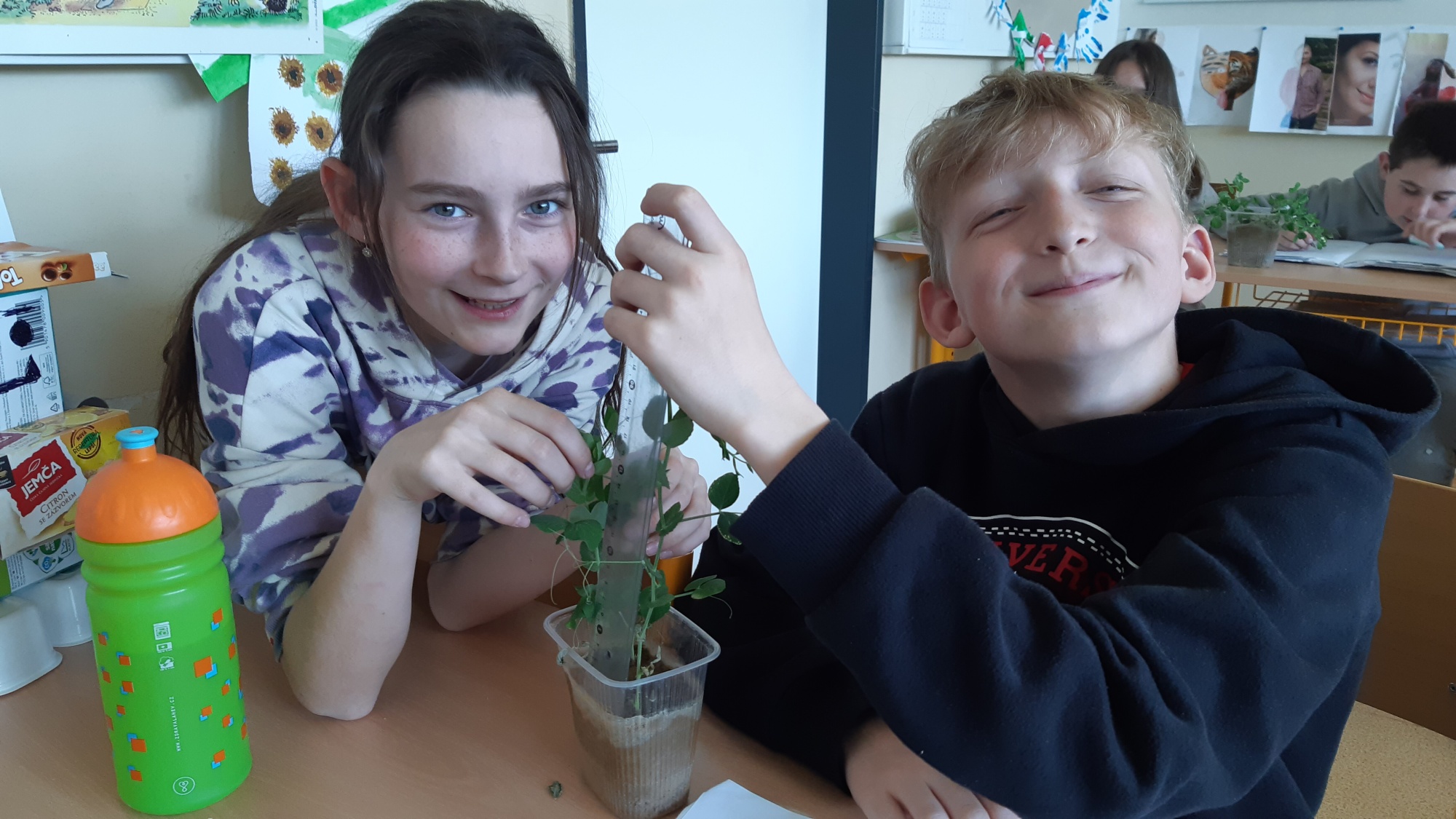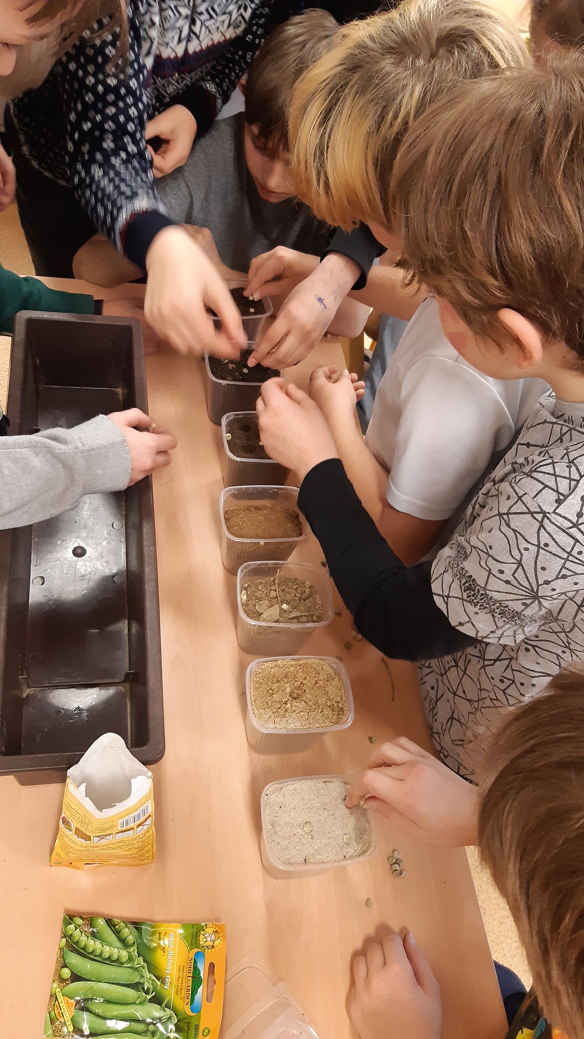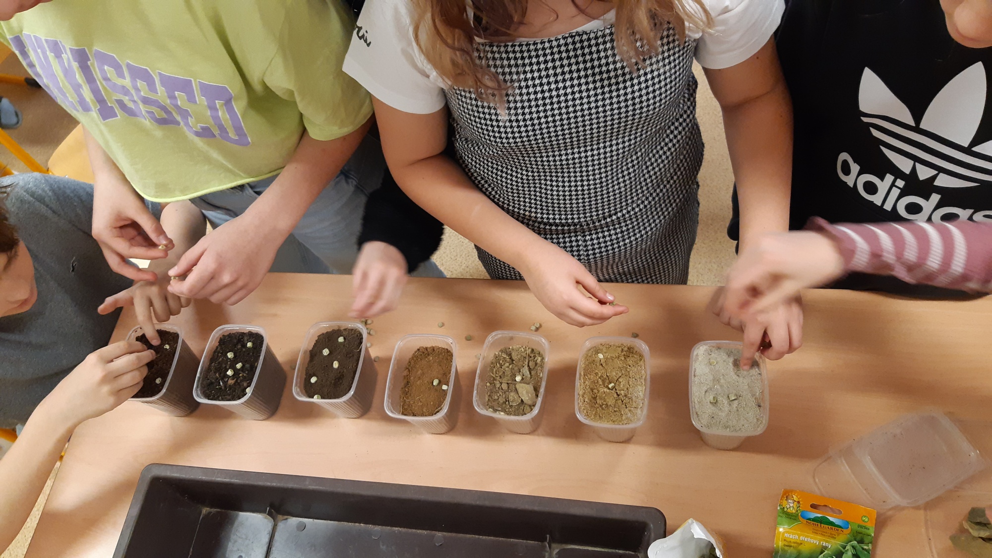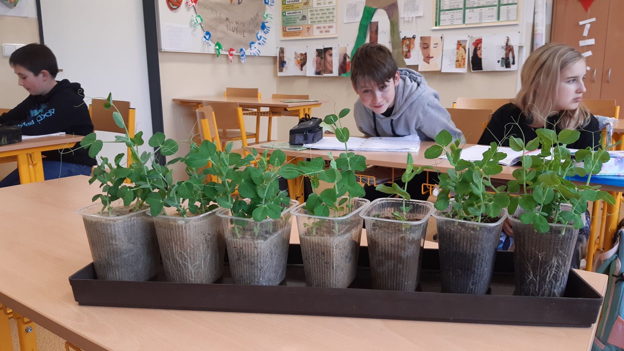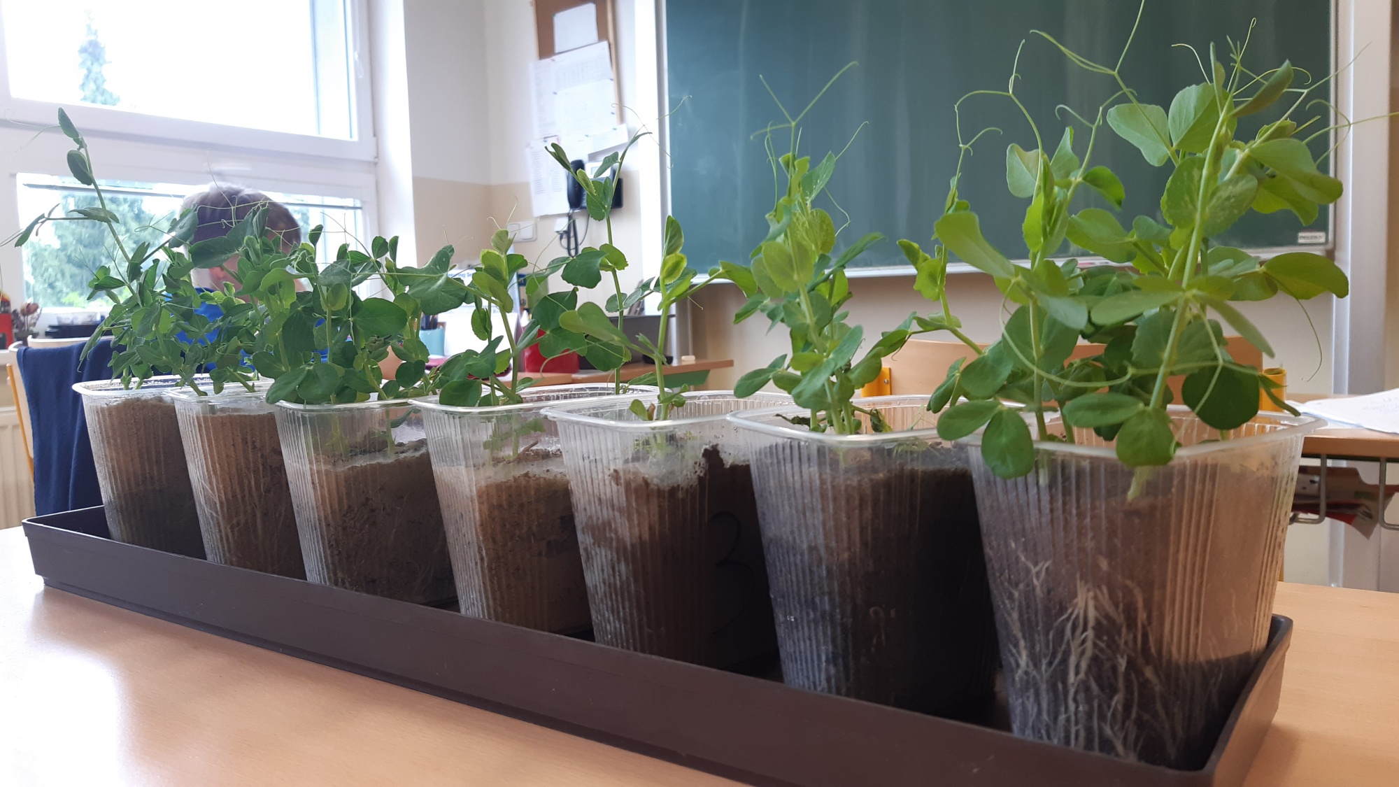 Na hrachu setém jsme zkoušeli vliv půdy na klíčení, vývoj a růst rostlin. Děti měly sedm průhledných kelímků s různým typem půdy. Od praného písku po kvalitní kompost. V každém kelímku bylo sedm semínek. Děti sledovaly a porovnávaly růst nadzemních i podzemních částí rostlin. Ve všech půdách rostliny vyklíčily a rostly, dokud měly zachované děložní lístky.
