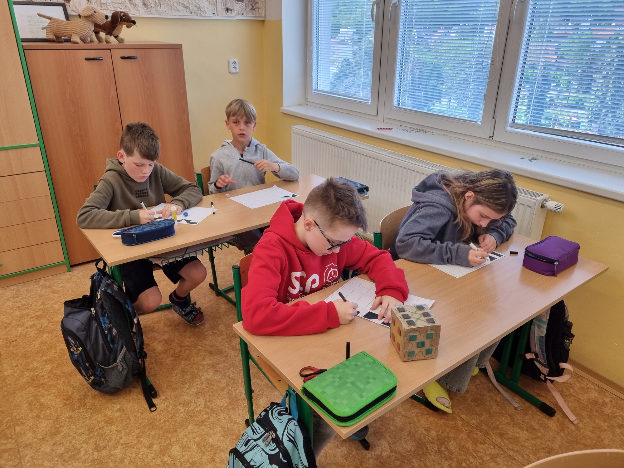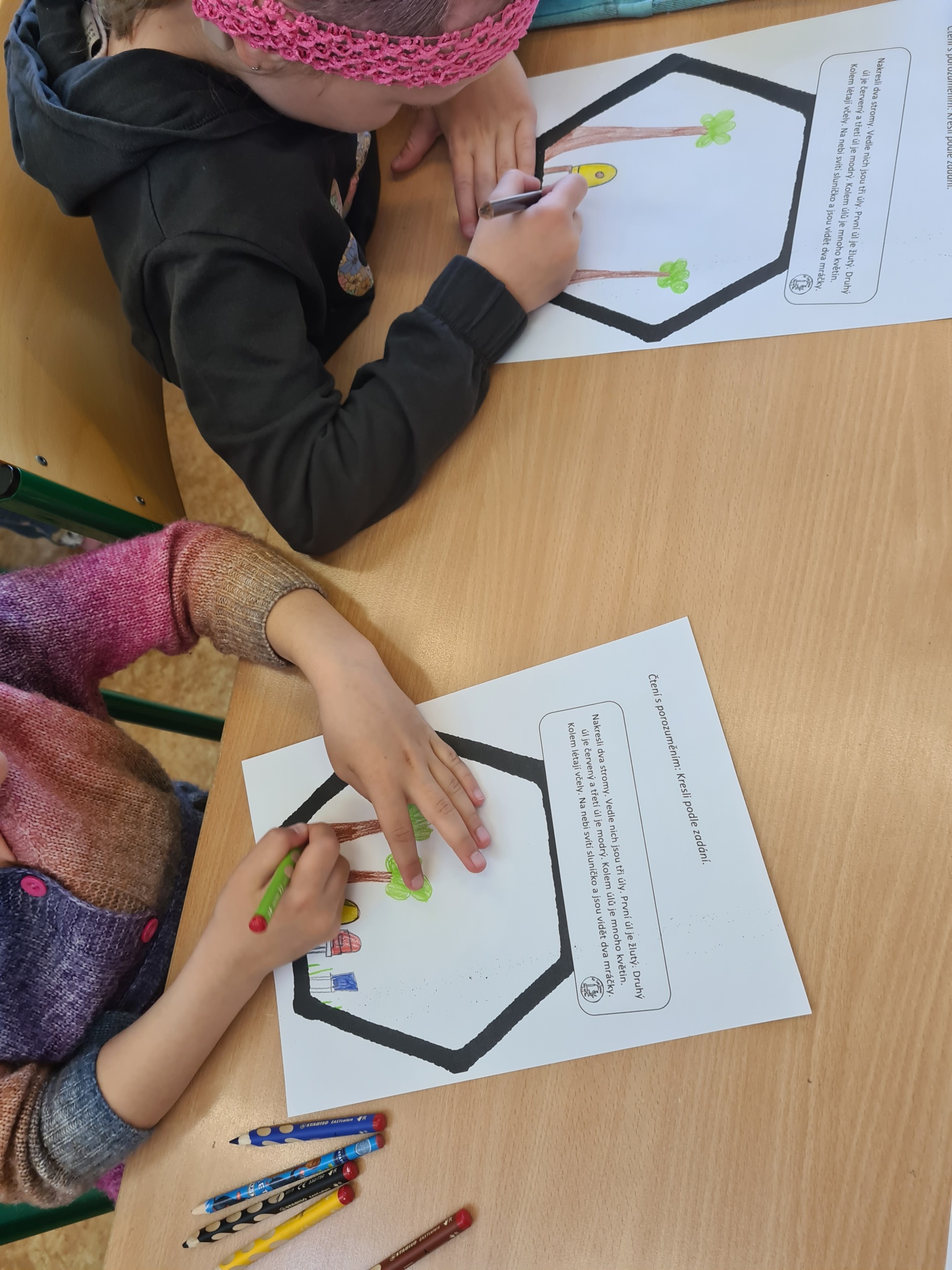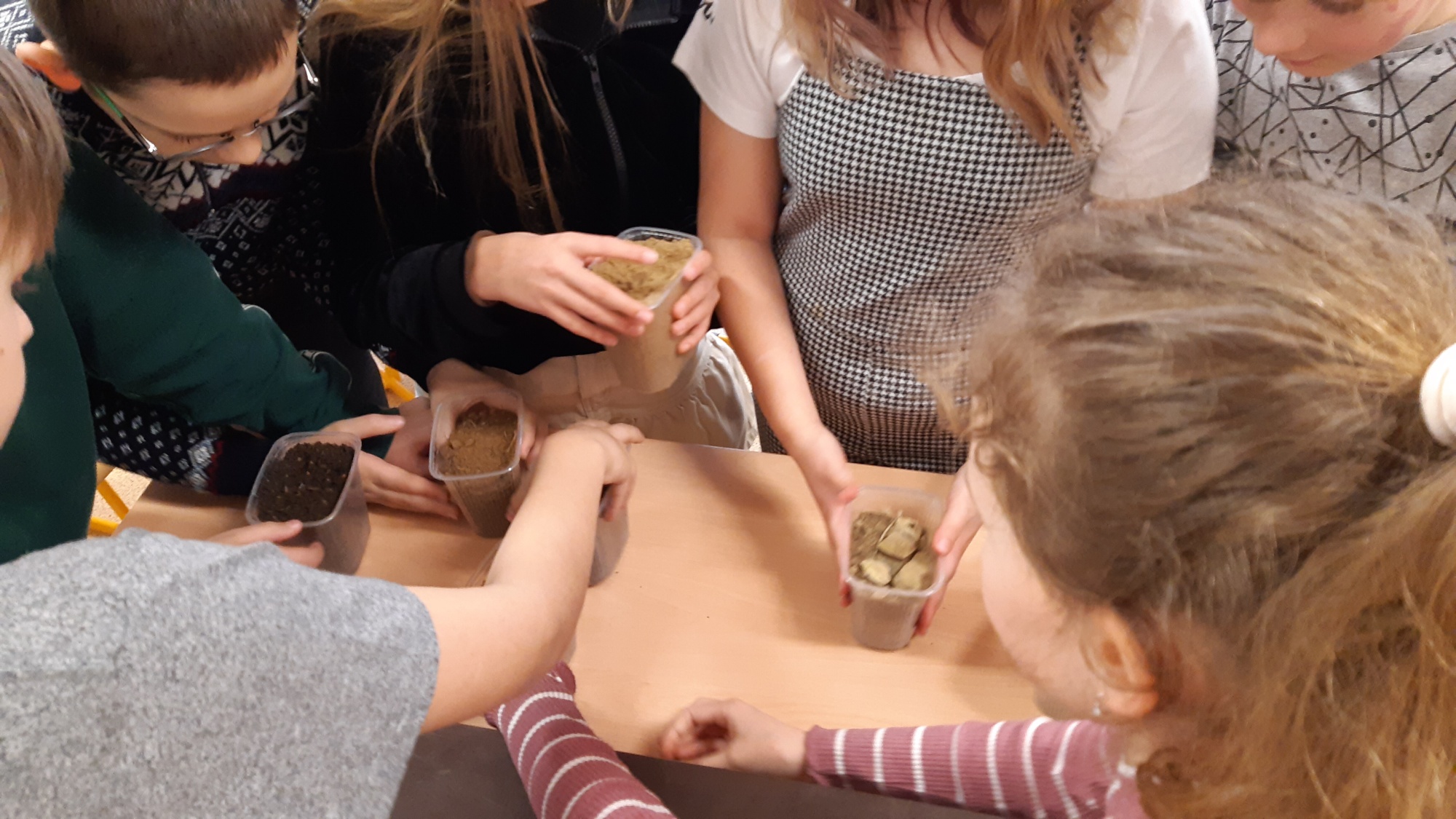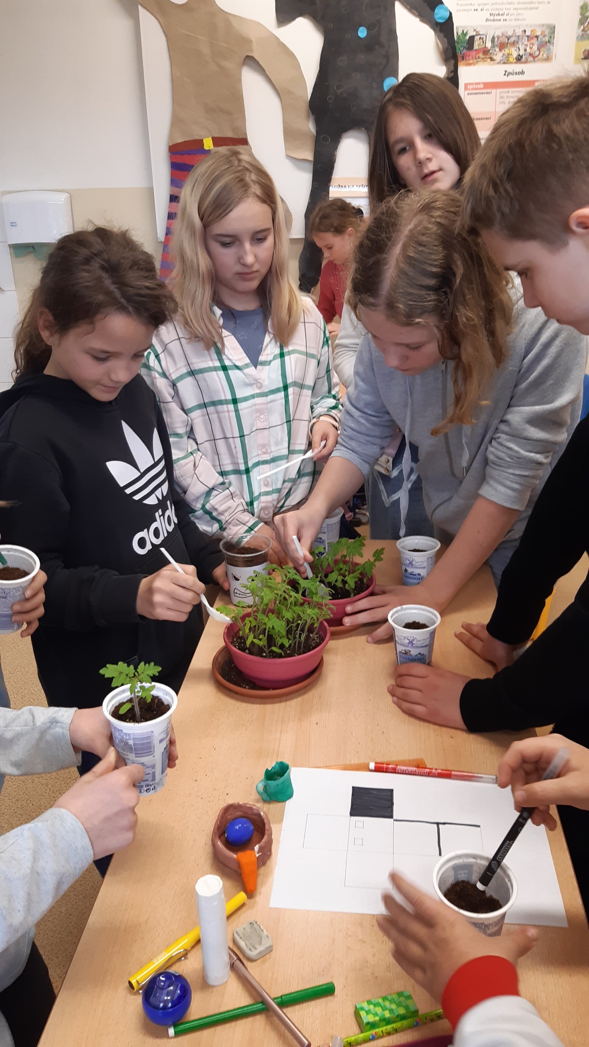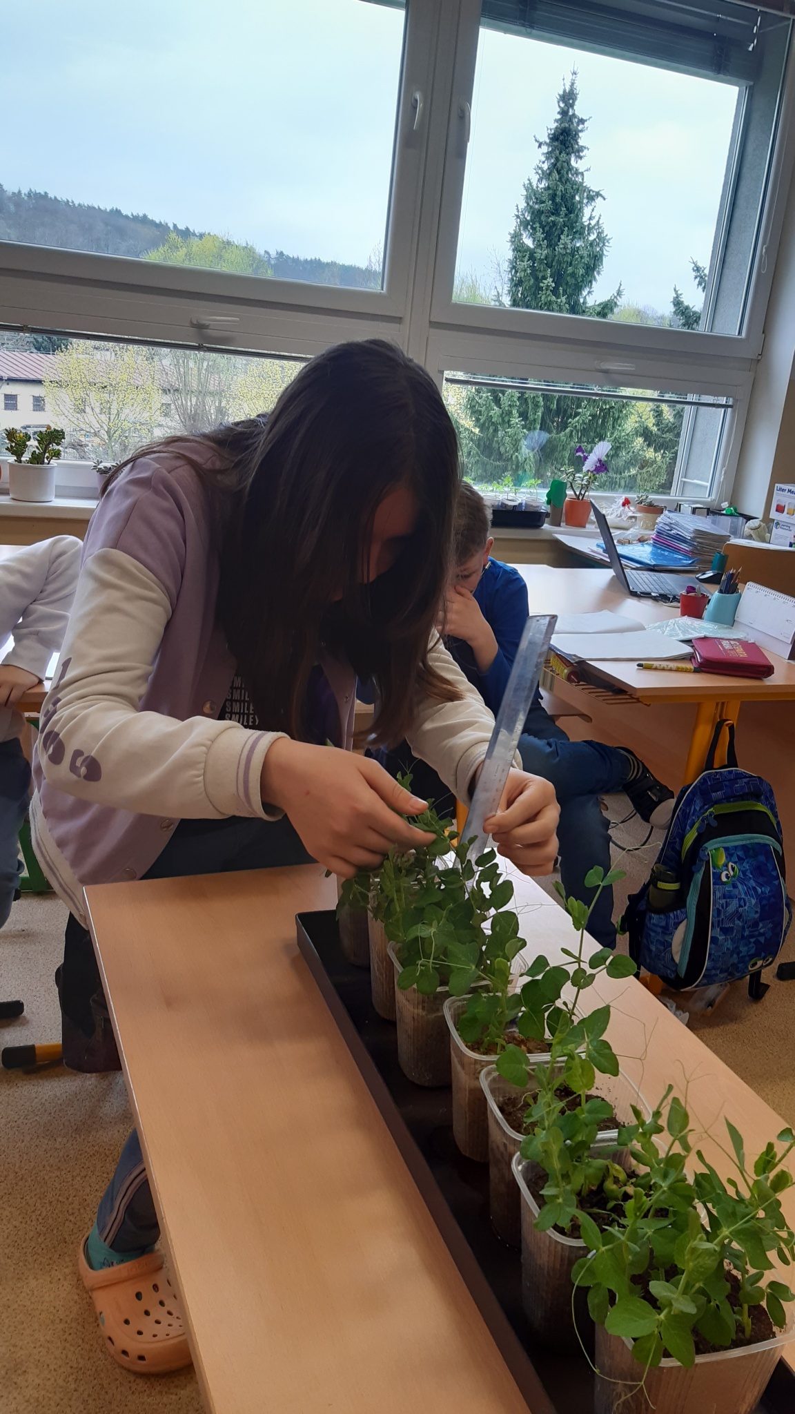 Na hrachu setém jsme zkoušeli vliv půdy na klíčení, vývoj a růst rostlin. Děti měly sedm průhledných kelímků s různým typem půdy. Od praného písku po kvalitní kompost. V každém kelímku bylo sedm semínek. Děti sledovaly a porovnávaly růst nadzemních i podzemních částí rostlin. Ve všech půdách rostliny vyklíčily a rostly, dokud měly zachované děložní lístky.
