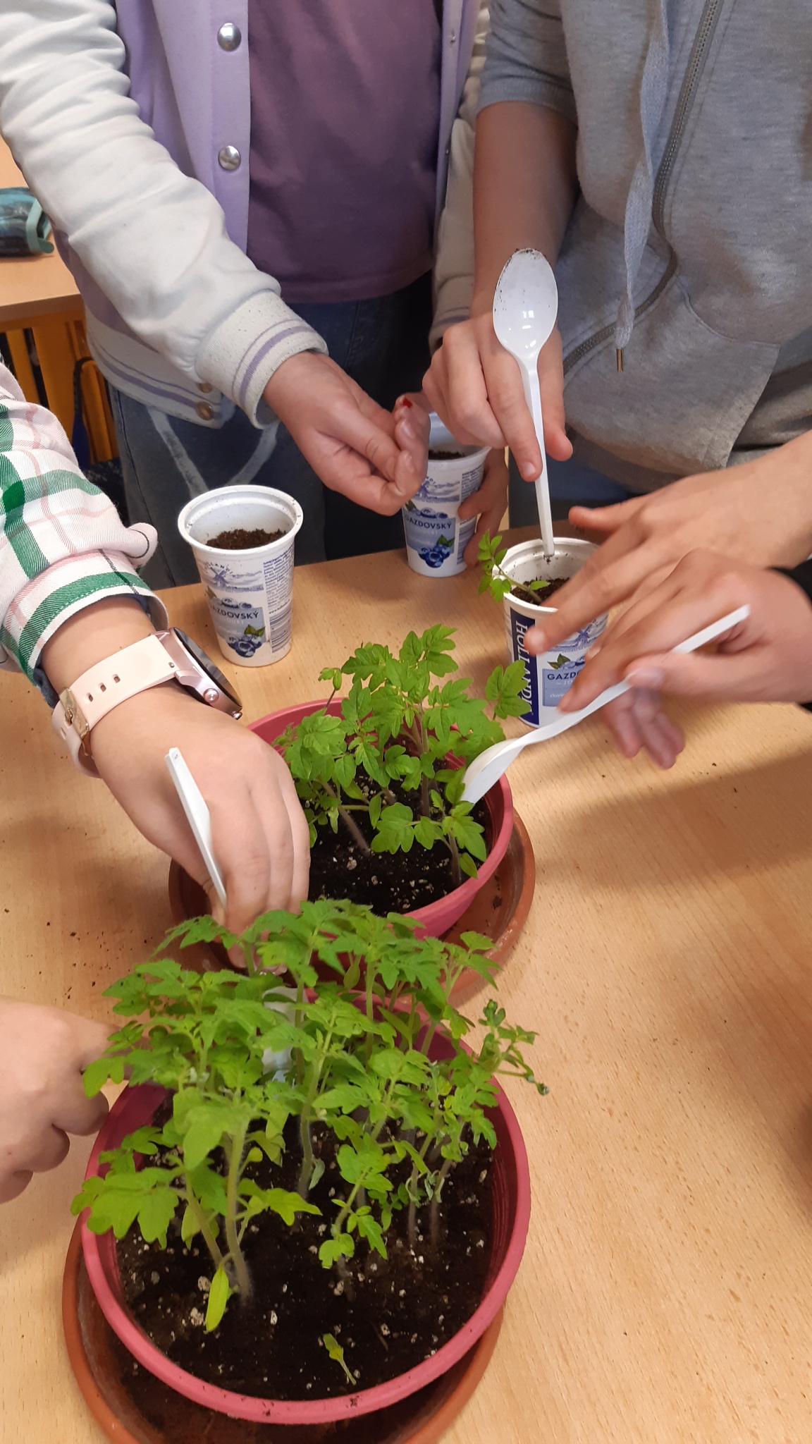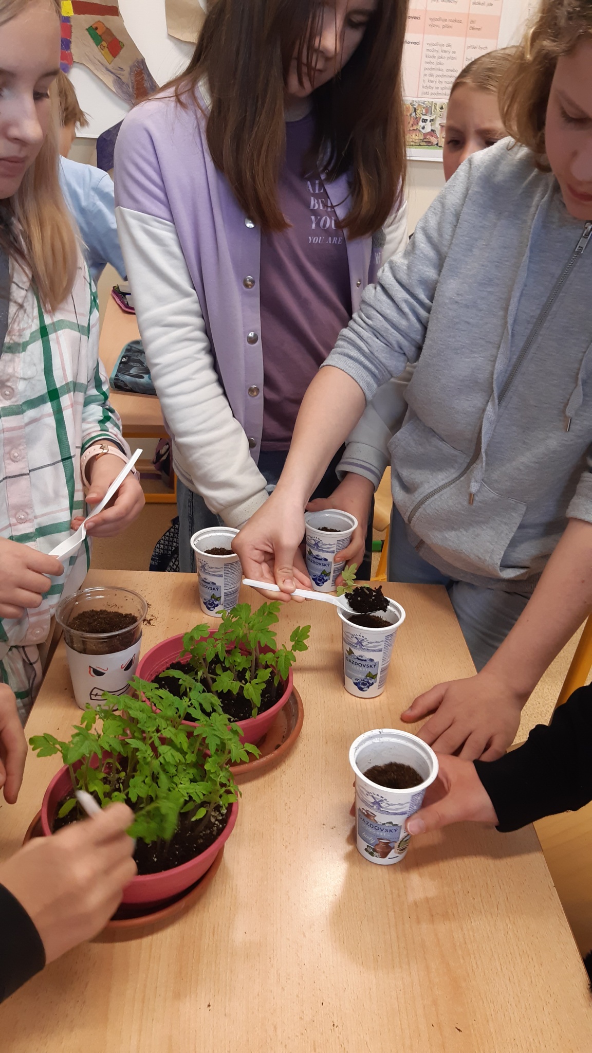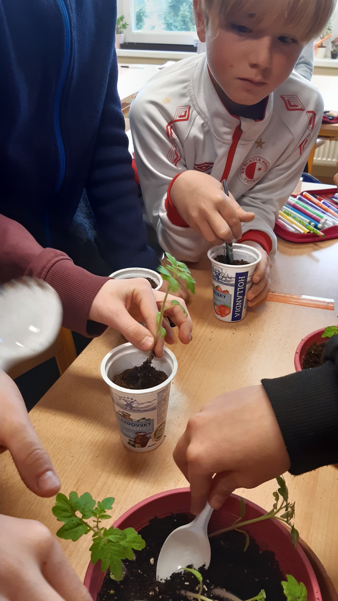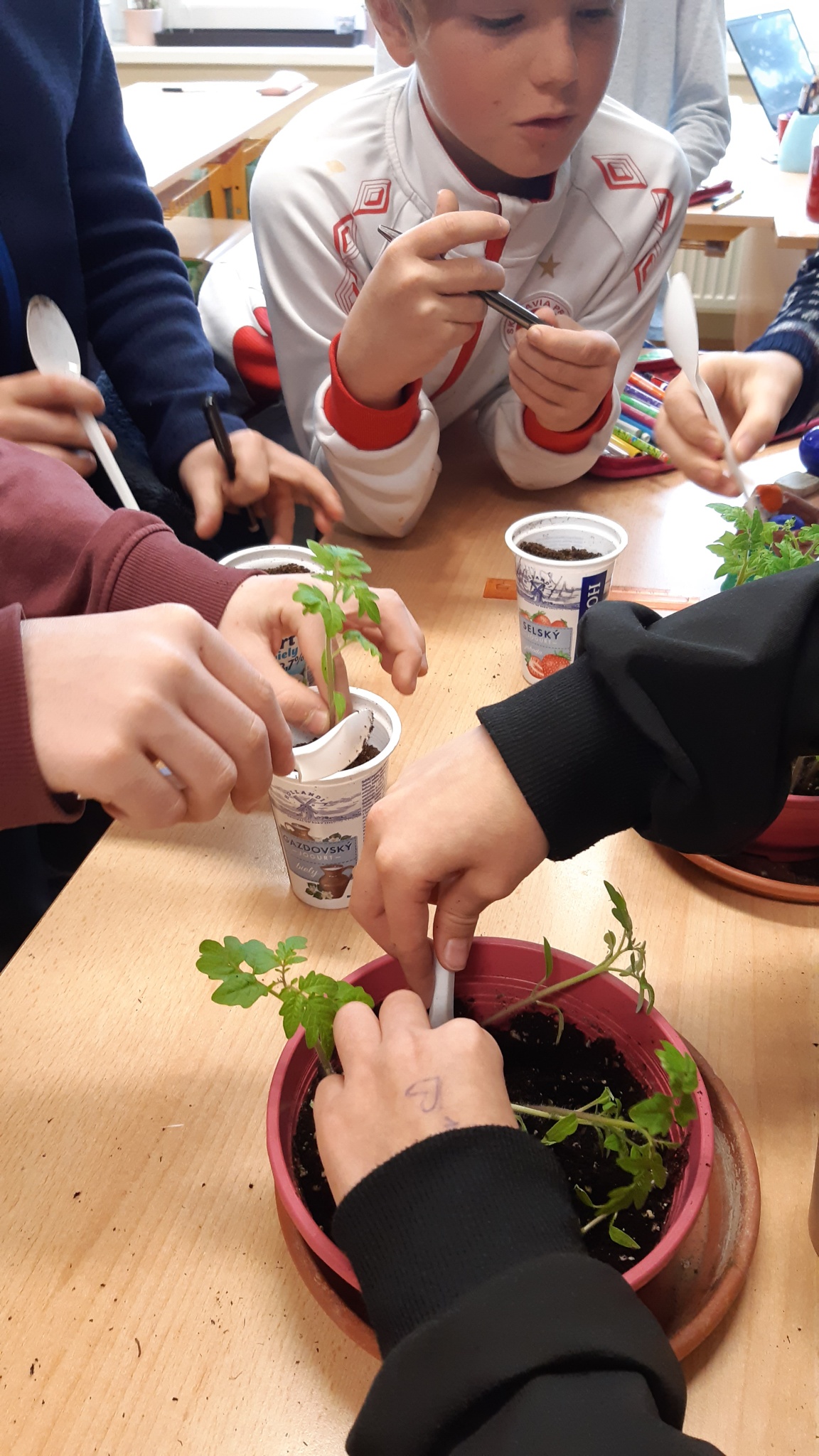 Další badatelskou činností bylo předpěstování sazenic rajčat. To se nám dařilo. V naší na jih orientované třídě rostly sazeničky jako ve skleníku. Děti si je samy vysely, sledovaly klíčivost, pikýrovaly sazeničky a dopěstovaly je až do fáze nakvétání. Po půlce května jsme si ukázali, jak rostlinky vysadit a pak si každý dvě sazenice odnesl domů. Přeji dětem, aby se jim pěstování i nadále dařilo a rostlinky jim odměnou přinesly chutné plody.