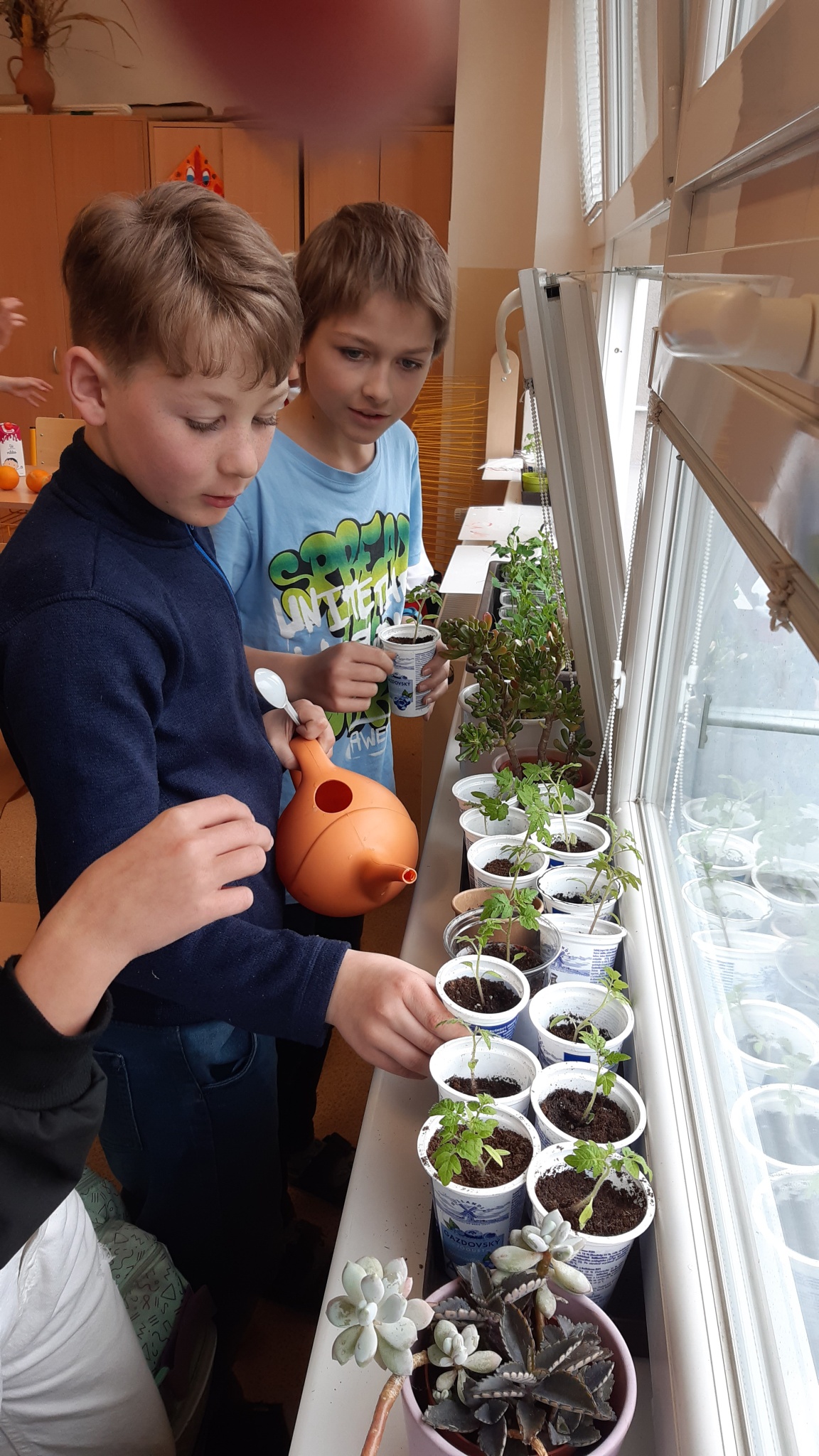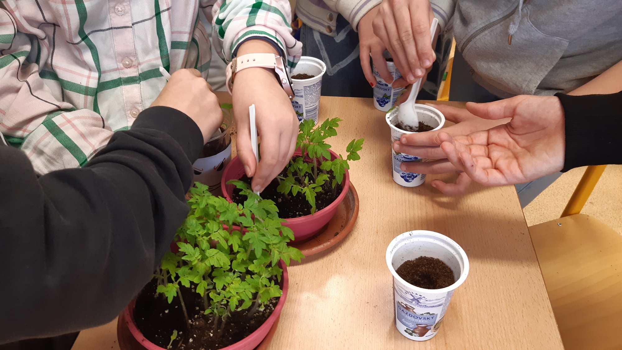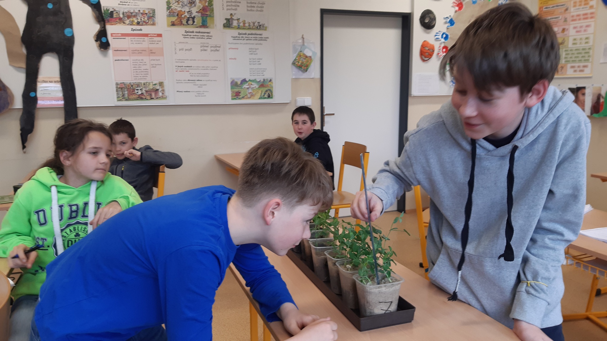 Další badatelskou činností bylo předpěstování sazenic rajčat. To se nám dařilo. V naší na jih orientované třídě rostly sazeničky jako ve skleníku. Děti si je samy vysely, sledovaly klíčivost, pikýrovaly sazeničky a dopěstovaly je až do fáze nakvétání. Po půlce května jsme si ukázali, jak rostlinky vysadit a pak si každý dvě sazenice odnesl domů. Přeji dětem, aby se jim pěstování i nadále dařilo a rostlinky jim odměnou přinesly chutné plody.