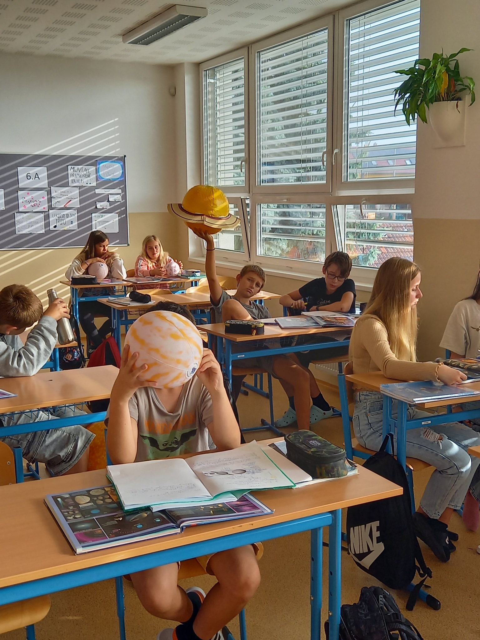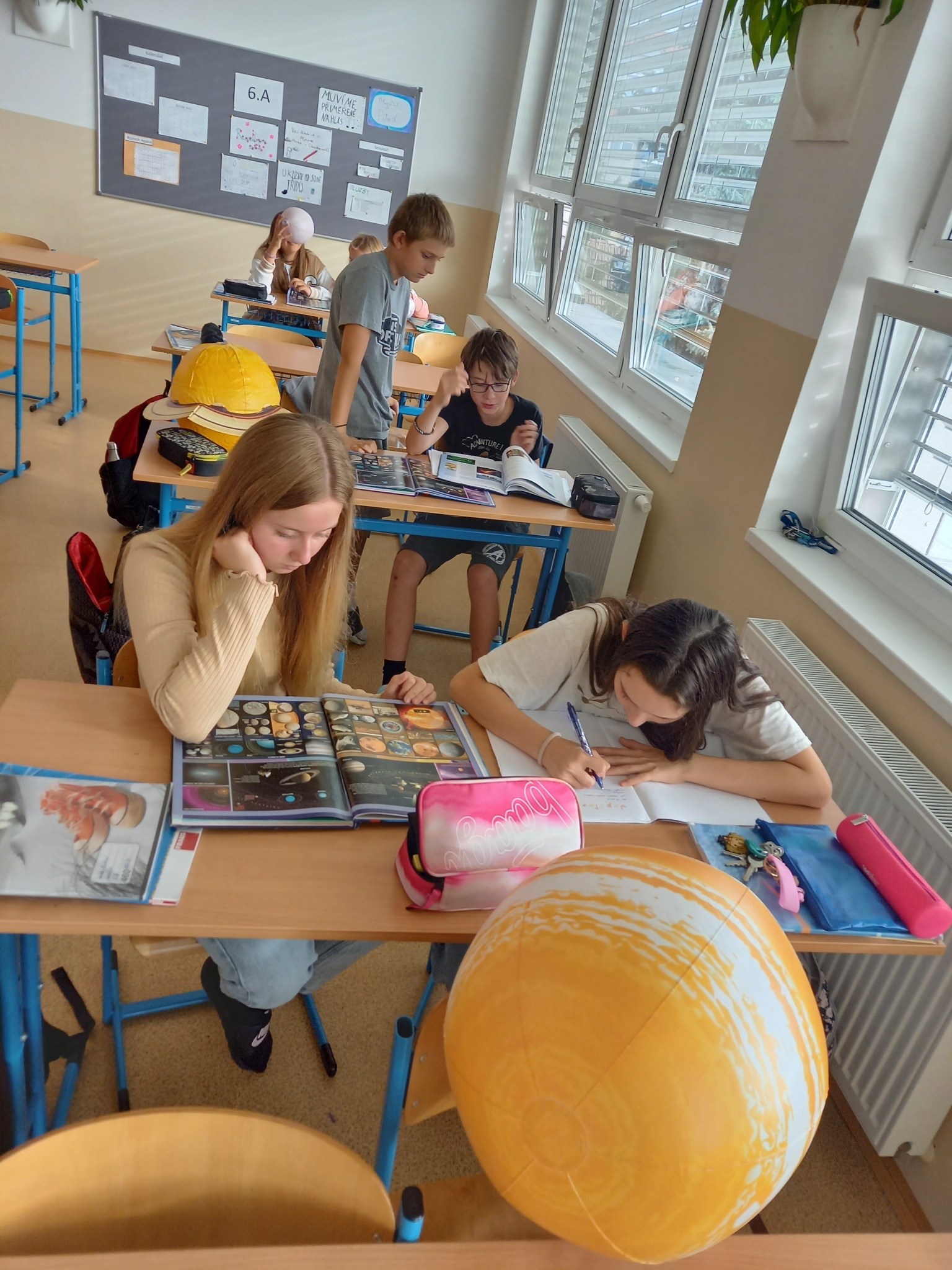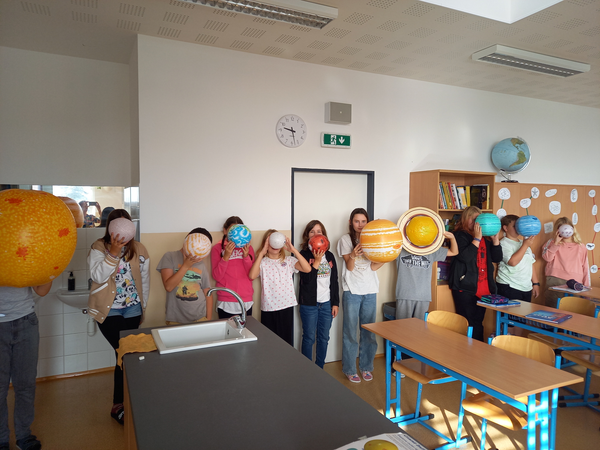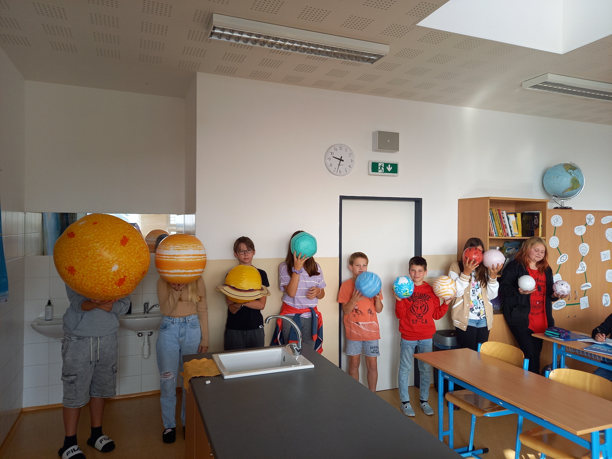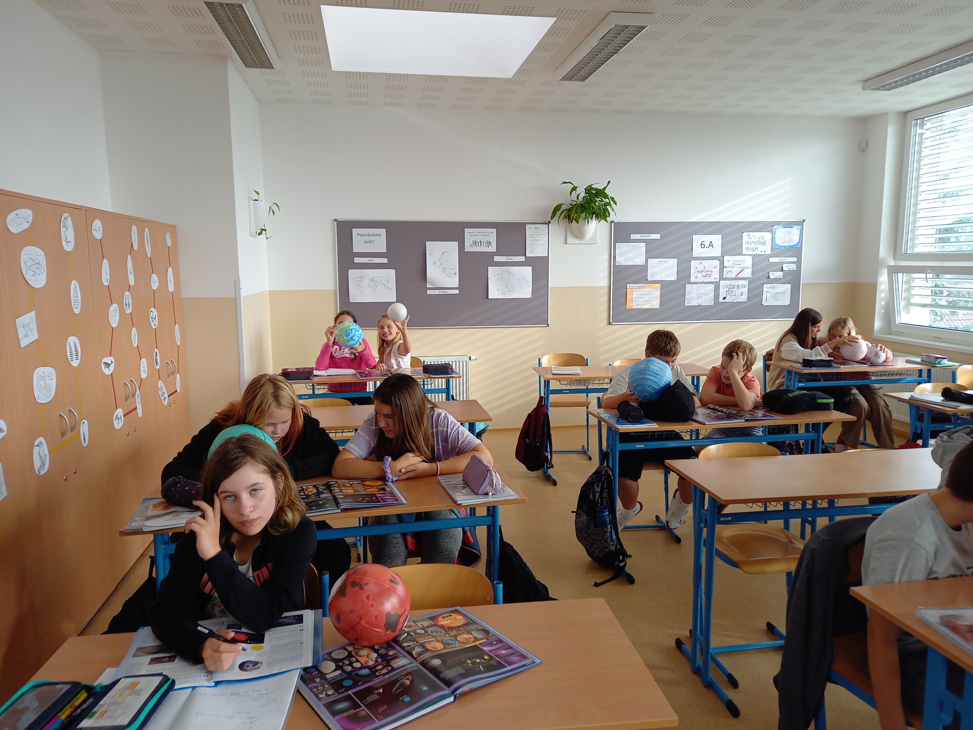 Jako každoročně jsme k opakování planet a jiných těles naší Sluneční soustavy v zeměpise využili nafukovací modely, a jako každoročně děti dobře fungovaly, objevovaly nové vlastnosti a bravurně je dokázaly seřadit dle postavení od Slunce. Nad seřazením podle velikosti musely déle přemýšlet, ale velikosti jsme vyhledali v atlase a i to se podařilo. Každá dvojice svůj objekt představila, všichni si rozšířili vědomosti a zopakovalo se před testem.
