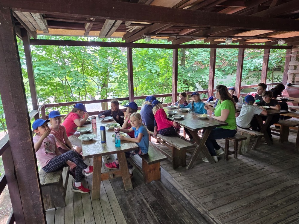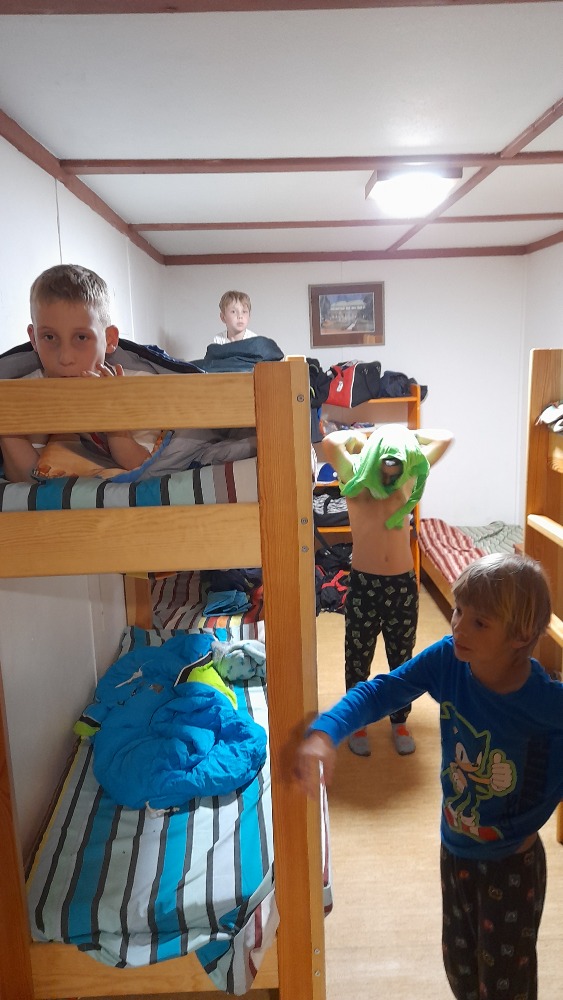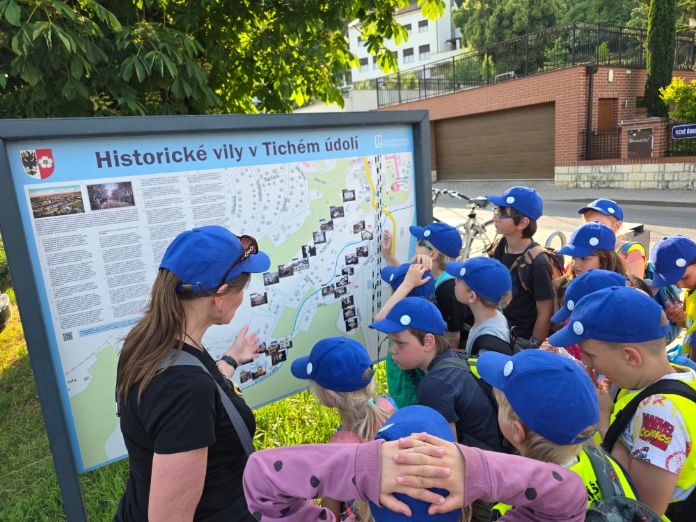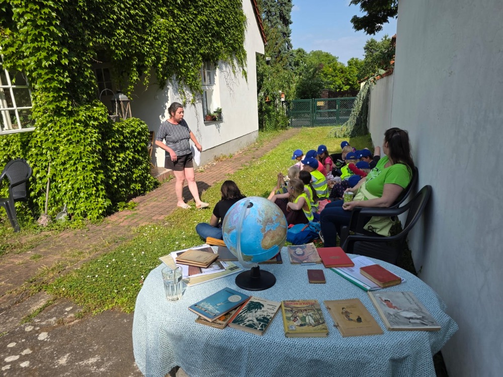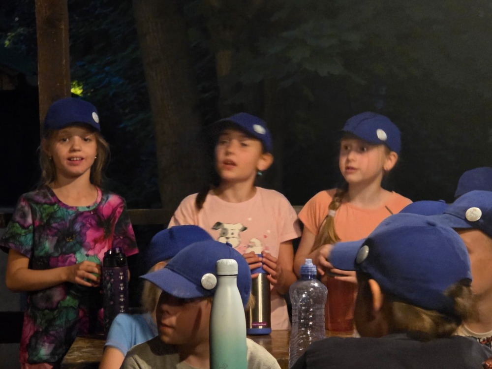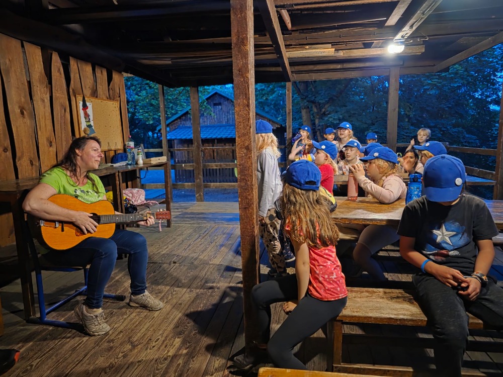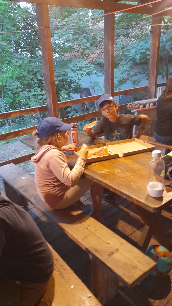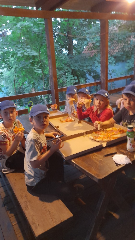 Přespávačku ve škole už jsme si vyzkoušeli, proto jsme zajeli prozkoumávat sousední Roztoky. Využili jsme skautskou osadu, která pro nás byla ideální. Nejen zážitek ze spaní ve srubu, ale i hřiště, příroda, dokonce i trochu hry na kytaru, to vše jsme stihli za dva dny. K tomu jsme se podívali do Tichého údolí, navštívili jsme dům, ve kterém žila spisovatelka Barbora Markéta Eliášová a nahlédli do pravěku na výstavě Archevita. Zahráli jsme si pár her, kterými jsme si opakovali látku, protože škola ještě nekončí. My jsme si ale trochu připadali, že už máme prázdniny. Bylo  to moc fajn.
