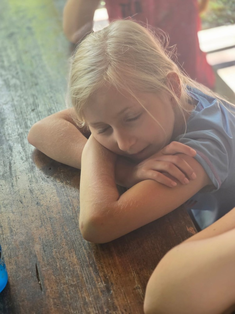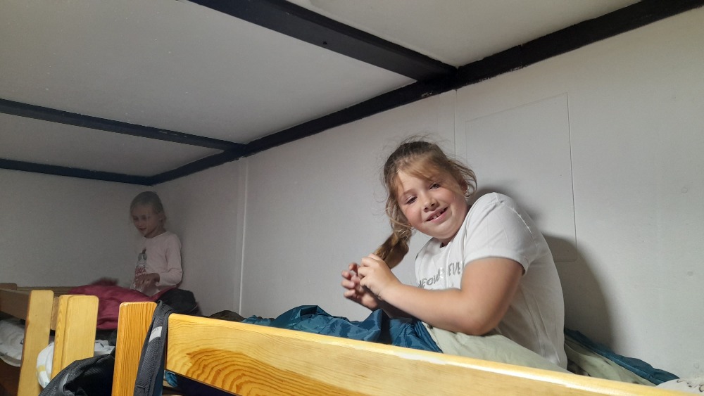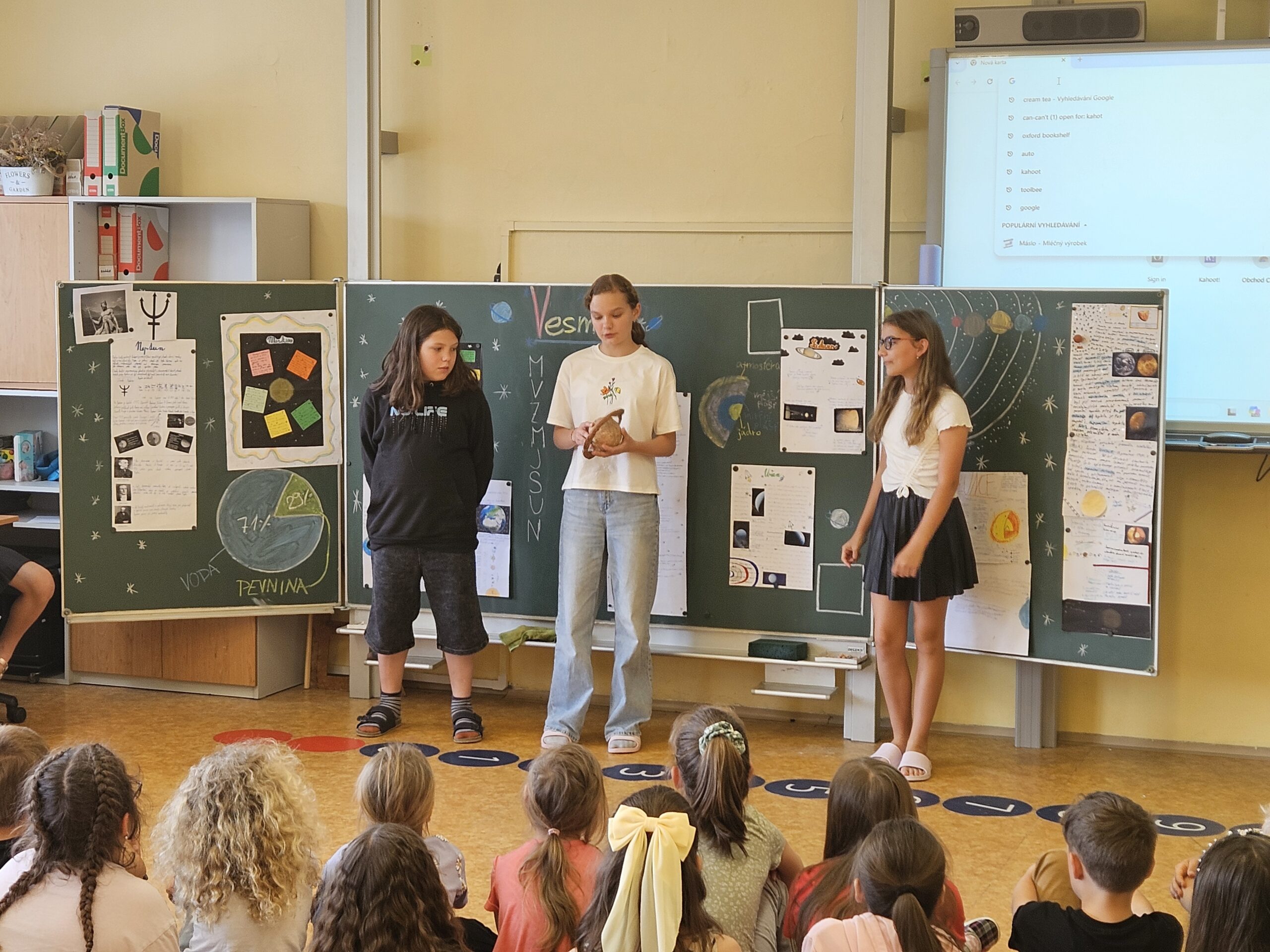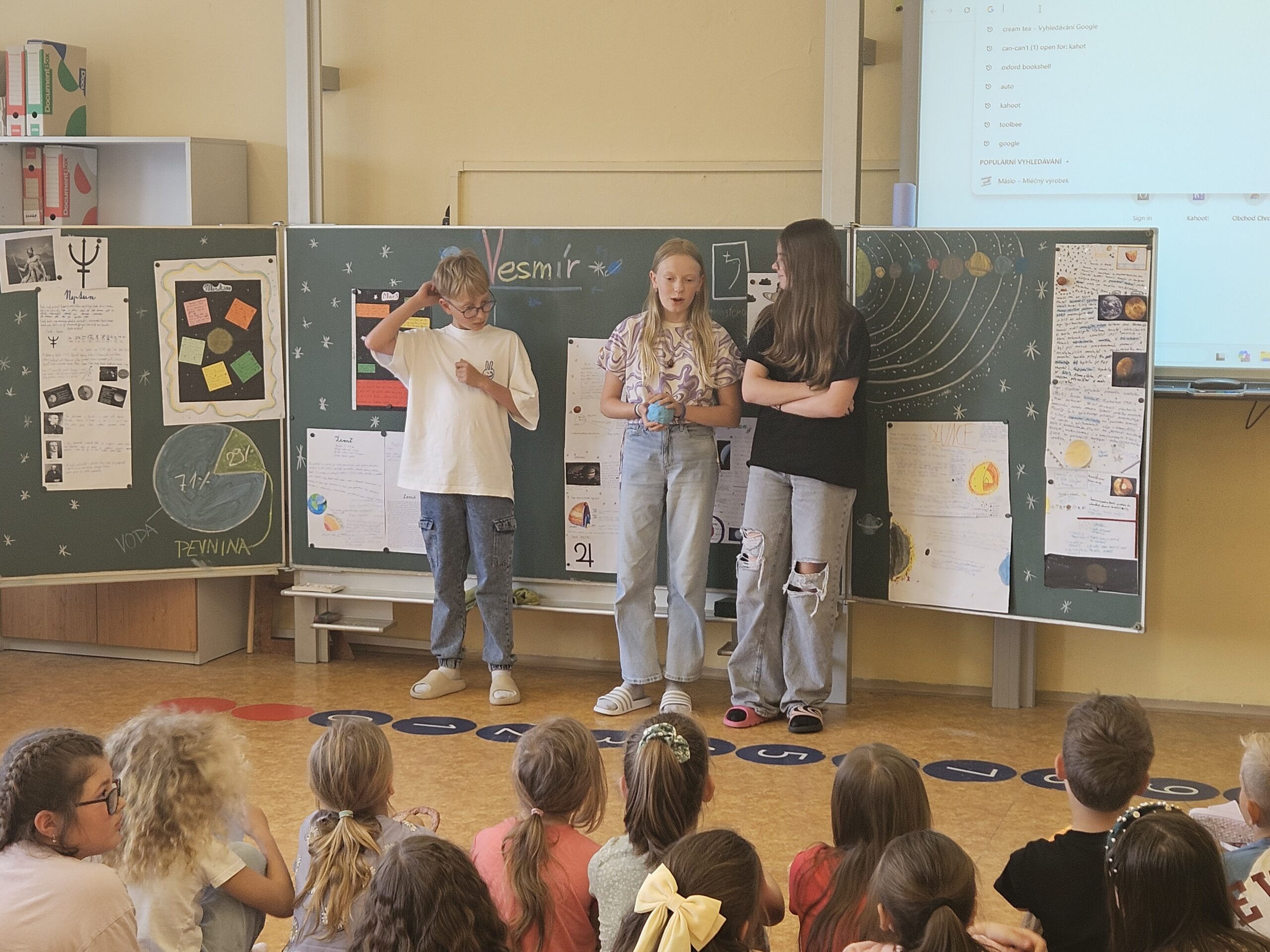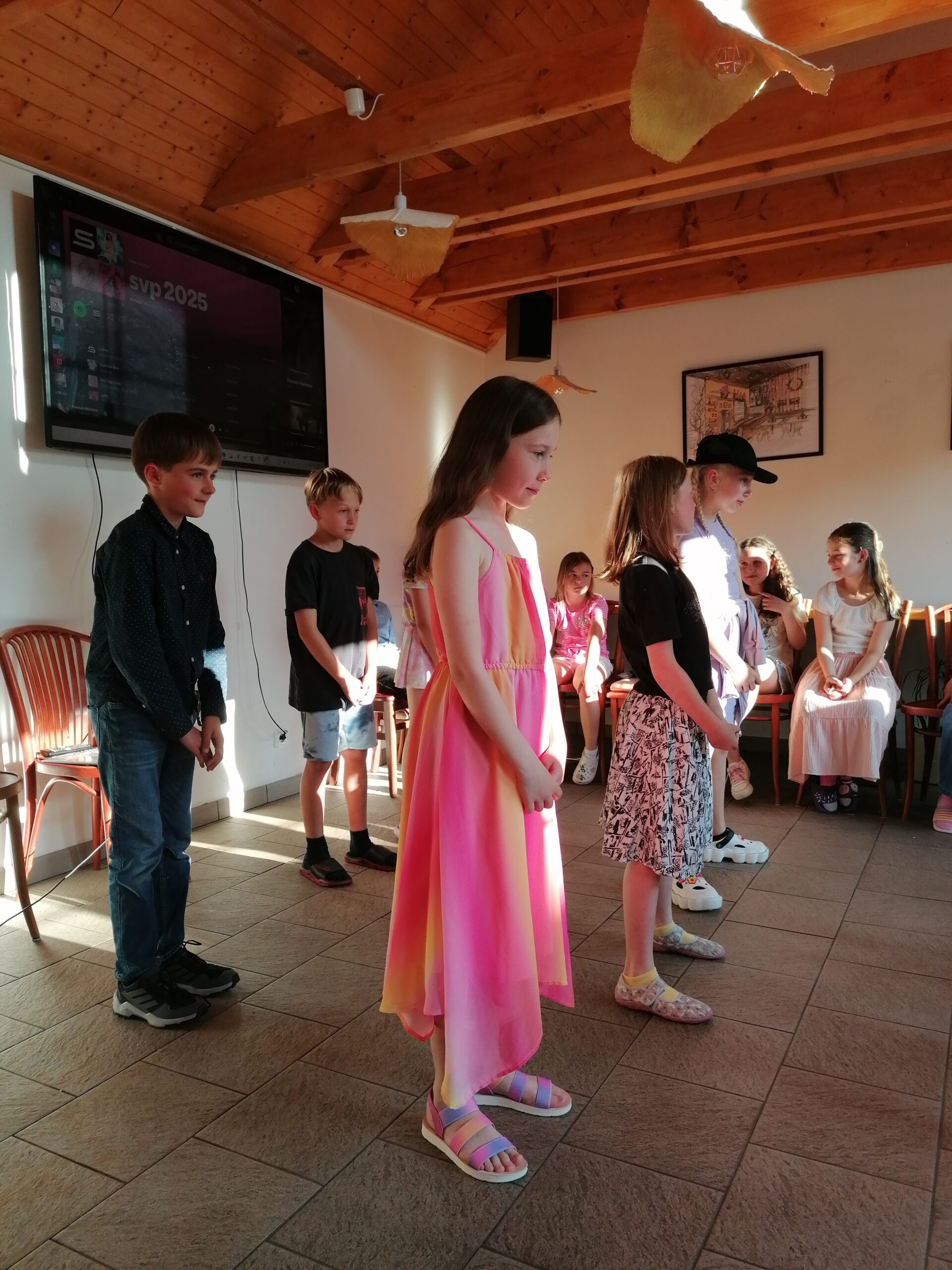 Přespávačku ve škole už jsme si vyzkoušeli, proto jsme zajeli prozkoumávat sousední Roztoky. Využili jsme skautskou osadu, která pro nás byla ideální. Nejen zážitek ze spaní ve srubu, ale i hřiště, příroda, dokonce i trochu hry na kytaru, to vše jsme stihli za dva dny. K tomu jsme se podívali do Tichého údolí, navštívili jsme dům, ve kterém žila spisovatelka Barbora Markéta Eliášová a nahlédli do pravěku na výstavě Archevita. Zahráli jsme si pár her, kterými jsme si opakovali látku, protože škola ještě nekončí. My jsme si ale trochu připadali, že už máme prázdniny. Bylo  to moc fajn.