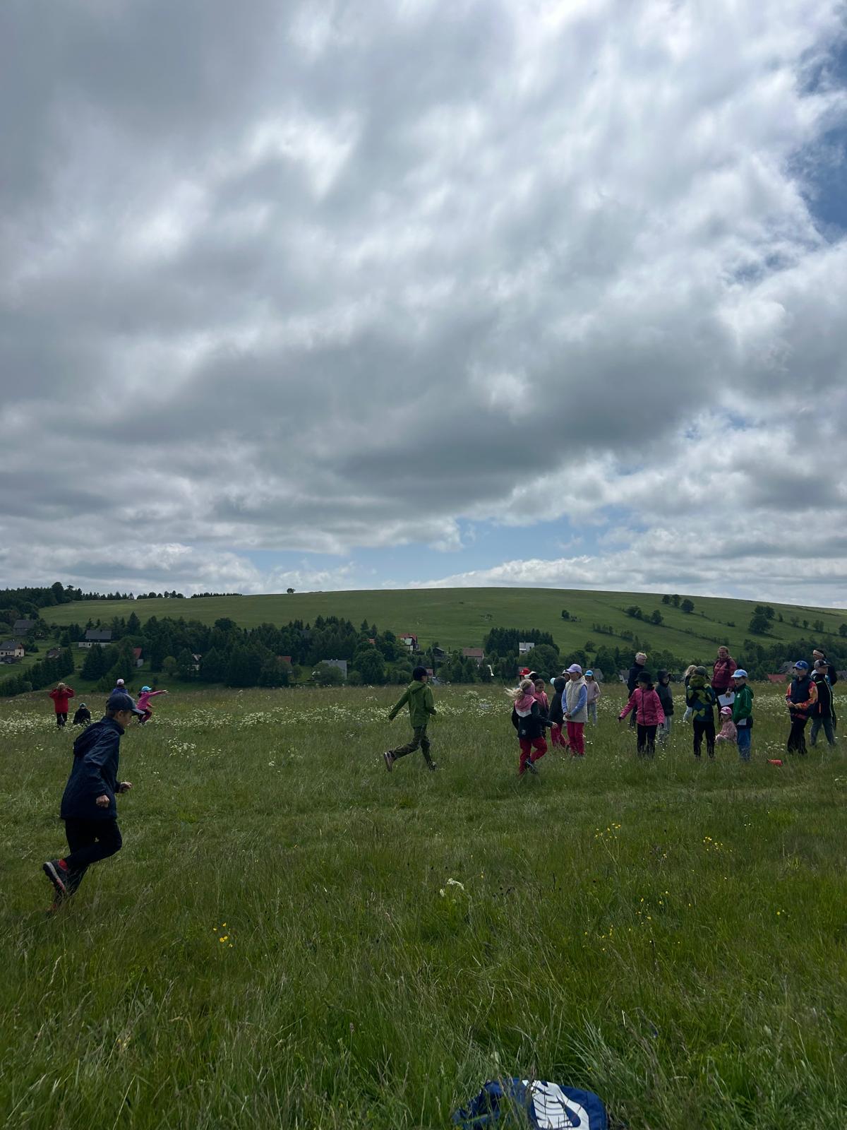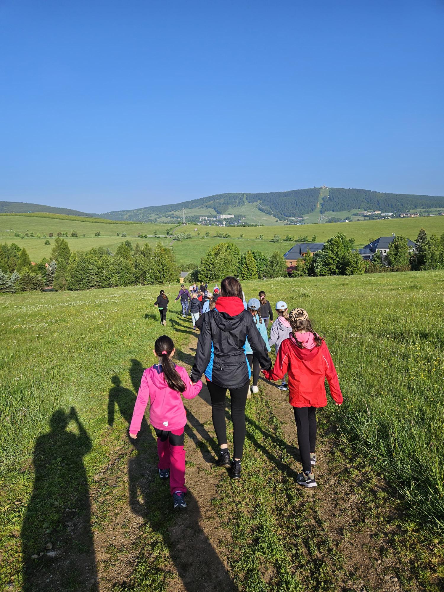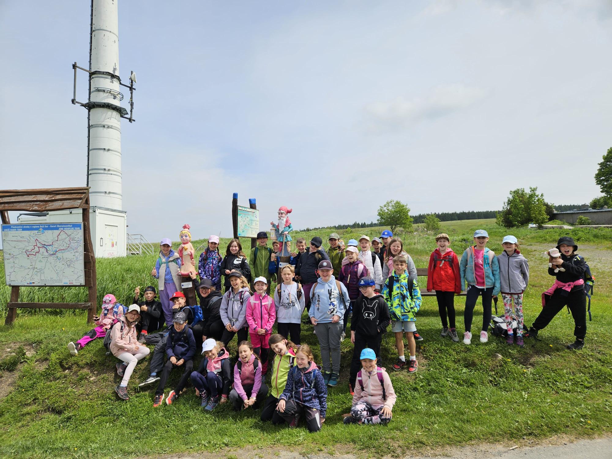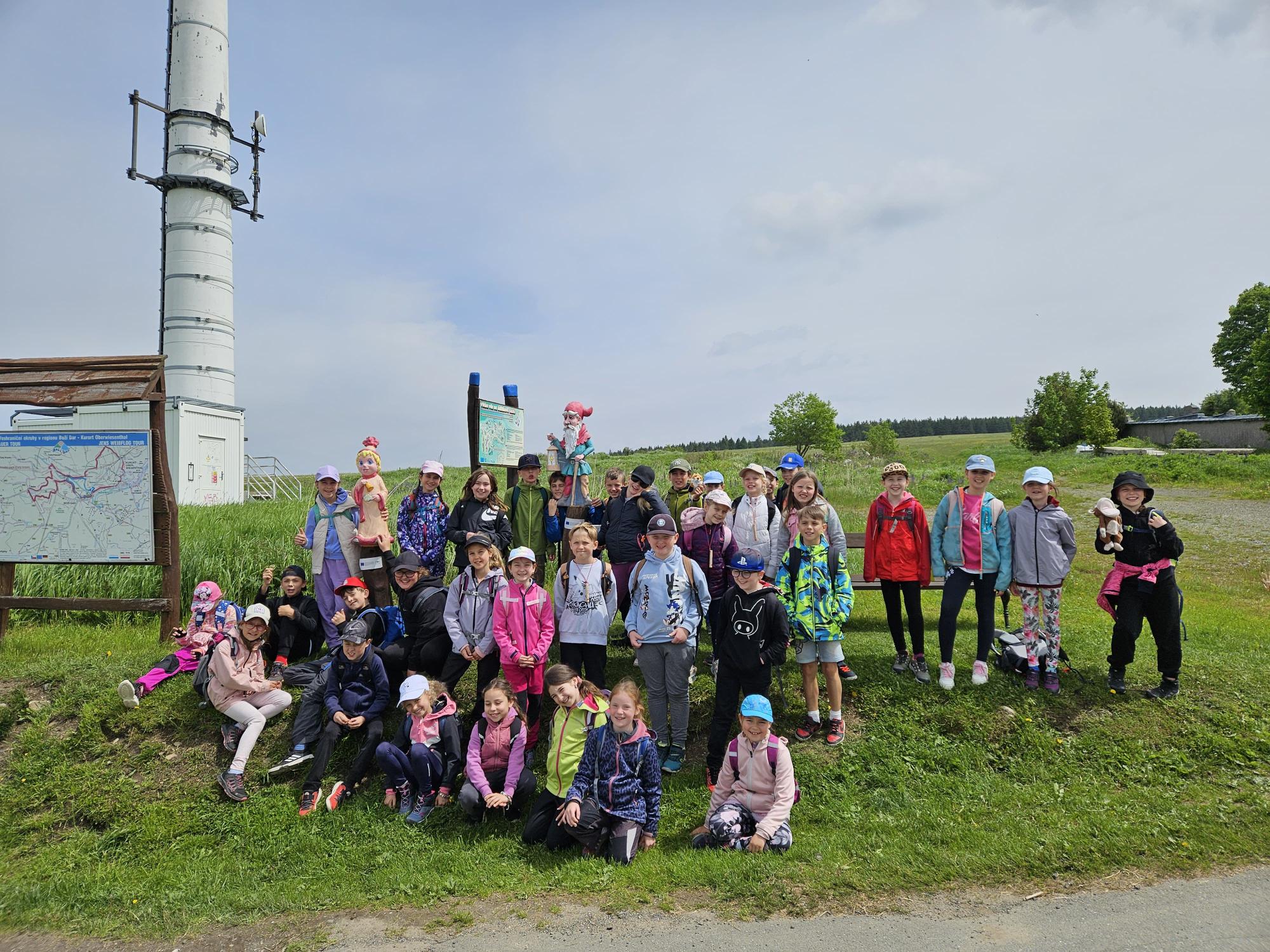 Třeťáci vyrazili na školu v přírodě do Krušných hor. Cesta proběhla v pořádku. Ubytovali jsme se, dosyta najedli svíčkové a šli obhlédnout okolí. Na louce jsme si zahráli seznamovací hru a zasoutěžili ve dvojicích. Cestou jsme si povídali a poznávali zdejší květenu. Potom jsme si vyrobili trička a zapsali zážitky z dnešního dne do deníků. Po večeři jsme se ještě prošli a teď už ležíme v postýlkách. Zítra nás totiž čeká celodenní výlet na Boží Dar.