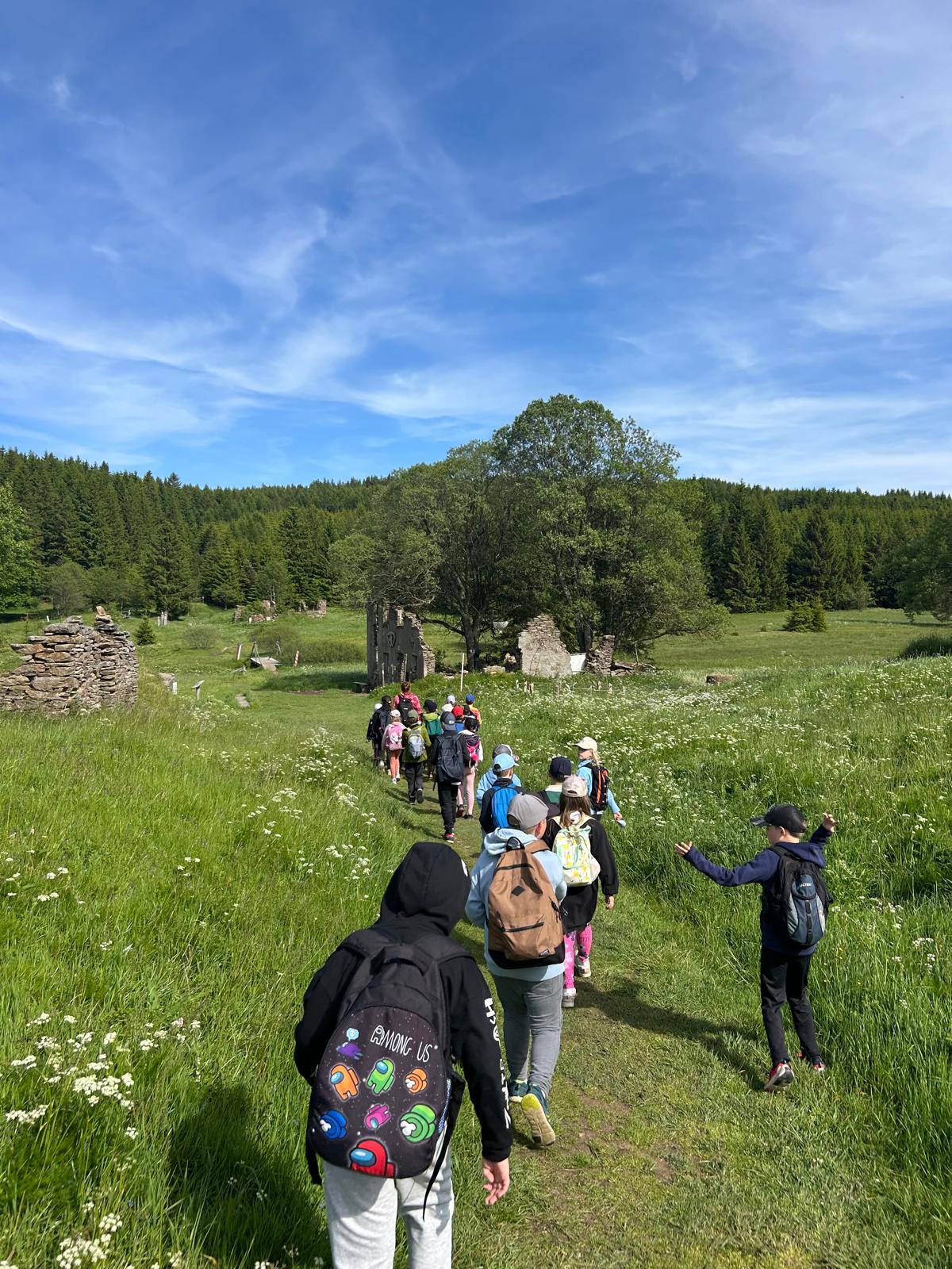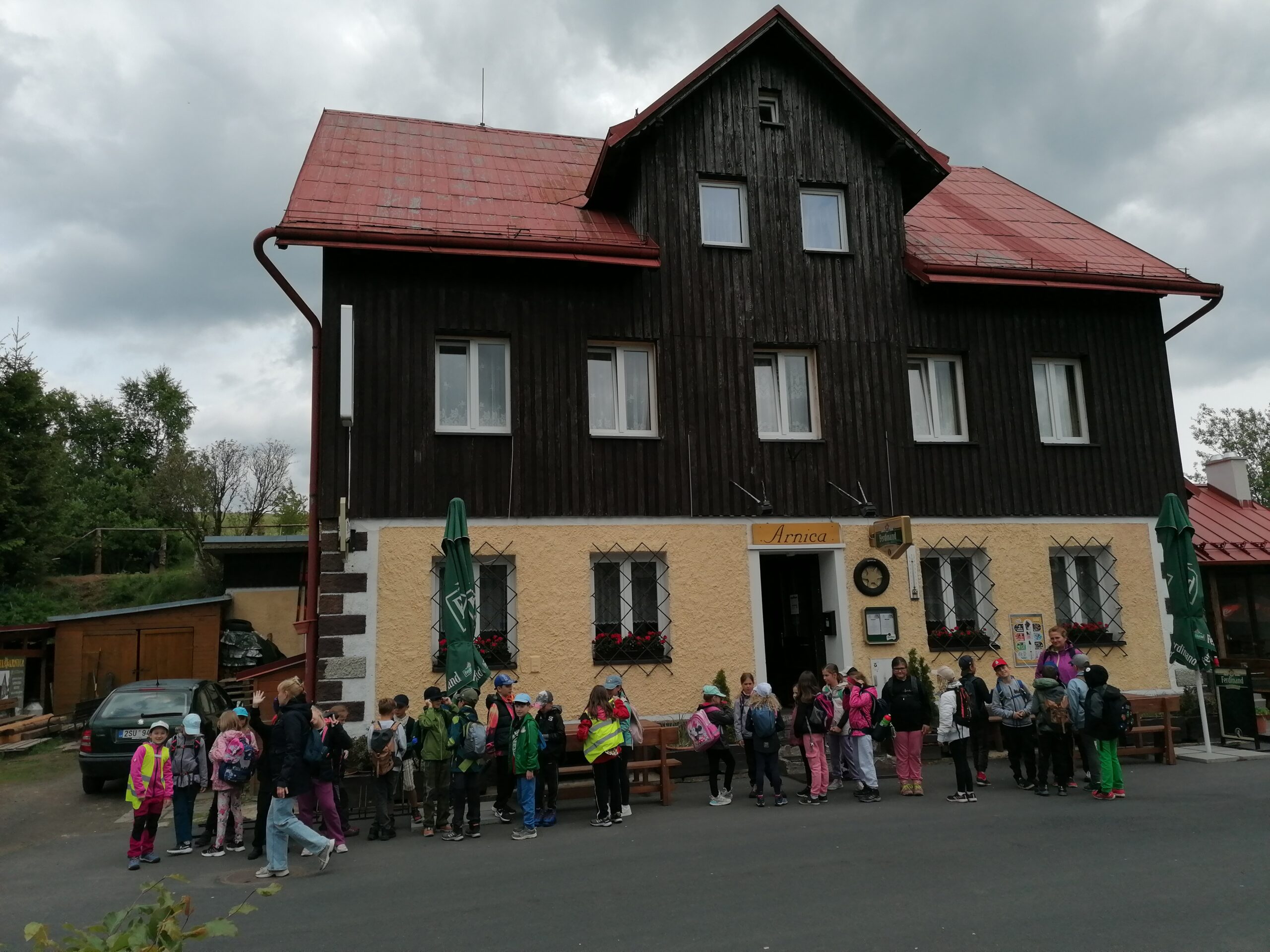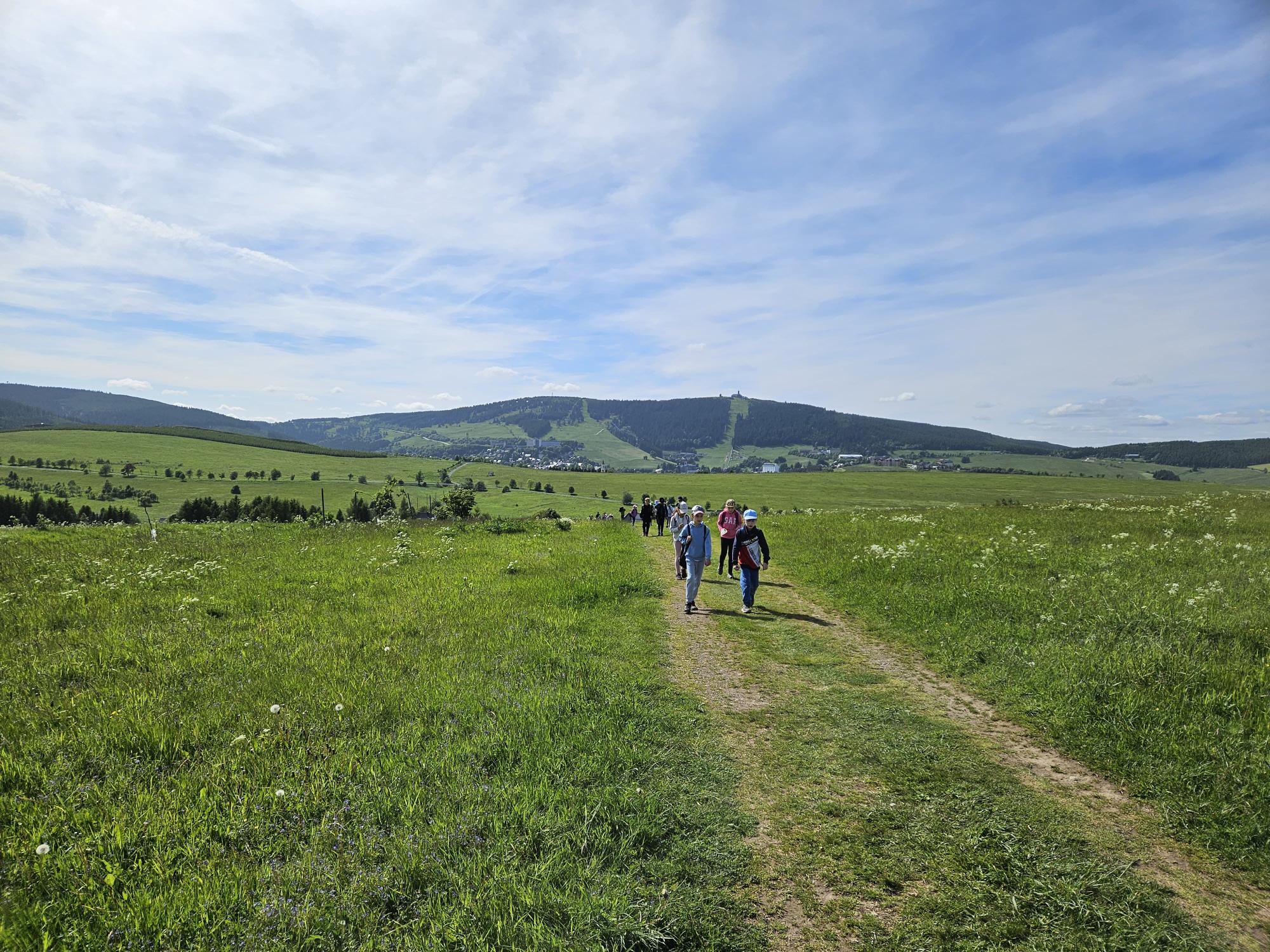 Třeťáci vyrazili na školu v přírodě do Krušných hor. Cesta proběhla v pořádku. Ubytovali jsme se, dosyta najedli svíčkové a šli obhlédnout okolí. Na louce jsme si zahráli seznamovací hru a zasoutěžili ve dvojicích. Cestou jsme si povídali a poznávali zdejší květenu. Potom jsme si vyrobili trička a zapsali zážitky z dnešního dne do deníků. Po večeři jsme se ještě prošli a teď už ležíme v postýlkách. Zítra nás totiž čeká celodenní výlet na Boží Dar.