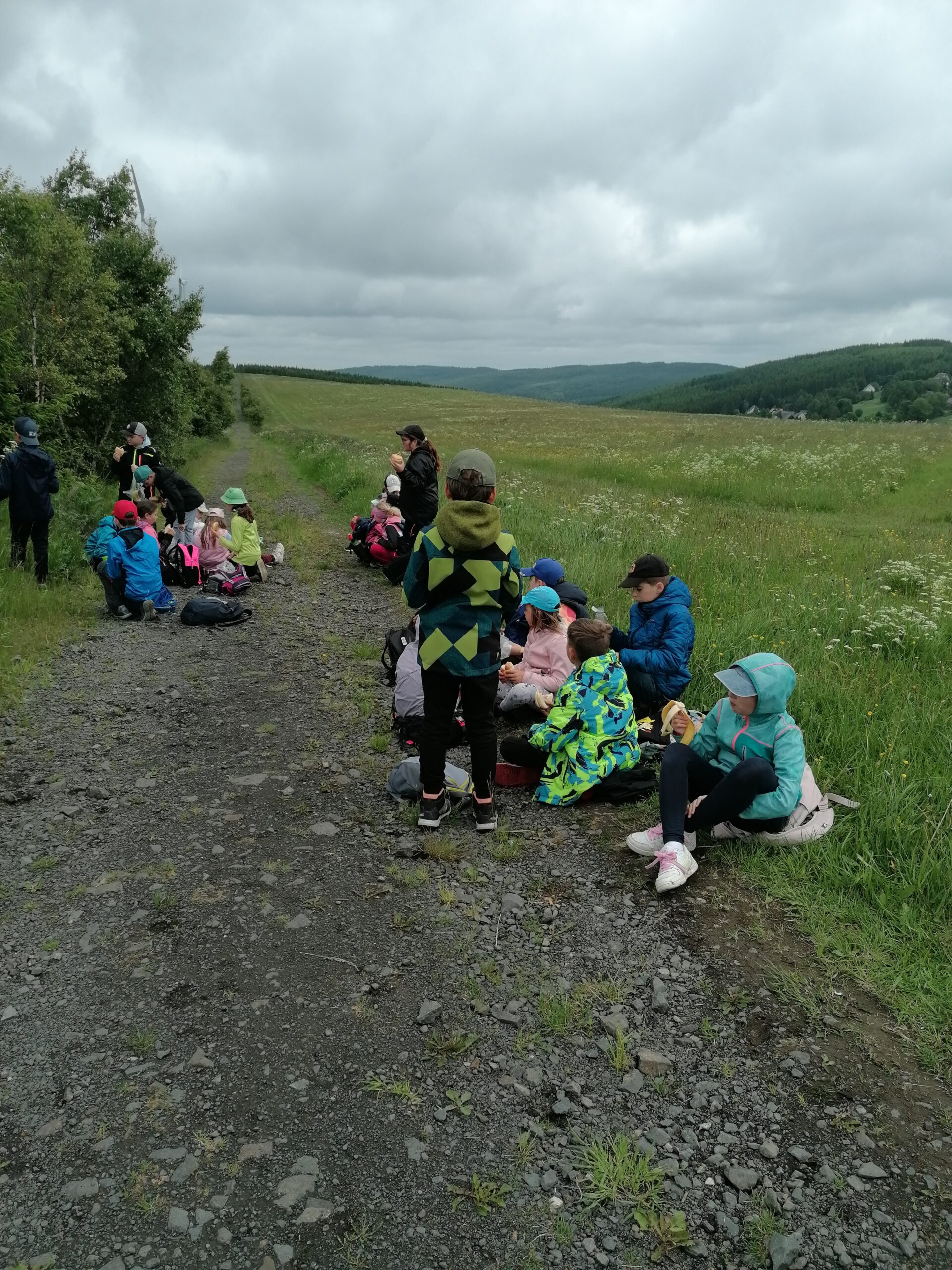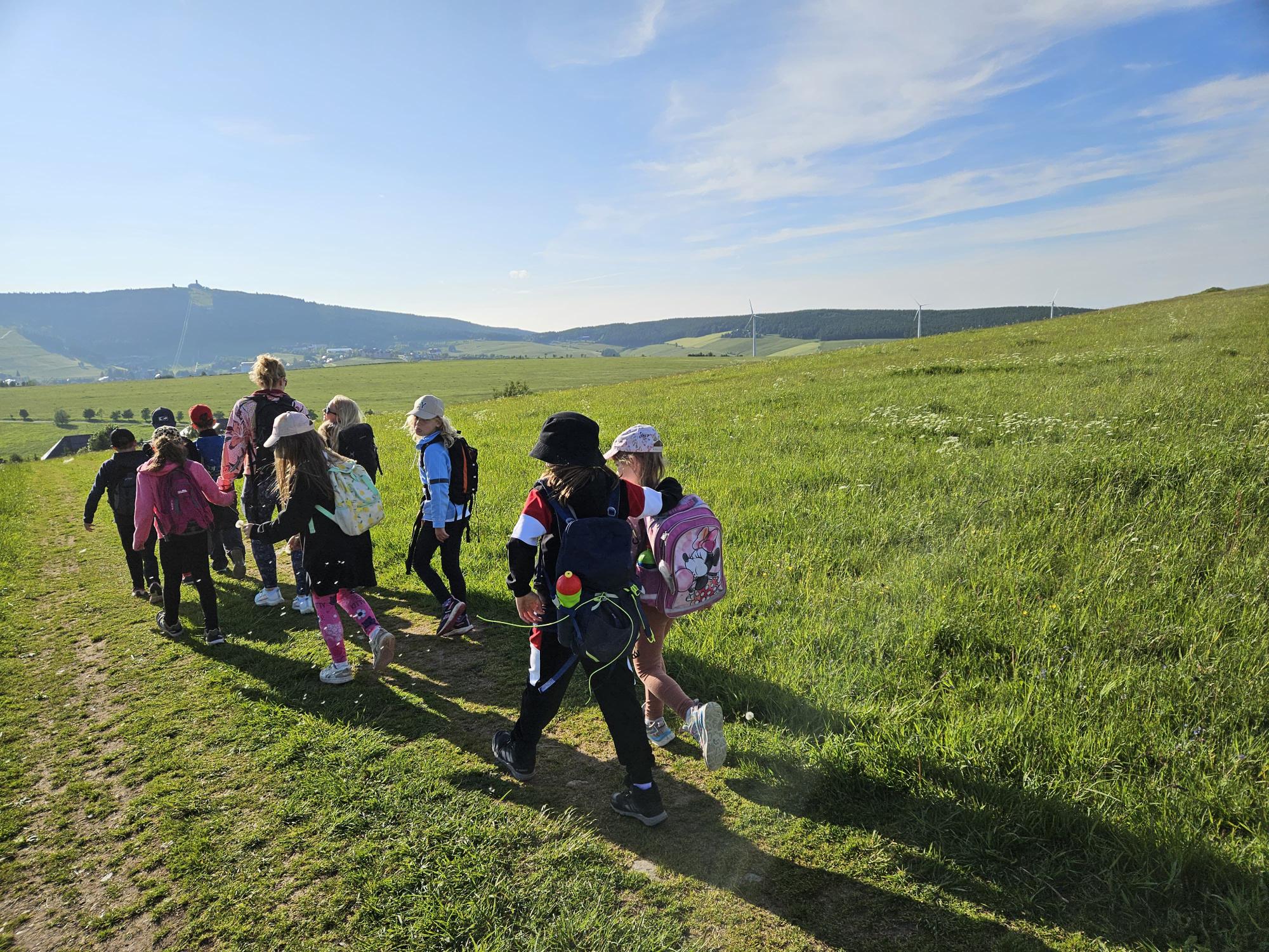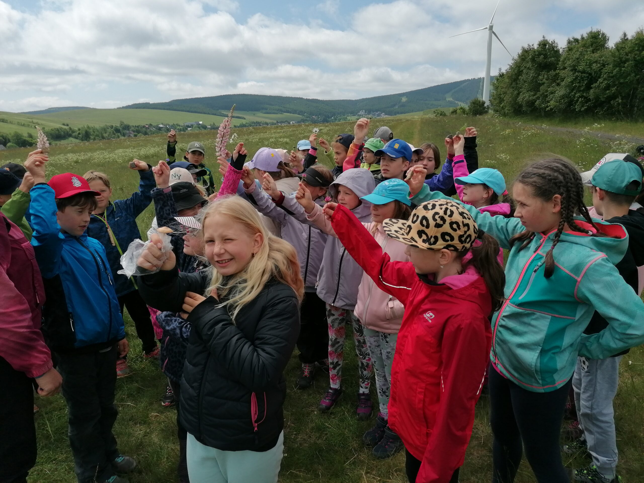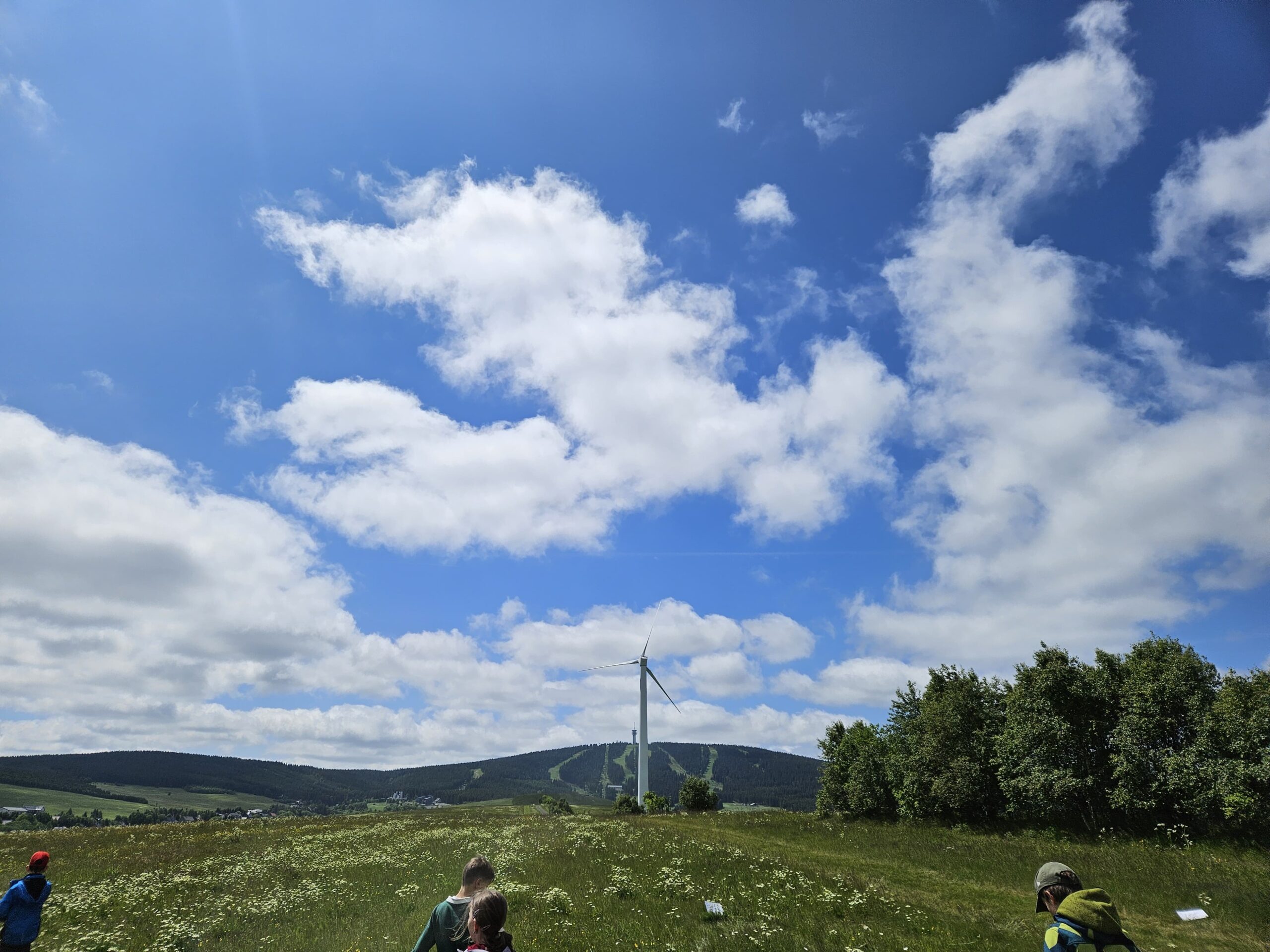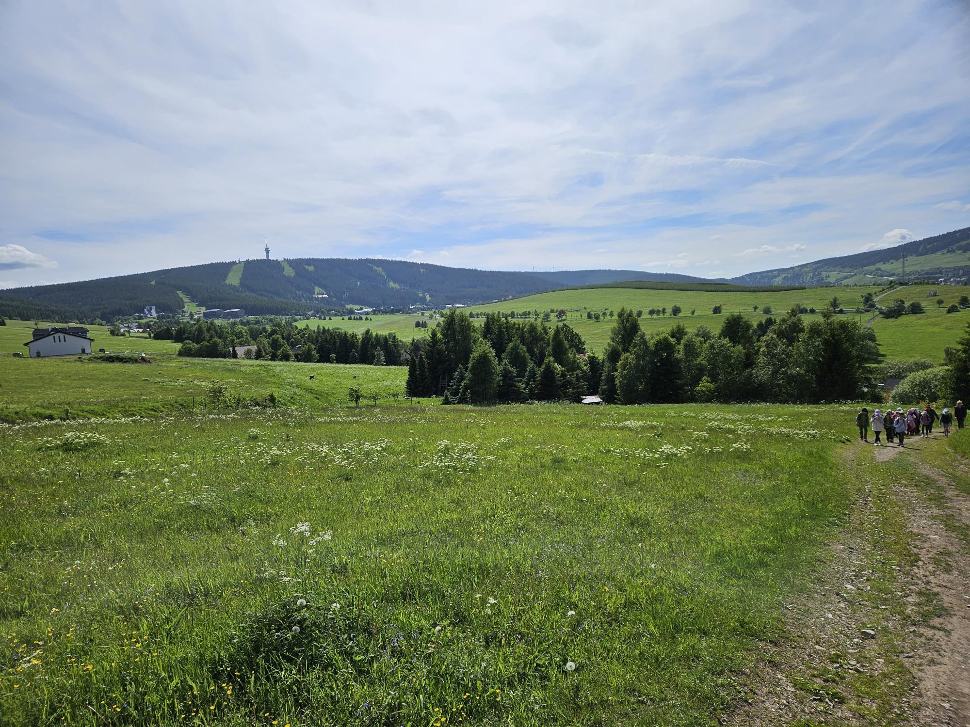 Zdravíme Vás všechny z krásného prostředí Krušných hor. Všichni jsme v pořádku a spokojení. Dnešní den jsme měli tedy přeplněný zážitky. Ráno jsme se učili, protože jsme čekali, až ofouknou zdejší louky, v noci totiž spadlo pár kapek a my jsme se chystali po nich běhat. Ještě dopoledne jsme ale vyrazili k třem větrným elektrárnám, které se jmenují Kašpar, Baltazar a Melichar. Cestou jsme tipovali obvod sloupu jedné větrné elektrárny. Děti ho potom změřili pomocí rozpažených rukou. Celkem bylo potřeba 12 dětí, což bylo pro děti překvapení. Zahráli jsme si hru limeriky a potom jsme už spěchali na dobrý řízek s bramborovou kaší. Po odpoledním klidu nás čekal další výlet. Tentokrát jsme se vydali do zaniklé osady Königsmühle. Byl to krásný výlet a skoro tajemný :-). V lese u osady jsme postavili domečky pro zvířátka a vrátili se na večeři. Počasí nám dnes přálo a výlety se nám moc vydařily.