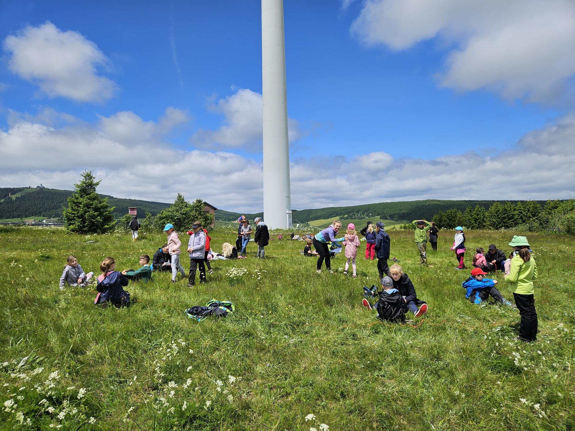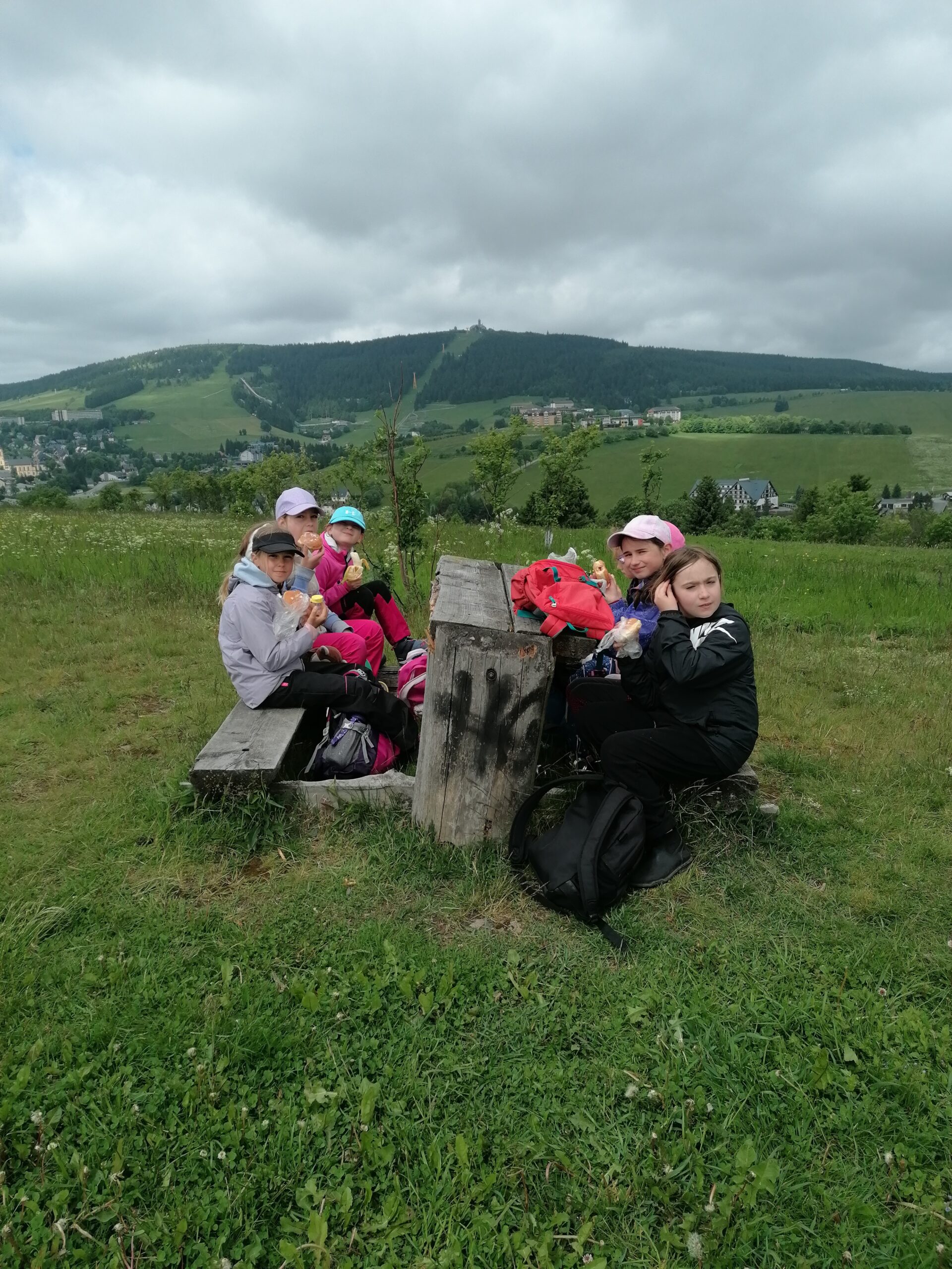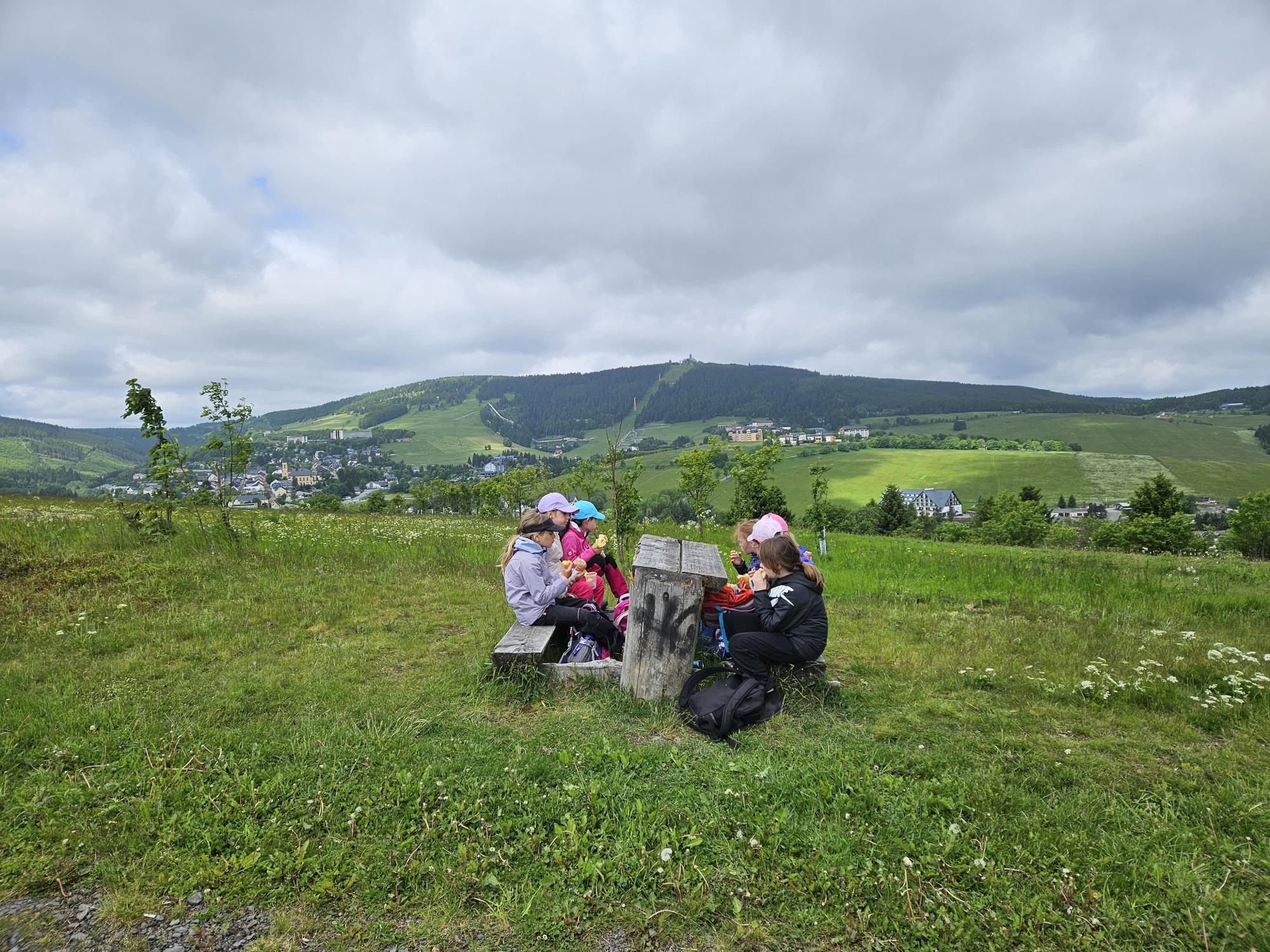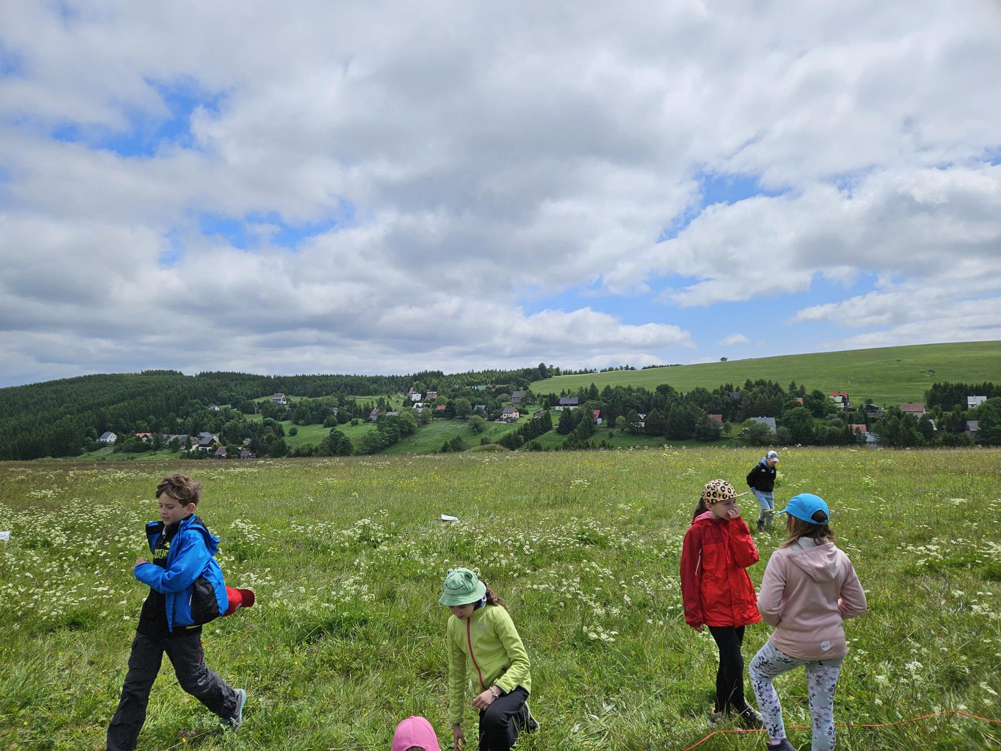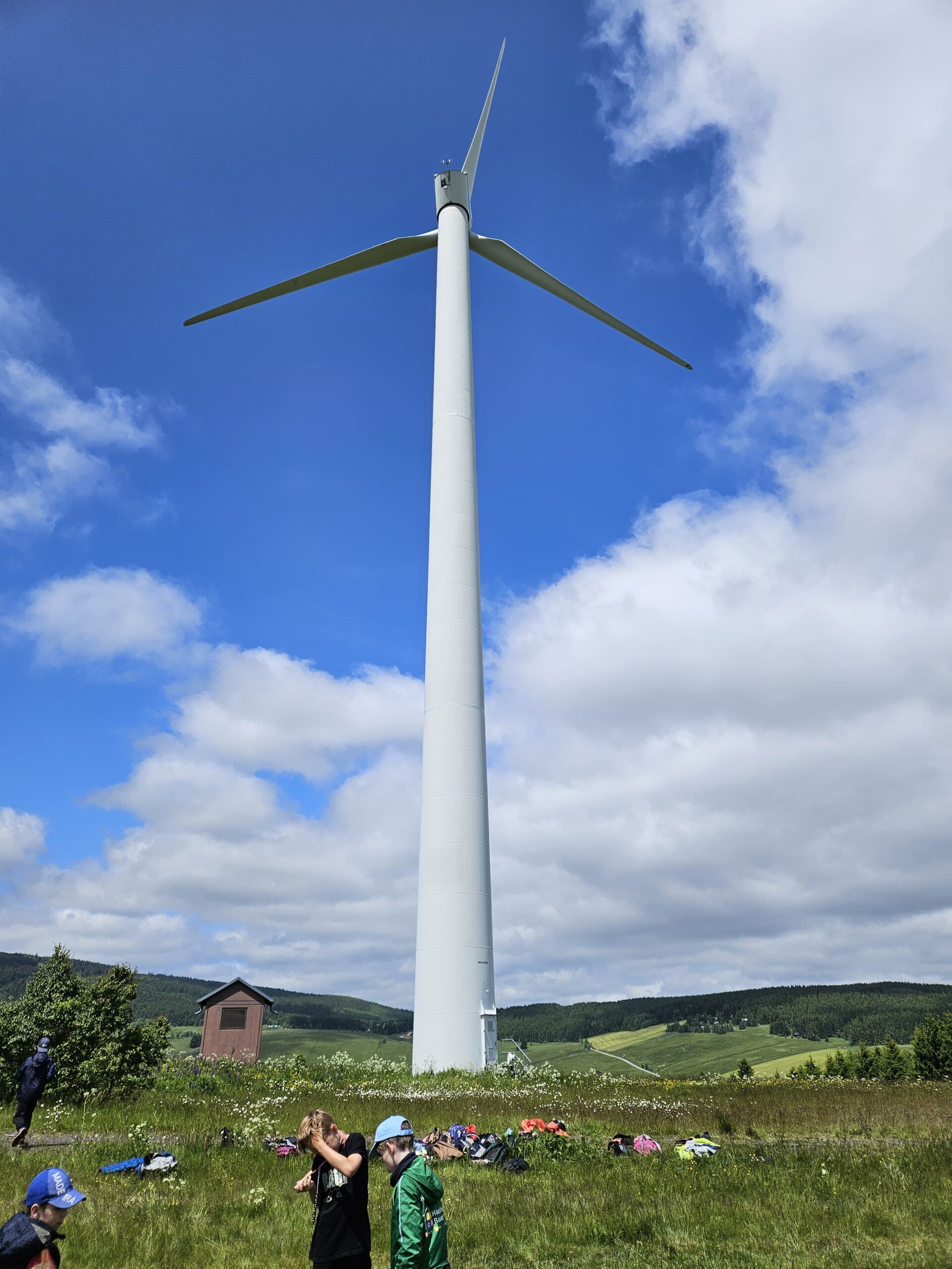Zdravíme Vás všechny z krásného prostředí Krušných hor. Všichni jsme v pořádku a spokojení. Dnešní den jsme měli tedy přeplněný zážitky. Ráno jsme se učili, protože jsme čekali, až ofouknou zdejší louky, v noci totiž spadlo pár kapek a my jsme se chystali po nich běhat. Ještě dopoledne jsme ale vyrazili k třem větrným elektrárnám, které se jmenují Kašpar, Baltazar a Melichar. Cestou jsme tipovali obvod sloupu jedné větrné elektrárny. Děti ho potom změřili pomocí rozpažených rukou. Celkem bylo potřeba 12 dětí, což bylo pro děti překvapení. Zahráli jsme si hru limeriky a potom jsme už spěchali na dobrý řízek s bramborovou kaší. Po odpoledním klidu nás čekal další výlet. Tentokrát jsme se vydali do zaniklé osady Königsmühle. Byl to krásný výlet a skoro tajemný :-). V lese u osady jsme postavili domečky pro zvířátka a vrátili se na večeři. Počasí nám dnes přálo a výlety se nám moc vydařily.