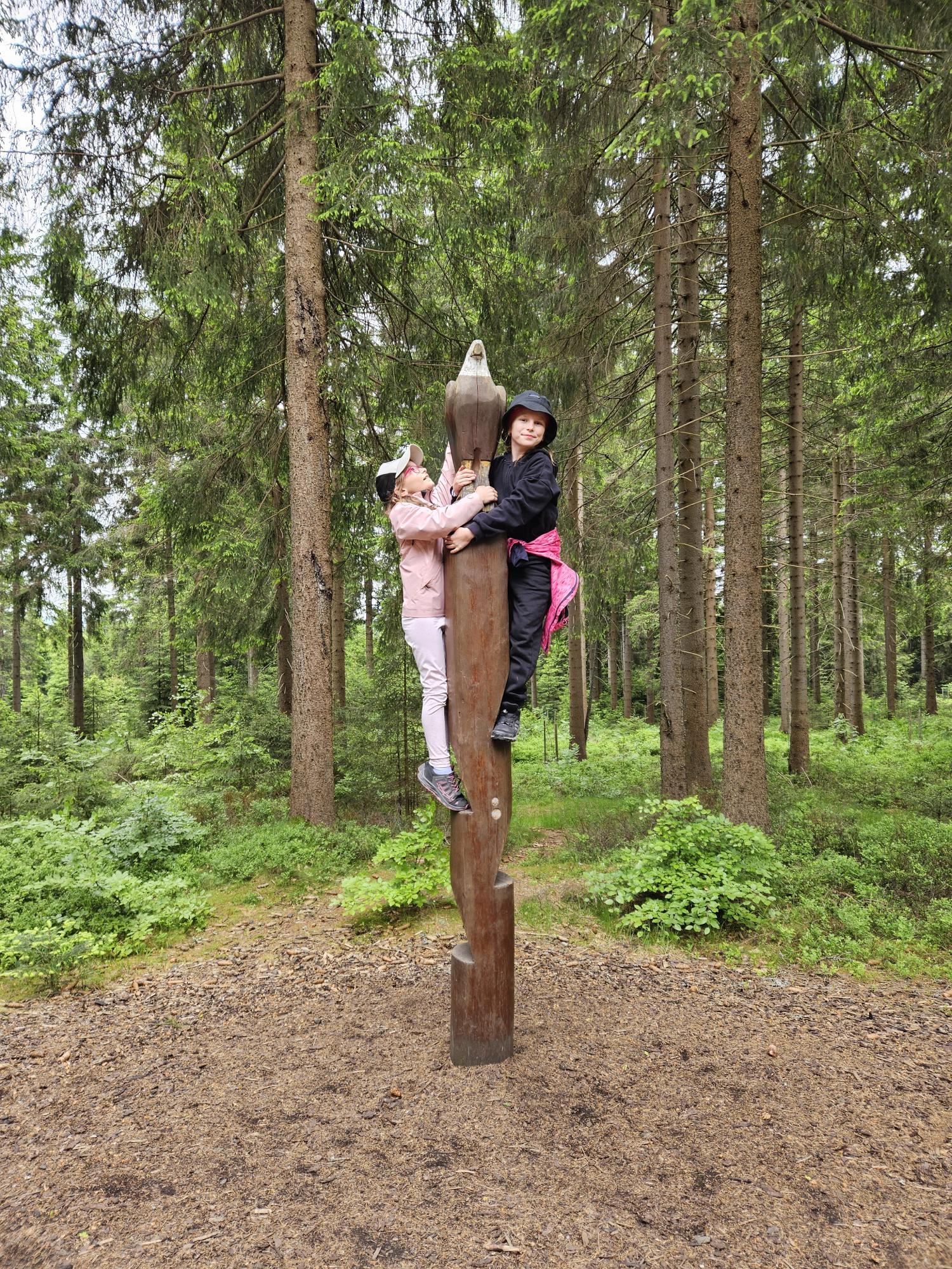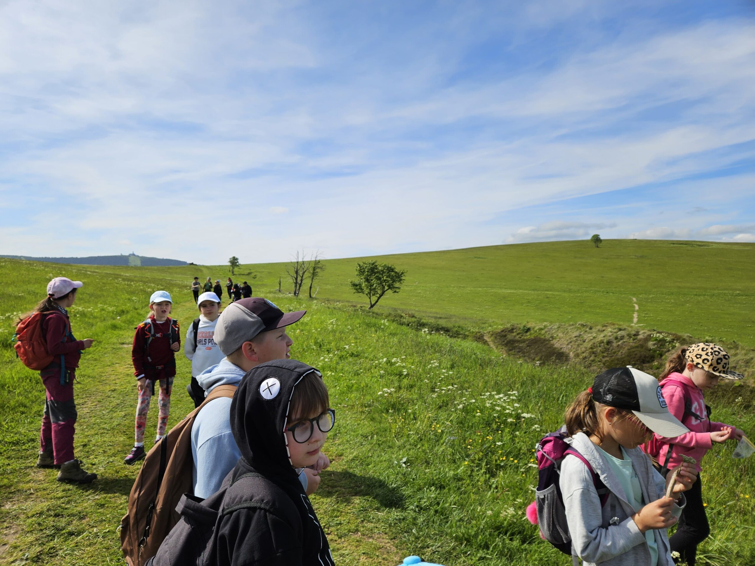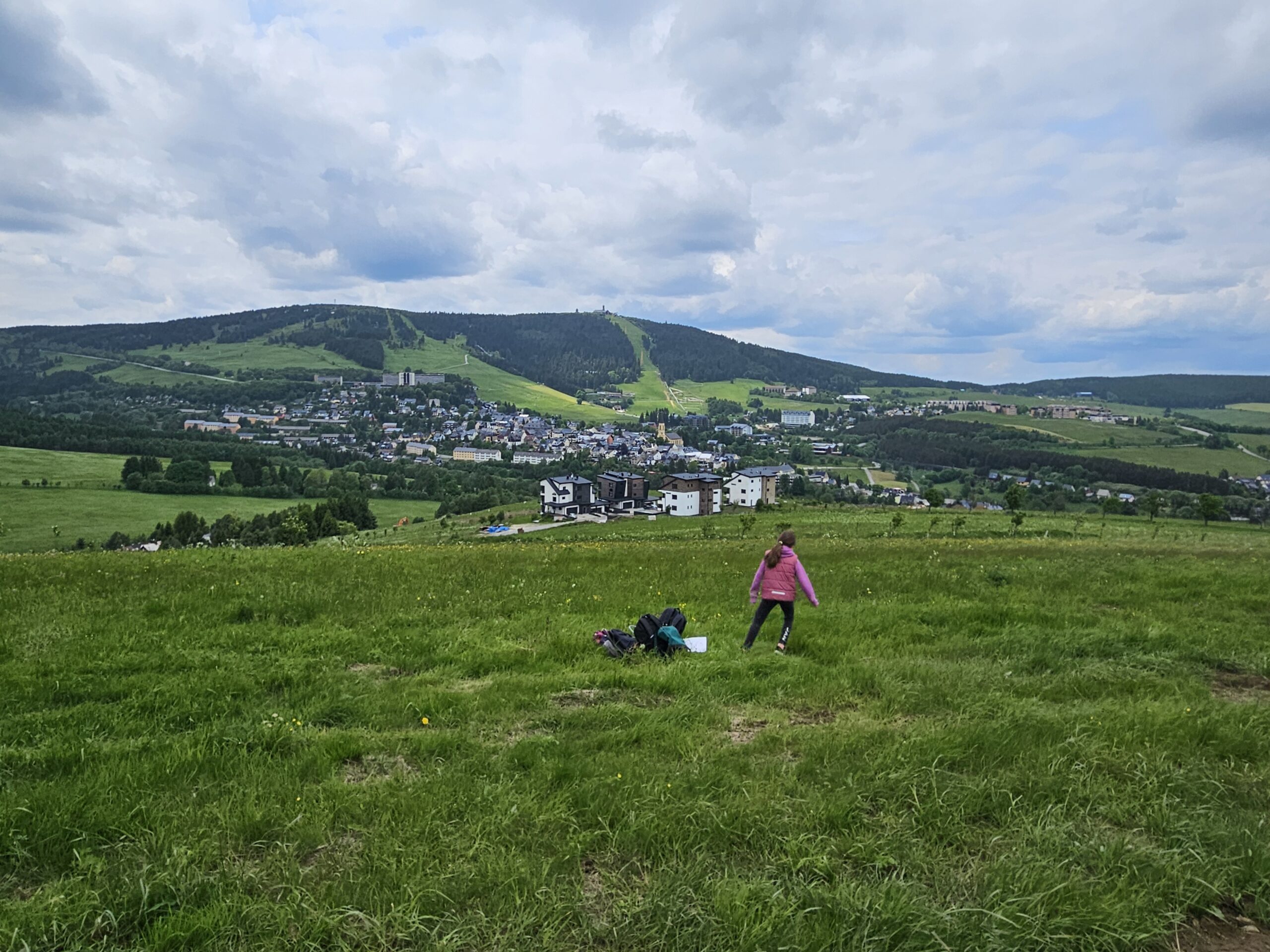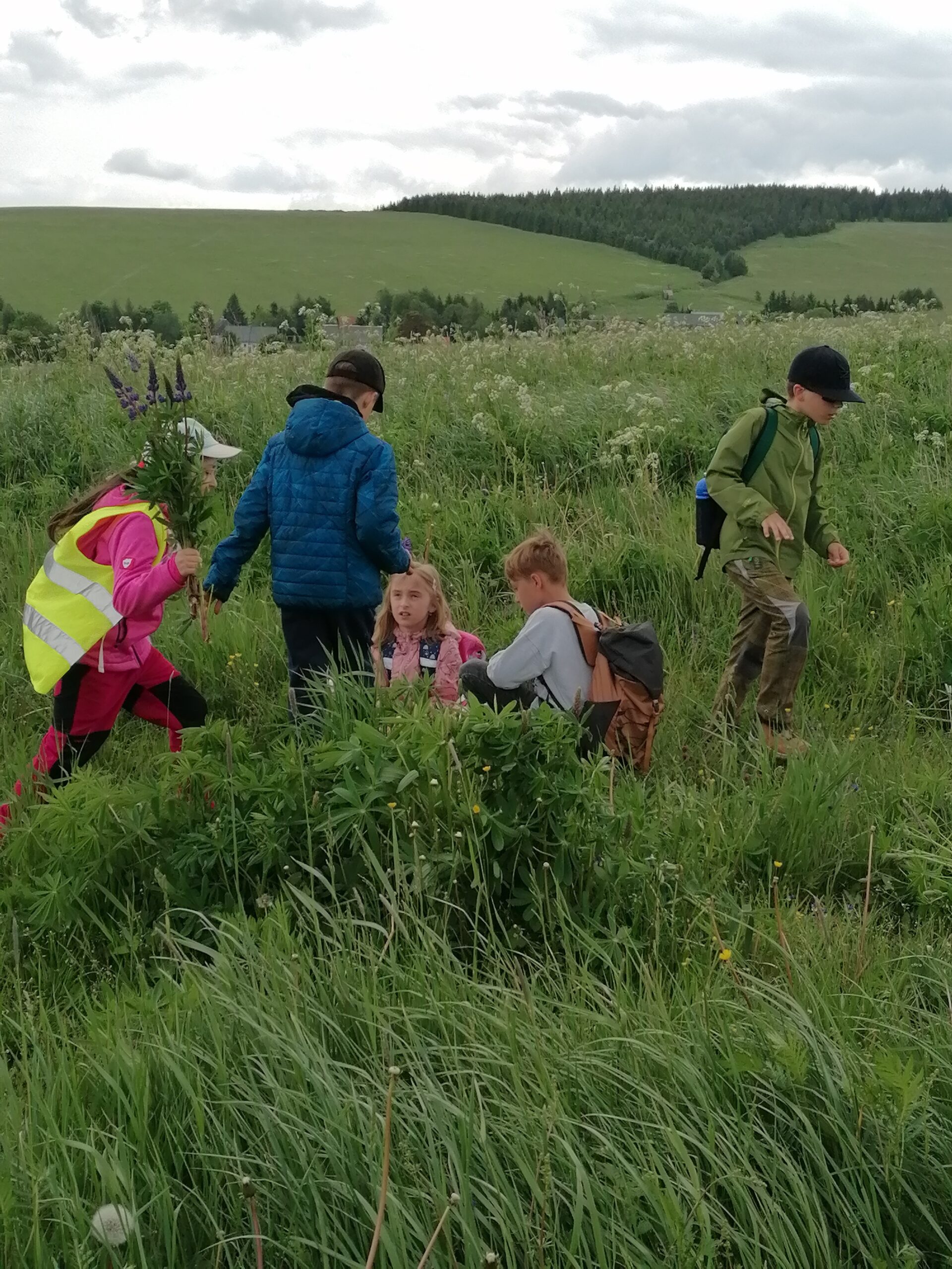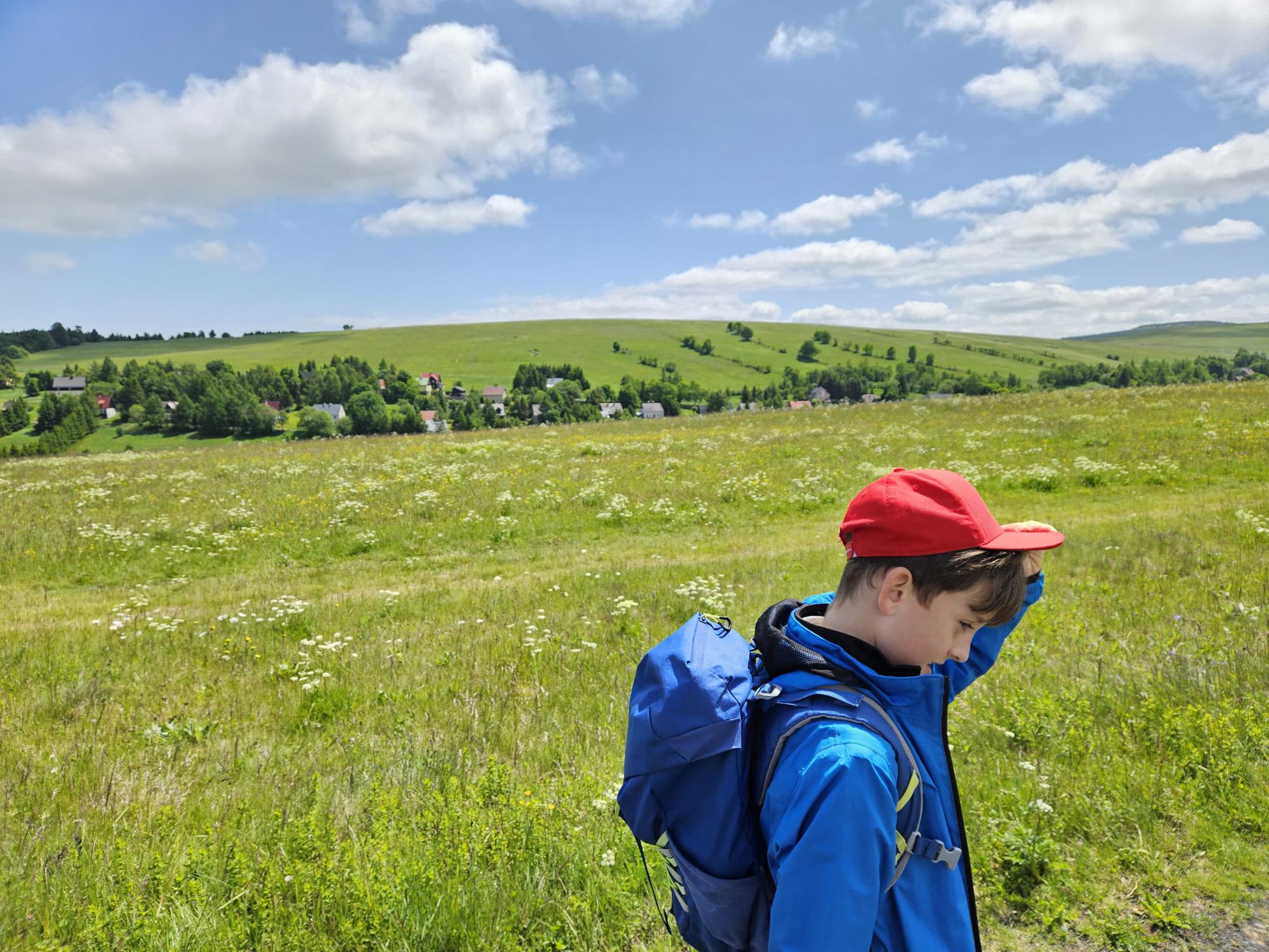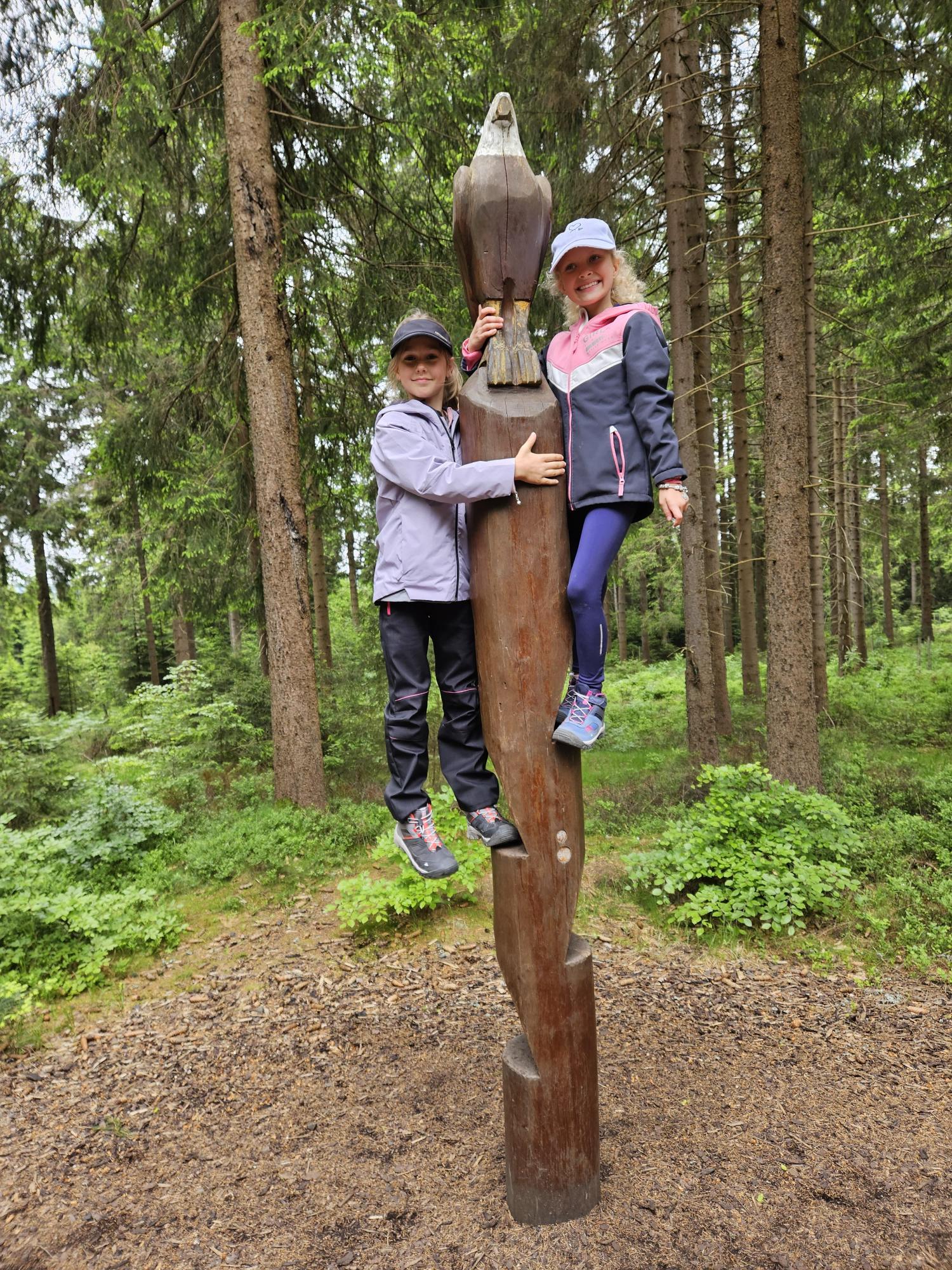 Zdravíme Vás všechny z krásného prostředí Krušných hor. Všichni jsme v pořádku a spokojení. Dnešní den jsme měli tedy přeplněný zážitky. Ráno jsme se učili, protože jsme čekali, až ofouknou zdejší louky, v noci totiž spadlo pár kapek a my jsme se chystali po nich běhat. Ještě dopoledne jsme ale vyrazili k třem větrným elektrárnám, které se jmenují Kašpar, Baltazar a Melichar. Cestou jsme tipovali obvod sloupu jedné větrné elektrárny. Děti ho potom změřili pomocí rozpažených rukou. Celkem bylo potřeba 12 dětí, což bylo pro děti překvapení. Zahráli jsme si hru limeriky a potom jsme už spěchali na dobrý řízek s bramborovou kaší. Po odpoledním klidu nás čekal další výlet. Tentokrát jsme se vydali do zaniklé osady Königsmühle. Byl to krásný výlet a skoro tajemný :-). V lese u osady jsme postavili domečky pro zvířátka a vrátili se na večeři. Počasí nám dnes přálo a výlety se nám moc vydařily.