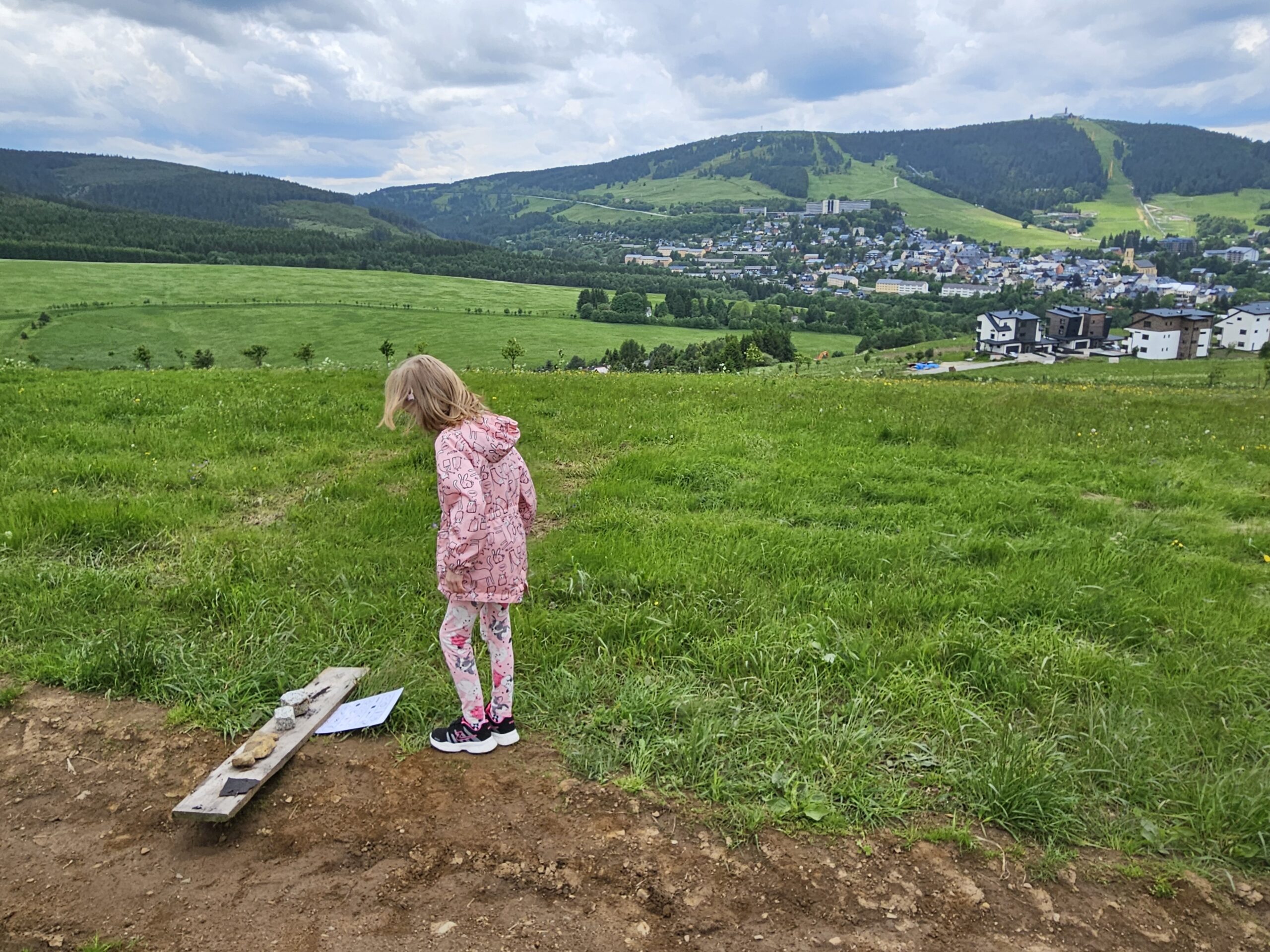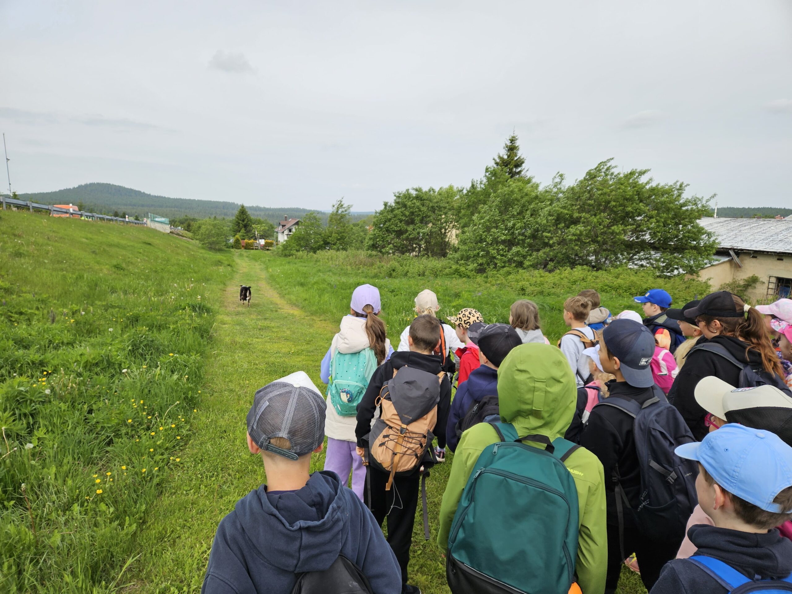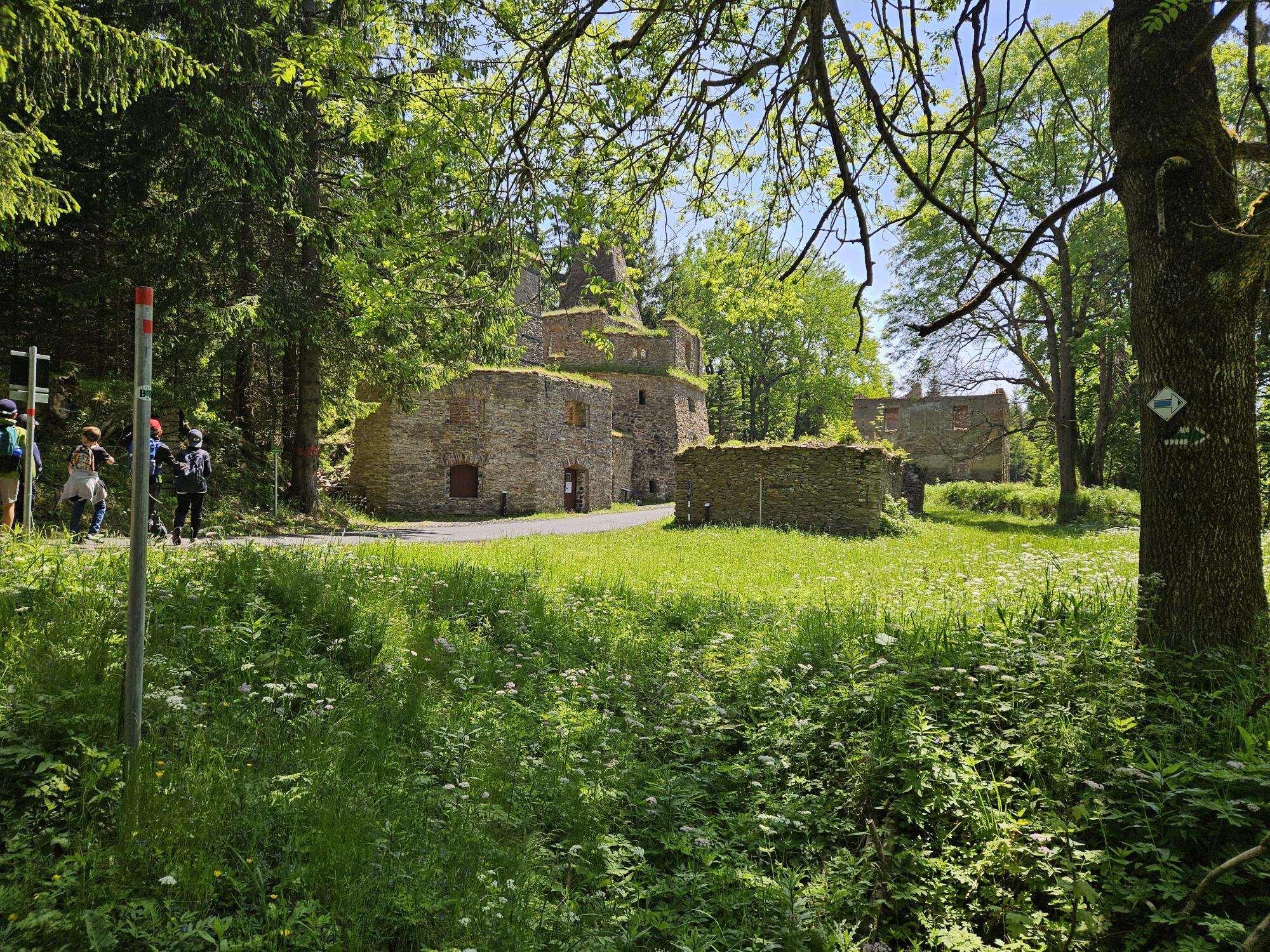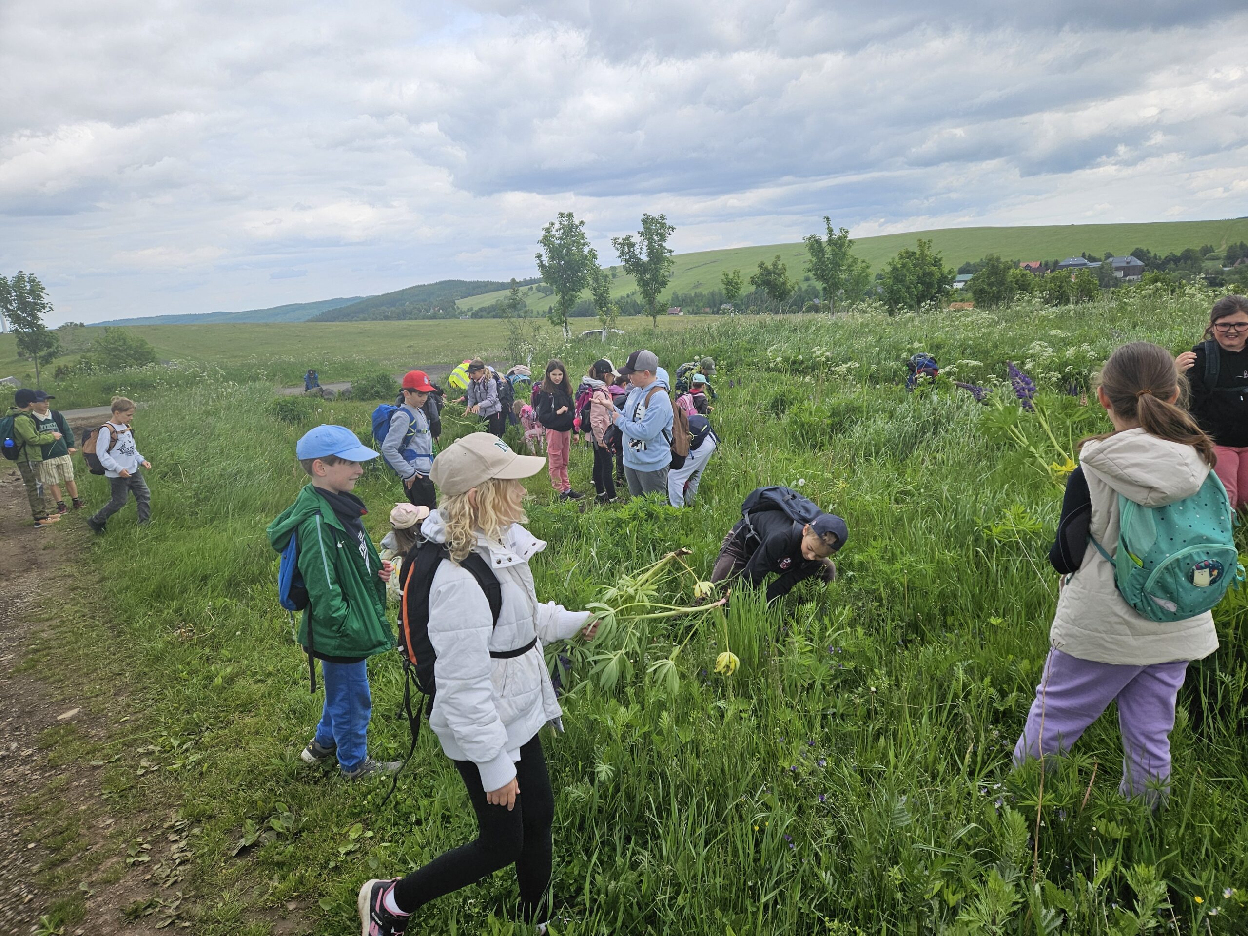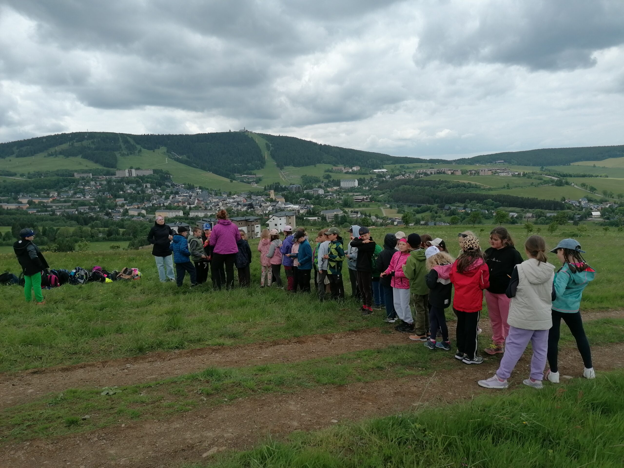Zdravíme Vás všechny z krásného prostředí Krušných hor. Všichni jsme v pořádku a spokojení. Dnešní den jsme měli tedy přeplněný zážitky. Ráno jsme se učili, protože jsme čekali, až ofouknou zdejší louky, v noci totiž spadlo pár kapek a my jsme se chystali po nich běhat. Ještě dopoledne jsme ale vyrazili k třem větrným elektrárnám, které se jmenují Kašpar, Baltazar a Melichar. Cestou jsme tipovali obvod sloupu jedné větrné elektrárny. Děti ho potom změřili pomocí rozpažených rukou. Celkem bylo potřeba 12 dětí, což bylo pro děti překvapení. Zahráli jsme si hru limeriky a potom jsme už spěchali na dobrý řízek s bramborovou kaší. Po odpoledním klidu nás čekal další výlet. Tentokrát jsme se vydali do zaniklé osady Königsmühle. Byl to krásný výlet a skoro tajemný :-). V lese u osady jsme postavili domečky pro zvířátka a vrátili se na večeři. Počasí nám dnes přálo a výlety se nám moc vydařily.