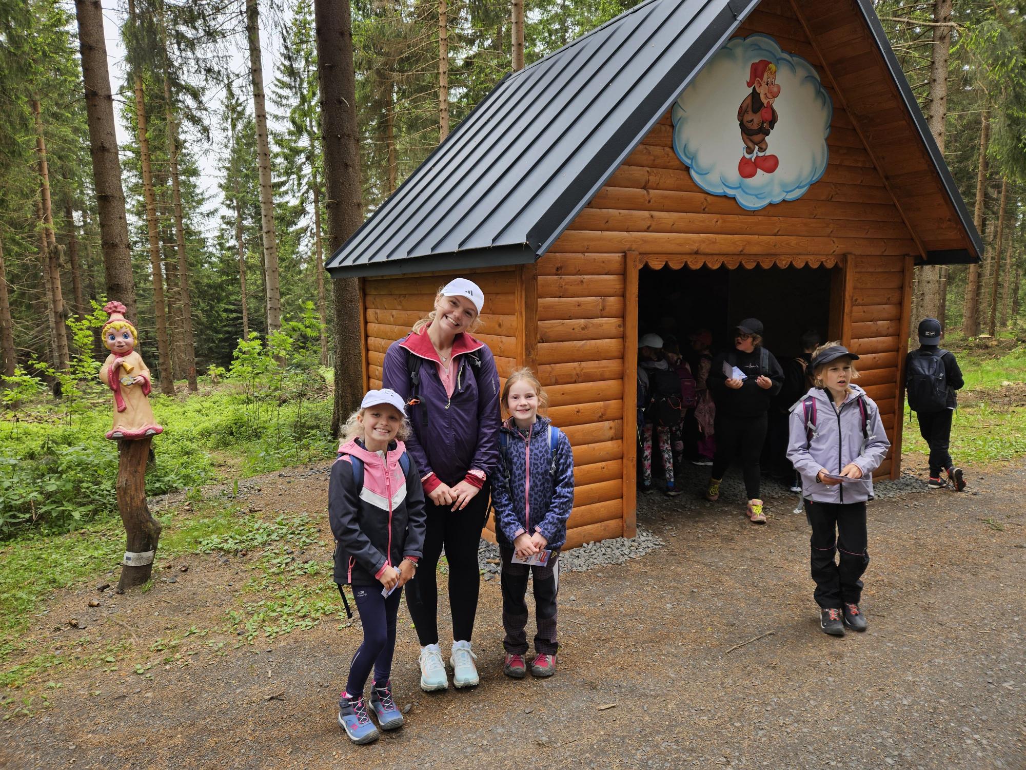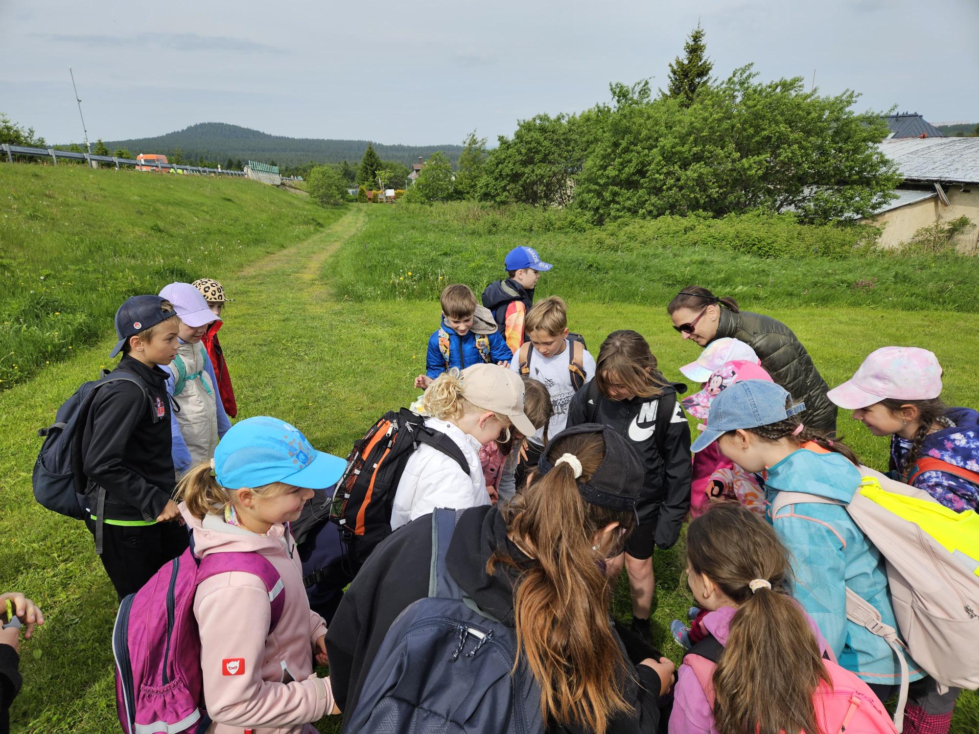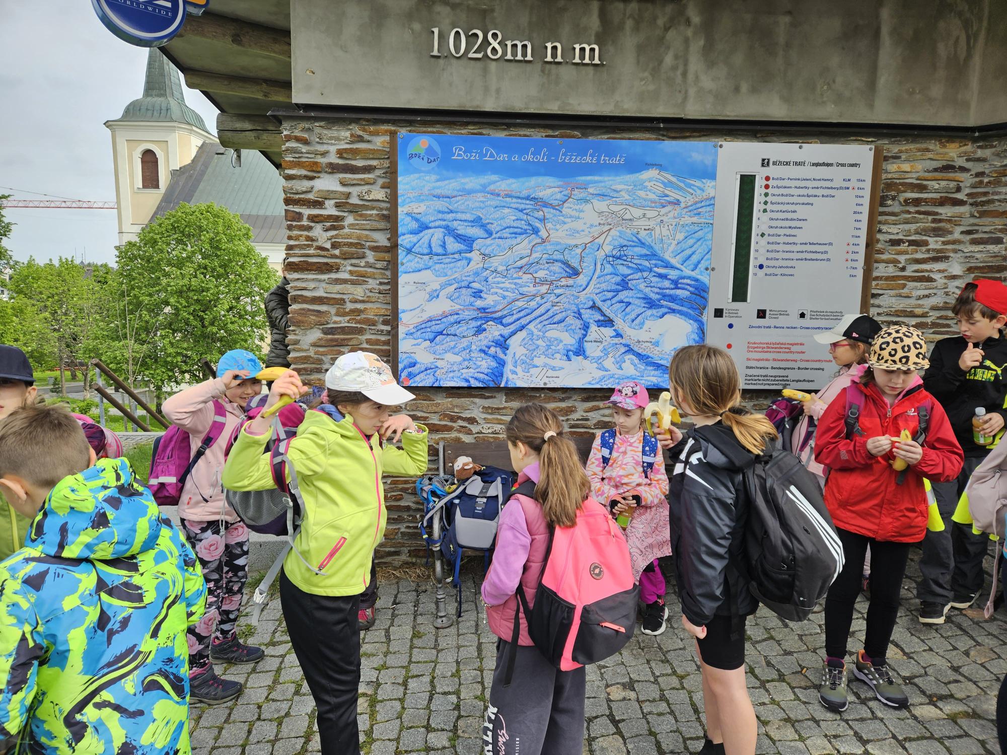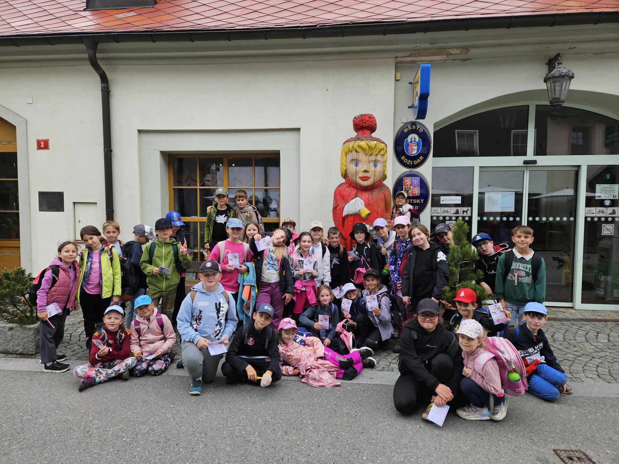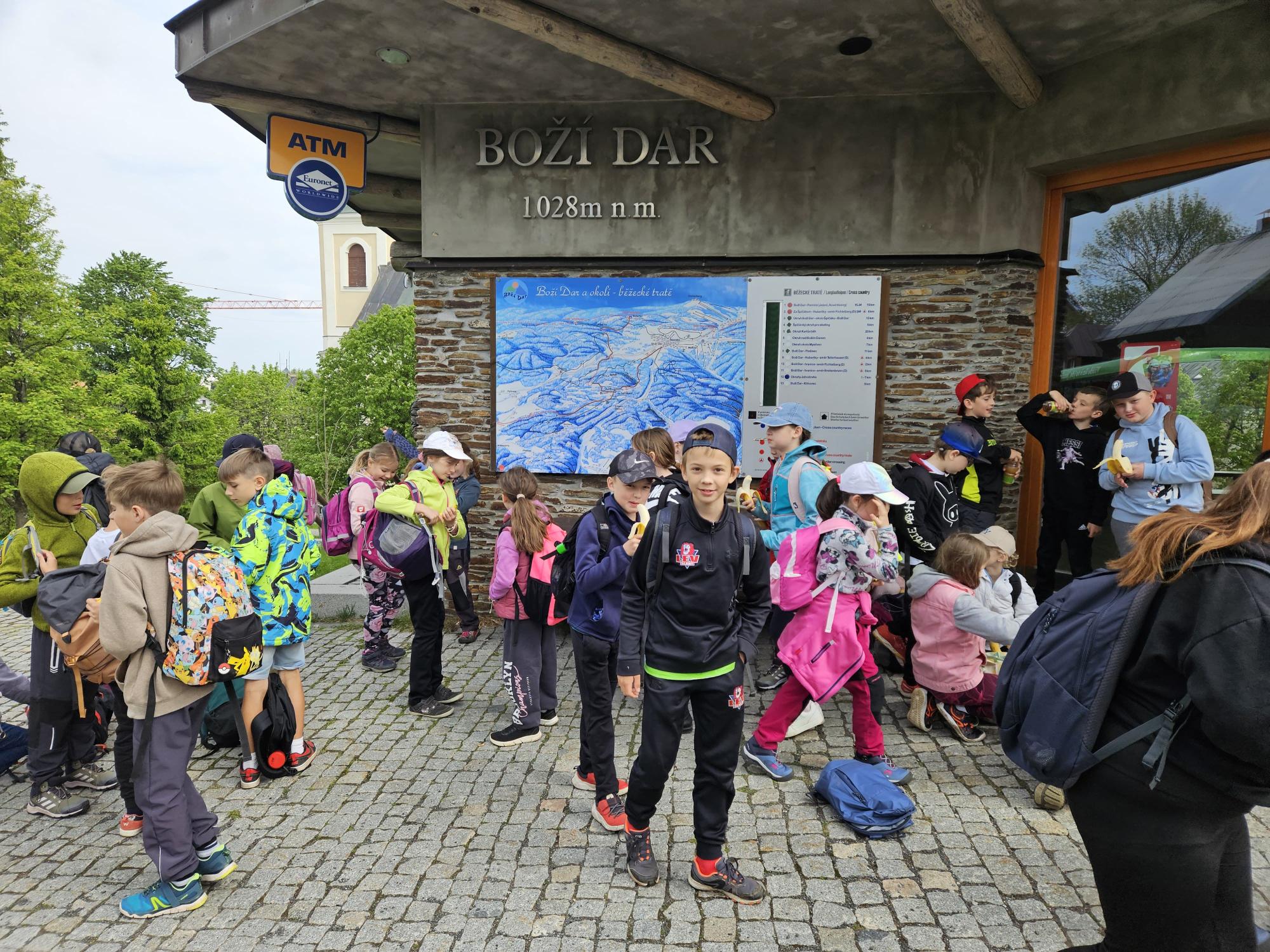 Dnes jsme se vydali autobusem na Boží Dar. Nejprve jsme navštívili Horskou službu, kde nám pán pověděl spoustu zajímavostí a také nám předvedl cvičeného psa Šuplíka. Vyzkoušeli jsme si skútr a čtyřkolku. Potom jsme šli na Ježíškovu cestu. Prošli jsme celý malý okruh a plnili úkoly v domečcích. Cestou jsme chytali broučky, housenky, mnohonožky, žáby a spoustu dalších živočichů. To nás opravdu dost bavilo. Chytili jsme páteříčka, nosatce, kovaříka, lišejníkovce a střevlíka. Celý den jsme běhali po lese a užívali jsme si čerstvého vzduchu. Teď máme červené tváře a chystáme se na večeři.
