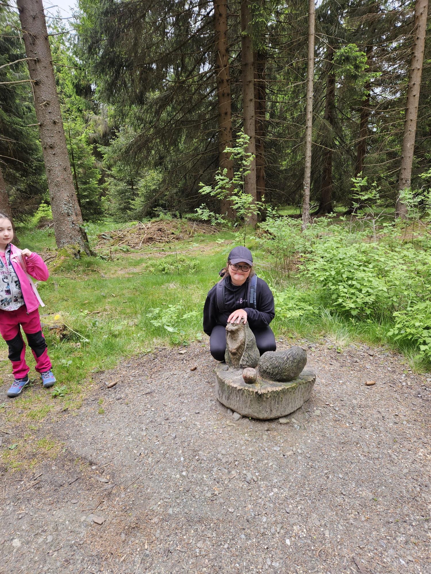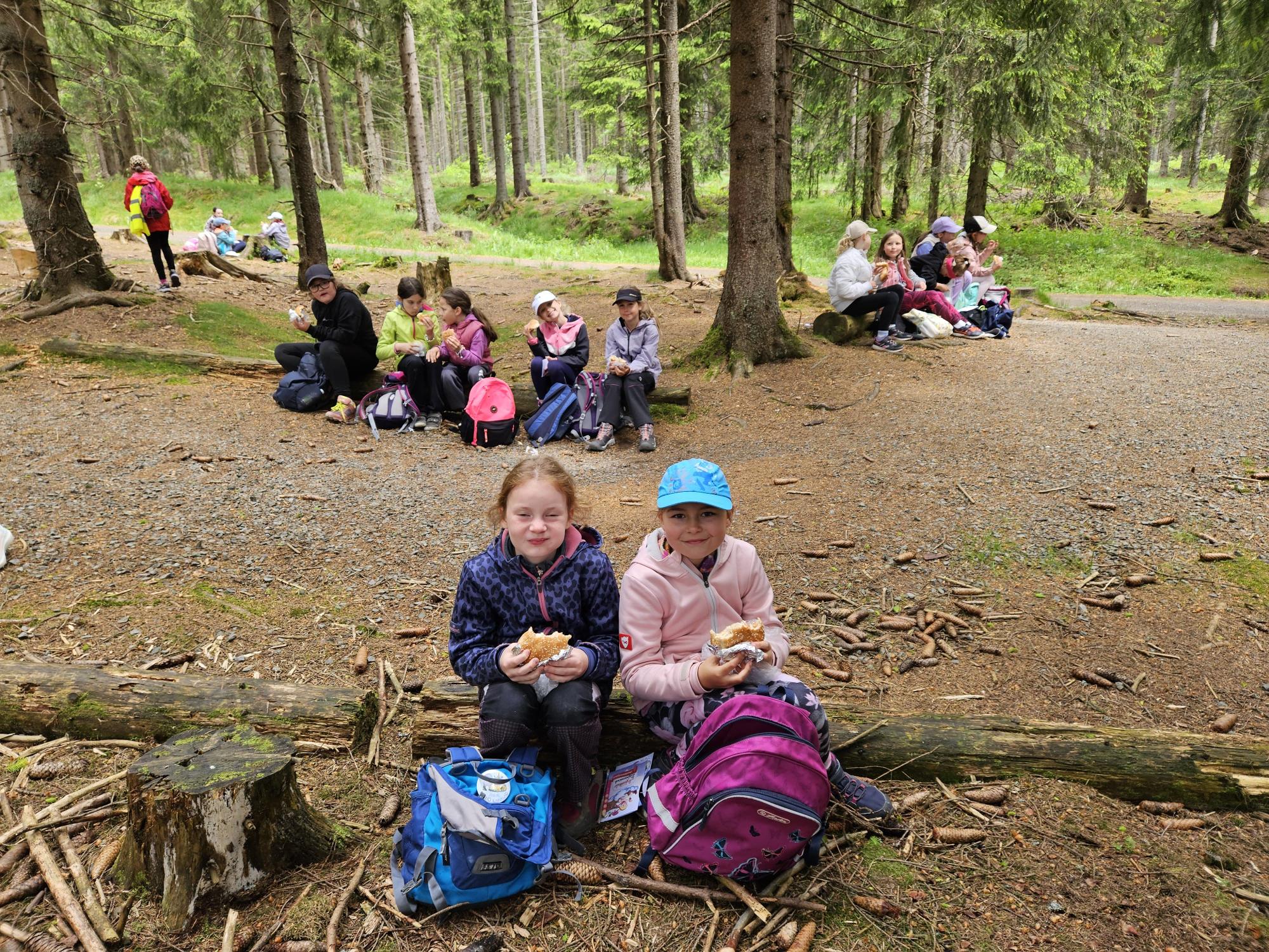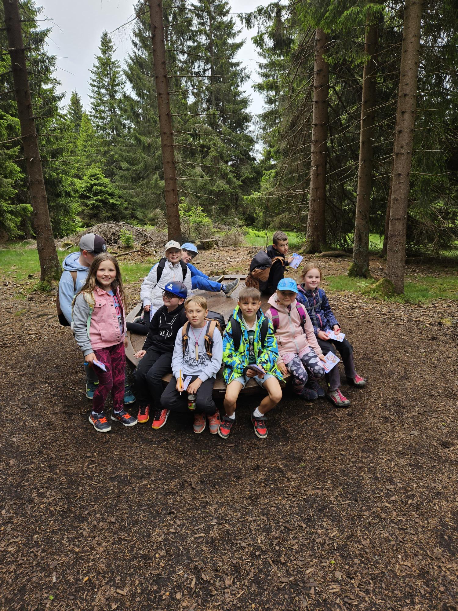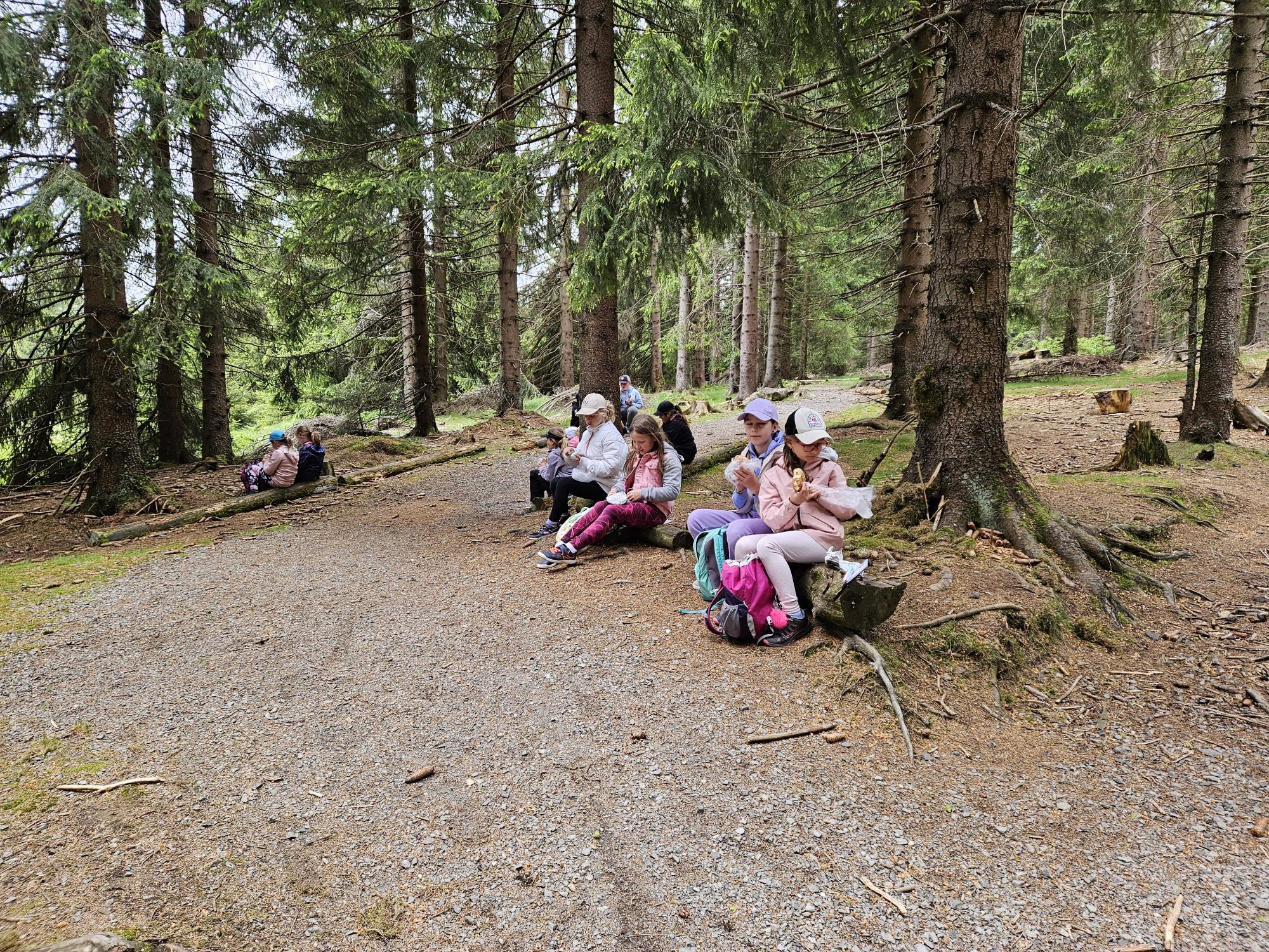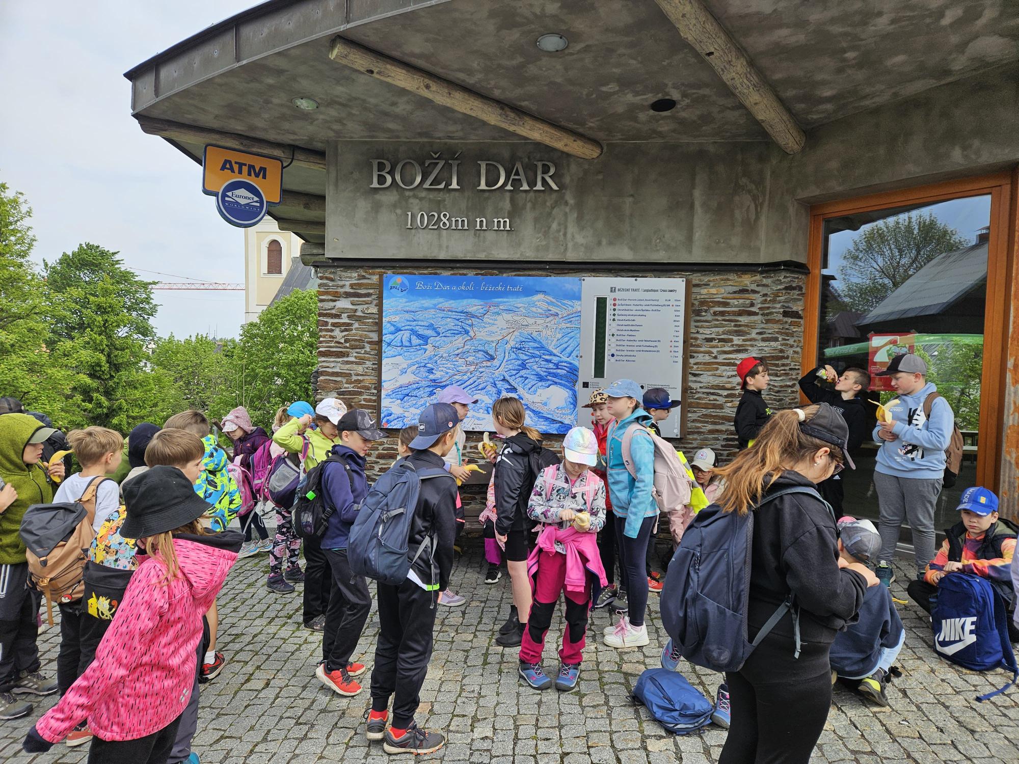 Dnes jsme se vydali autobusem na Boží Dar. Nejprve jsme navštívili Horskou službu, kde nám pán pověděl spoustu zajímavostí a také nám předvedl cvičeného psa Šuplíka. Vyzkoušeli jsme si skútr a čtyřkolku. Potom jsme šli na Ježíškovu cestu. Prošli jsme celý malý okruh a plnili úkoly v domečcích. Cestou jsme chytali broučky, housenky, mnohonožky, žáby a spoustu dalších živočichů. To nás opravdu dost bavilo. Chytili jsme páteříčka, nosatce, kovaříka, lišejníkovce a střevlíka. Celý den jsme běhali po lese a užívali jsme si čerstvého vzduchu. Teď máme červené tváře a chystáme se na večeři.
