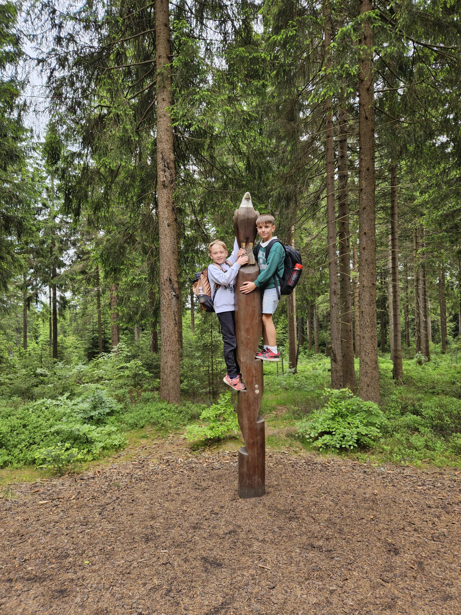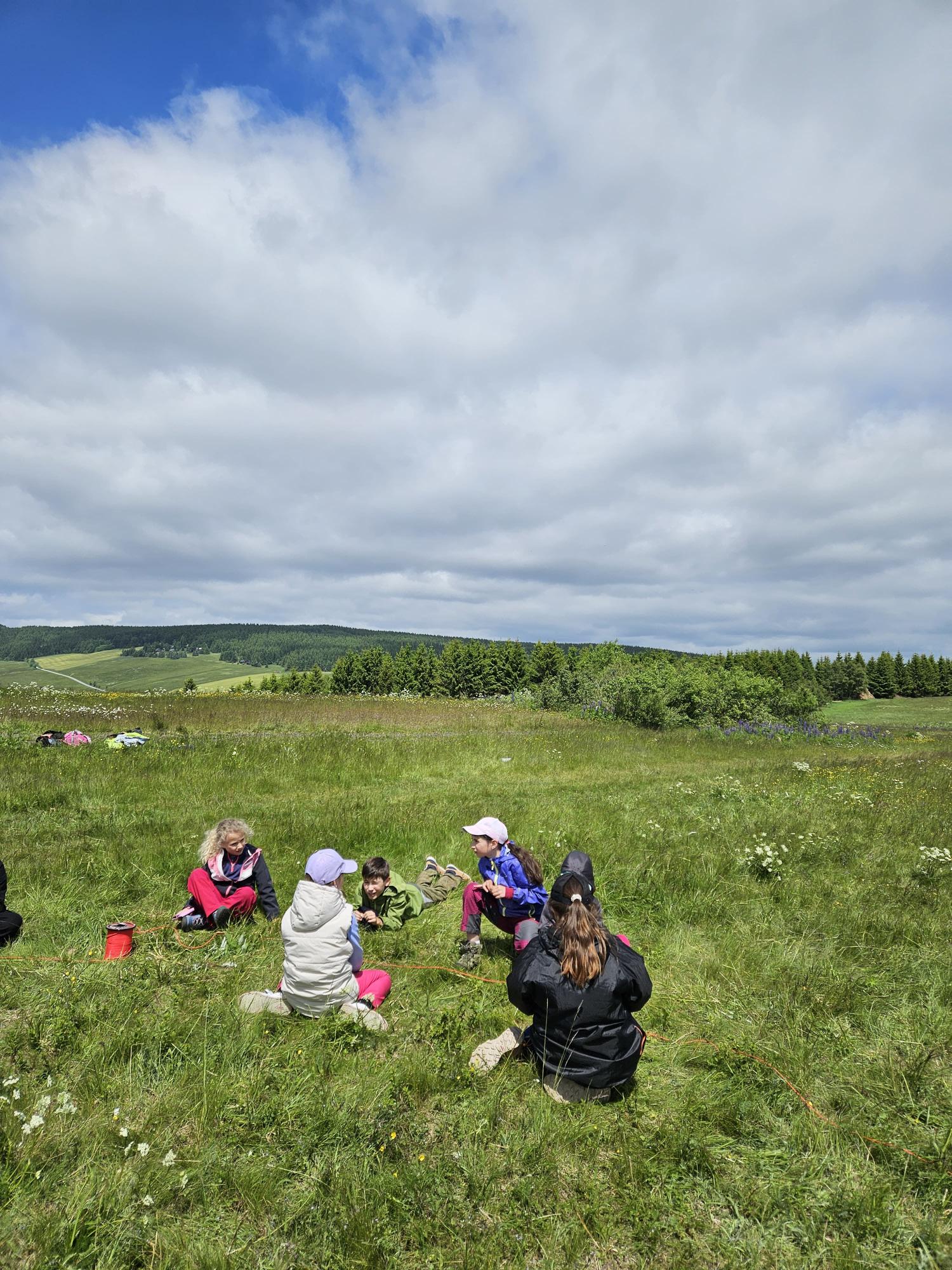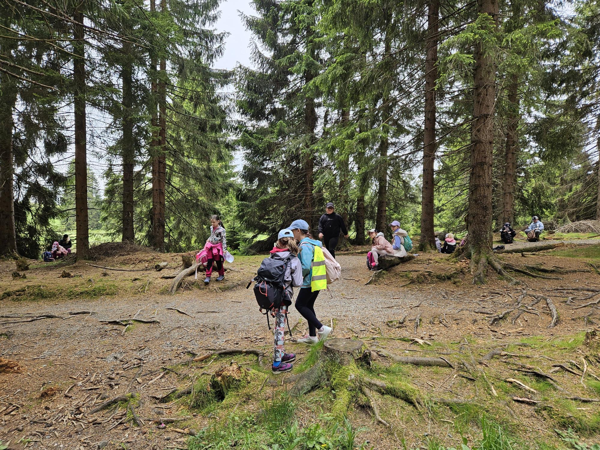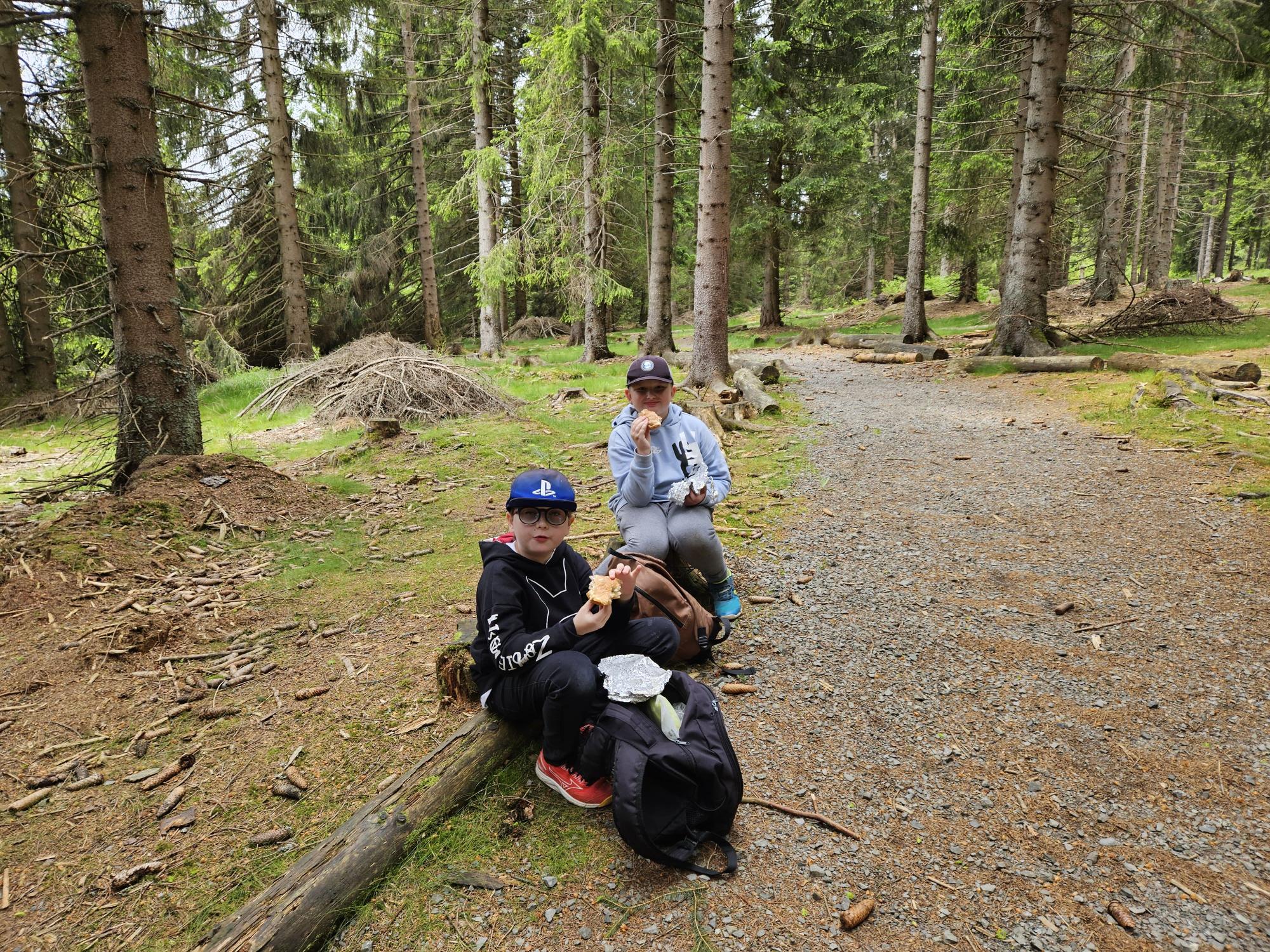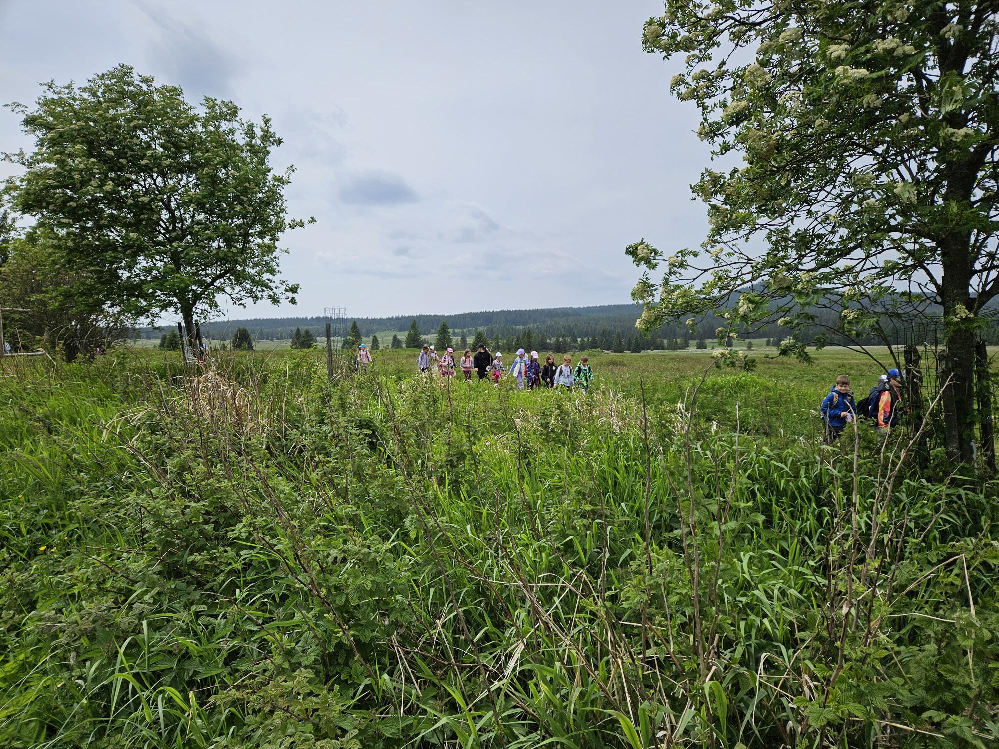 Dnes jsme se vydali autobusem na Boží Dar. Nejprve jsme navštívili Horskou službu, kde nám pán pověděl spoustu zajímavostí a také nám předvedl cvičeného psa Šuplíka. Vyzkoušeli jsme si skútr a čtyřkolku. Potom jsme šli na Ježíškovu cestu. Prošli jsme celý malý okruh a plnili úkoly v domečcích. Cestou jsme chytali broučky, housenky, mnohonožky, žáby a spoustu dalších živočichů. To nás opravdu dost bavilo. Chytili jsme páteříčka, nosatce, kovaříka, lišejníkovce a střevlíka. Celý den jsme běhali po lese a užívali jsme si čerstvého vzduchu. Teď máme červené tváře a chystáme se na večeři.