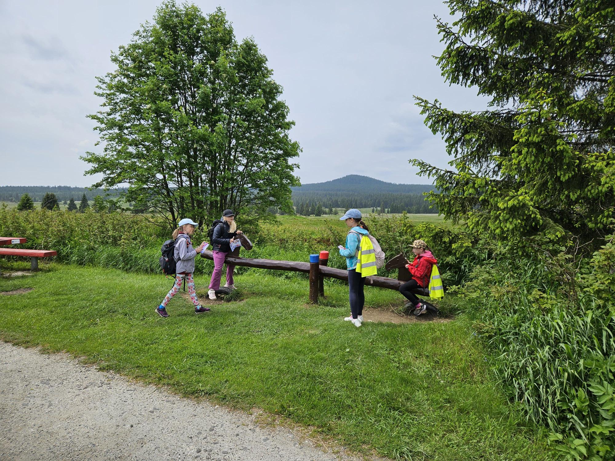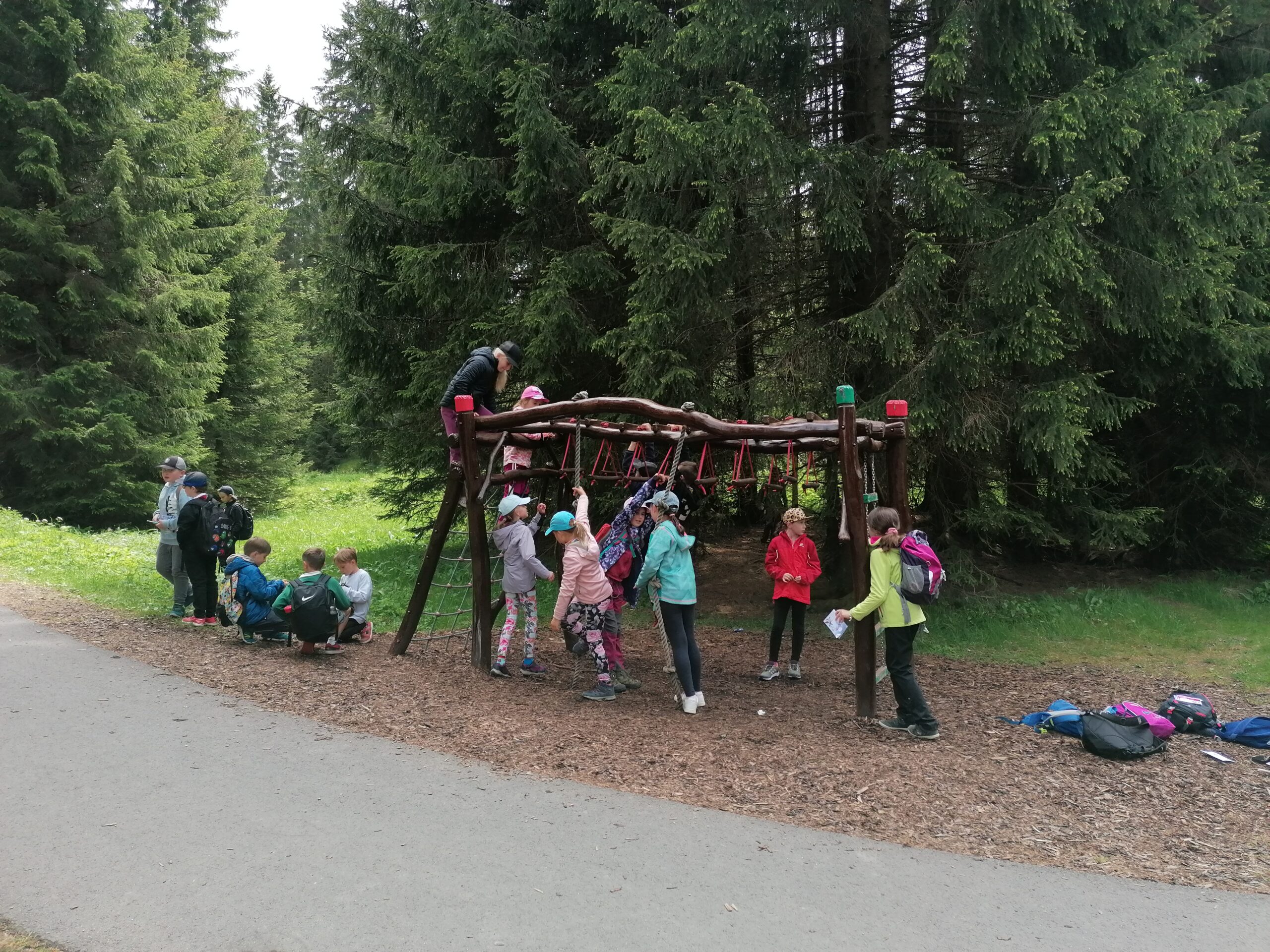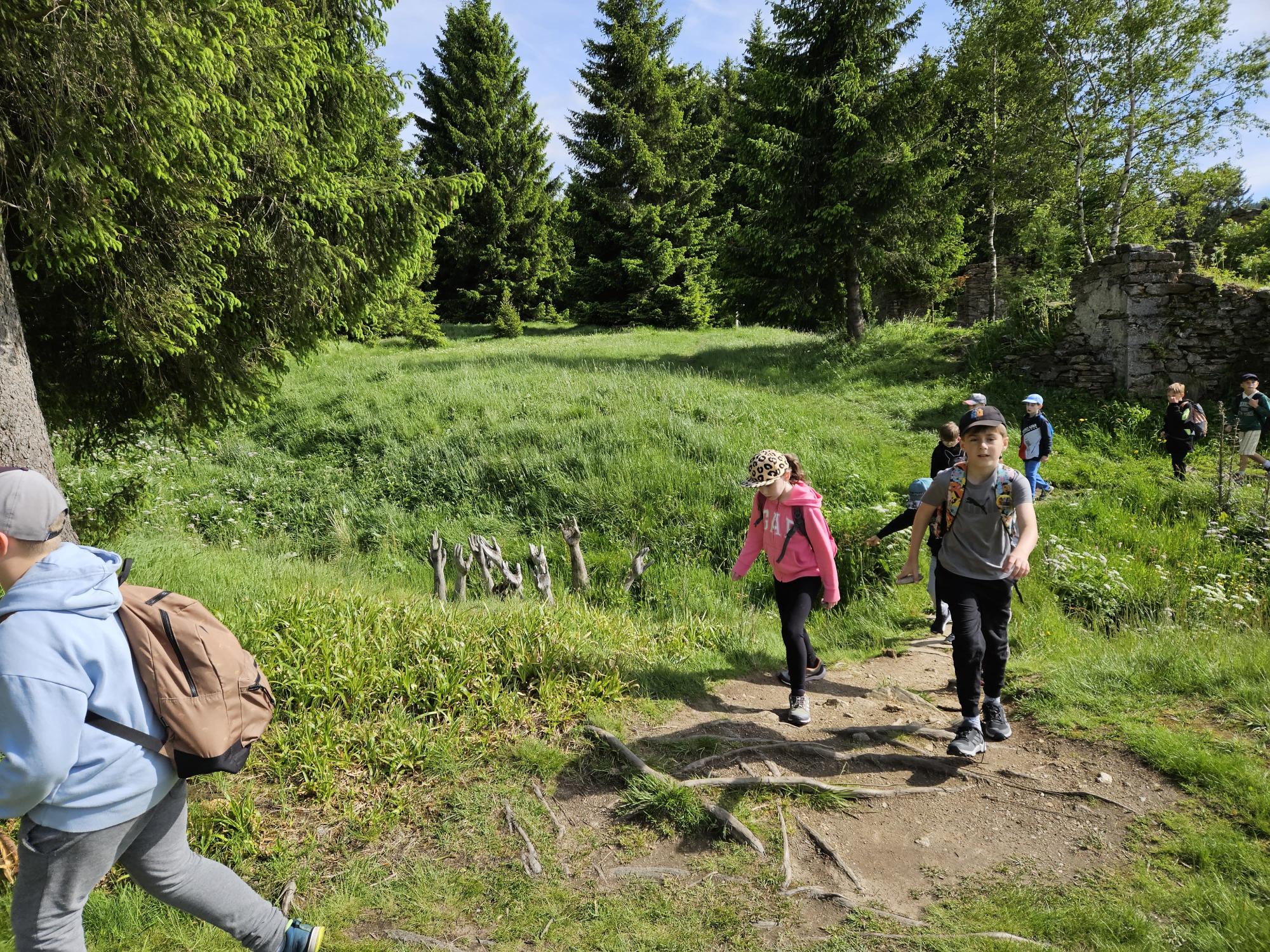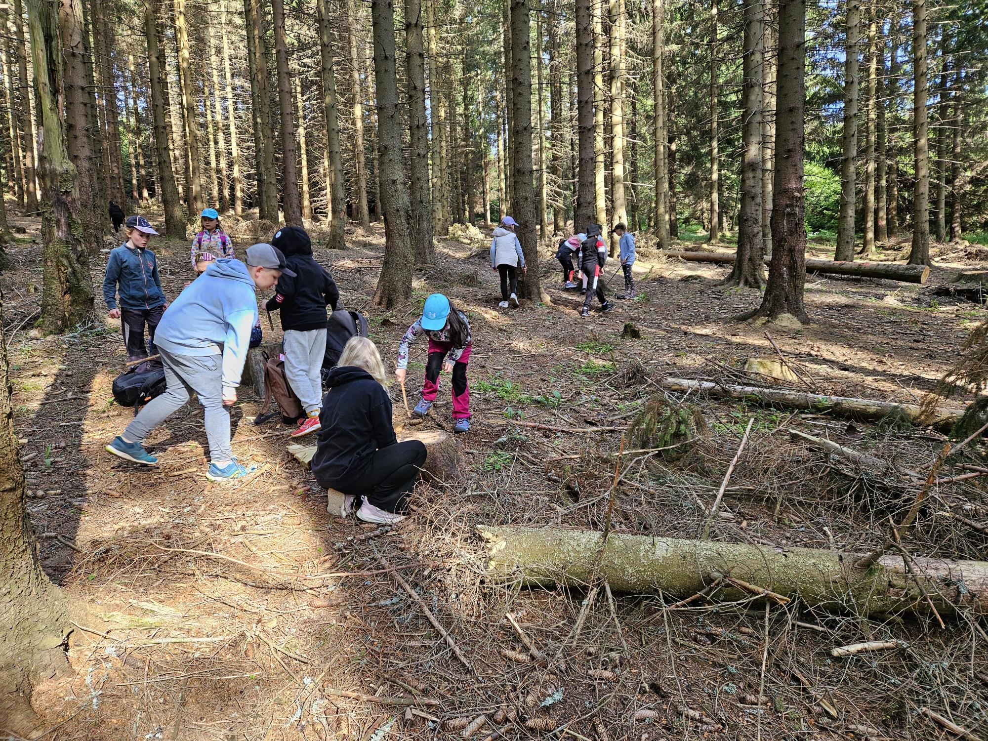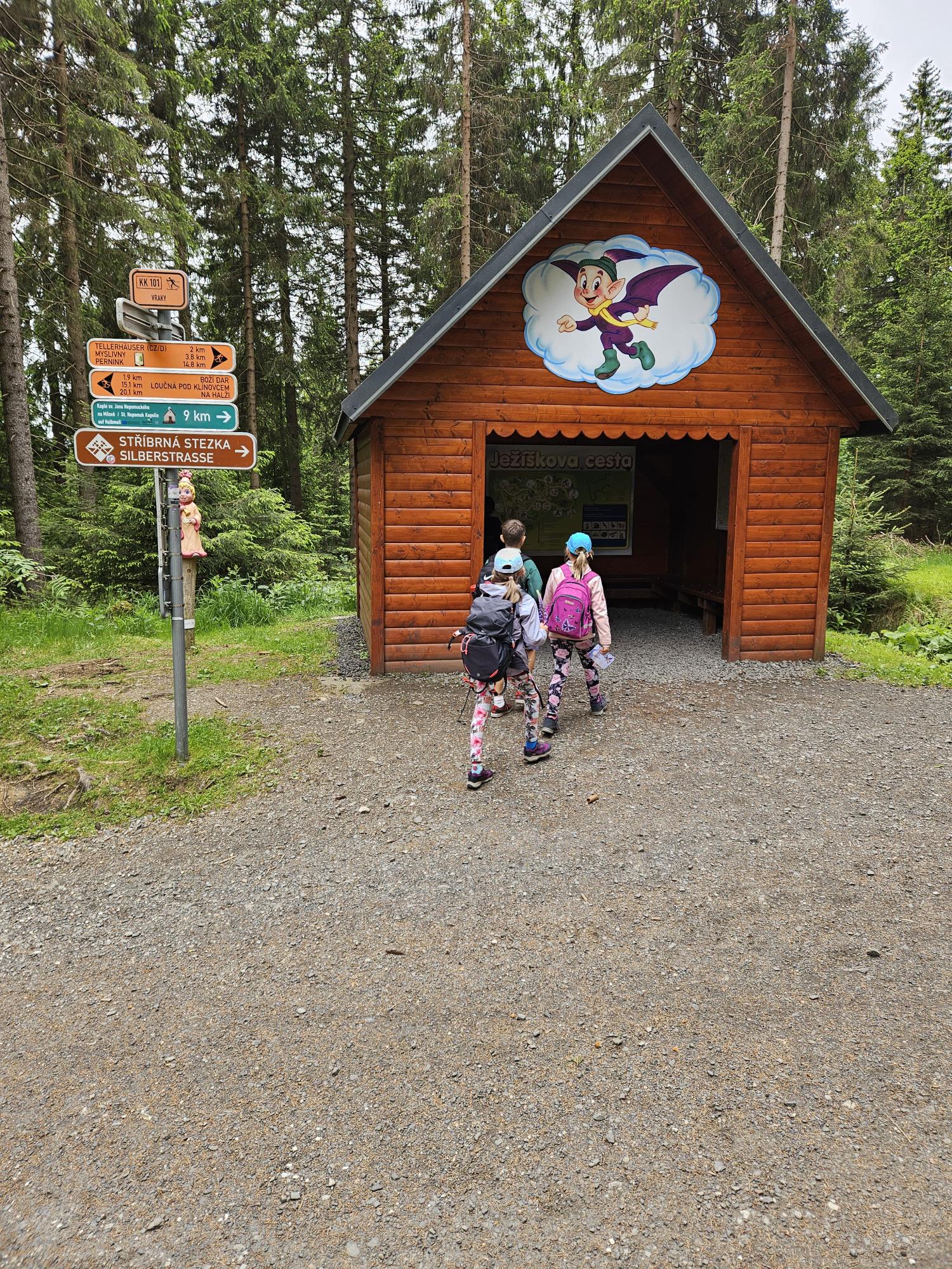 Dnes jsme se vydali autobusem na Boží Dar. Nejprve jsme navštívili Horskou službu, kde nám pán pověděl spoustu zajímavostí a také nám předvedl cvičeného psa Šuplíka. Vyzkoušeli jsme si skútr a čtyřkolku. Potom jsme šli na Ježíškovu cestu. Prošli jsme celý malý okruh a plnili úkoly v domečcích. Cestou jsme chytali broučky, housenky, mnohonožky, žáby a spoustu dalších živočichů. To nás opravdu dost bavilo. Chytili jsme páteříčka, nosatce, kovaříka, lišejníkovce a střevlíka. Celý den jsme běhali po lese a užívali jsme si čerstvého vzduchu. Teď máme červené tváře a chystáme se na večeři.