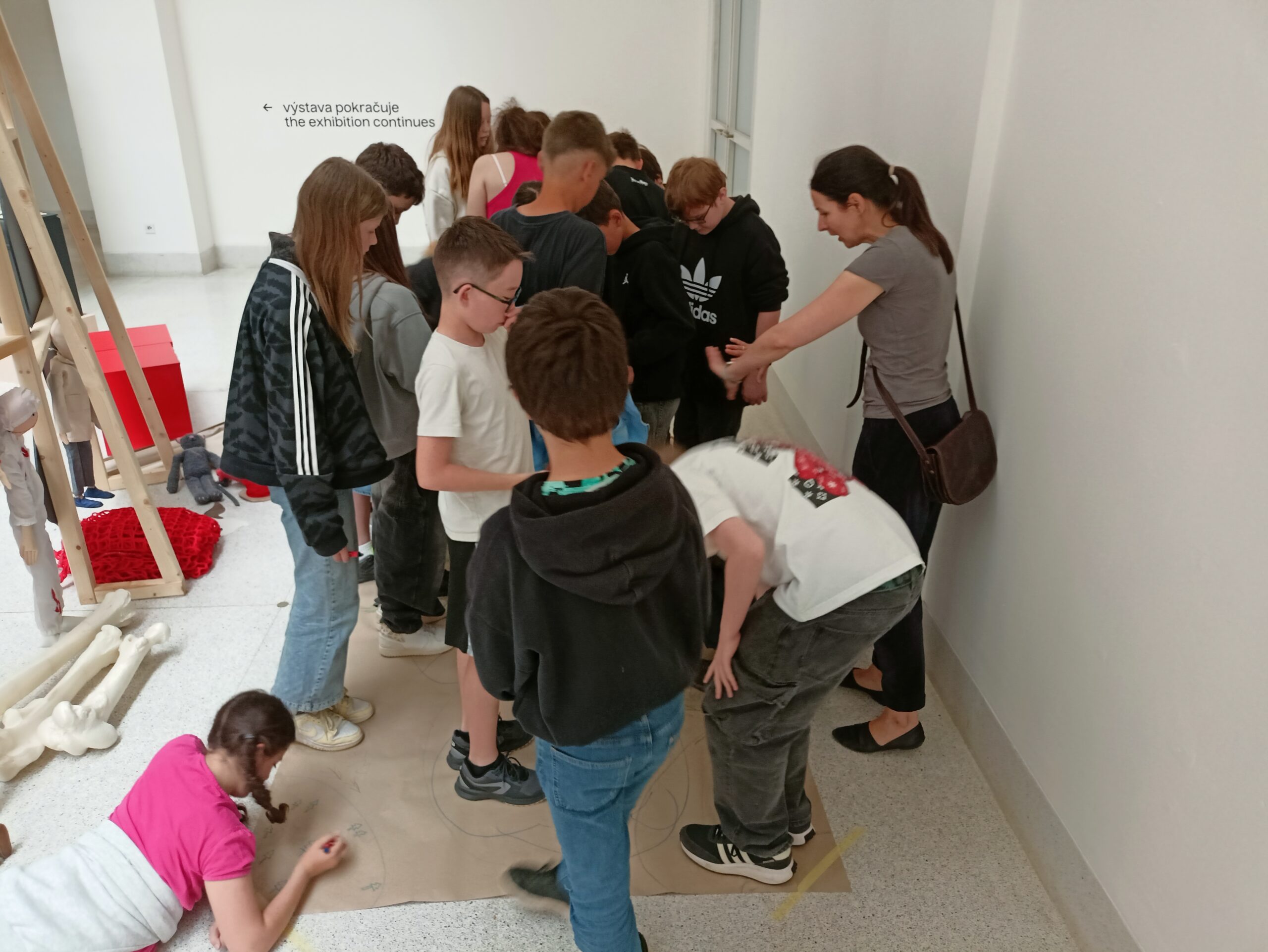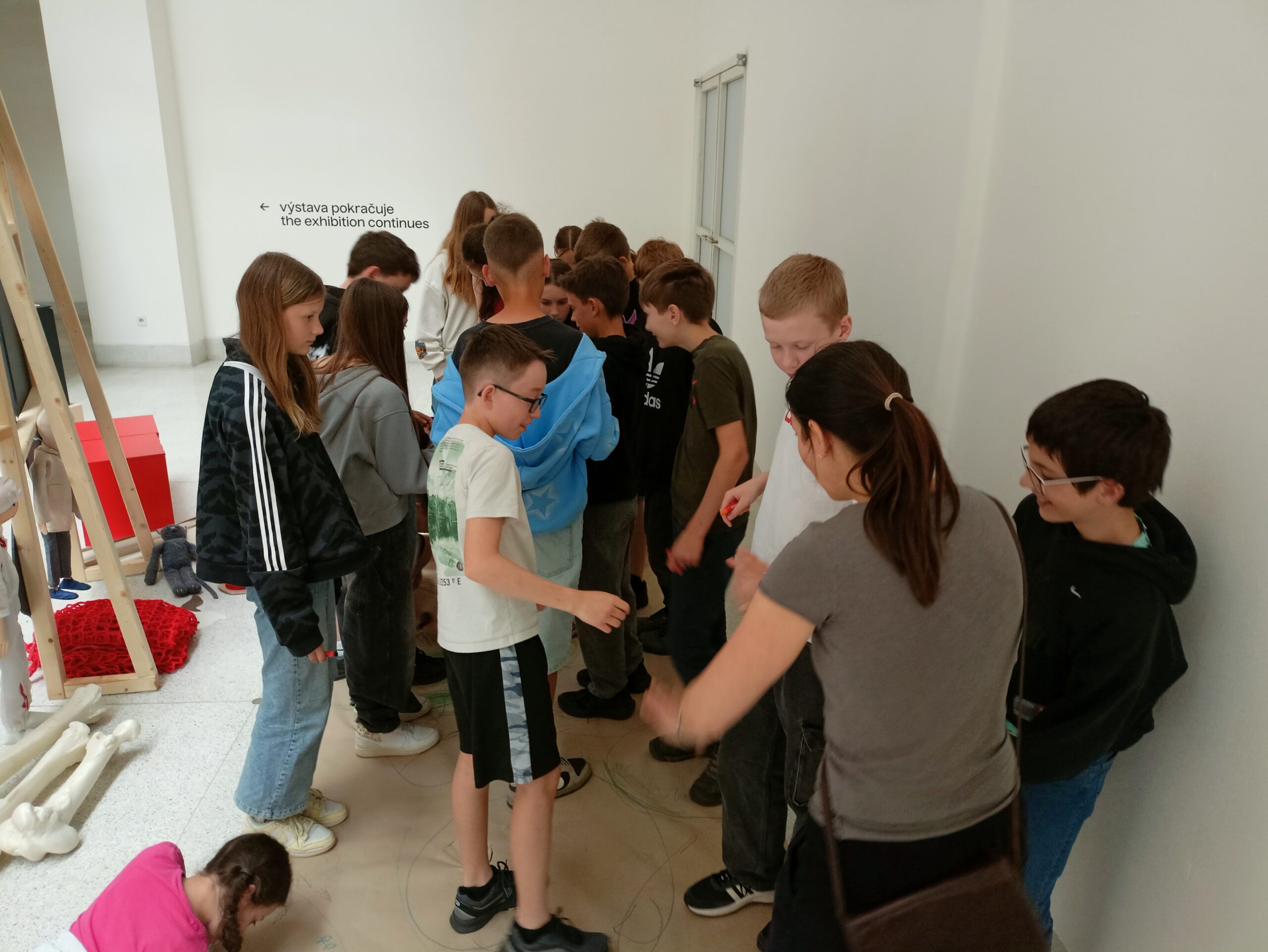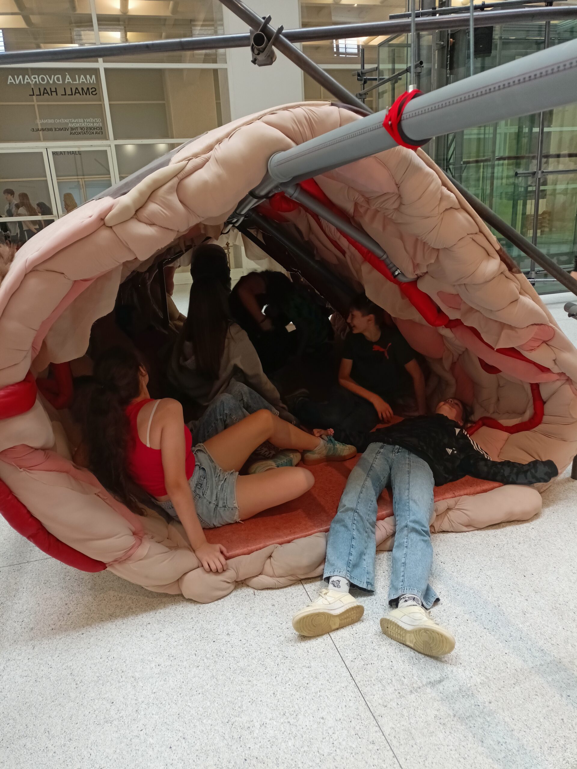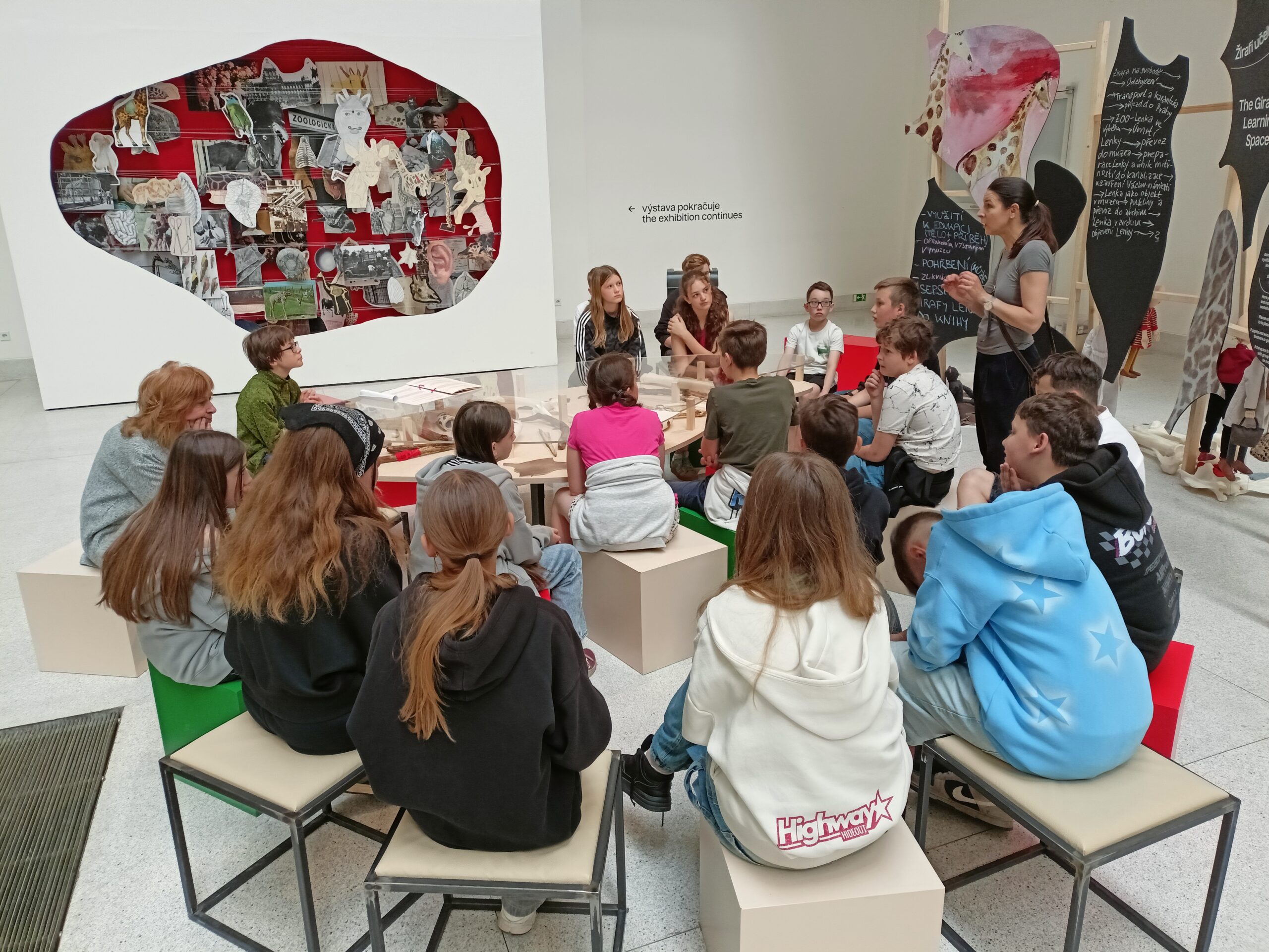 Ve Veletržním paláci (Dvoraně Veletržního paláce), nás čekal prostor s velkou instalací, ve kterém jsme se všichni mohli společně procházet, sami se v něm ukrýt, prozkoumávat ho, naslouchat zvukům uvnitř a vyslechnout krátké audio příběhy. Umělkyně Eva Koťátková připravila netradiční prostor improvizující zvětšený krk Žirafy Lenky, která krátce žila v Pražské ZOO. Její životní osud umělkyni natolik fascinoval, že ji přiměl k tvorbě interaktivního prostoru pro návštěvníky a účastníky workshopů. Součástí tohoto prostoru byla učebna s texty, textilní objekty, odlitky jednotlivých částí těla žirafy, popis jejího osudu. Niternost a fascinace prostorem nás doslova ohromila. Součástí workshopu byli i edukační hry, které byly na téma prostor, izolace a sebevyjádření svého prostoru. Mohli jsme i napsat osobní vzkaz autorce výstavy. Niternost, vjemy a fascinace konceptem a prostorem výstavy v nás vyvolala dojmy rozjímání o přírodě, životě, o konci života, odkazu přírody, vlastním prostoru potažmo o jeho sdílení. Výstavu vřele doporučujeme všem!!! A jedno přání žáků z prožitého workshopu? Mít tak podobný a niterný prostor k rozjímání i ve škole!…